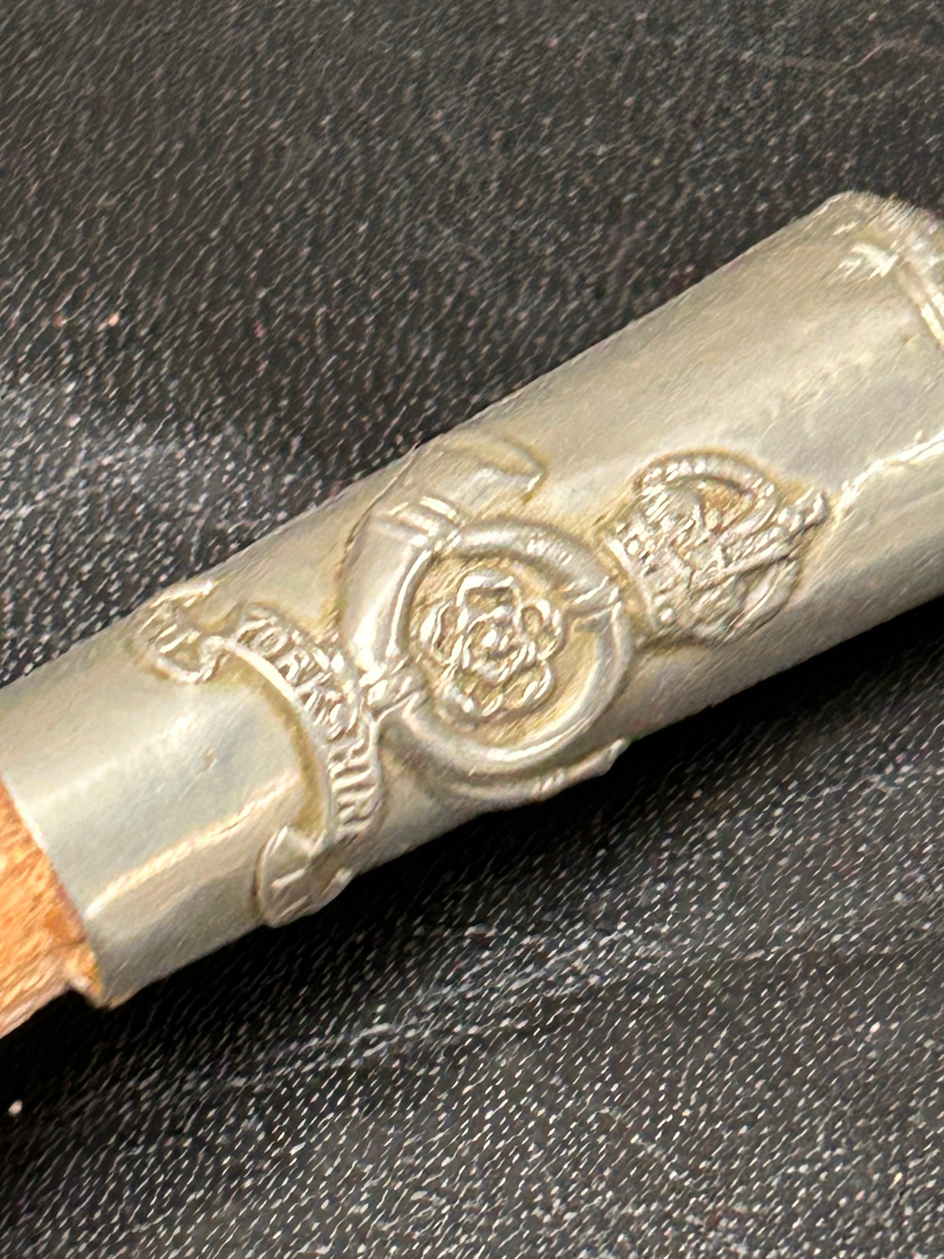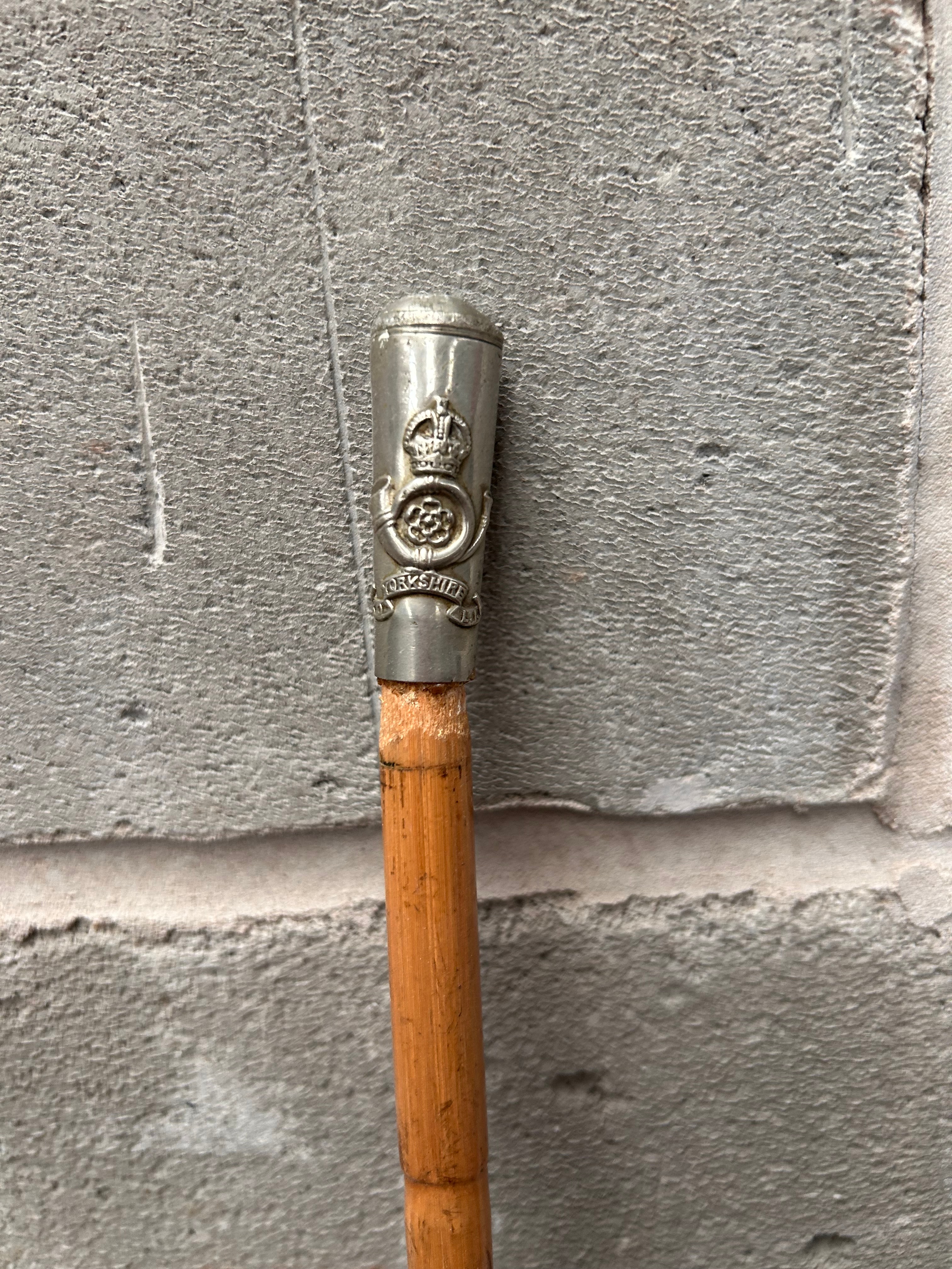 A Military Swagger Stick, featuring a segmented, light brown wooden shaft, likely bamboo or a similar reeded wood. The top is fitted with a silver-colored metal handle, emblazoned with a raised crest depicting a crown above a Tudor rose, encircled by a banner clearly inscribed with the word ‘YORKSHIRE.’ A small metal ferrule is present at the base of the shaft.