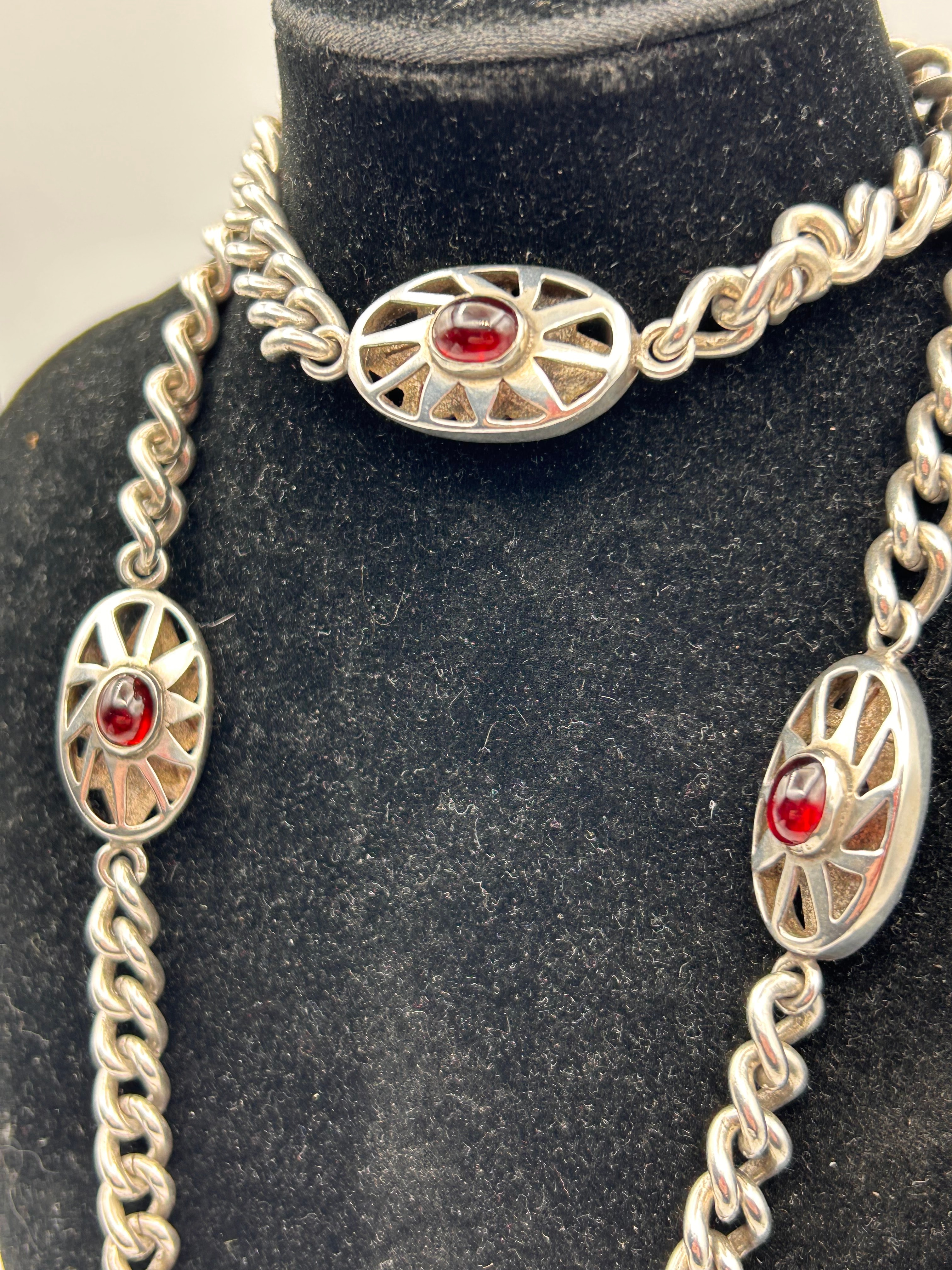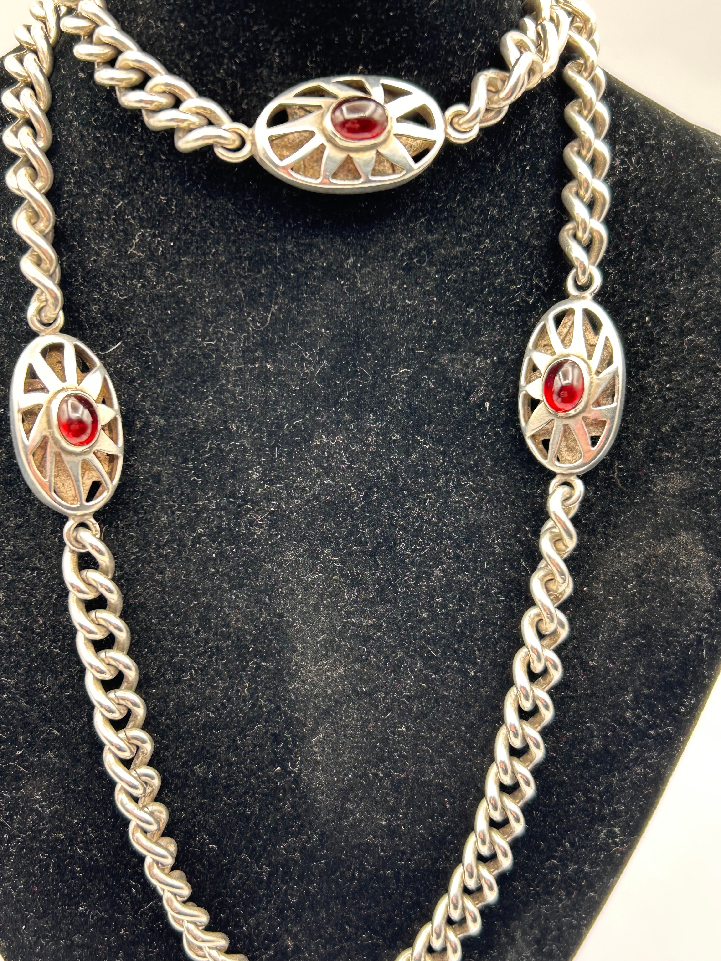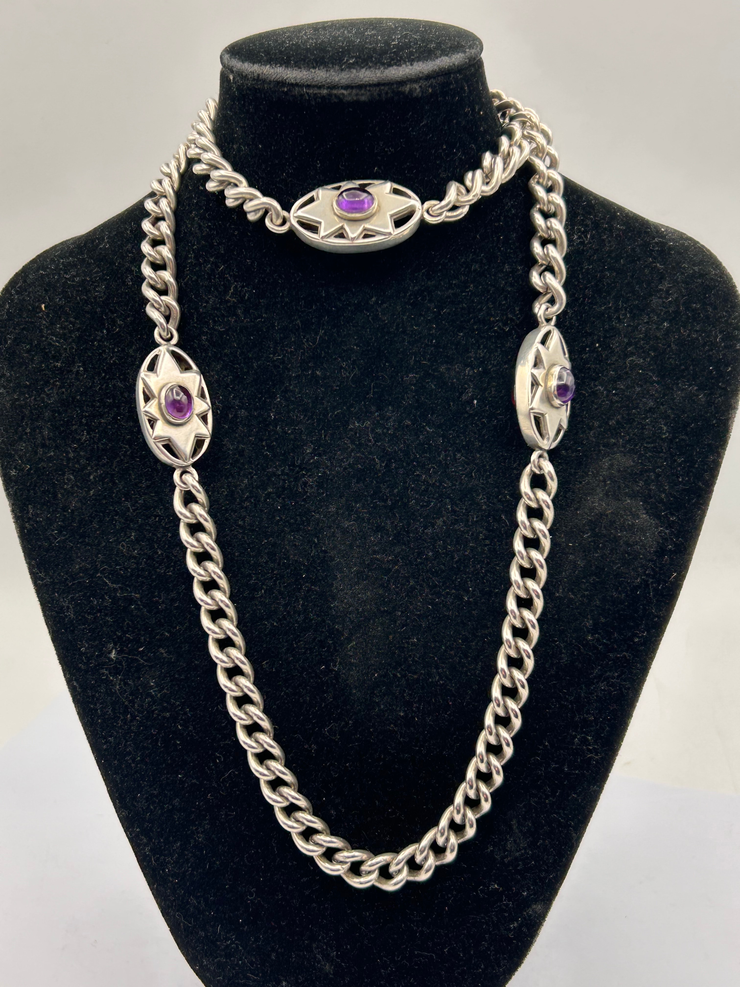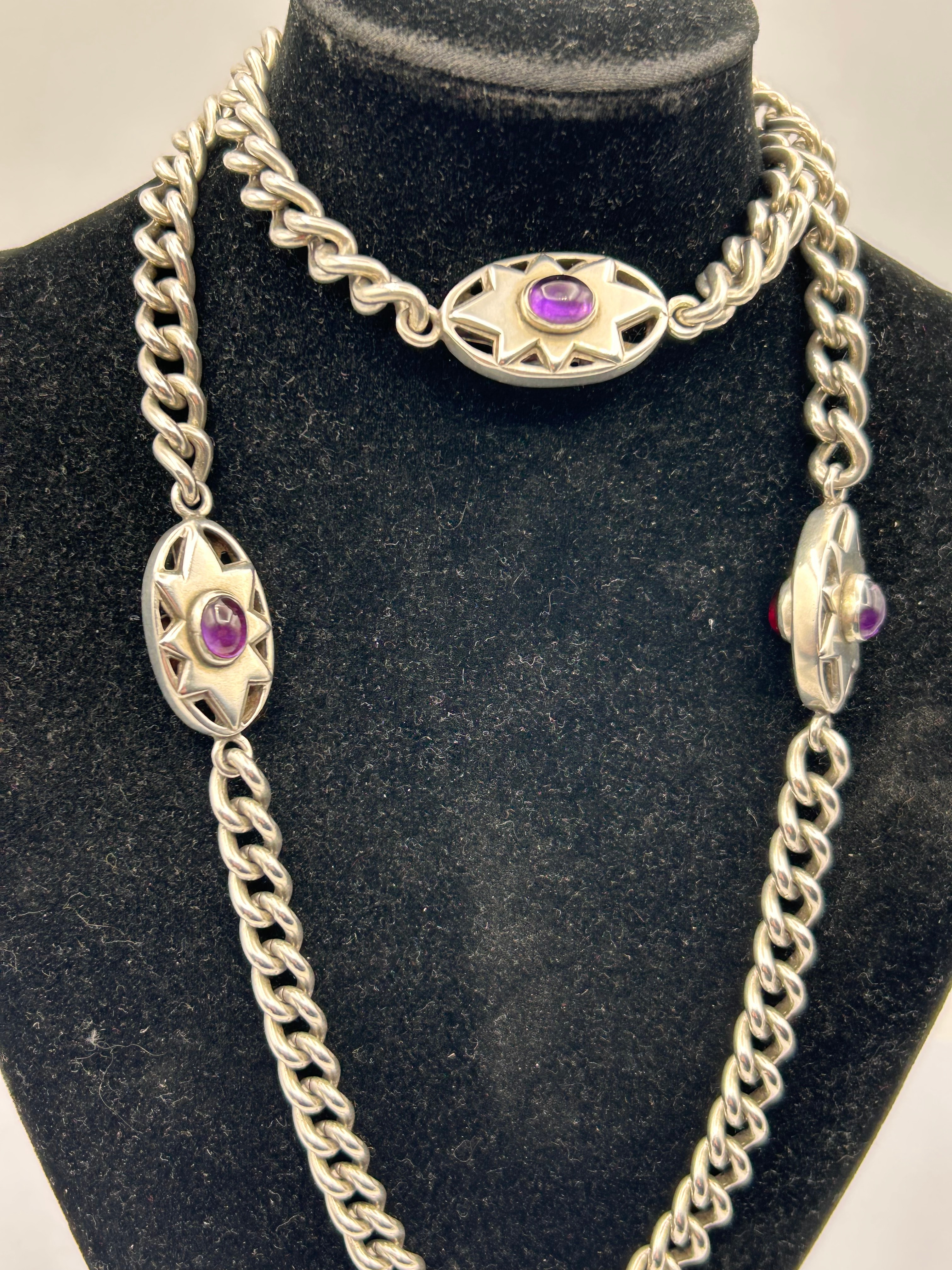 A long silver curb-link necklace featuring a heavy chain construction. Three oval-shaped decorative links are interspersed along the chain, each centering a cabochon stone within a stylized sunburst openwork design. The cabochon stones appear in both deep purple and vibrant red hues across the provided images.