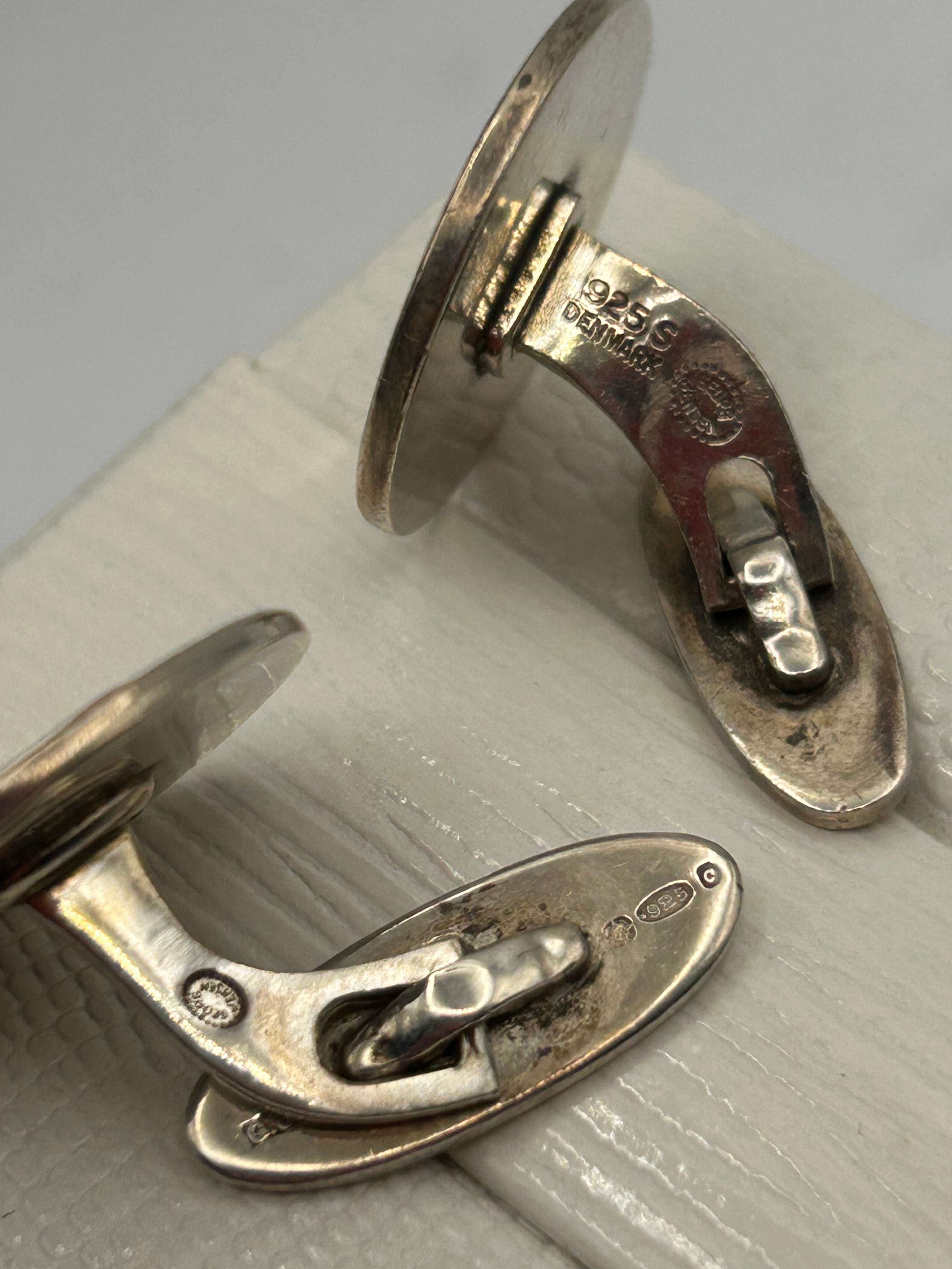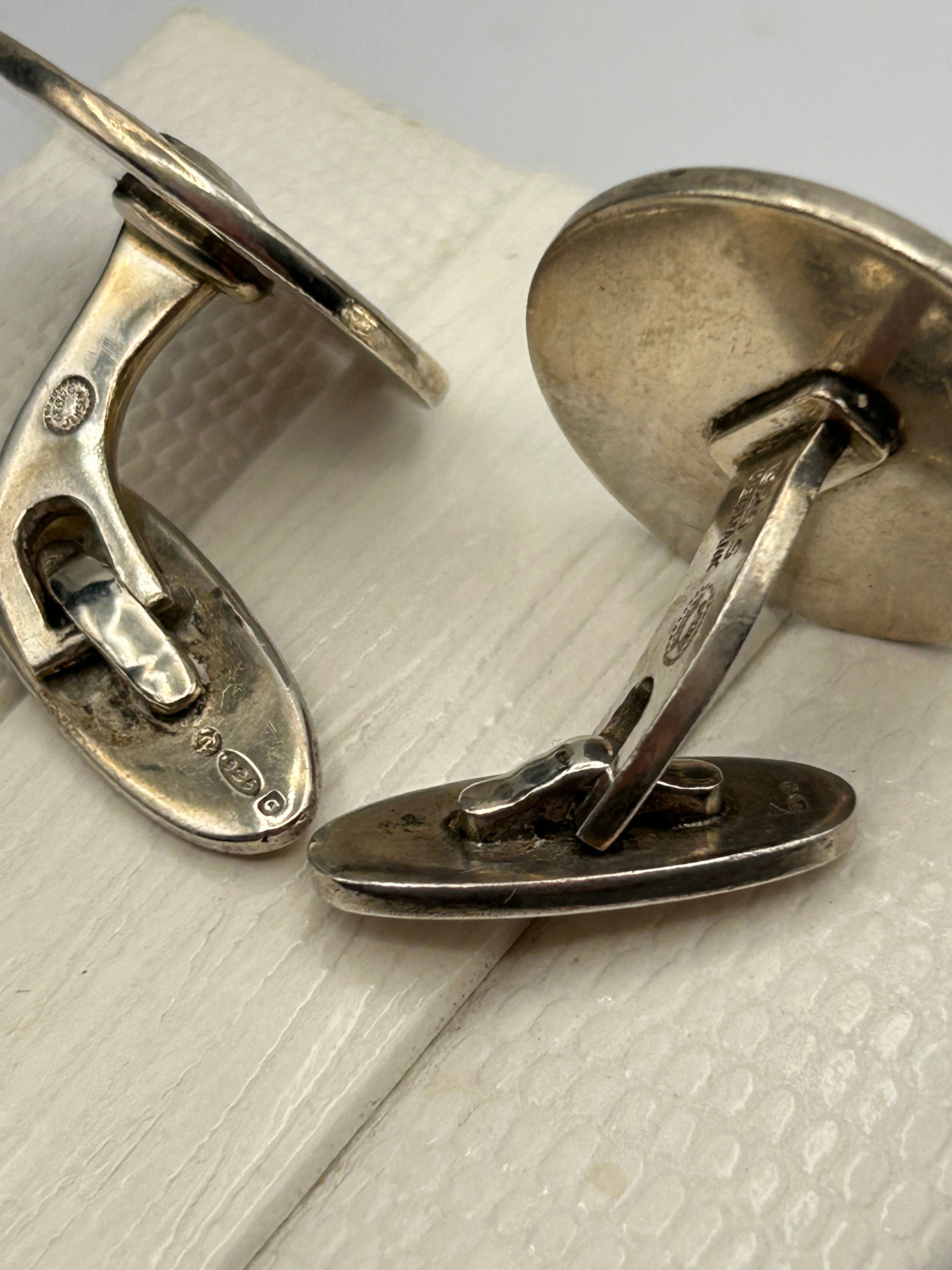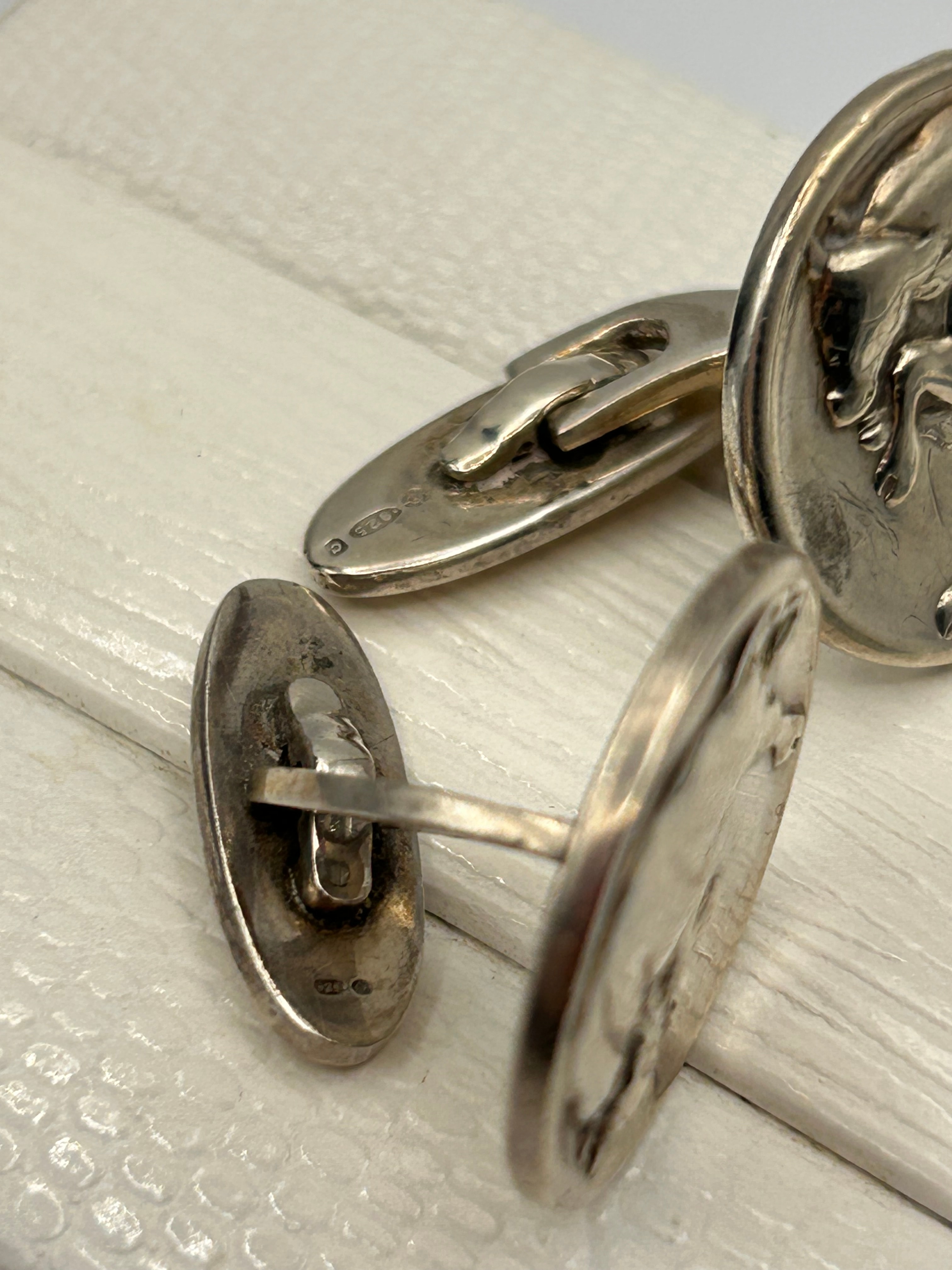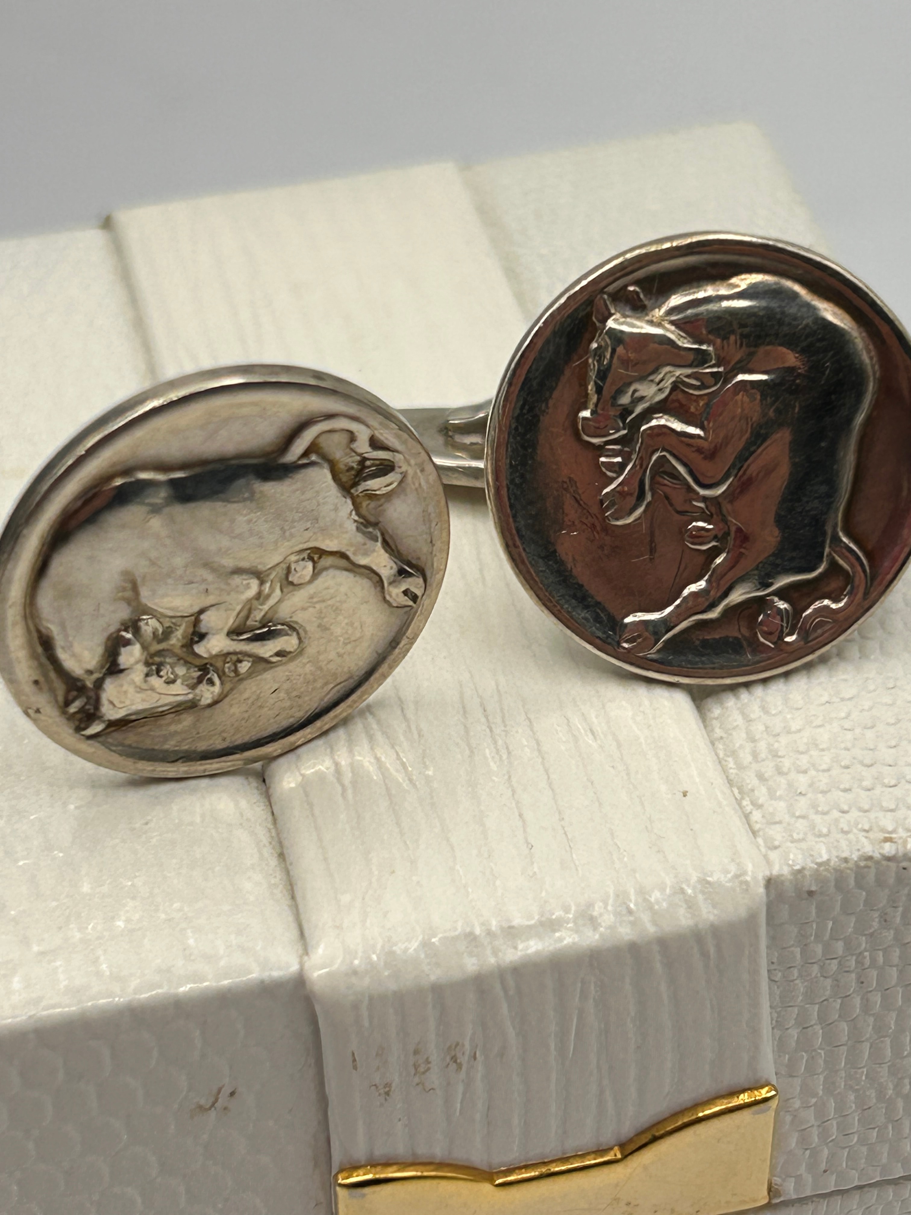 A pair of Georg Jensen Design No. 70 cufflinks, crafted in Silver (marked ‘925 S’ and ‘925’), Denmark. Each oval medallion features a high-relief stylized animal: one depicting a charging bull and the other a rearing boar or wild pig. The cufflinks are equipped with whale-back style findings. Additional ‘DENMARK’ and maker’s marks are visible.