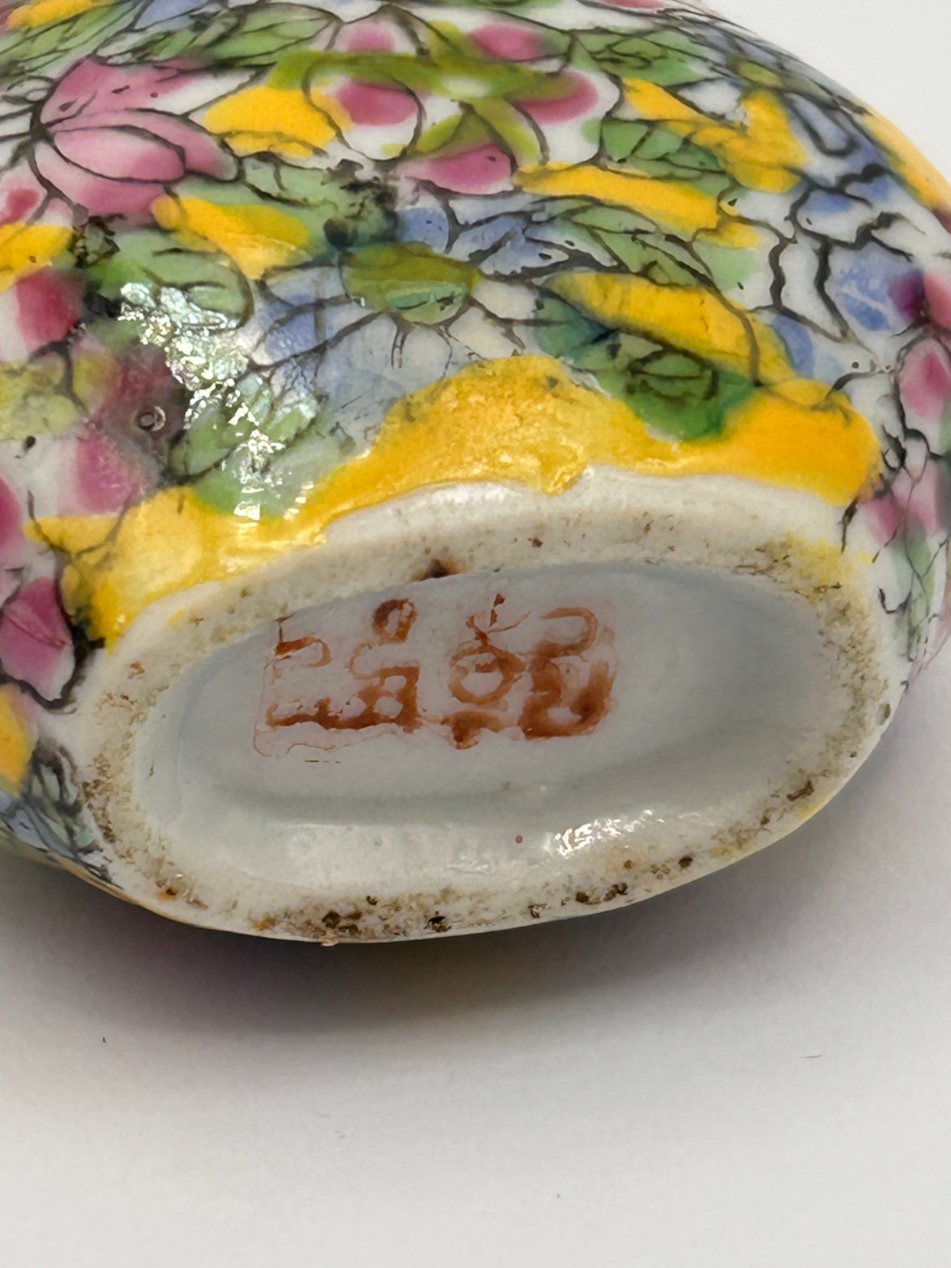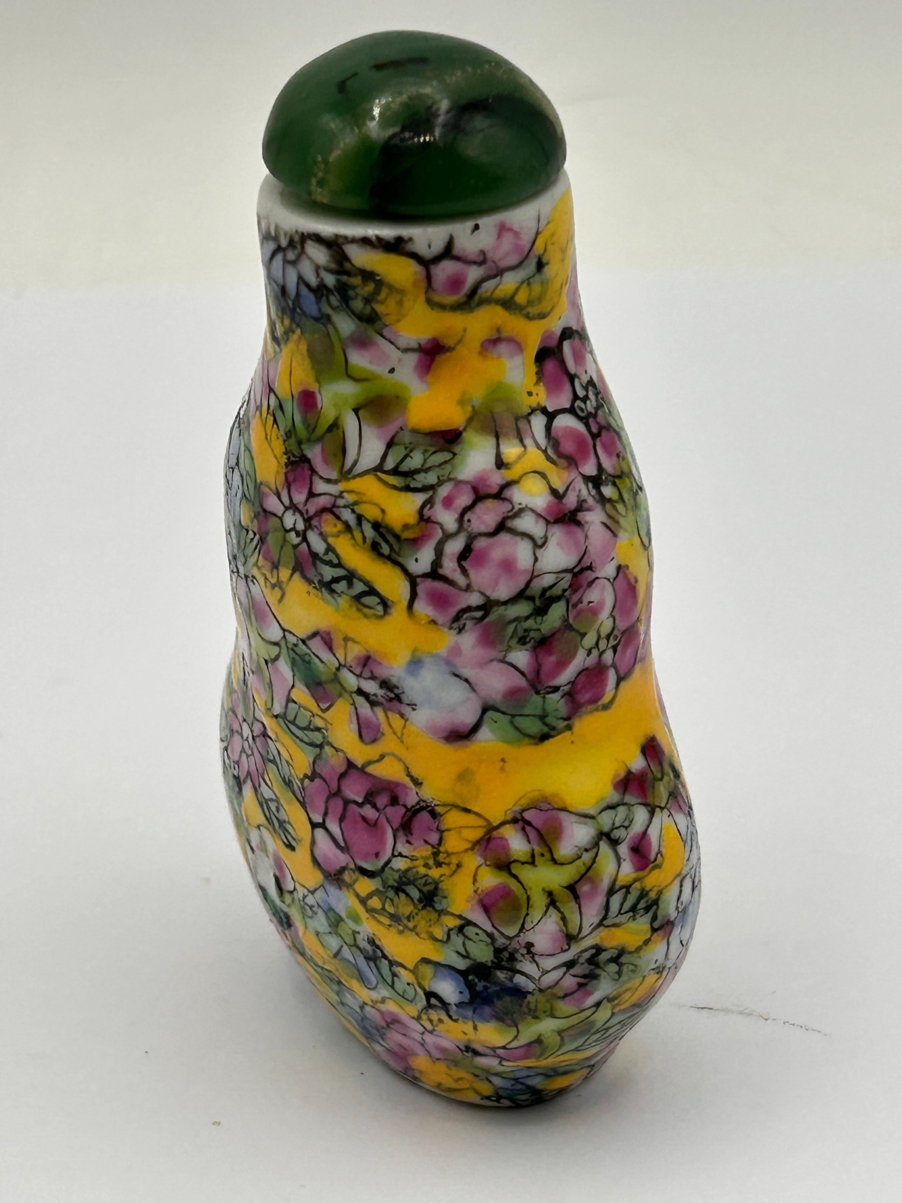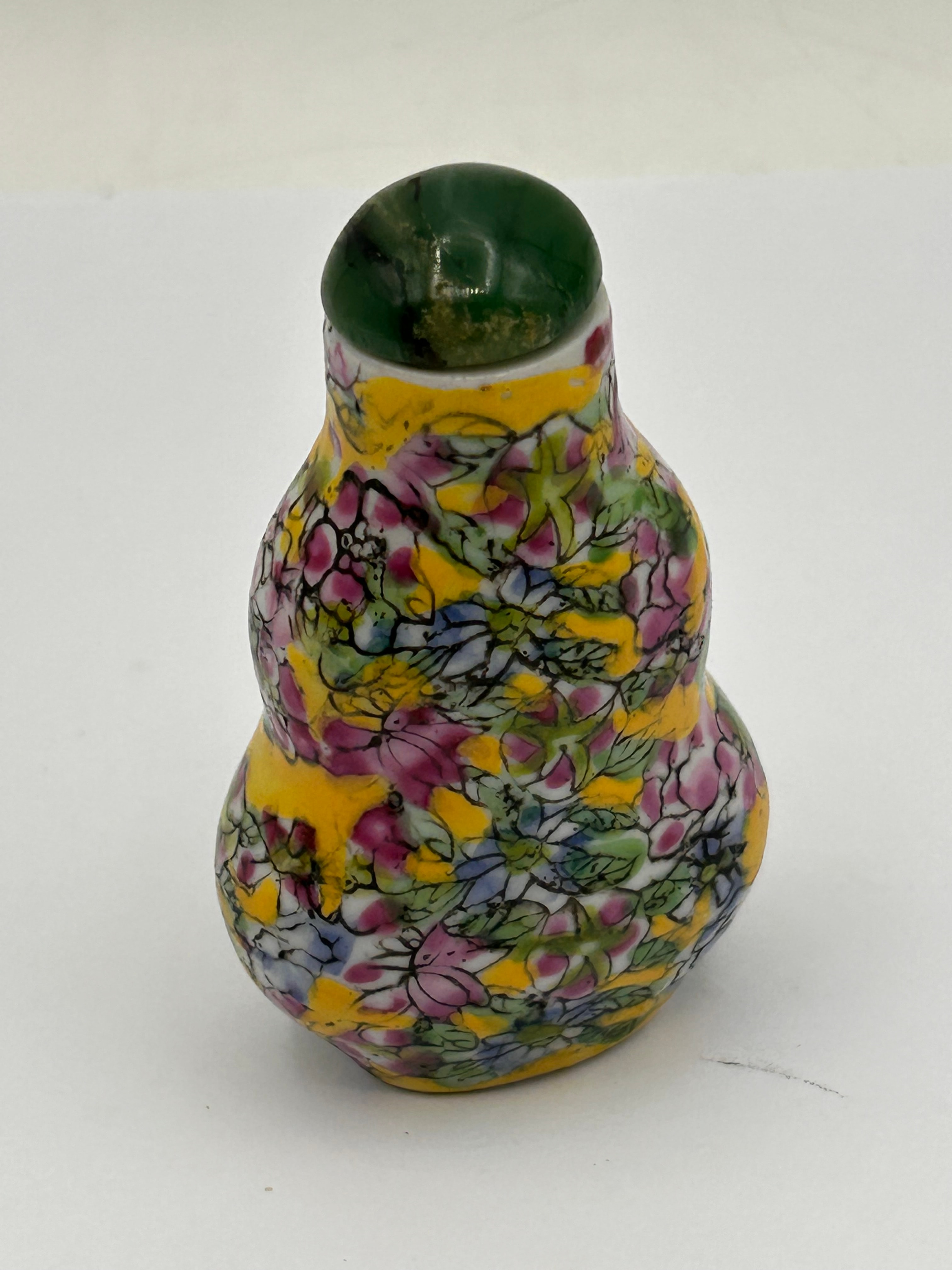 A Chinese porcelain ‘Wanhua’ (Ten Thousand Flowers) double-gourd snuff bottle. The body is extensively decorated with vibrant polychrome enamels, depicting an all-over pattern of various flowers and foliage on a bright yellow ground. It is topped with a polished dark green stone or glass stopper. The base features a red four-character reign mark, “大清乾隆” (Dà Qīng Qiánlóng), which translates to “Great Qing Qianlong.”