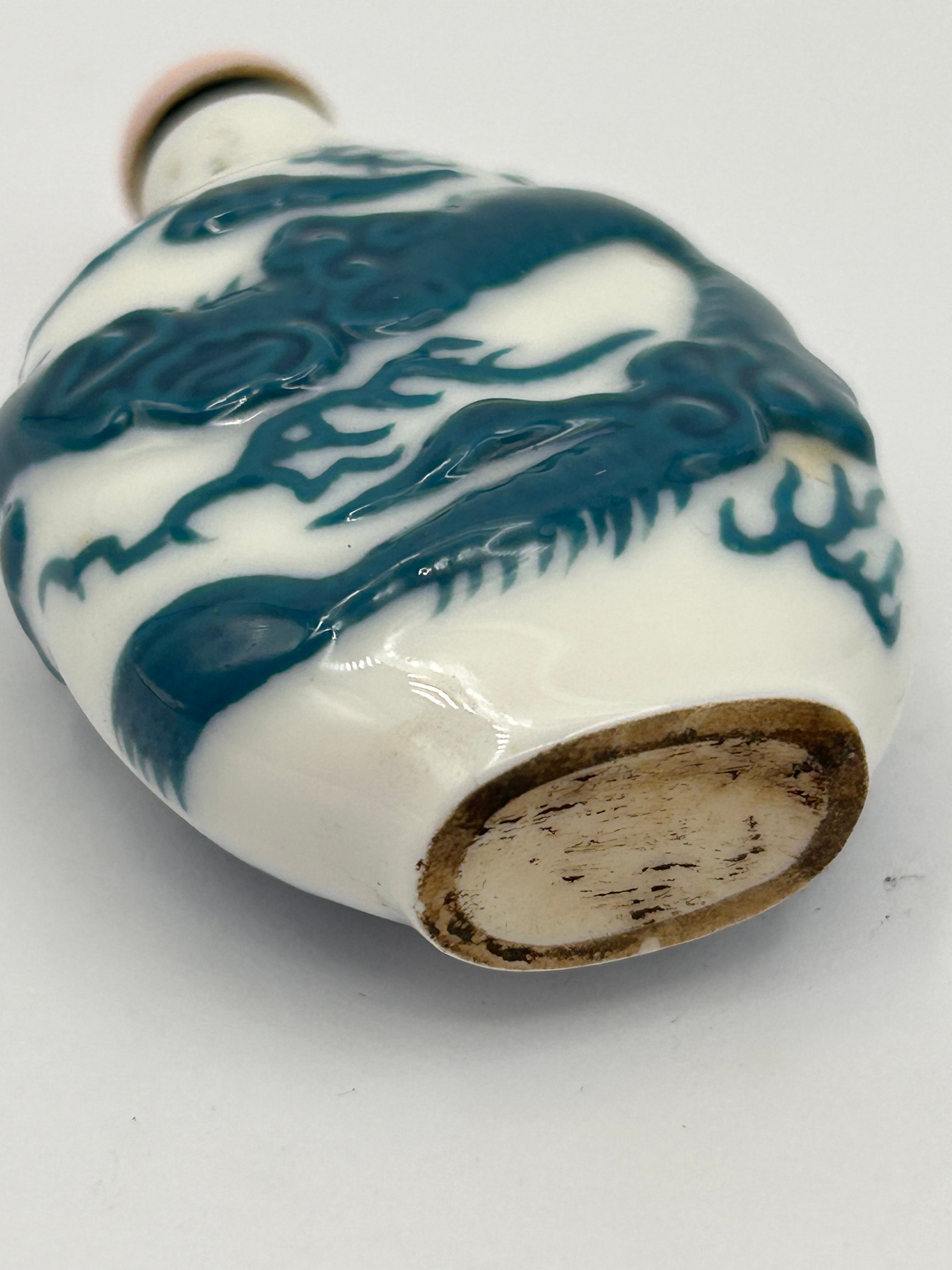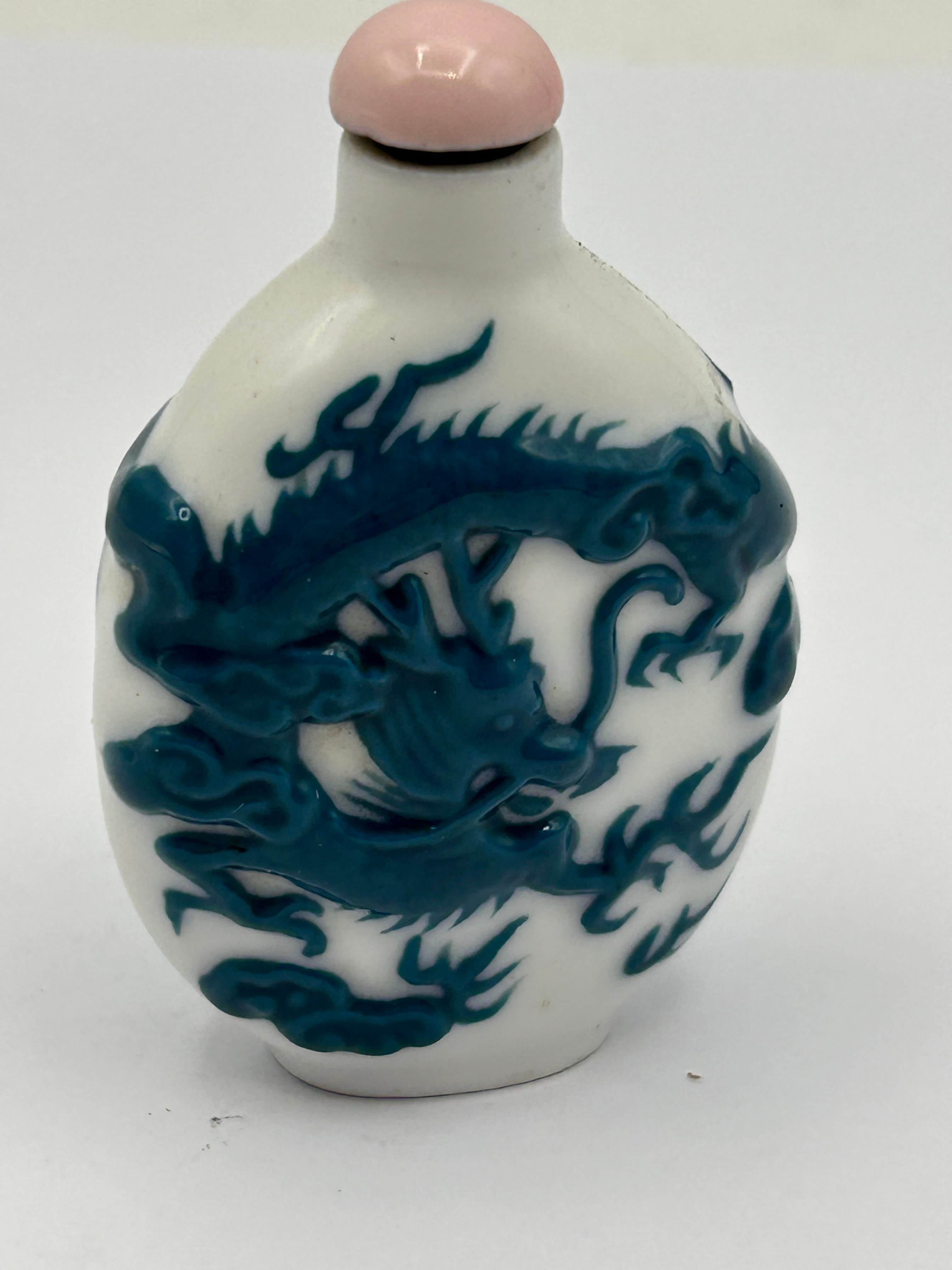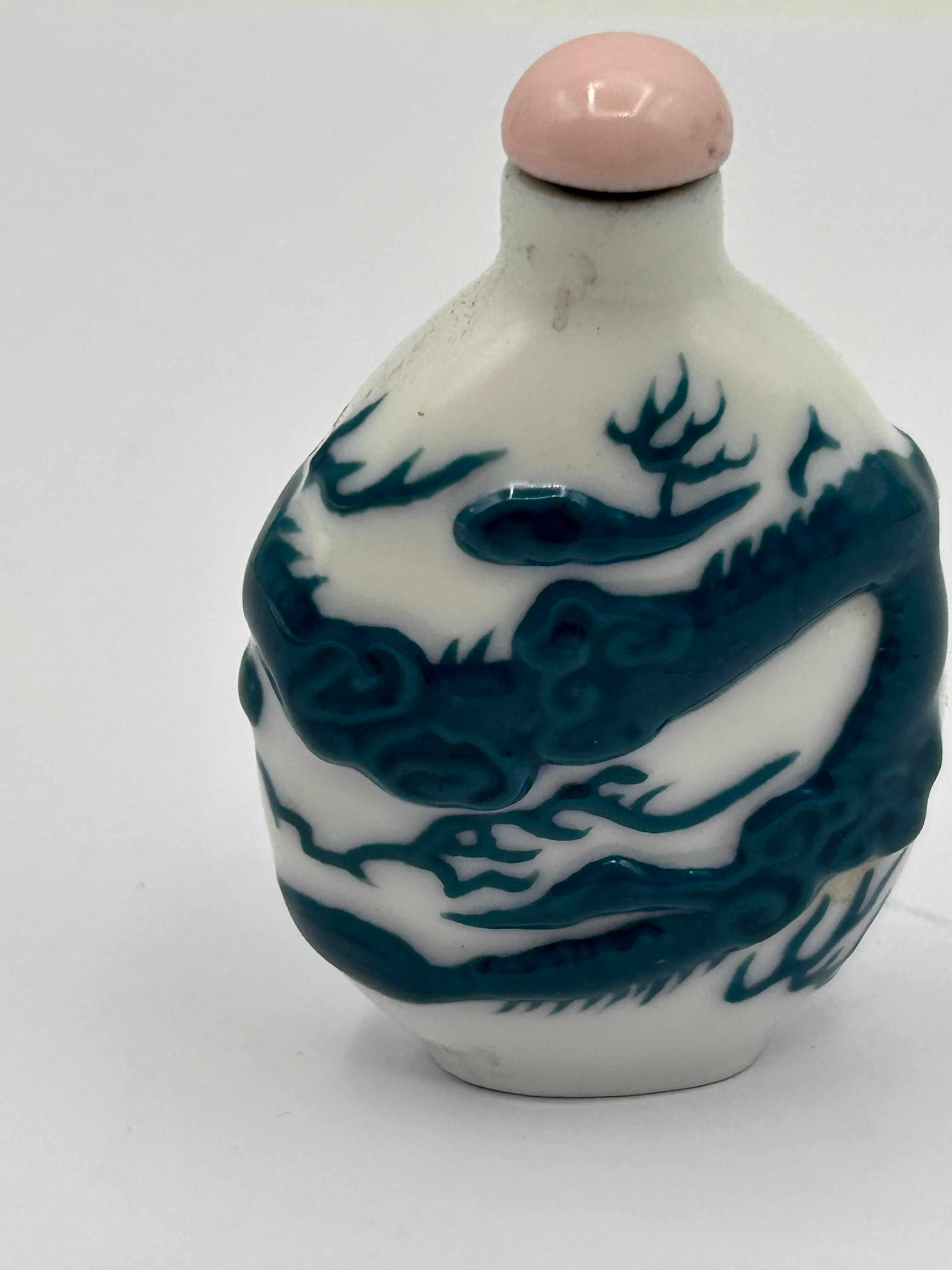 An antique Chinese white porcelain snuff bottle, featuring a raised relief decoration of a coiling dragon. The flattened ovoid body is crafted from white glazed porcelain, with the dragon rendered in a striking teal or dark blue glaze, exhibiting detailed features such as scales and claws. It is fitted with a light pink, rounded stopper, possibly of coral or a similar stone, set into its narrow neck. The base is unglazed and oval-shaped, revealing a light brown ceramic material.