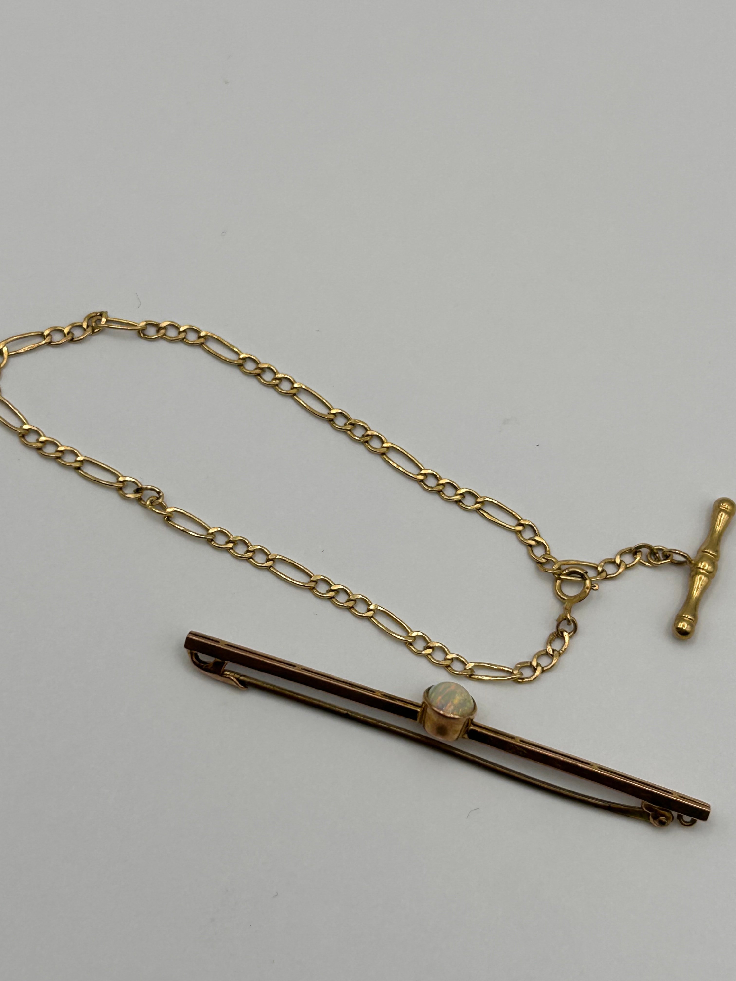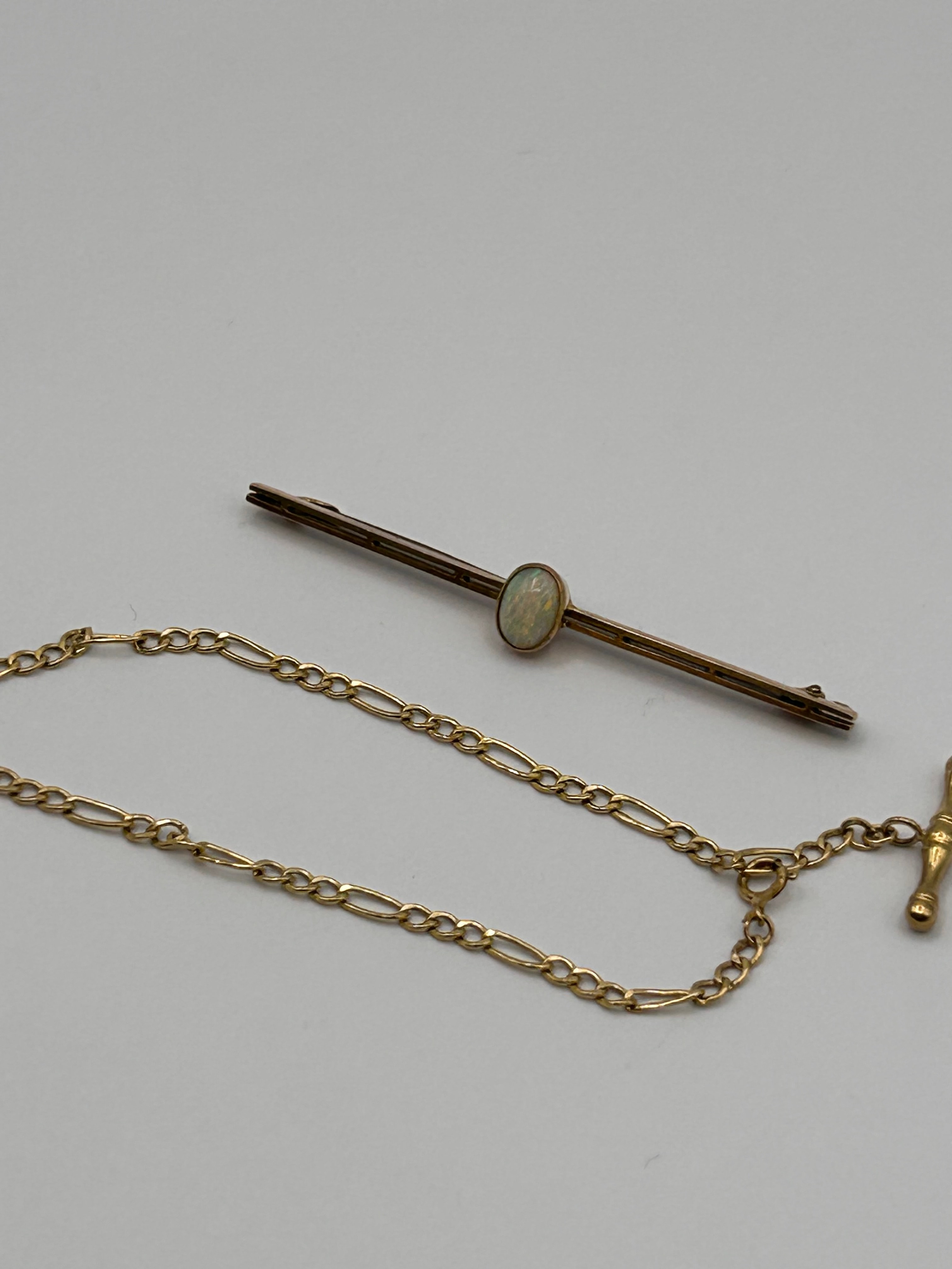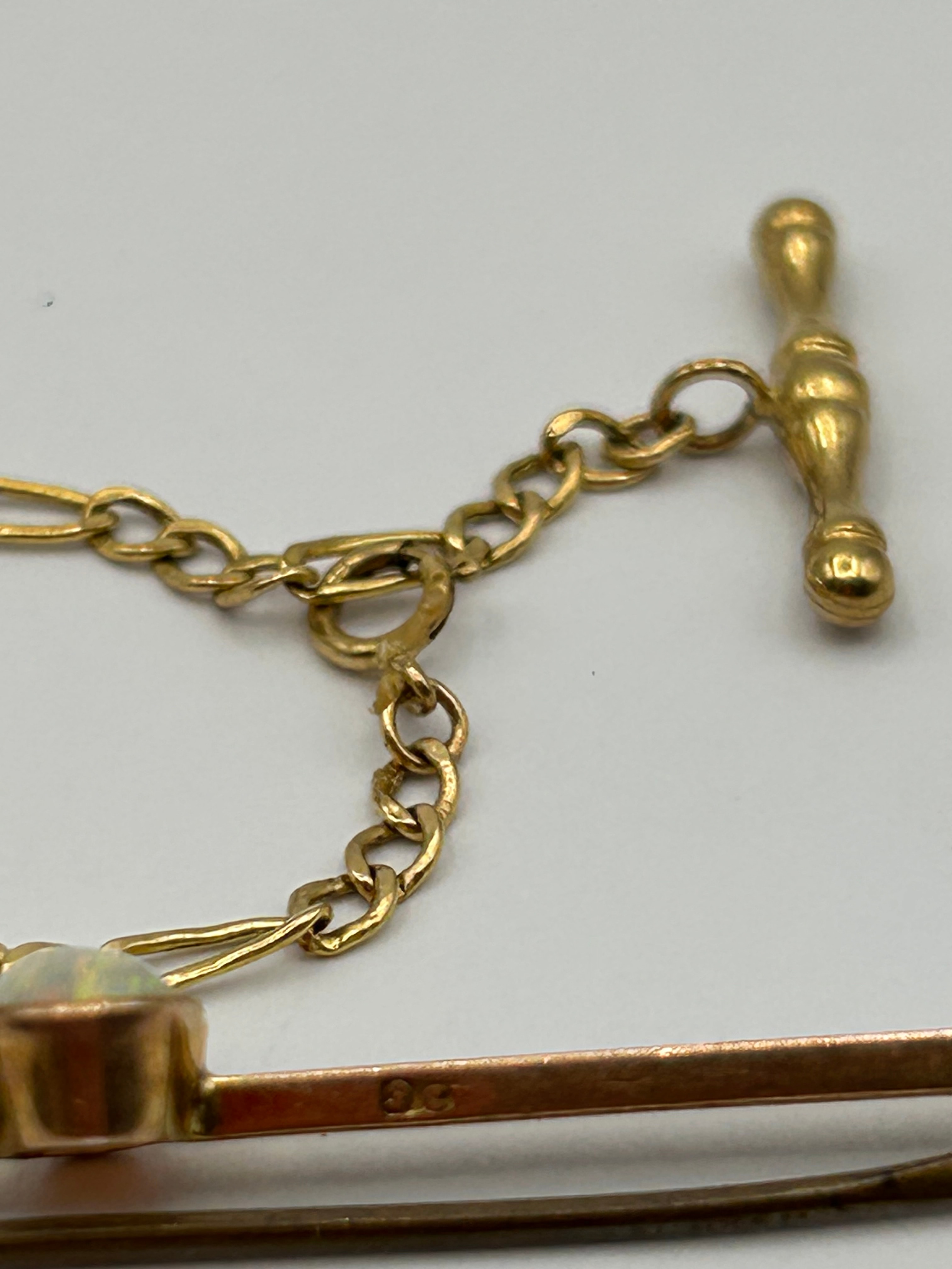 A Victorian 9 ct gold bar pin featuring a central oval cabochon-cut opal, set within a yellow-toned metal frame. The item’s materials are confirmed to be 9 ct gold. An integrated figaro-style safety chain, consistent with a fob chain design, connects the pin to a decorative T-bar toggle. The reverse of the bar pin is stamped ‘9C’.