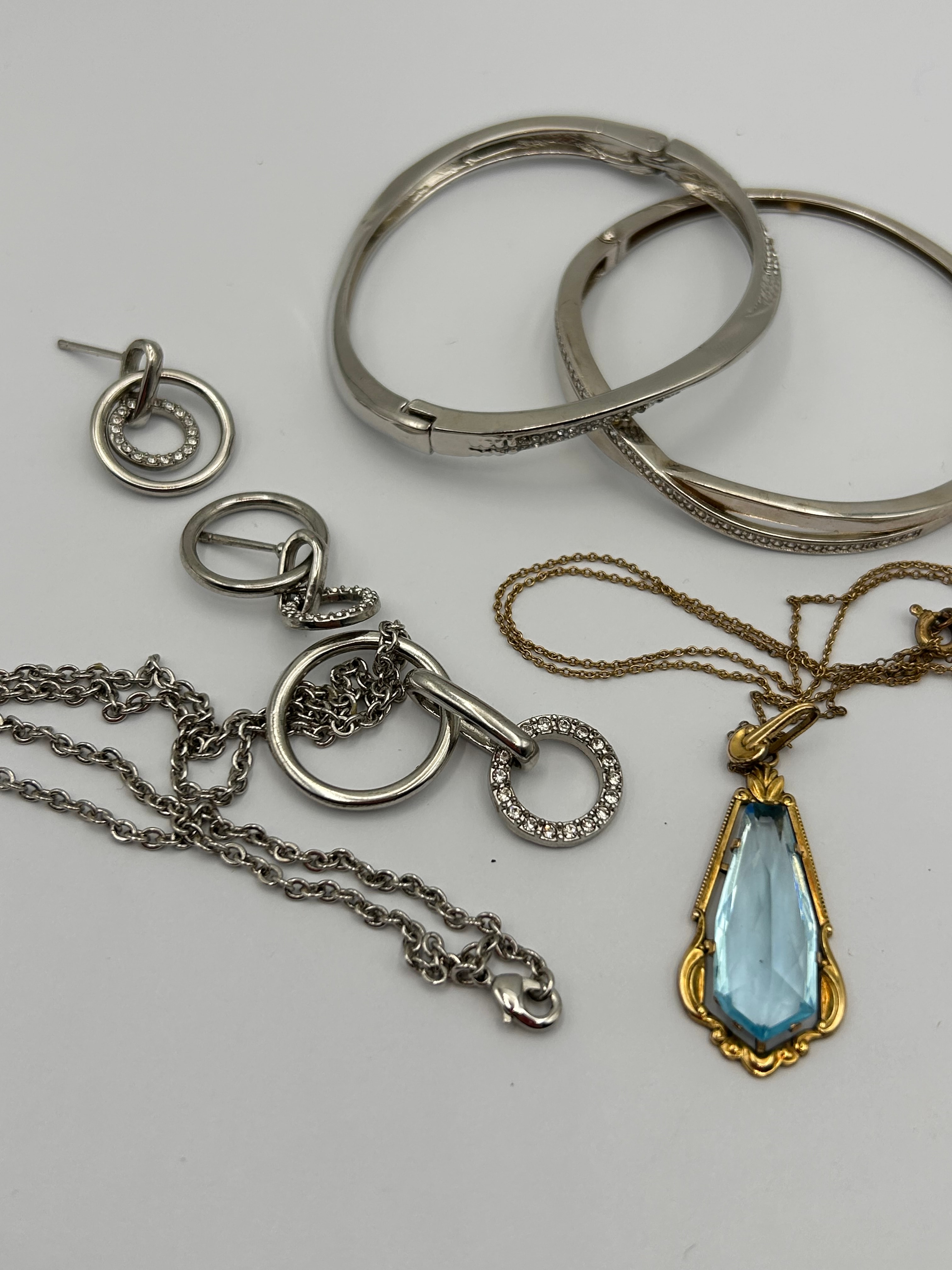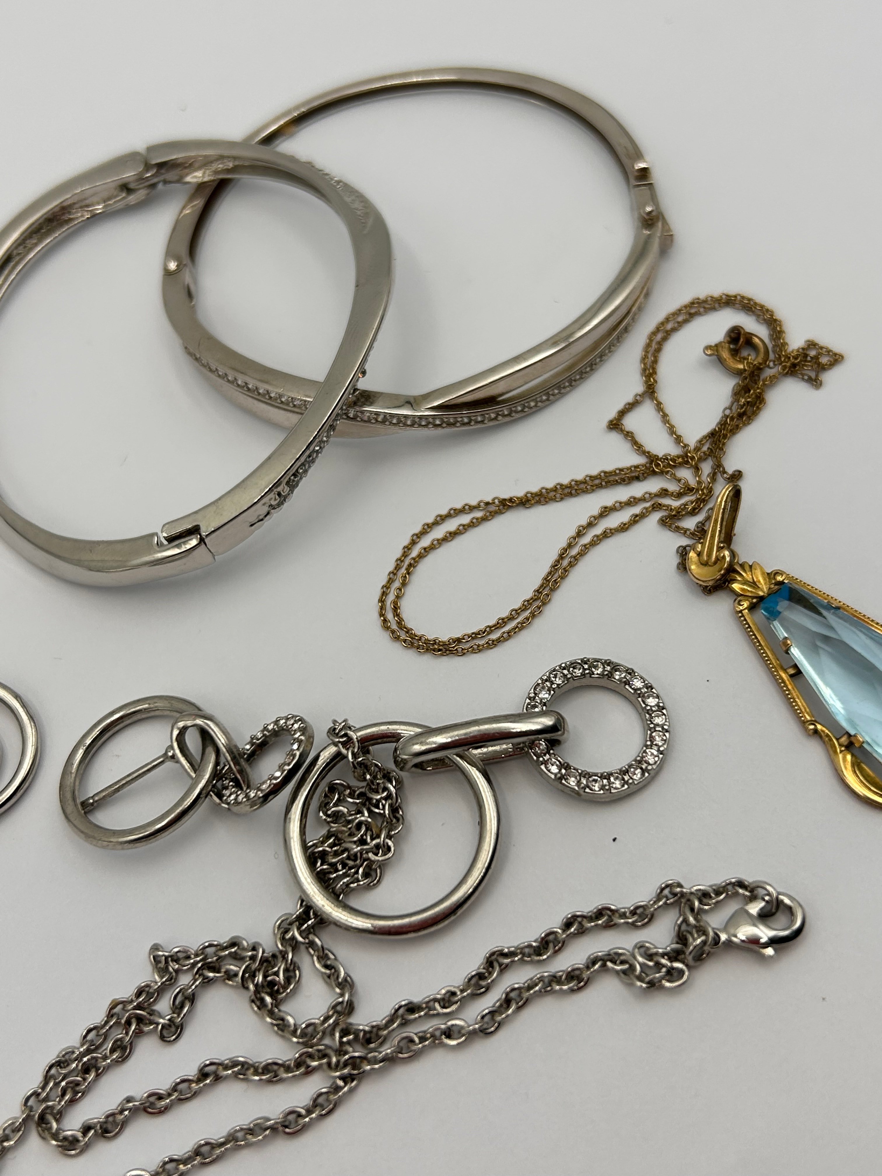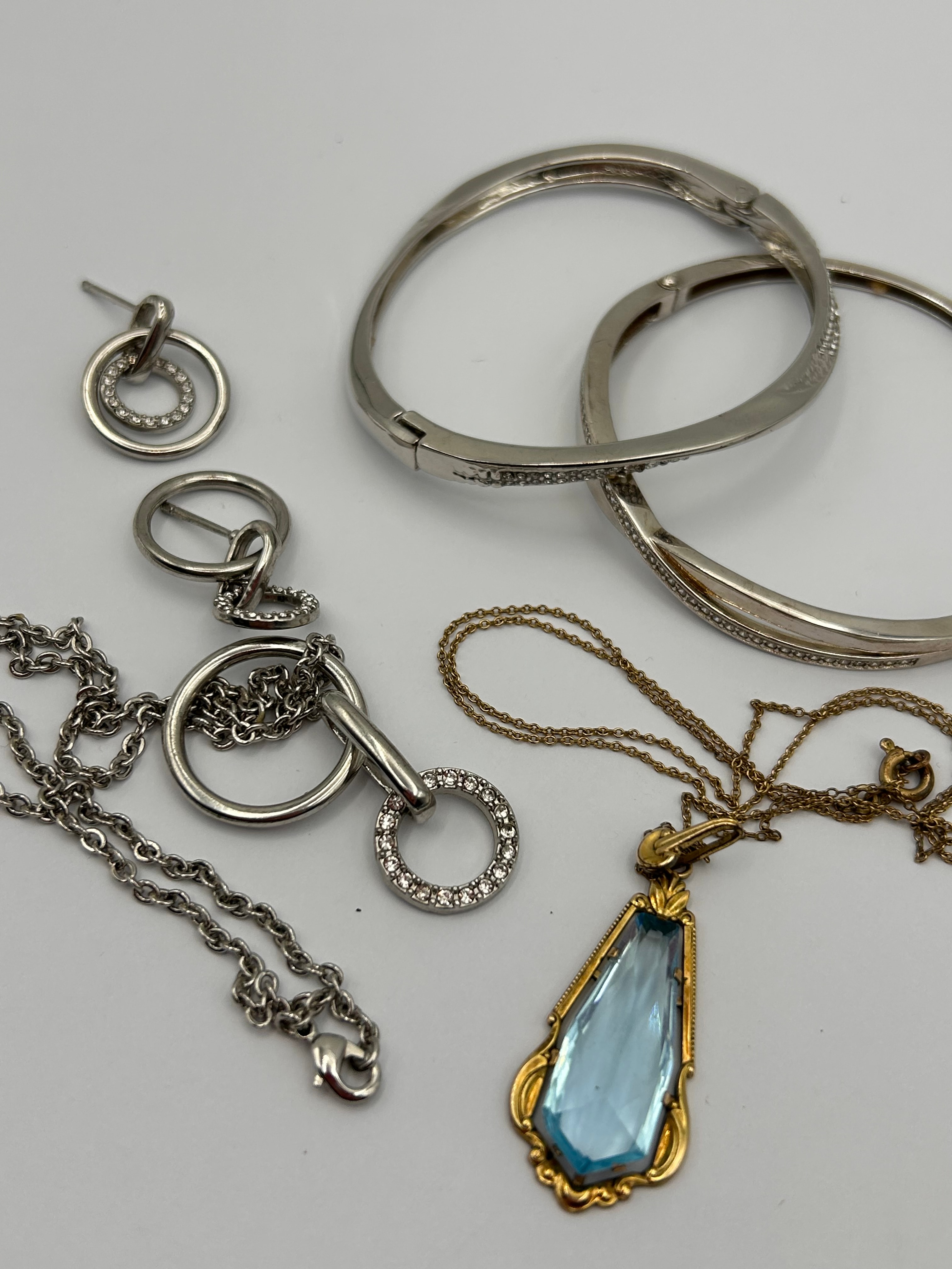 A collection of contemporary jewelry comprising various pieces crafted from silver-toned and gold-toned metals, some adorned with clear, brilliant-cut pavé-set stones. The collection includes two hinged bangles, one visibly marked ‘SWAROVSKI’, and a pair of stud earrings, all in a silver-tone finish with stone accents. A silver-toned necklace features a linked chain connected to an elaborate component incorporating multiple rings, a heart, and a pavé-set ring, suggesting a horse-bit style motif. Accompanying these is a gold-toned necklace with a delicate chain and a prominent pendant, which showcases a large, faceted, light blue, elongated drop-shaped gemstone set within an ornate gold-toned frame, in an Art Deco style.
