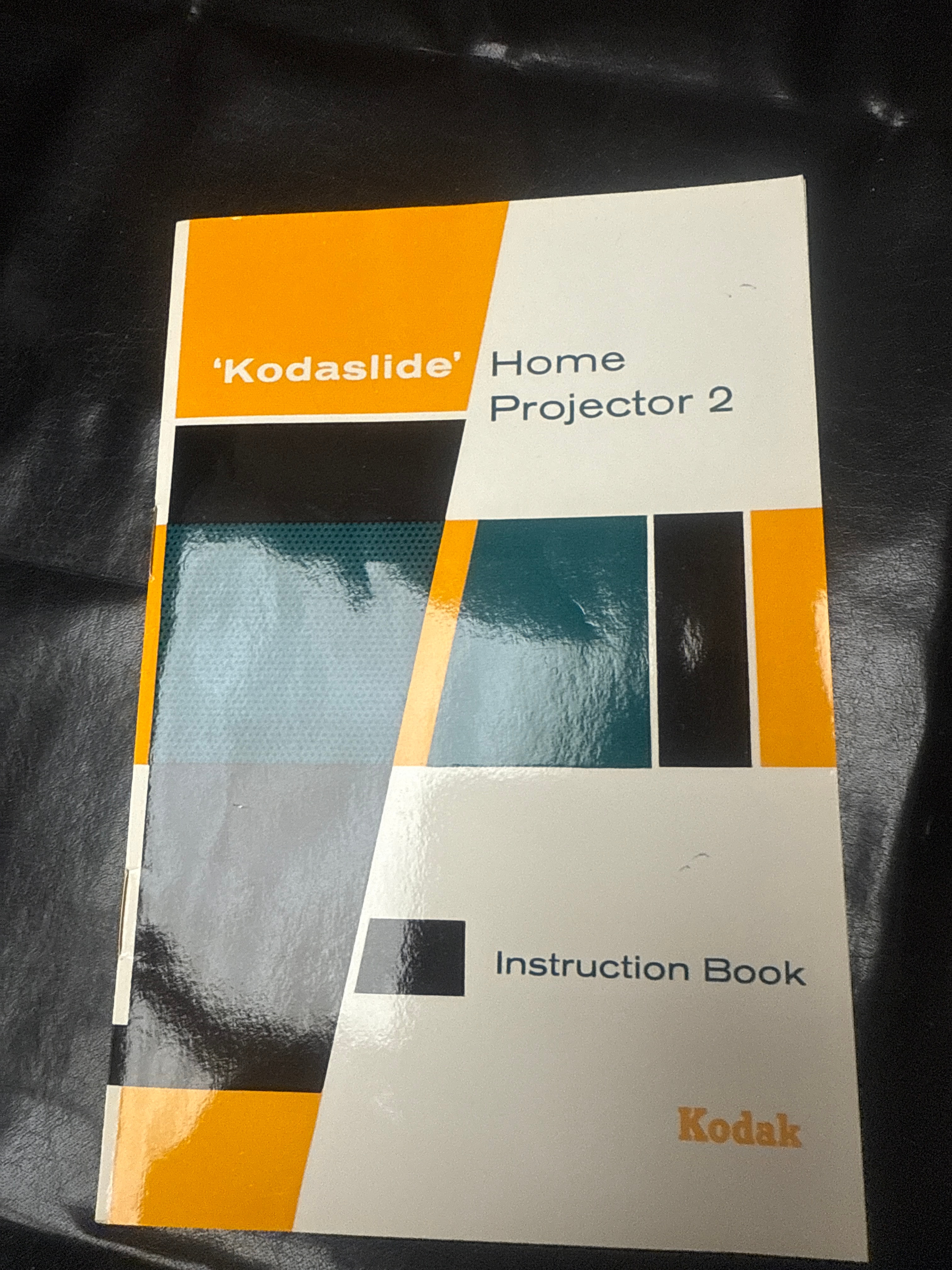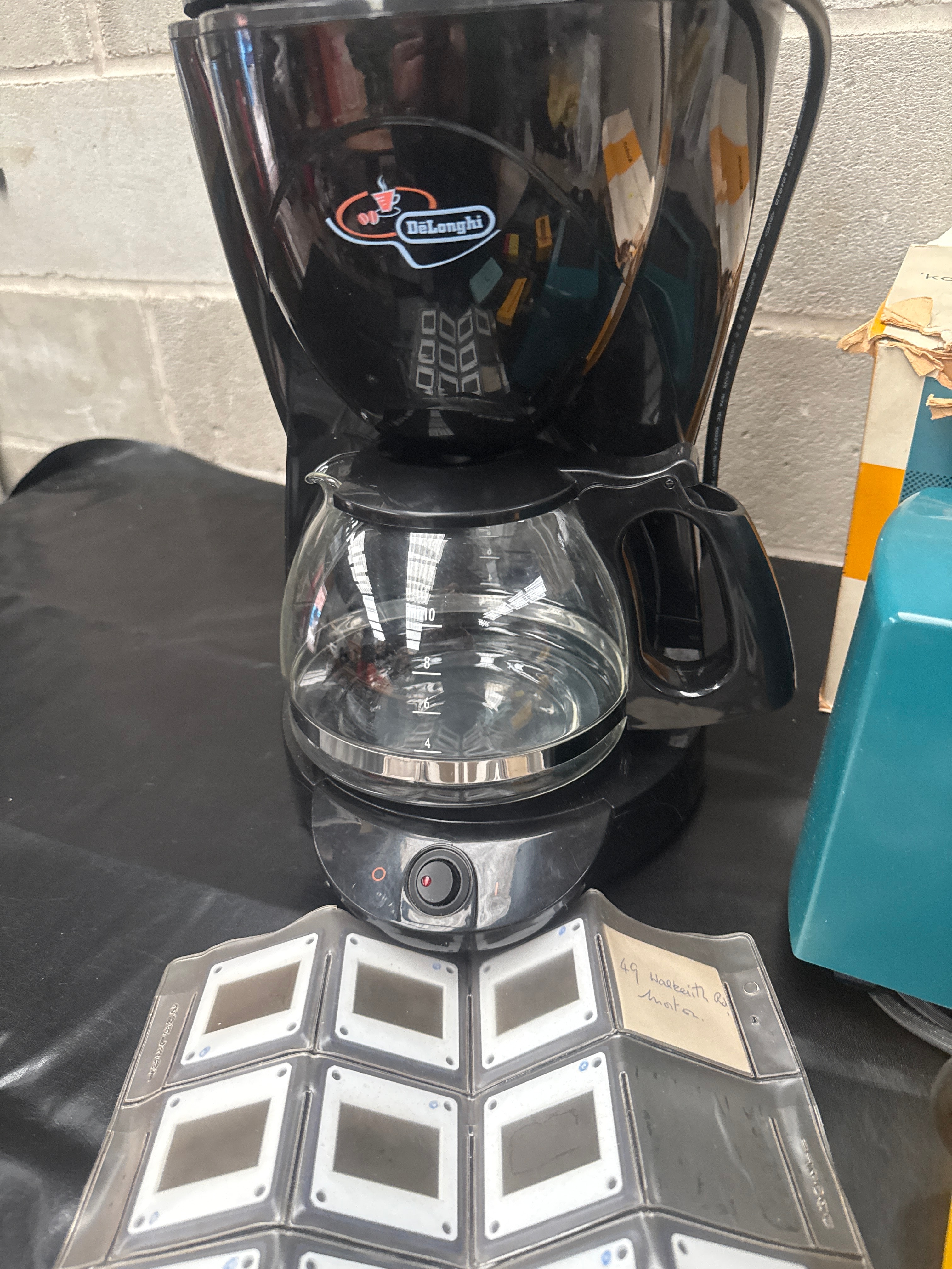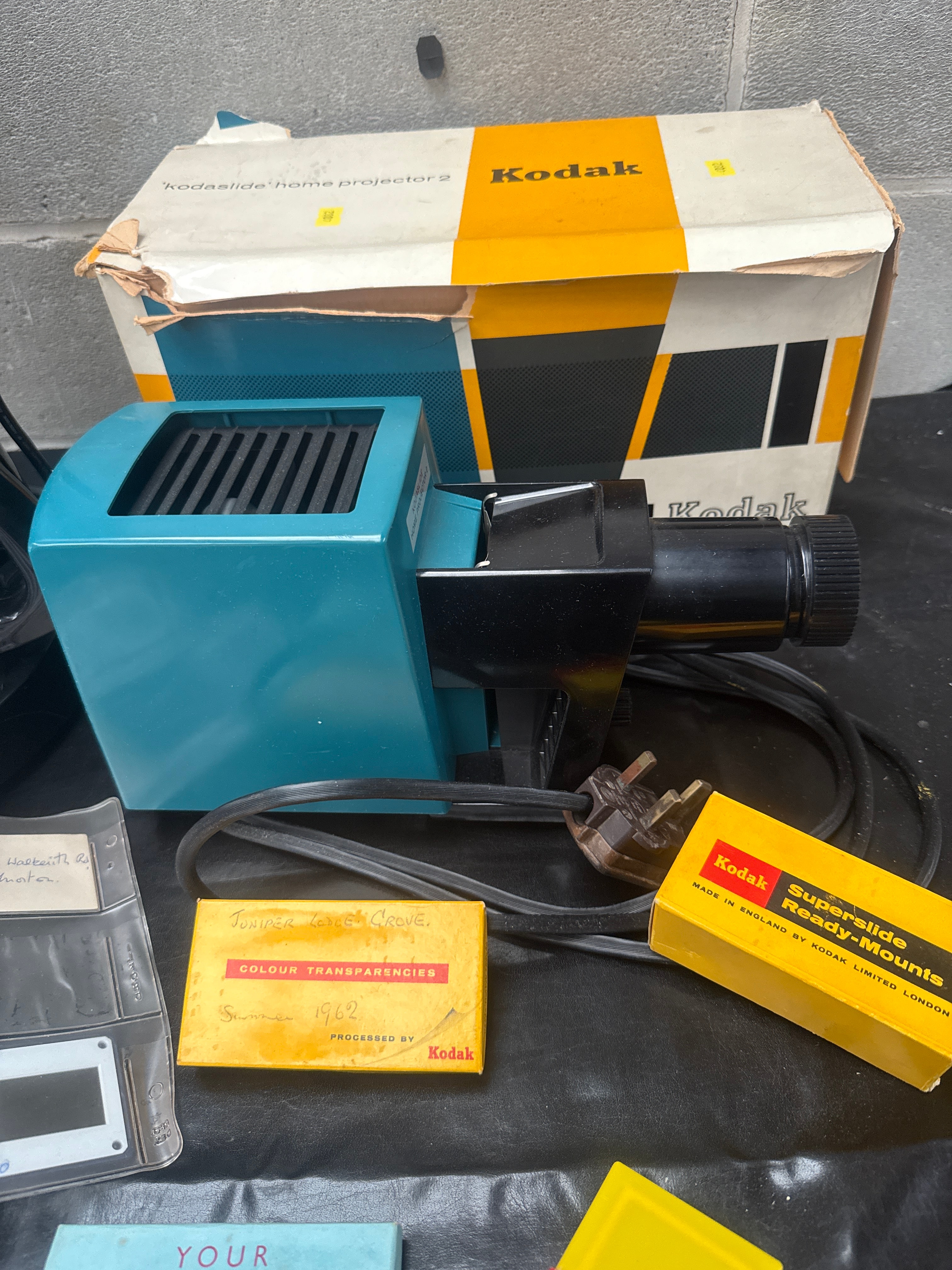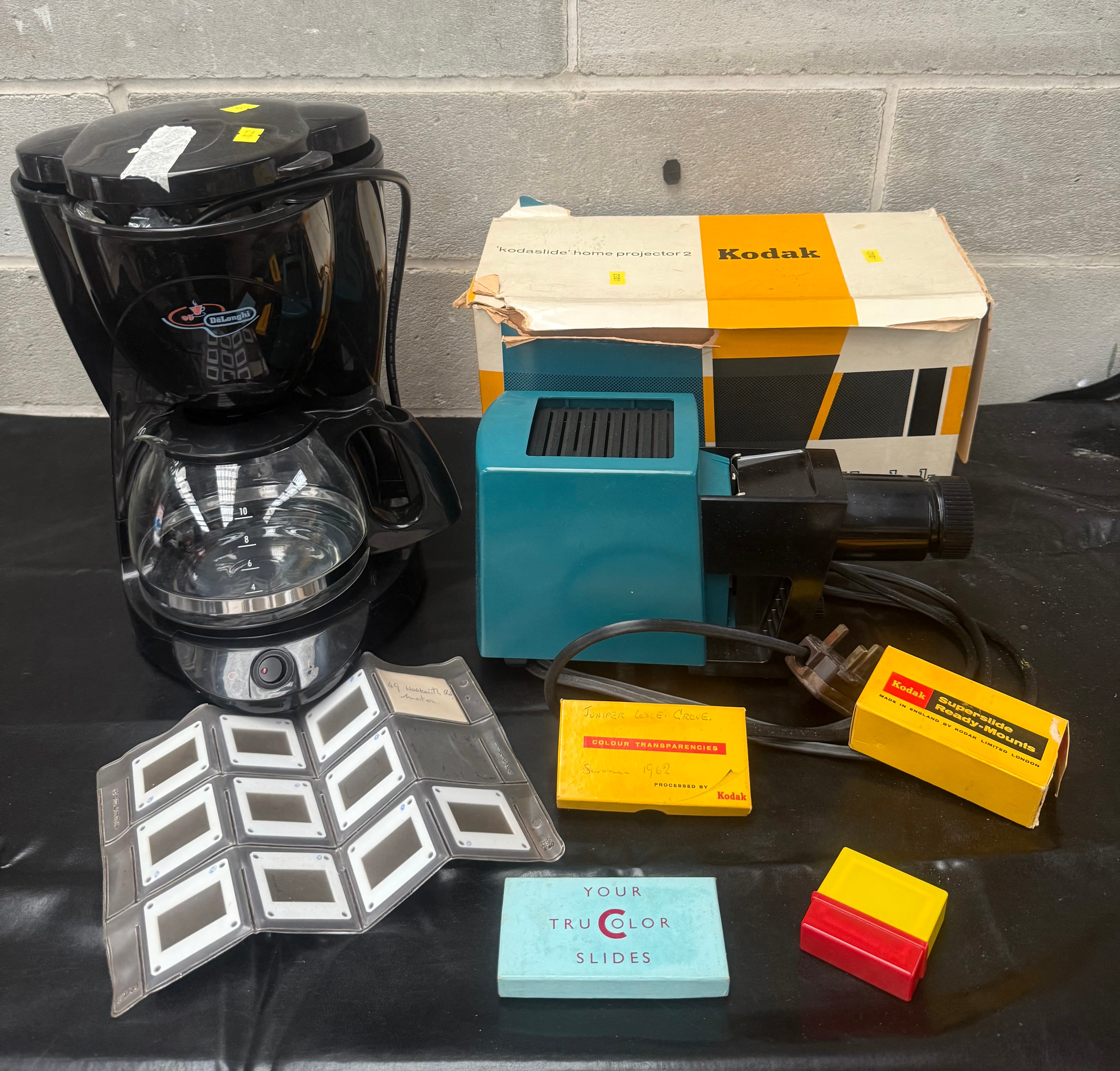 This lot features a vintage Kodak ‘Kodaslide’ Home Projector 2, a teal and black unit, accompanied by its instruction manual and original cardboard box. The projector’s period is consistent with an early 1960s, supported by a “Summer 1962” dated slide box found among the accessories. Also included is a modern black plastic DeLonghi drip coffee maker with a clear glass carafe. The lot further comprises various slide-related accessories, including multiple Kodak-branded cardboard boxes for “COLOUR TRANSPARENCIES,” “Superslide Ready-Mounts” (Made in England by Kodak Limited London), and “YOUR TRU COLOR SLIDES,” along with a plastic sheet of empty slide mounts and small red and yellow plastic boxes.