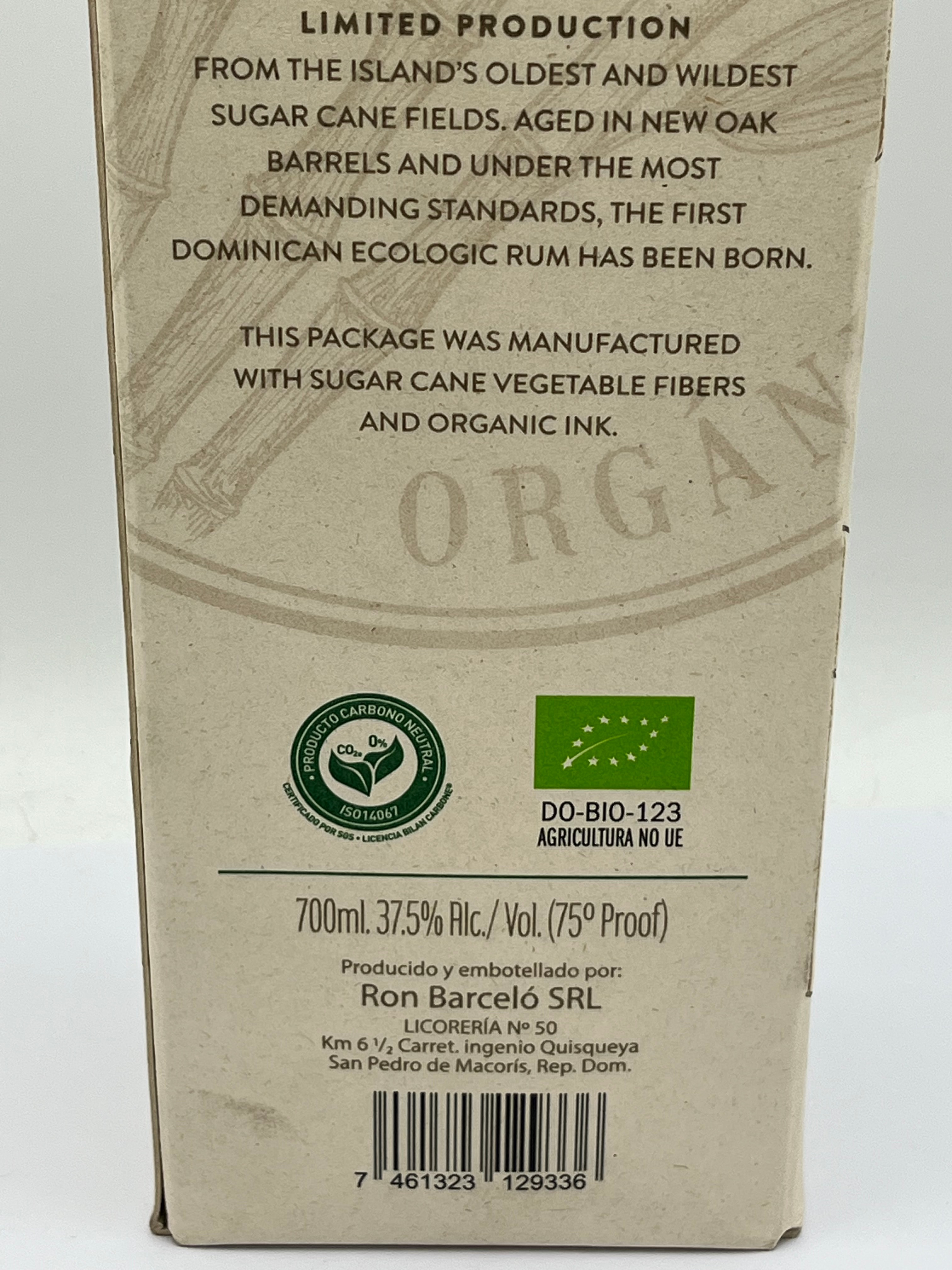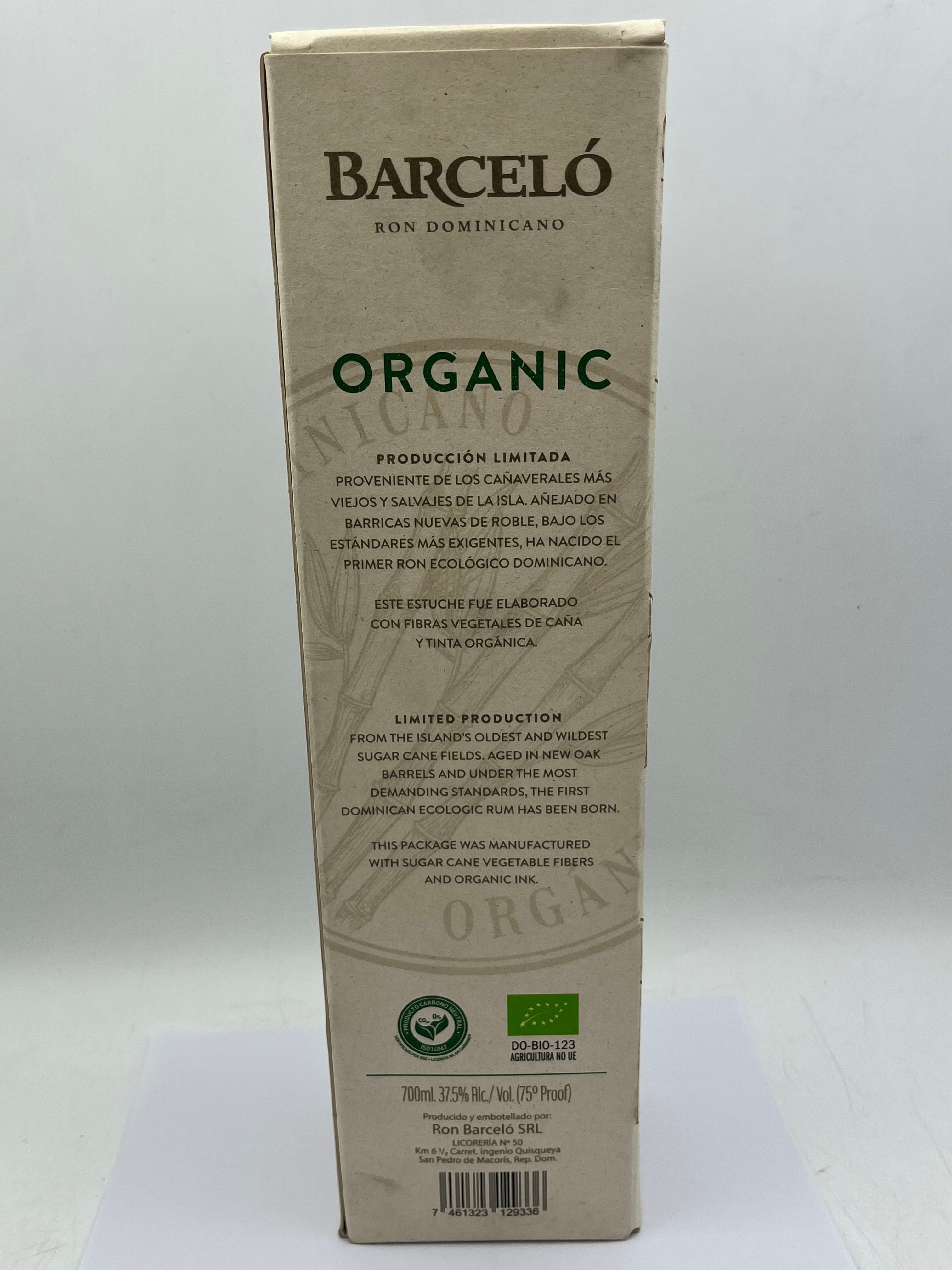 A bottle of Barceló Ron Dominicano Organic Rum. This item is presented in its original, unopened rectangular light brown cardboard retail package. The box features a front cut-out revealing part of the bottle and its label. The packaging and visible bottle label are branded “BARCELÓ RON DOMINICANO ORGANIC.” Text on the packaging, in both English and Spanish, indicates it is a “LIMITED PRODUCTION” “Dominican ecological rum” aged in new oak barrels. The packaging itself is manufactured from “sugar cane vegetable fibers and organic ink.” Key markings include a volume of “700 ml” and an alcohol content of “37.5% Alc./Vol. (75° Proof).” The item features certifications such as the EU organic logo (“DO-BIO-123 AGRICULTURA NO UE,” translating to “NON-EU AGRICULTURE”) and a “Producto Carbono Neutral” (Carbon Neutral Product) logo, certified by SGS to ISO14067. The barcode is 7461323129336.