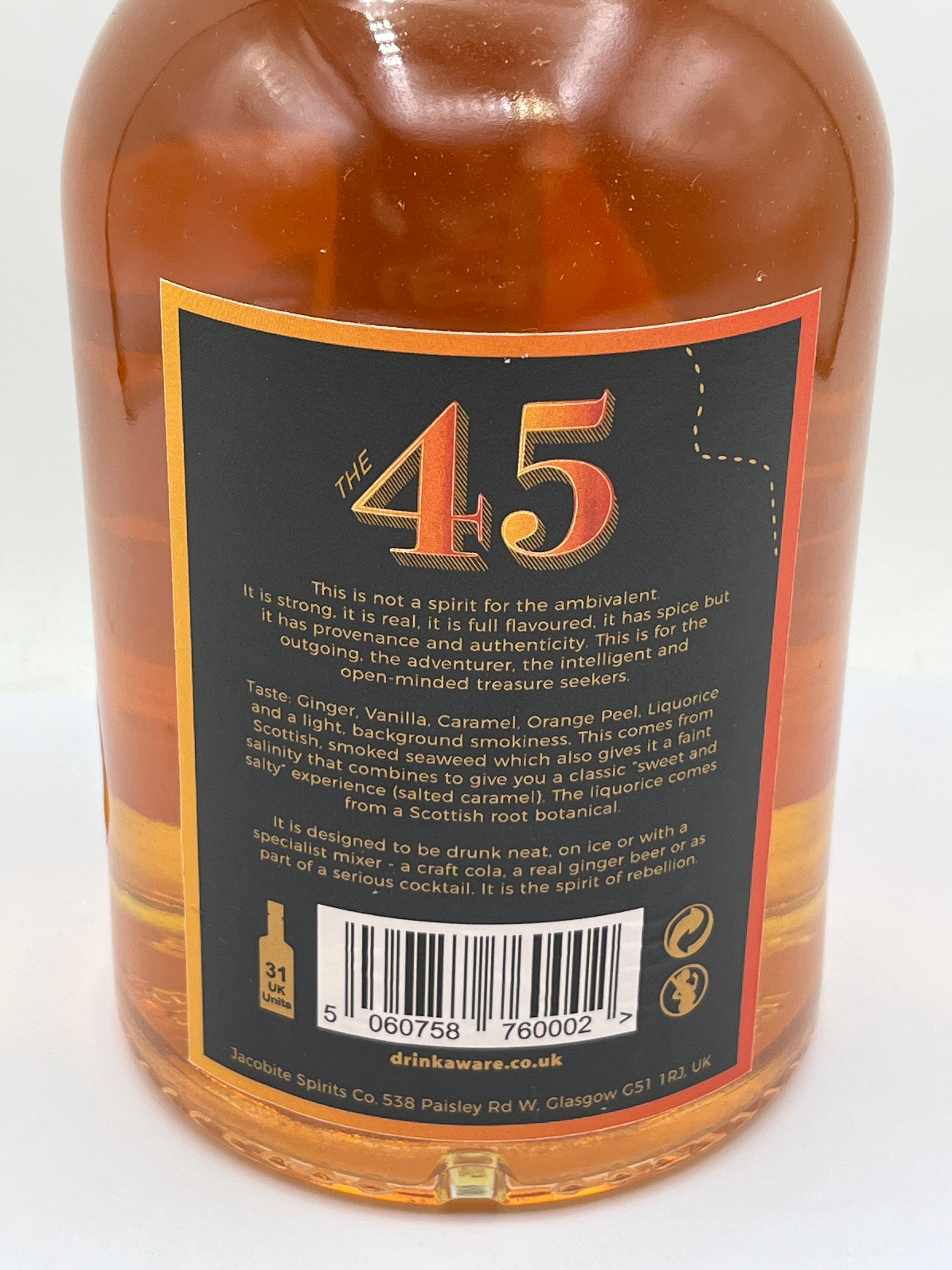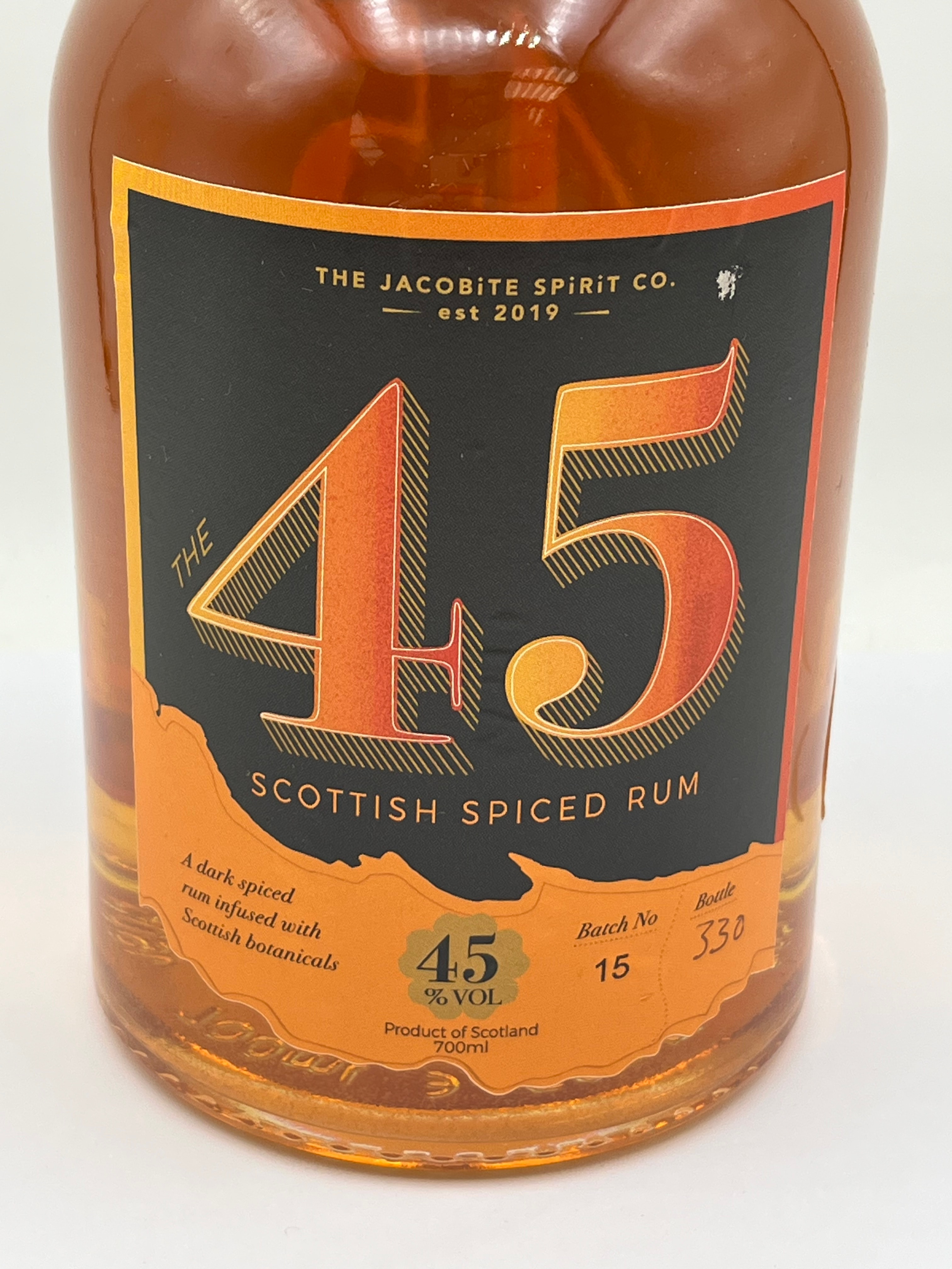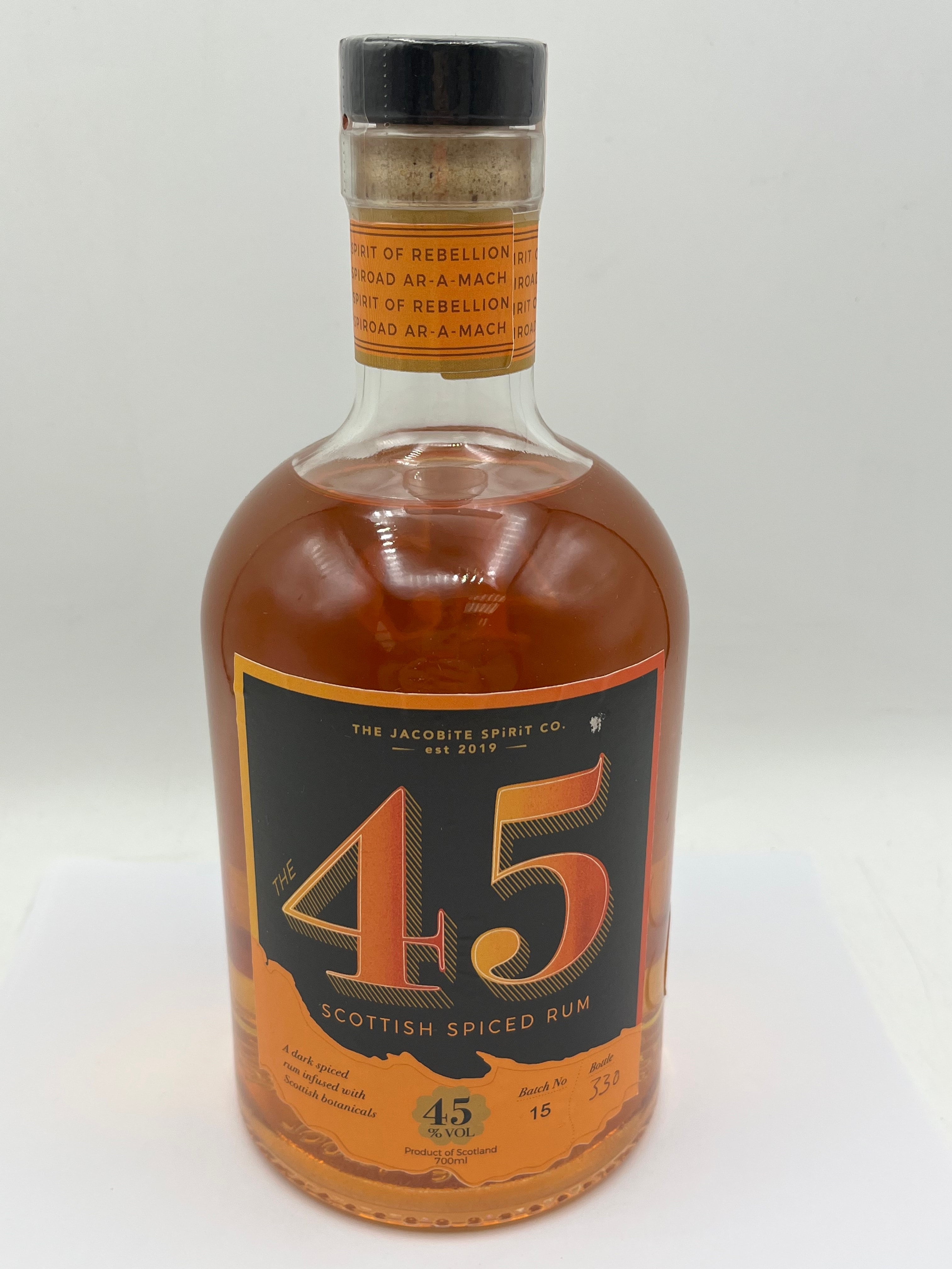 A bottle of The 45 Scottish Spiced Rum by The Jacobite Spirit Co., established 2019. This dark spiced rum is infused with Scottish botanicals, bottled at 45% VOL, and contains 700ml. The item is from Batch No 15, Bottle 330, and is a product of Scotland. The clear glass bottle contains an amber-colored liquid and is sealed with a dark-colored cork stopper. An orange neck label beneath the stopper reads “SPIRIT OF REBELLION” and “AR-A-MACH,” with “Ar-a-mach” translating from Scottish Gaelic to ‘uprising’ or ‘rebellion’. The reverse label provides tasting notes, listing ingredients including ginger, vanilla, caramel, orange peel, liquorice, and smoked seaweed. It also includes the producer’s Glasgow address, a barcode, and “drinkaware.co.uk”.