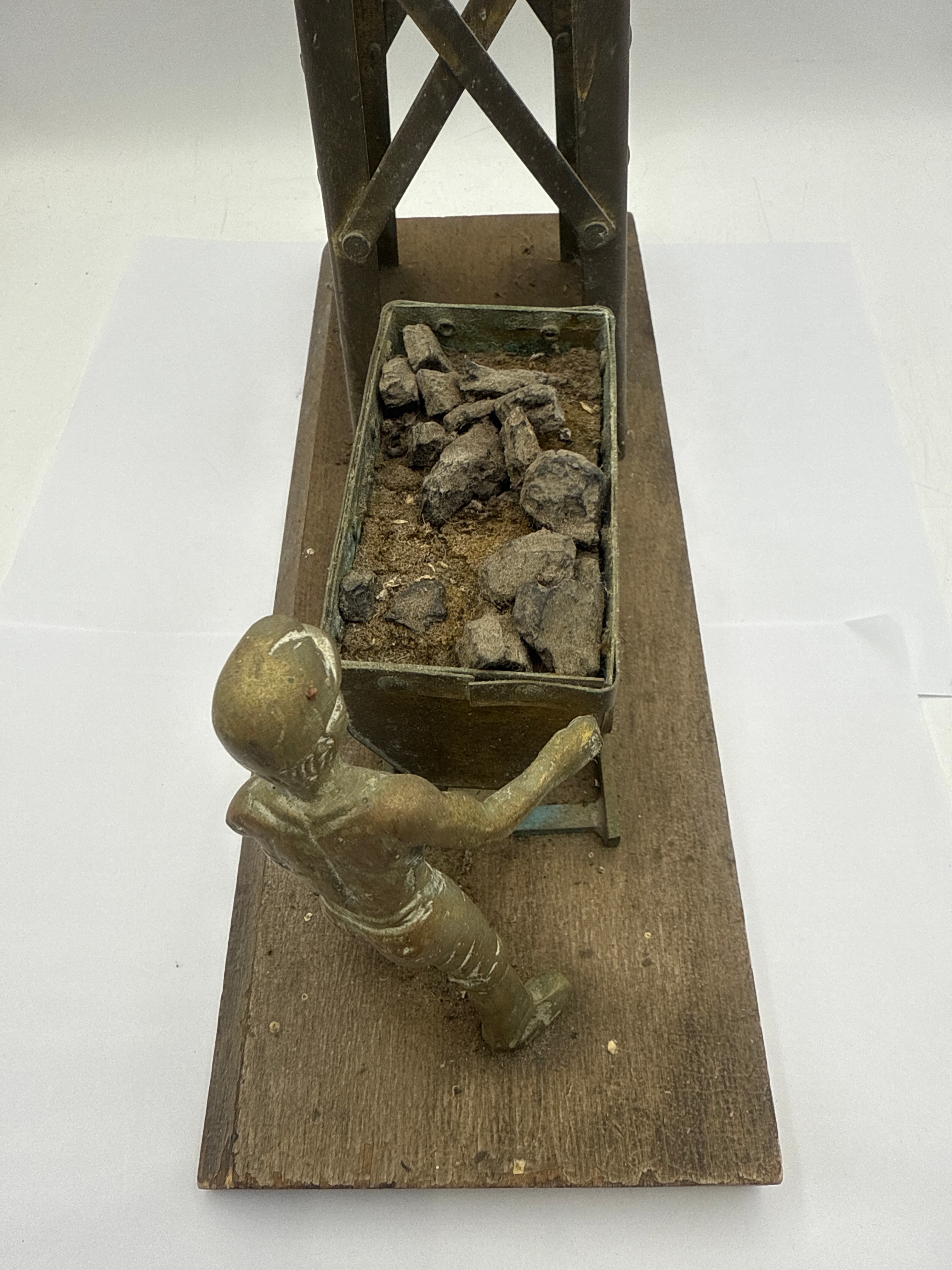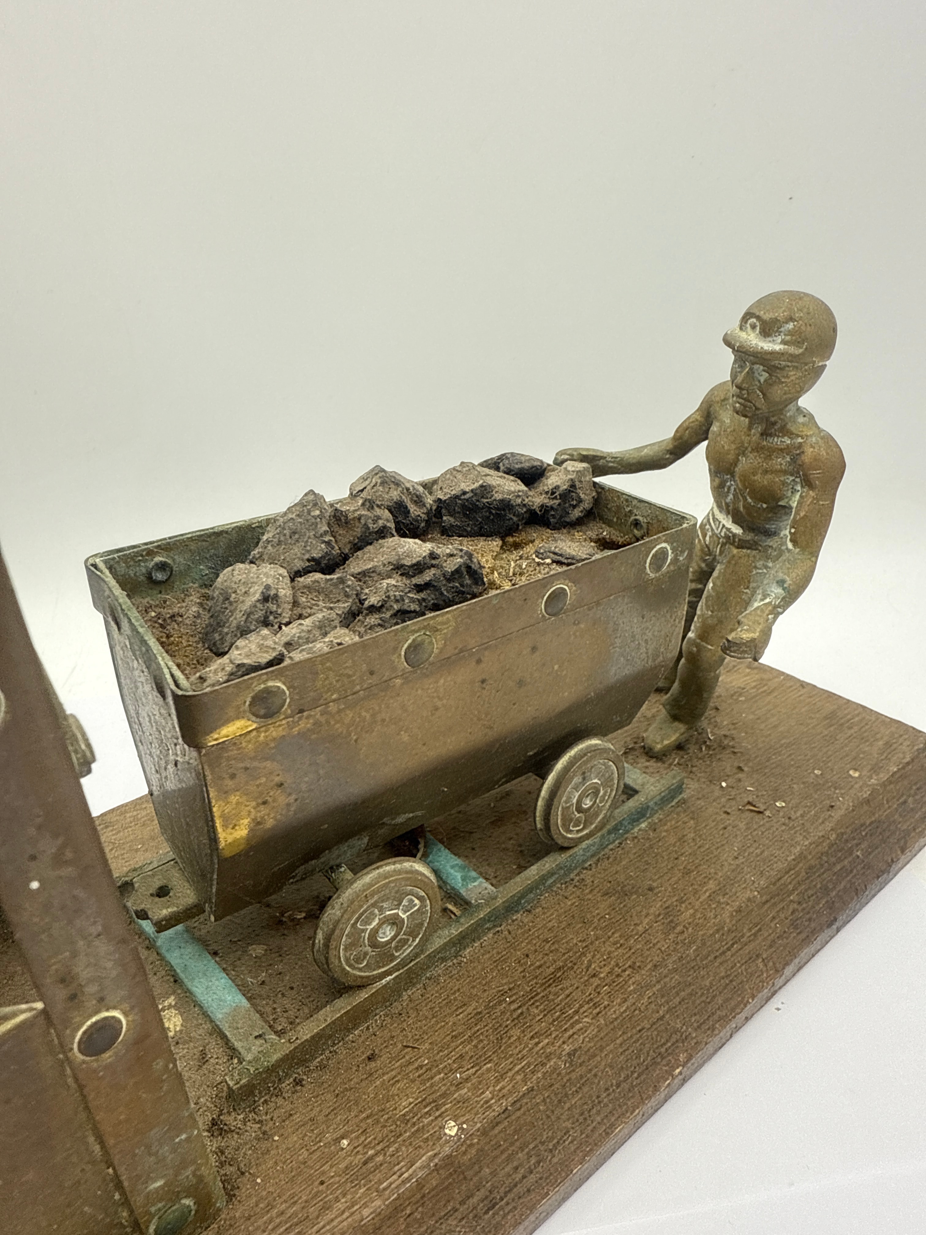 A vintage brass model depicting a Welsh mining scene. The diorama features a miniature, patinated brass or bronze-colored metal mining headframe with a spoked wheel, positioned alongside a mining cart filled with realistic dark, lumpy material resembling coal mixed with dirt. A small, similarly patinated metal figure of a miner, wearing a helmet, is depicted pushing the cart. All components are mounted on a rectangular dark wood base.