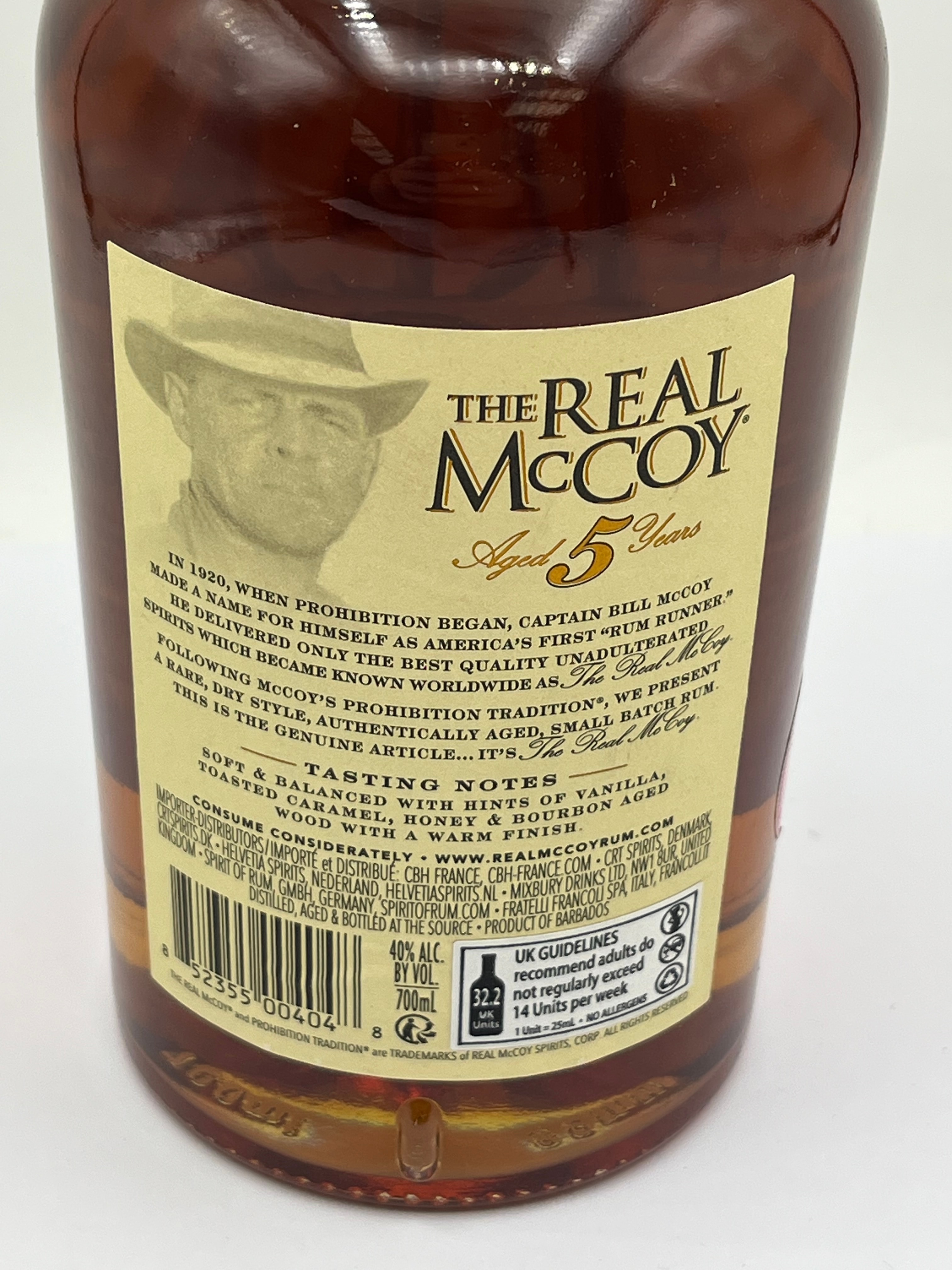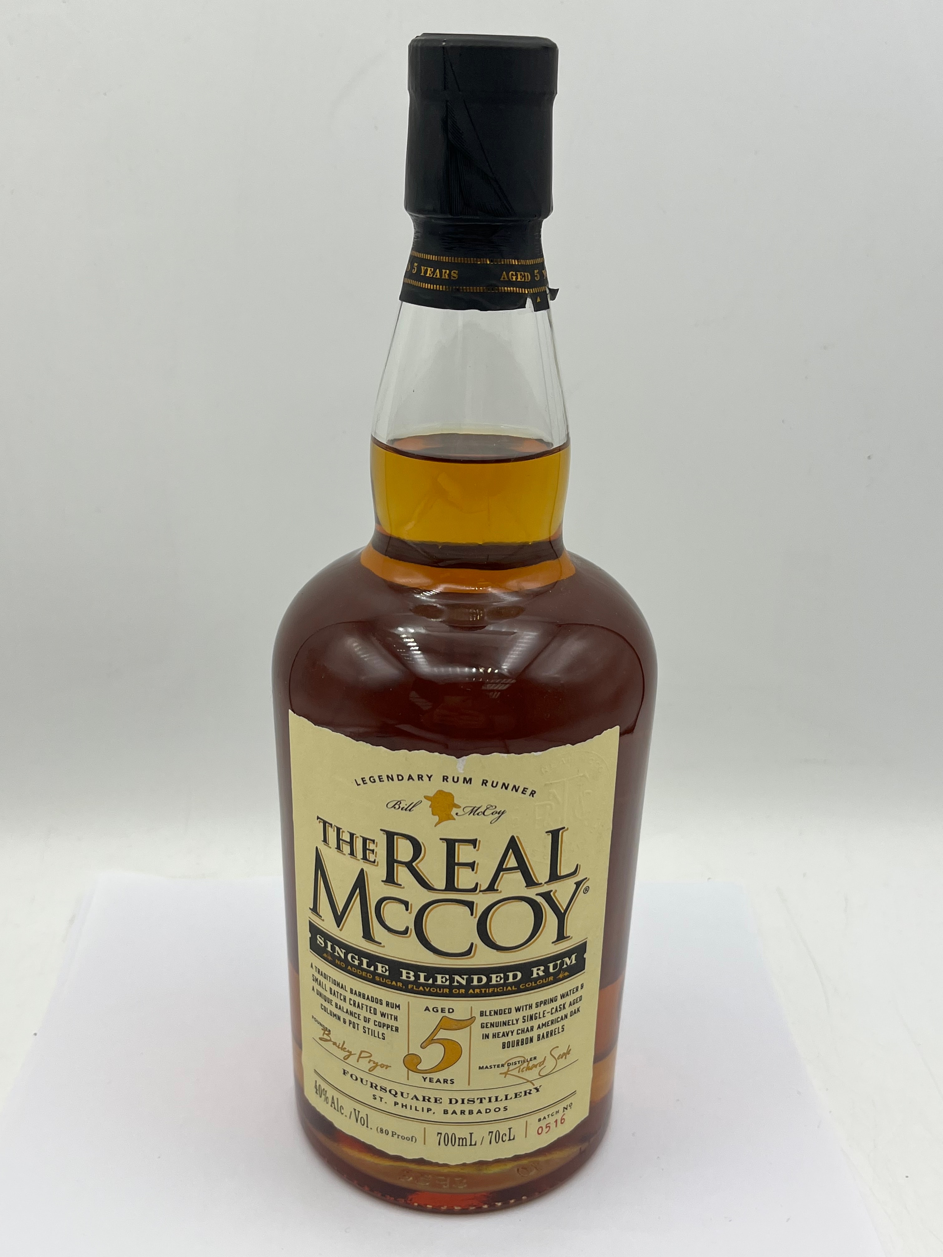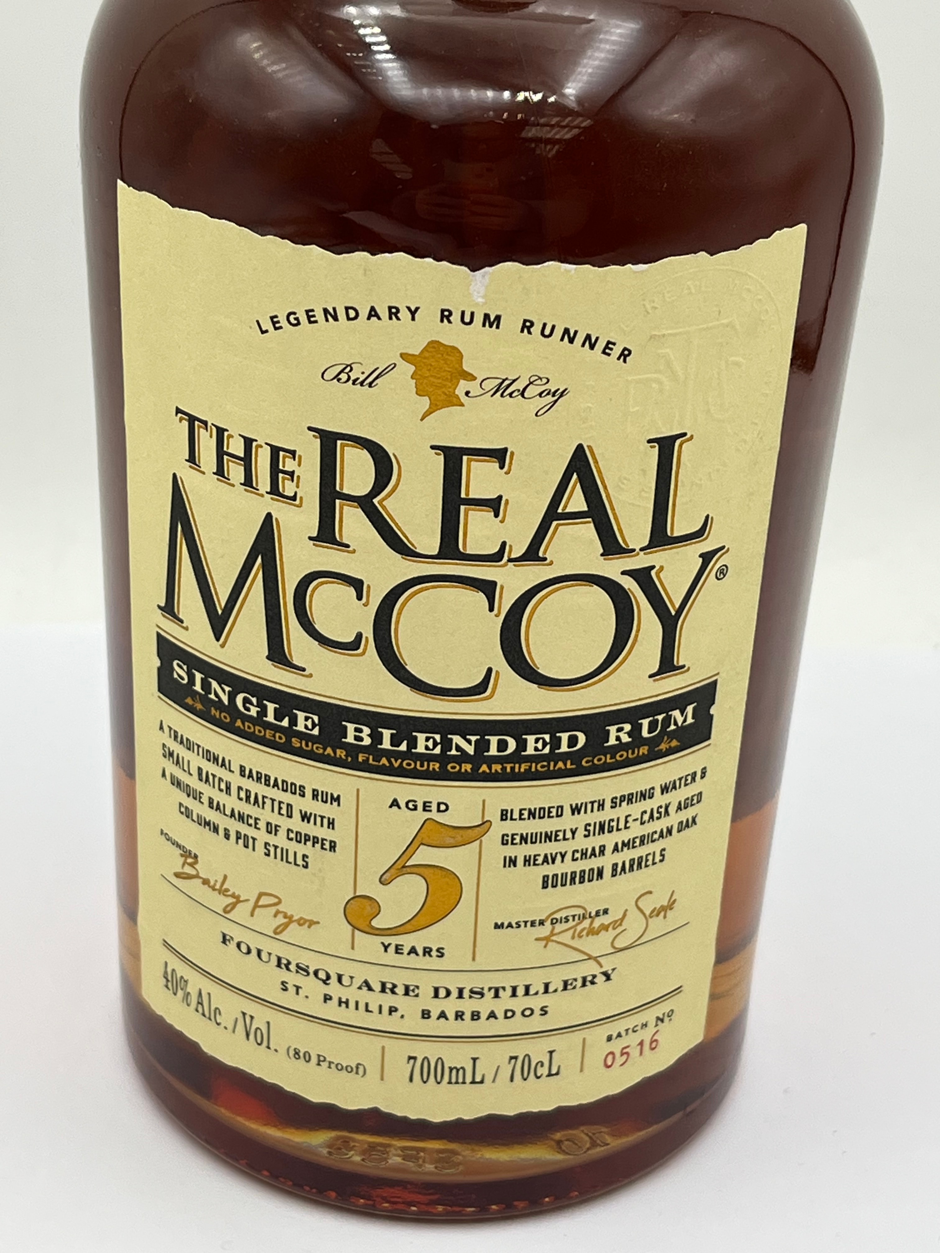 A modern glass bottle of The Real McCoy Single Blended 5-Year Aged Rum, originating from Foursquare Distillery in St. Philip, Barbados. This rum contains 700mL (70cL) of liquid with 40% Alc./Vol. (80 Proof) and bears a batch number of 0516. The label specifies “no added sugar, flavour or artificial colour,” and describes it as a small batch, single-cask aged rum matured in American oak bourbon barrels, referencing “Legendary Rum Runner Bill McCoy.” Tasting notes on the reverse mention vanilla, toasted caramel, honey, and bourbon aged wood, accompanied by a historical summary of Captain Bill McCoy.