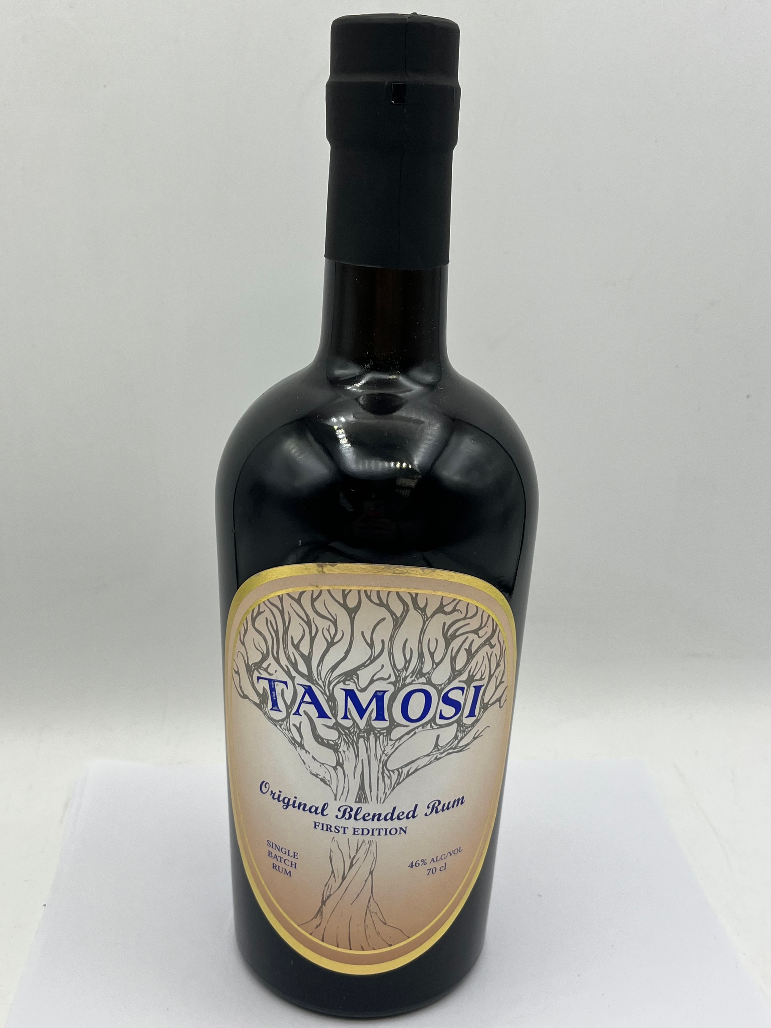 A bottle of Tamosi Original Blended Rum, First Edition. This dark glass bottle features a black stopper. The oval front label has a gold border and a stylized tree illustration, clearly displaying “TAMOSI” in blue, “Original Blended Rum,” “FIRST EDITION,” “SINGLE BATCH RUM,” “46% ALC/VOL,” and “70 cl.” The back label provides additional details, noting it is a blend from Guyana, Jamaica, Martinique, and Panama, described as “Rich, Dark and Fruity,” with “No sugar added,” and “Blended and bottled in the Netherlands.”