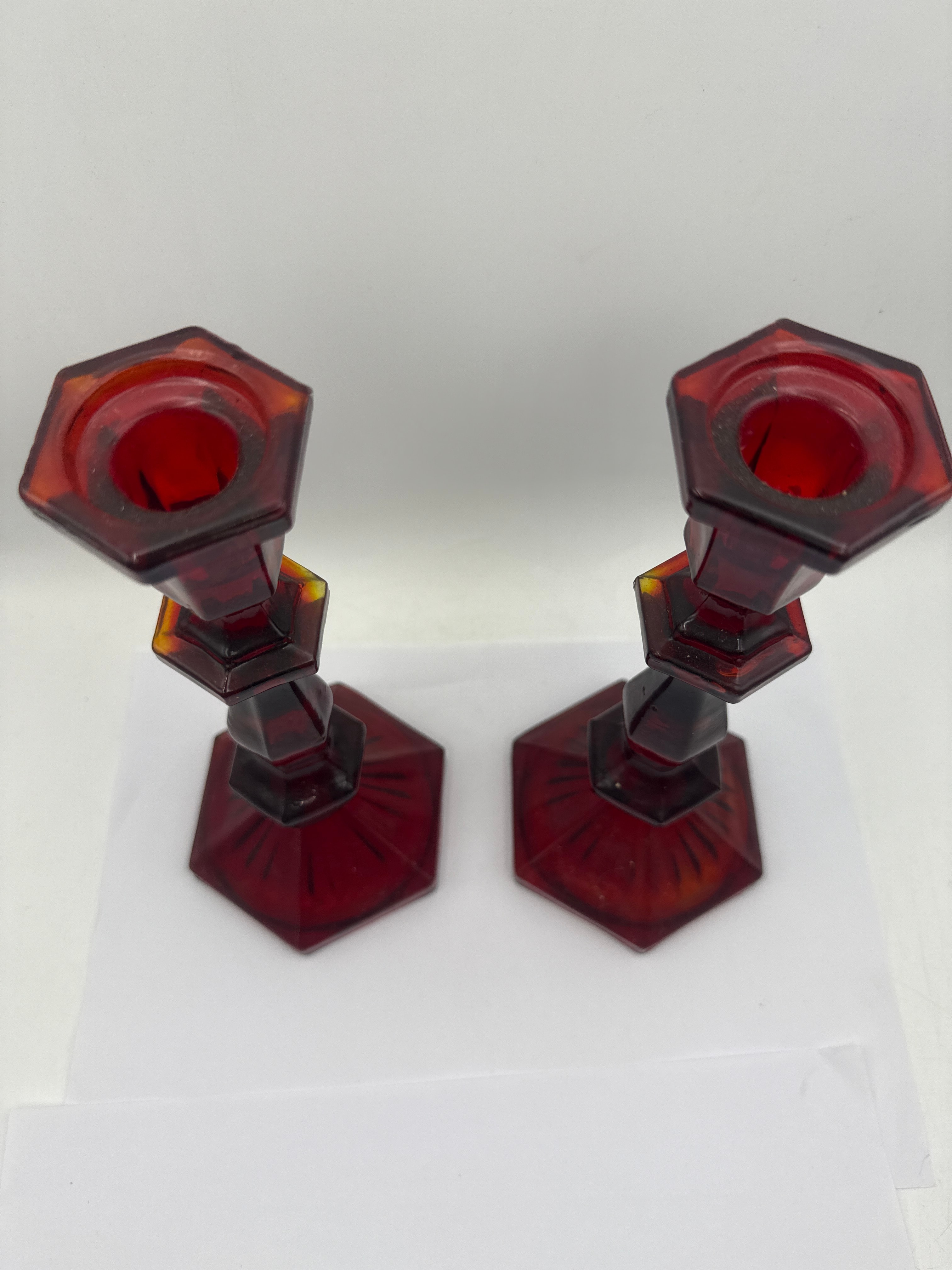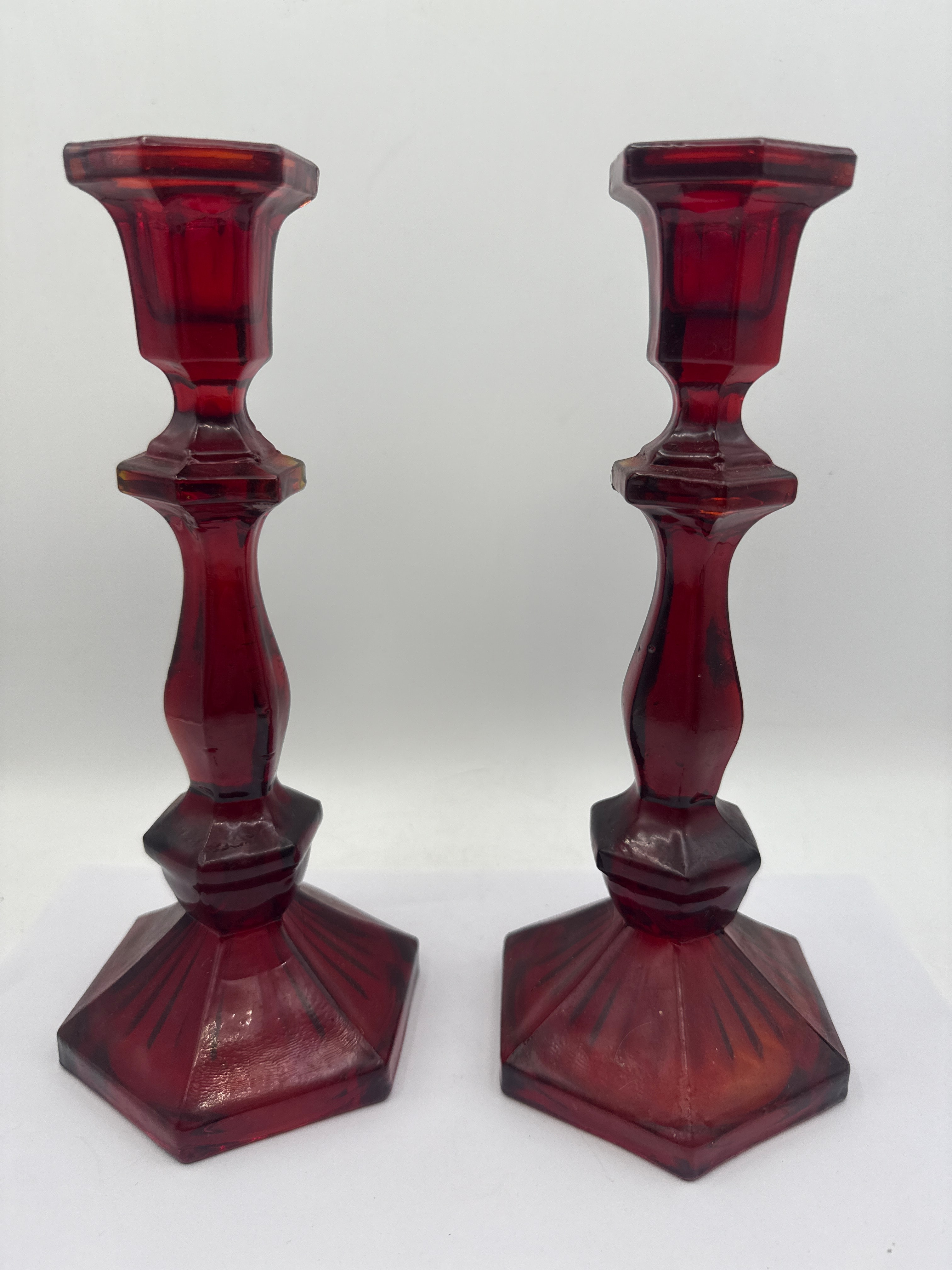 This lot comprises a pair of identical faceted glass candlesticks, crafted from deep red translucent glass. Each candlestick features a hexagonal foot with radiating facets, a multi-paneled and tapering stem, and a hexagonal bobeche with a central well. No visible text, maker’s marks, or identifying inscriptions are present.