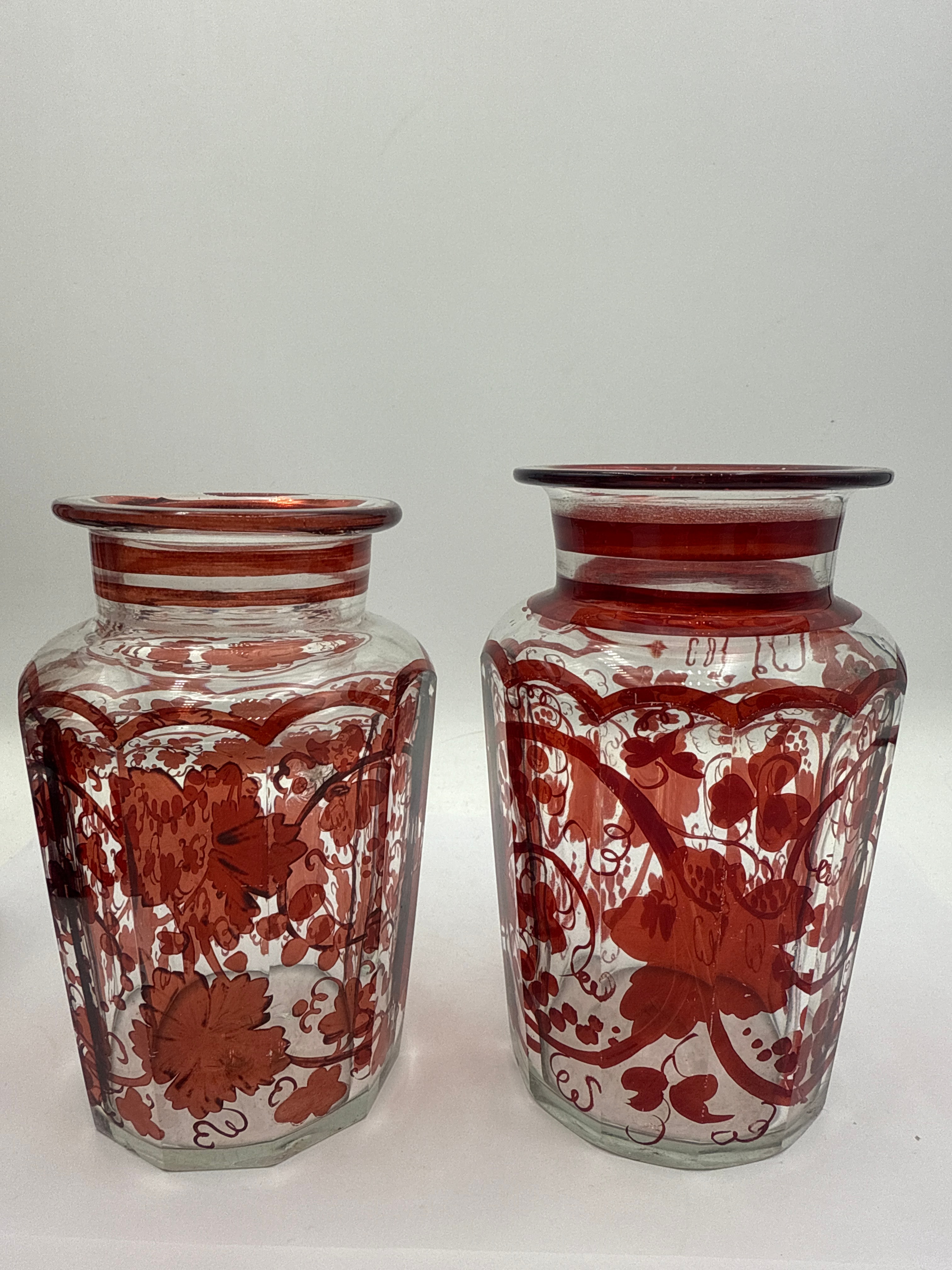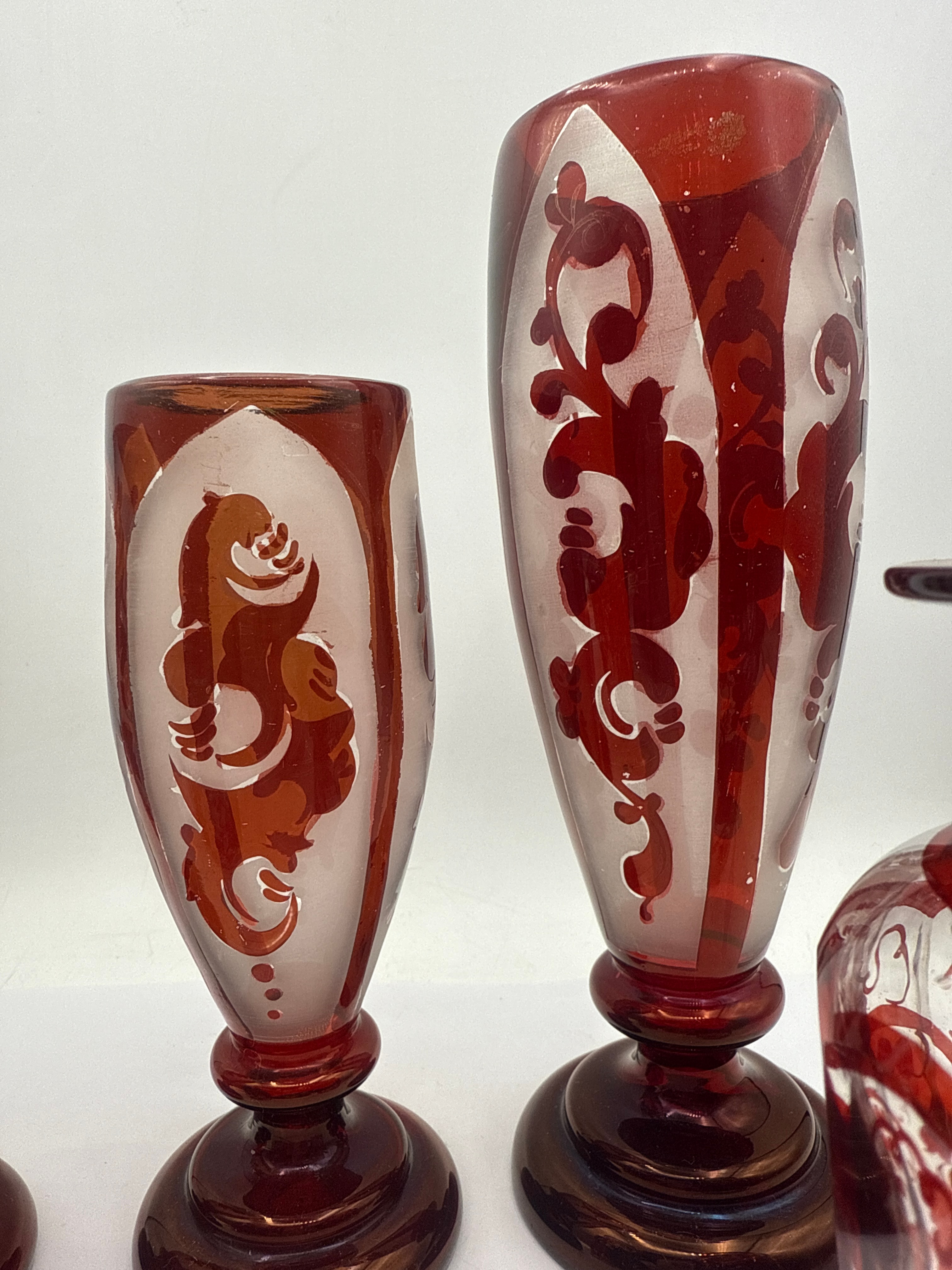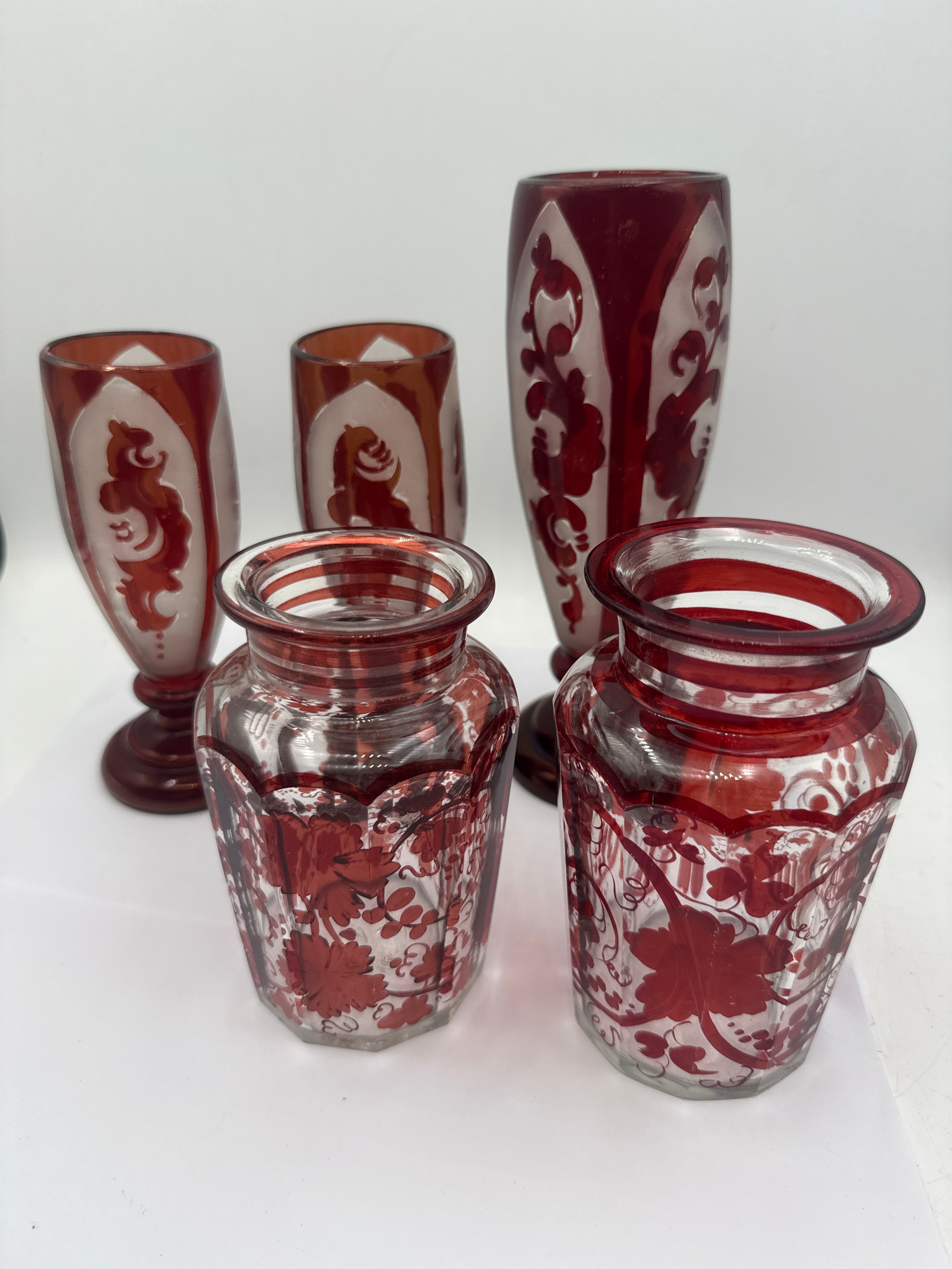 A group of five Egermann Bohemian ruby cut to clear glass pieces, dating from the late 19th to early 20th century. Each piece features a vibrant red layer that has been cut or etched to reveal clear glass beneath. The group includes three stemmed vessels: two shorter, goblet-shaped pieces with stylized figure or crest motifs within frosted panels, and one taller, more slender vase with scrolling ornamentation. The remaining two pieces are shorter, wider, footless vases or jars, adorned with intricate all-over floral and vine patterns. All pieces exhibit a consistent aesthetic characteristic of Bohemian glasswork.