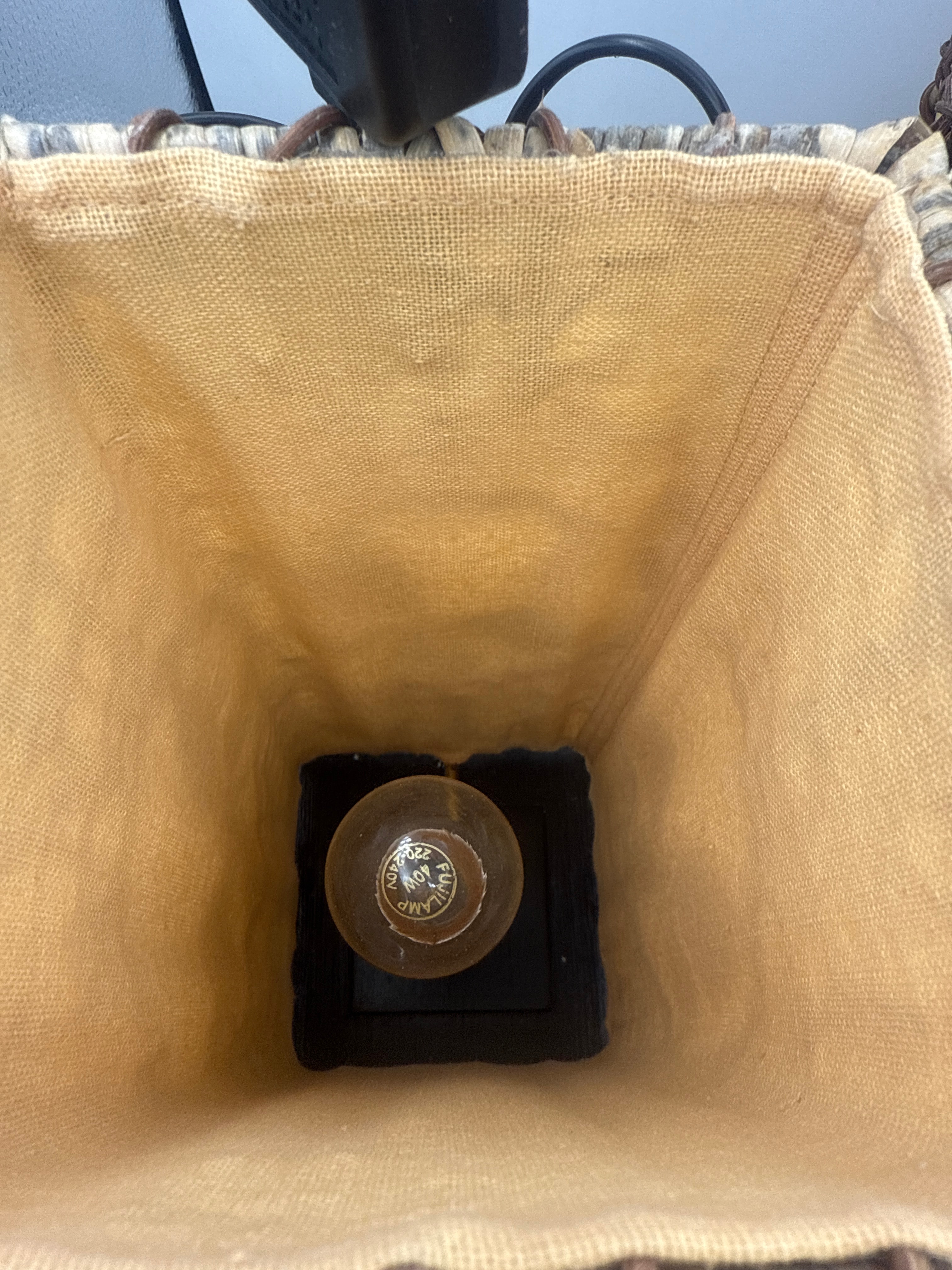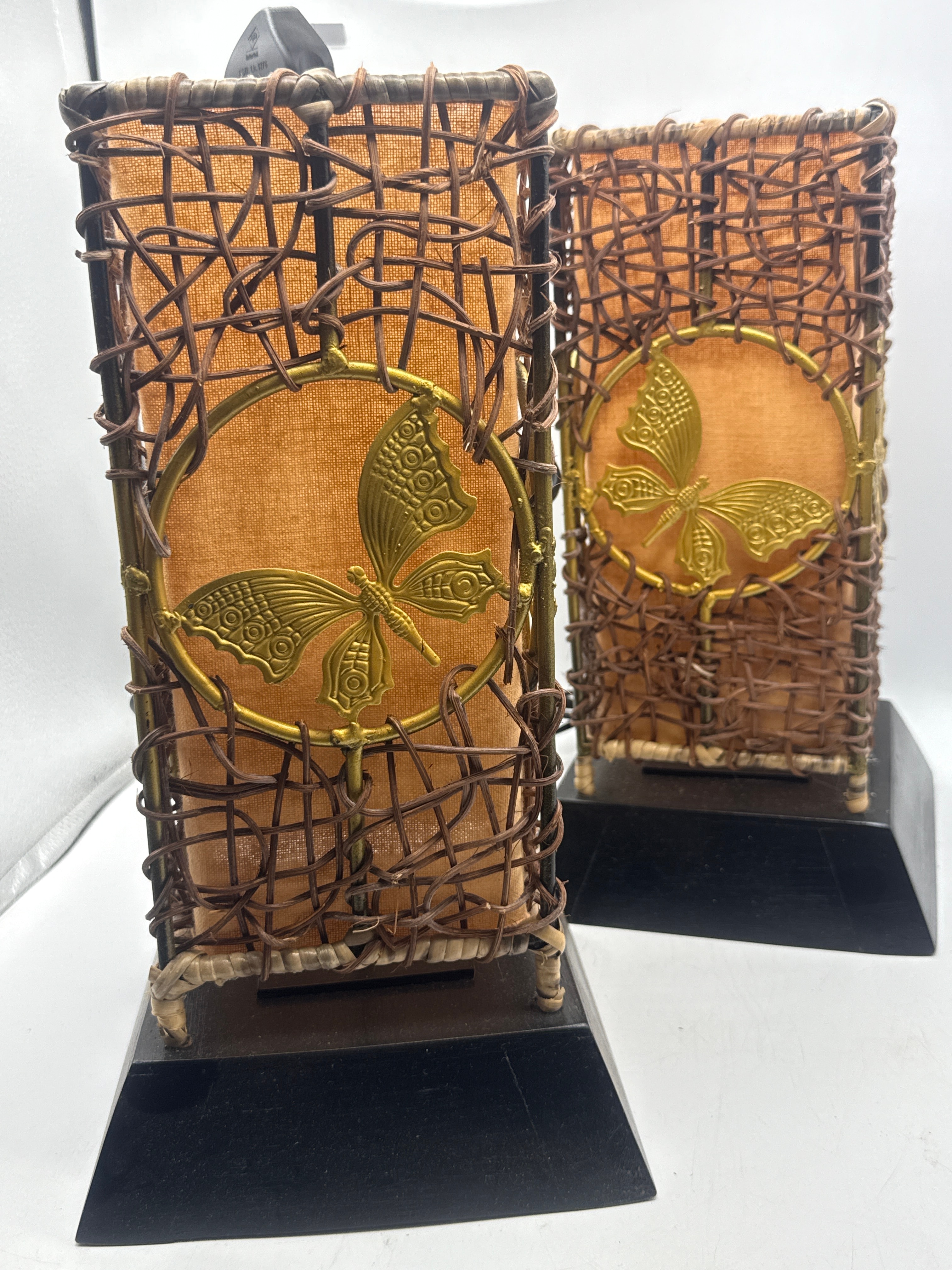 A pair of contemporary decorative accent lamps, each featuring a rectangular dark composite wood base and a tall, rectangular shade. The shade comprises an inner light brown coarse-weave fabric panel, likely burlap or linen, enveloped by an outer lattice of woven dark brown natural fiber, possibly rattan or twisted paper. Each shade is fronted by a gold-toned metal butterfly ornament centered within a circular frame. A visible light bulb bears the text “FOR INDOOR USE ONLY, 120V, E12 LAM P, MAX 25W, CAUTION.”