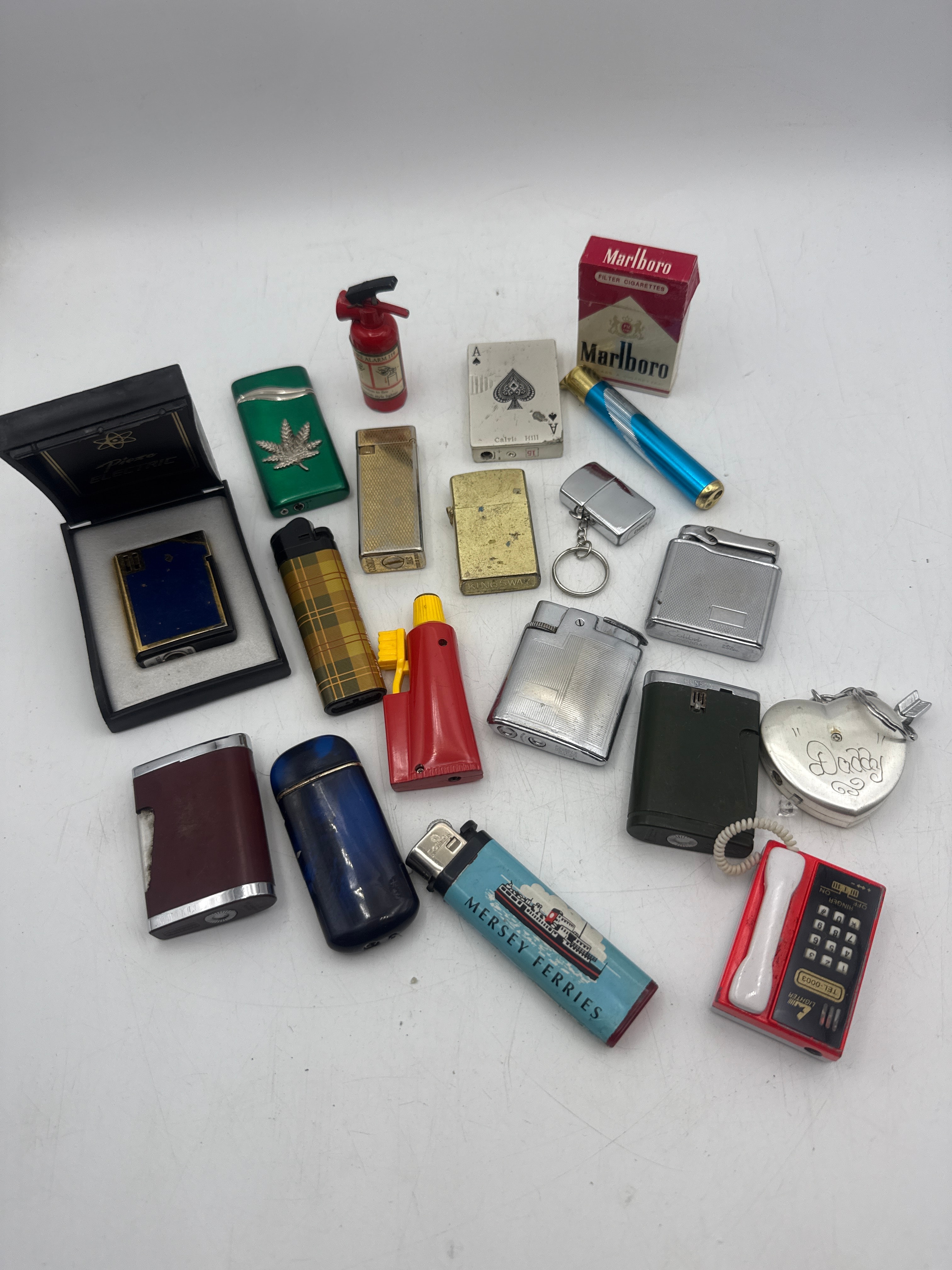 A collection of 19 lighters and lighter-related novelty items, predominantly constructed from various metals such as brass, chrome, and silver-tone finishes, with several pieces incorporating plastic. Styles range from classic rectangular and Zippo-style designs to whimsical novelty forms, including a miniature fire extinguisher, a playing card (Ace of Spades), a heart-shaped keychain engraved “Daddy,” and a telephone-shaped item marked “LIGHTER TEL-0003.” Visible branding and text include “Marlboro,” “Colibri GAS,” “KINGS WAY,” “Calvin HIII,” “RONSON,” “HONSON,” “MERSEY FERRIES” (on a lighter depicting a ship), “ALARM 119,” and “PIEZO ELECTRIC” (on the interior of a black presentation box containing a blue lighter).
