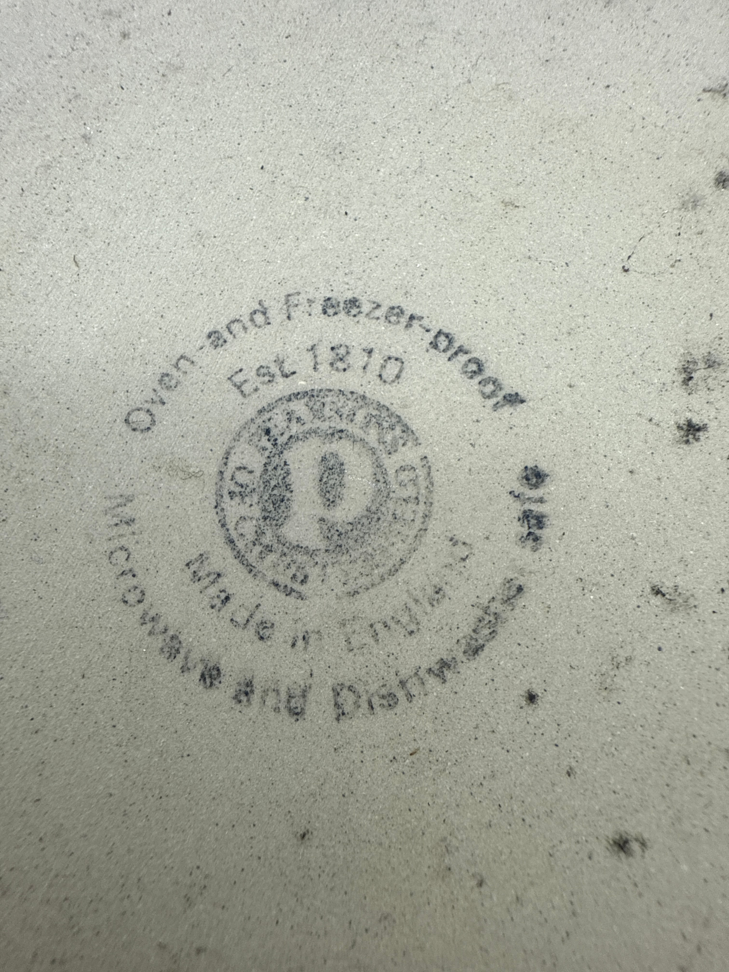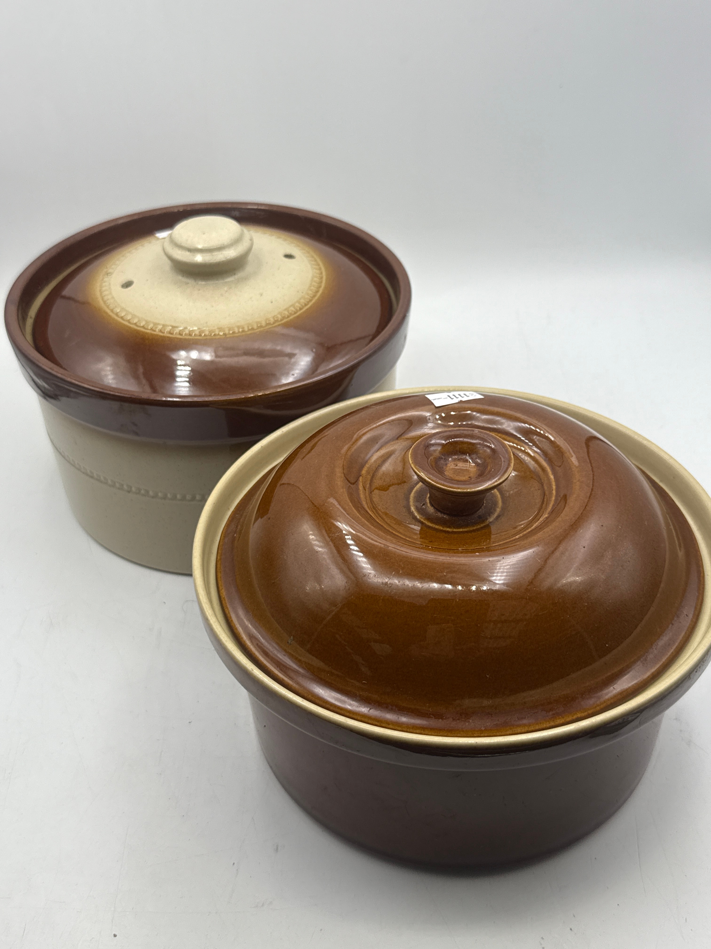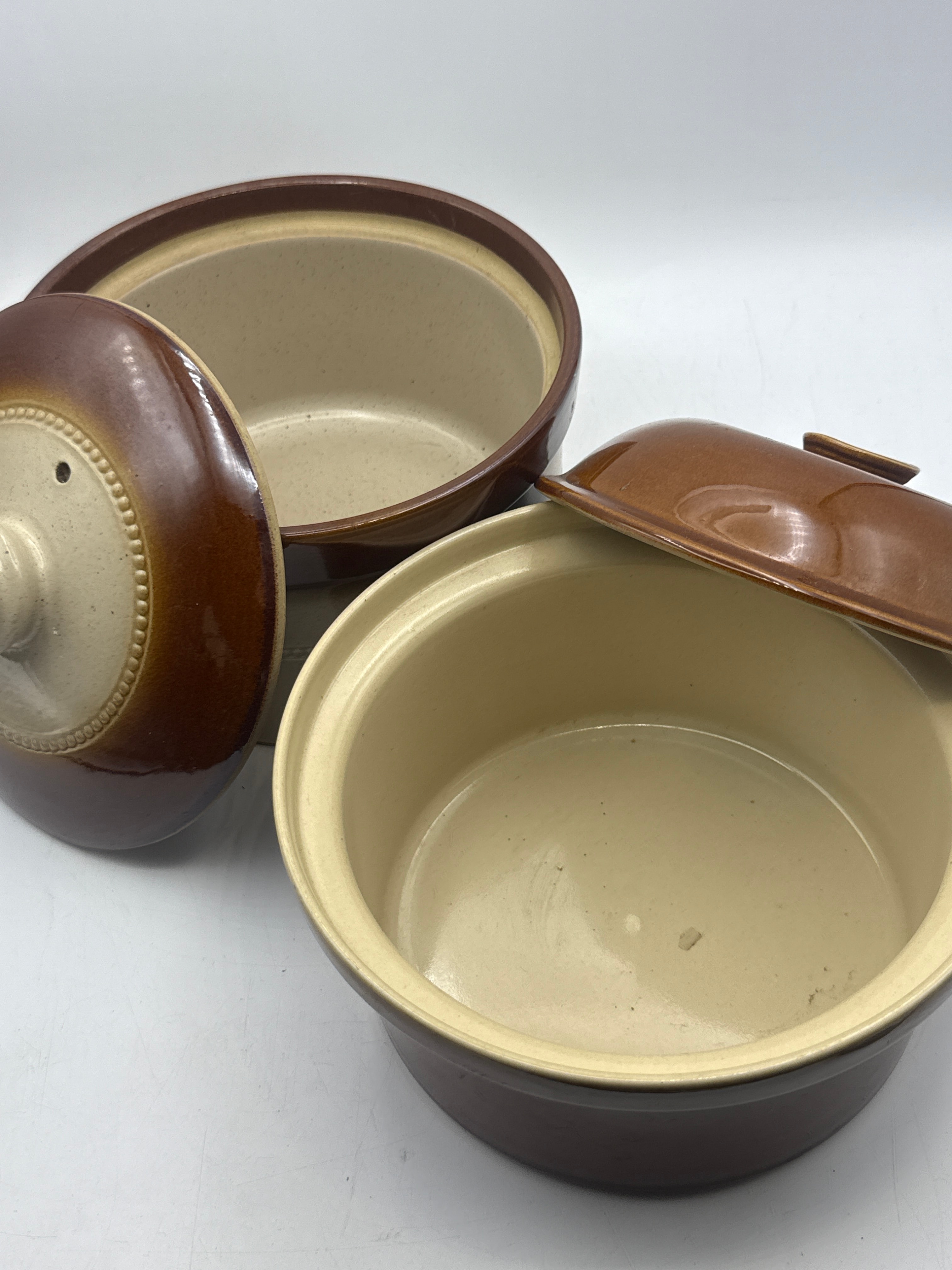 A pair of stoneware baking dishes by Pearsons of Chesterfield, England, established 1810. Each lidded casserole features a two-tone glazed finish, with dark brown exteriors and lighter beige interiors and lid rims. The underside of one dish bears a circular manufacturer’s stamp detailing “Oven-and Freezer-proof,” “Microwave and Dishwasher,” and “Made in England,” alongside the ‘Est 1810’ mark and a central ‘P’ logo.