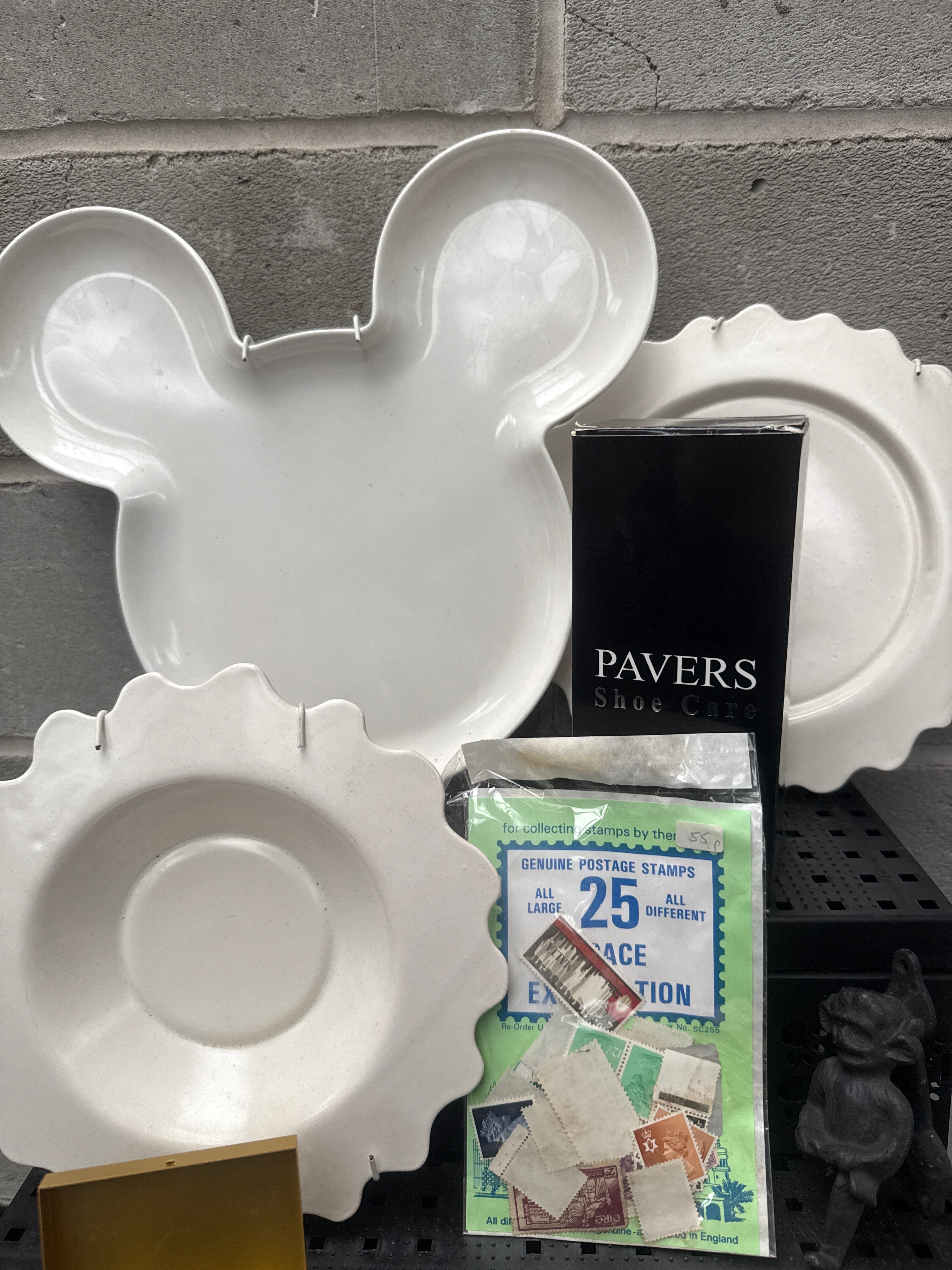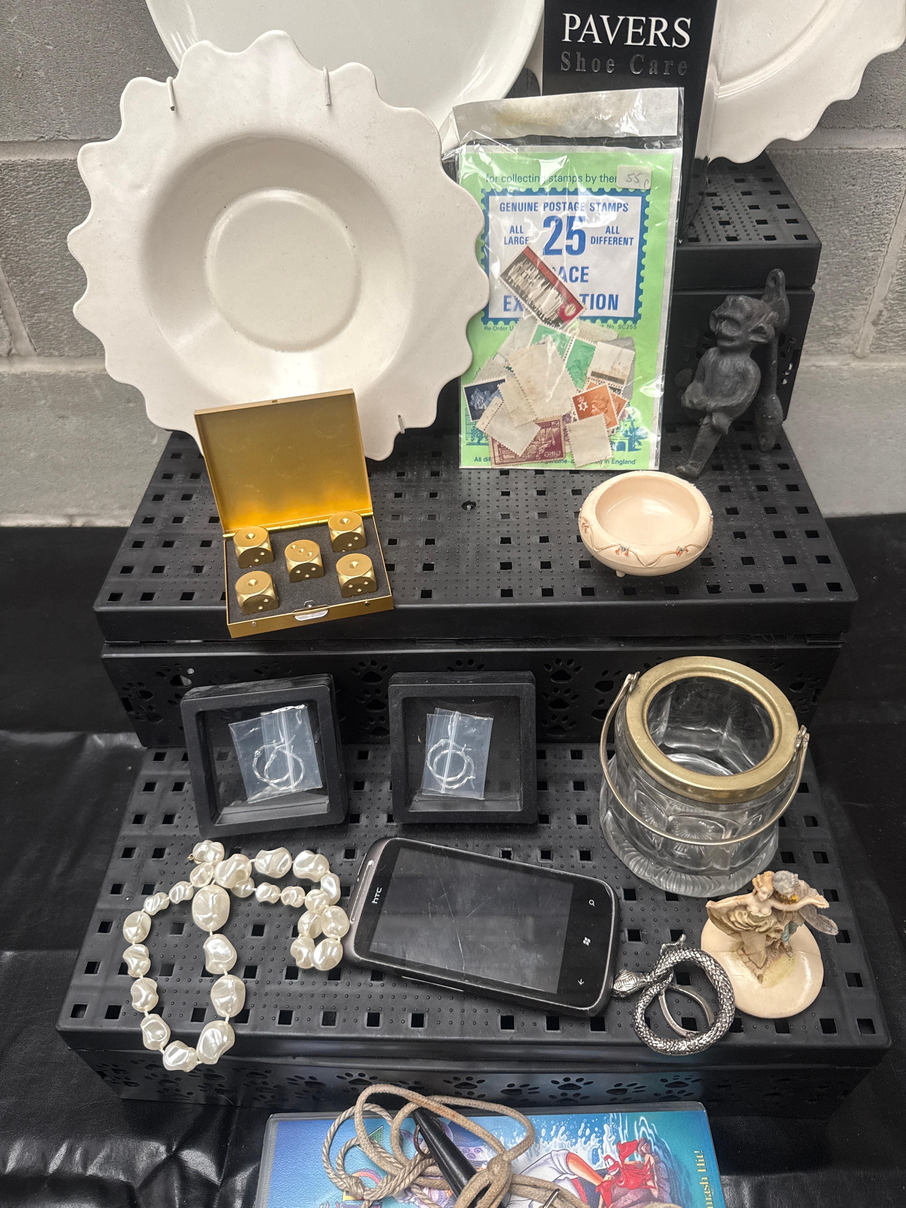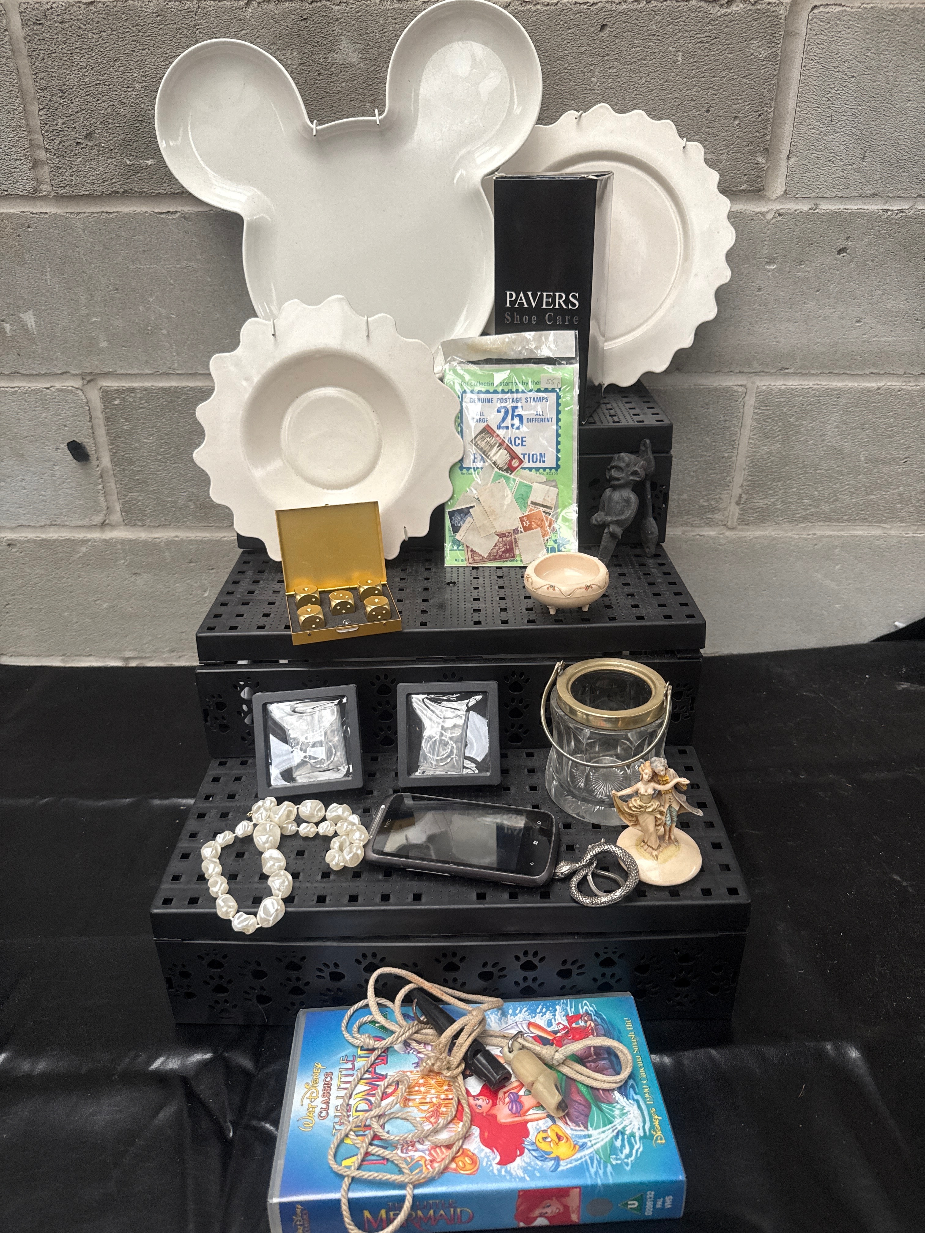 This diverse lot comprises a variety of household items, collectibles, and personal accessories. Included are three white ceramic dishes, one shaped as Mickey Mouse and two with scalloped edges. Also present is a “PAVERS Shoe Care” box, and a packaged set of “Genuine Postage Stamps” marked “25 All Different Large” for collecting or exhibition. The lot features a gold-tone box containing six thimble-like objects, a small pink ceramic trinket dish, a dark-colored figurine, a clear glass jar with a metal handle, and a light-colored cherubic figurine. Jewelry items include a faux pearl necklace, a silver-tone snake bracelet, and a brown cord necklace with various charms. An HTC-branded smartphone and “The Disney Classic Collection: The Little Mermaid” hardback book complete the collection.
