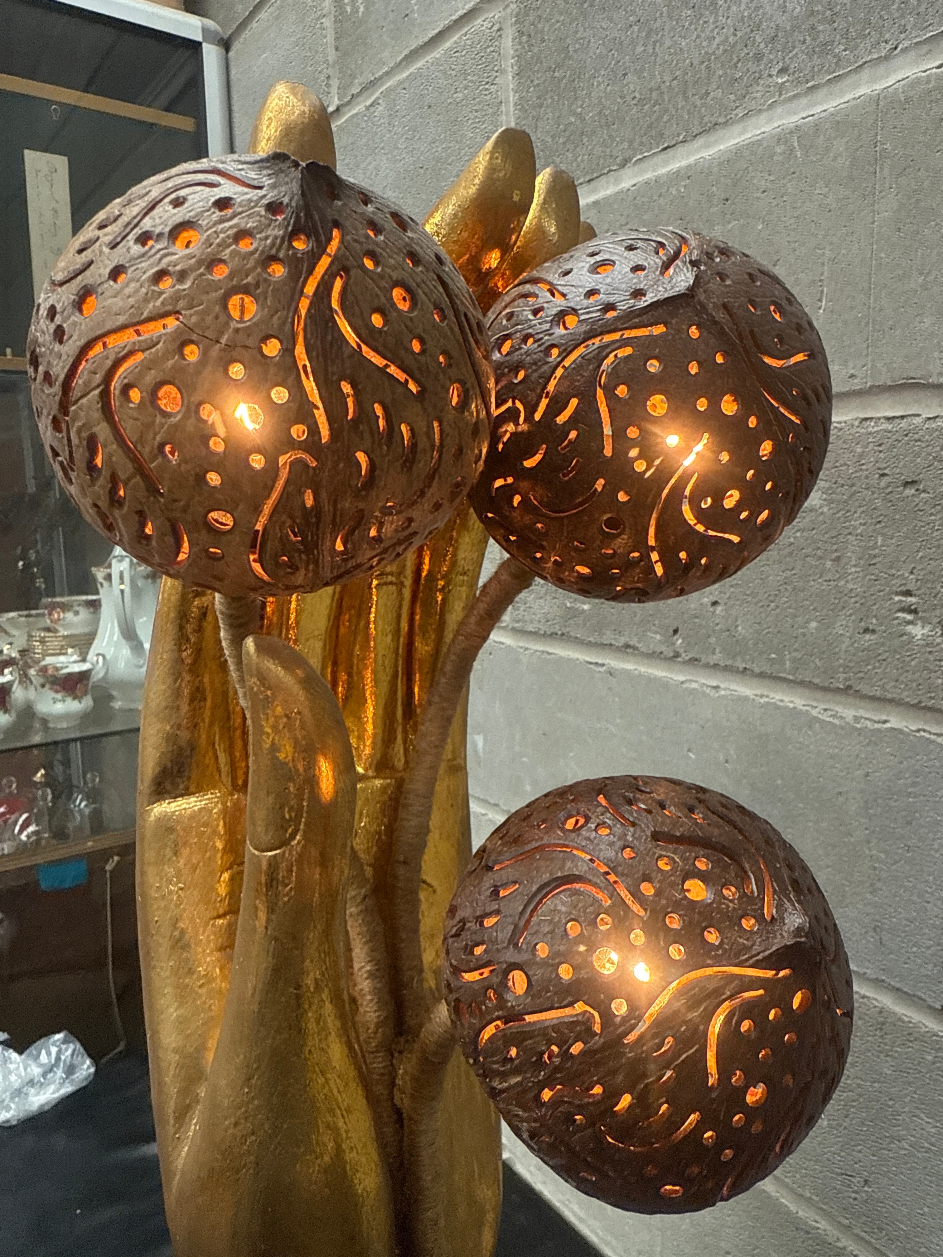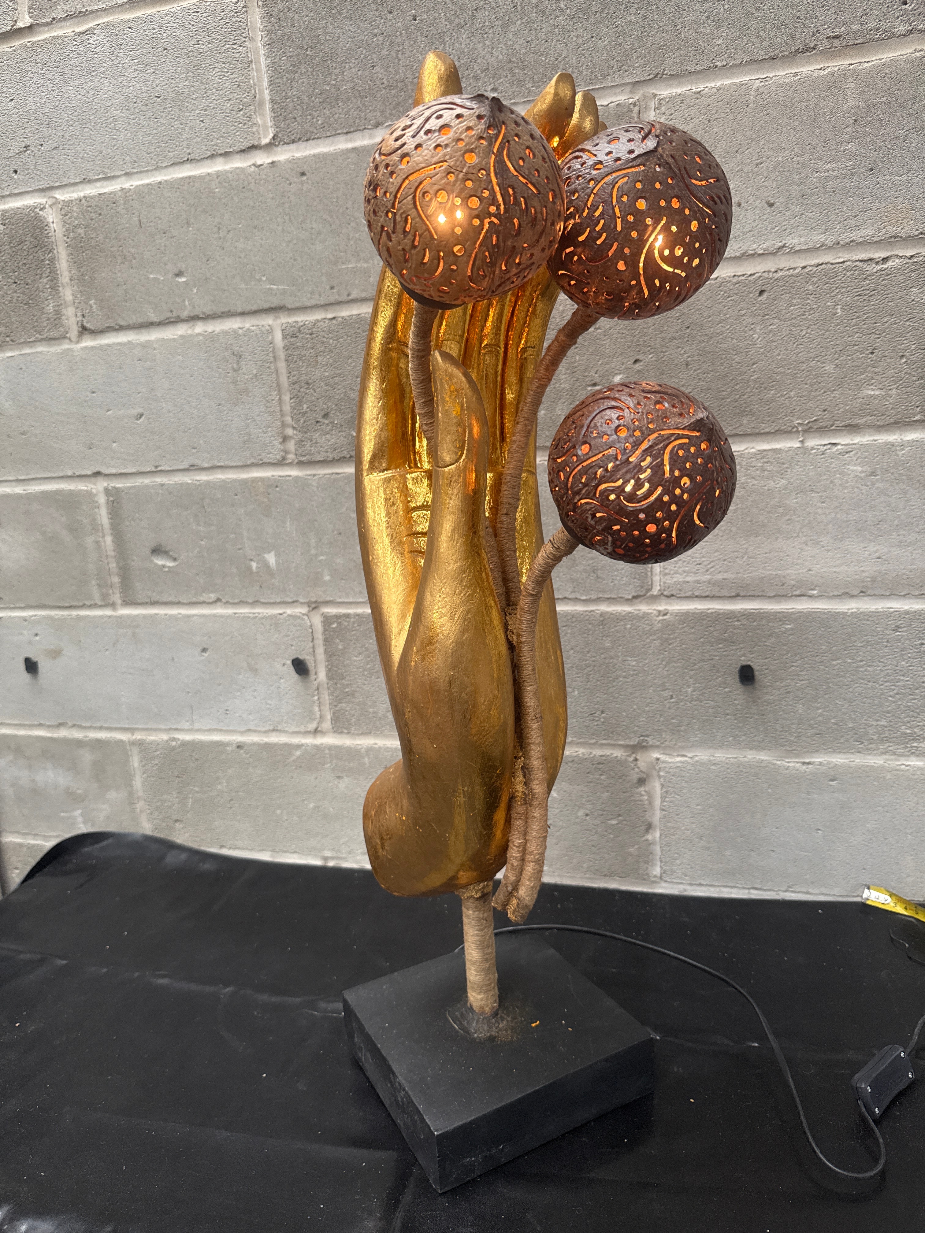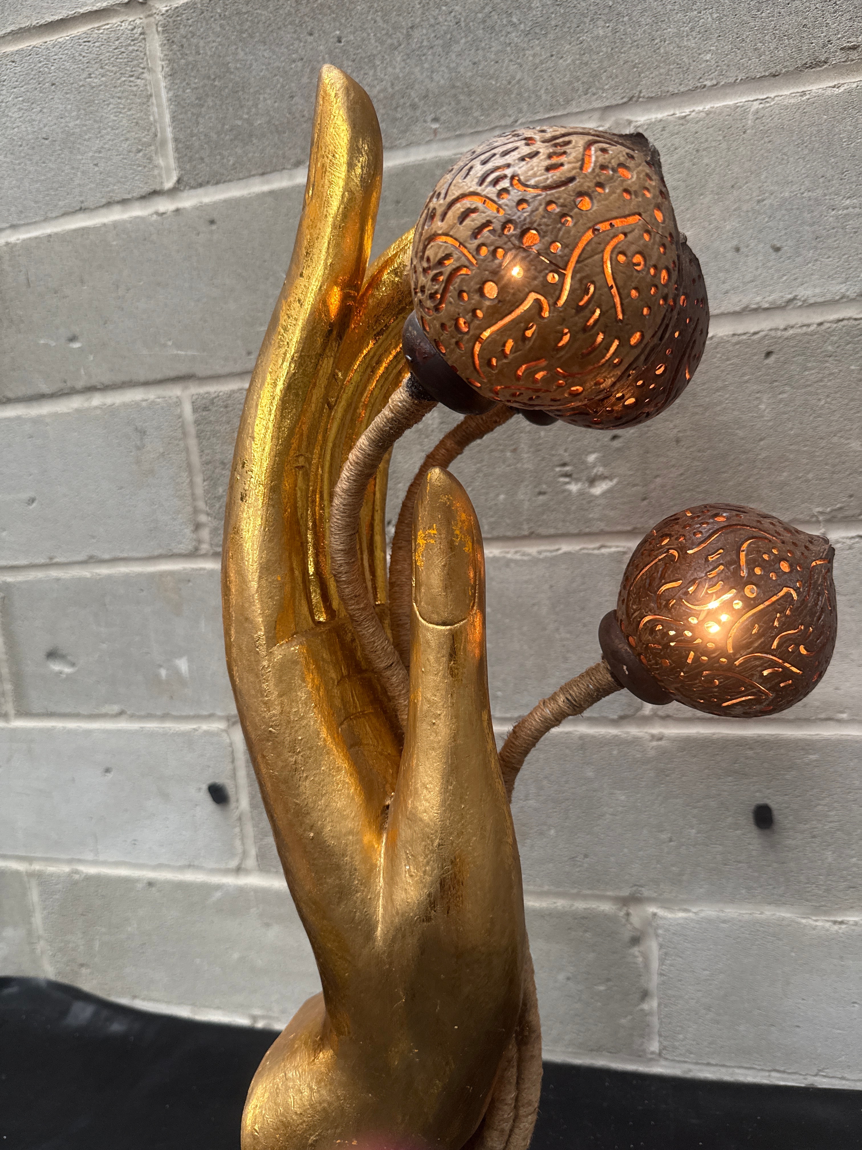 A decorative table lamp featuring a large, upright gold-finished composite hand sculpture, with three natural fiber-wrapped stems supporting carved coconut shell light shades. The piece rests on a dark, square base, likely wood or composite, and presents an Asian-inspired, contemporary decorative style, possibly Balinese or Thai in origin. The lamp is currently illuminated.