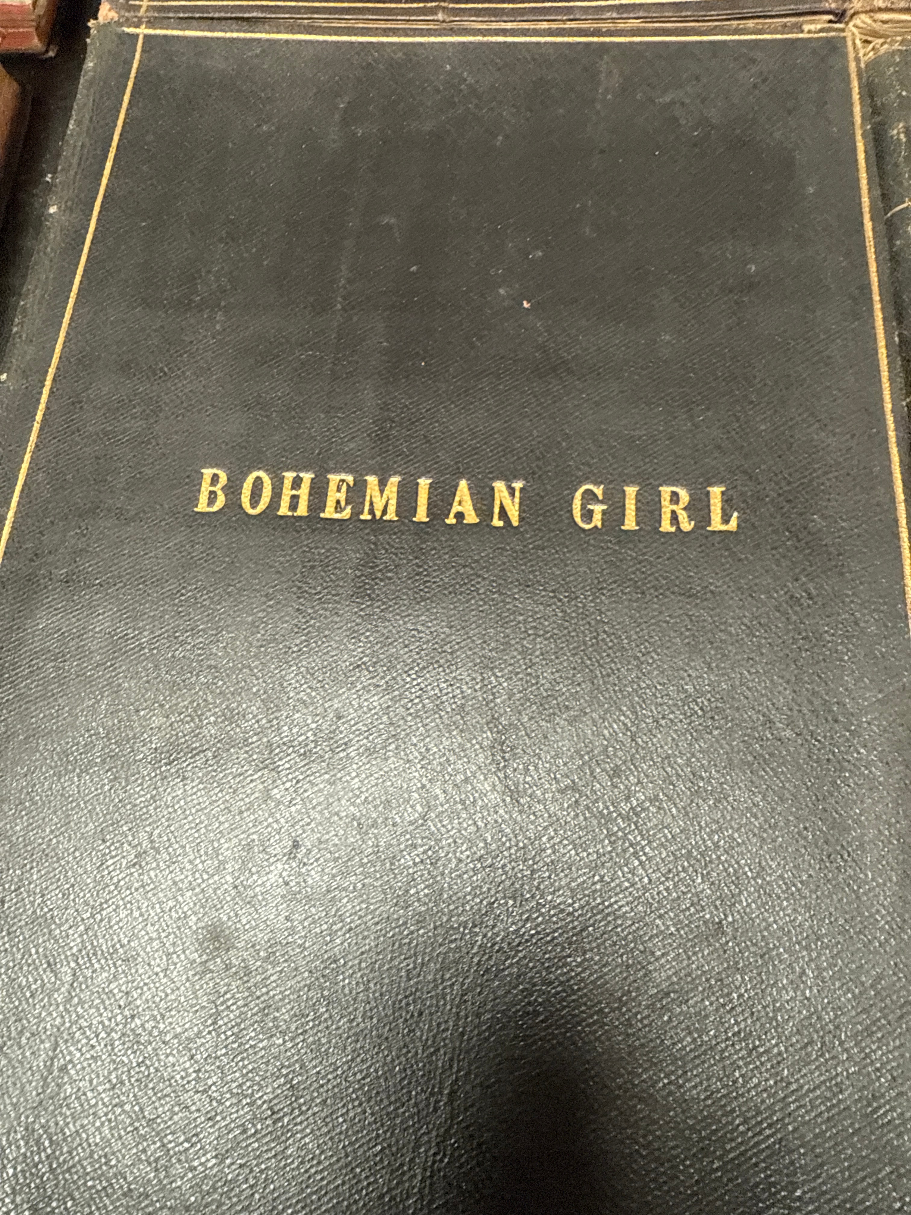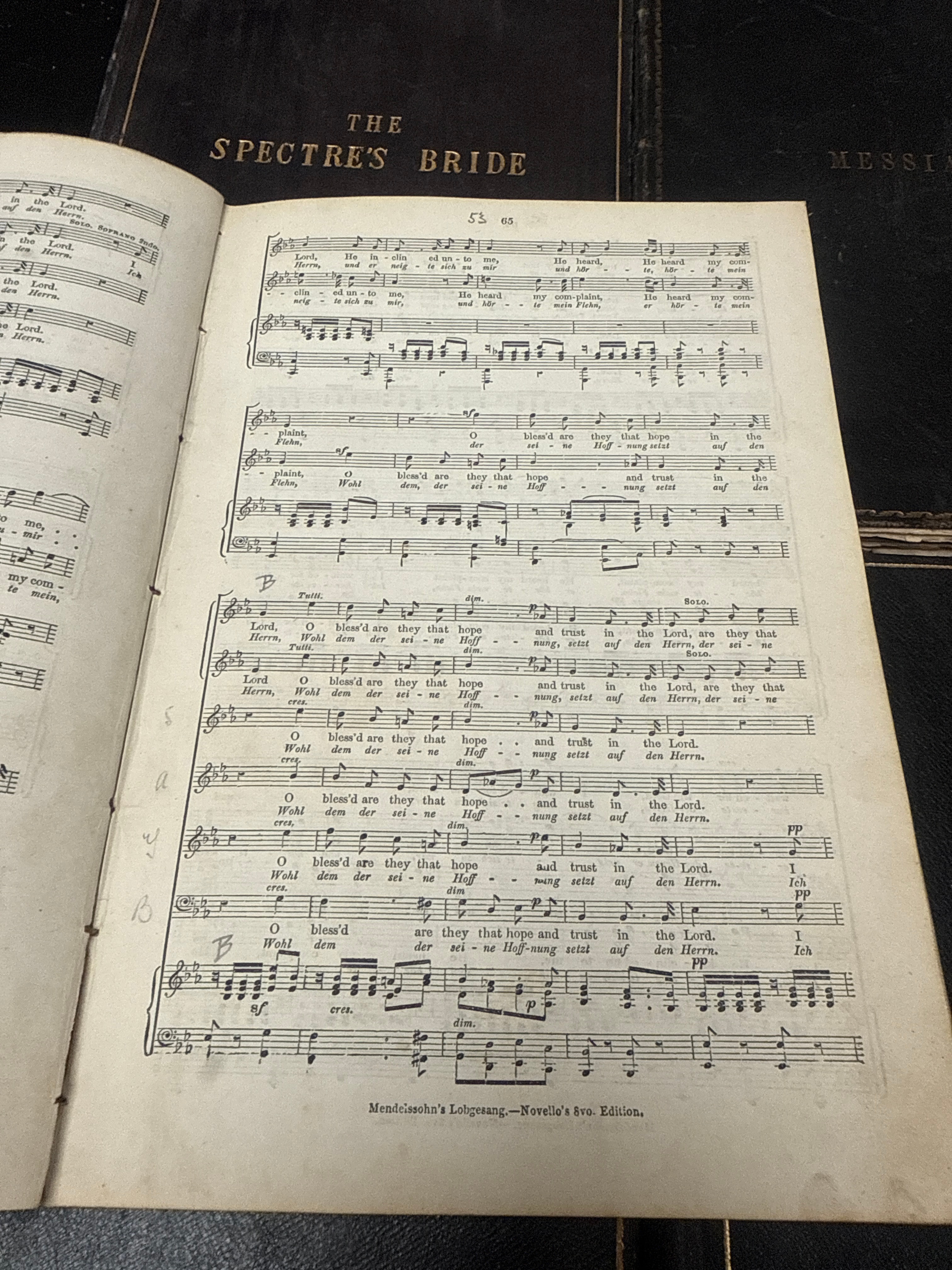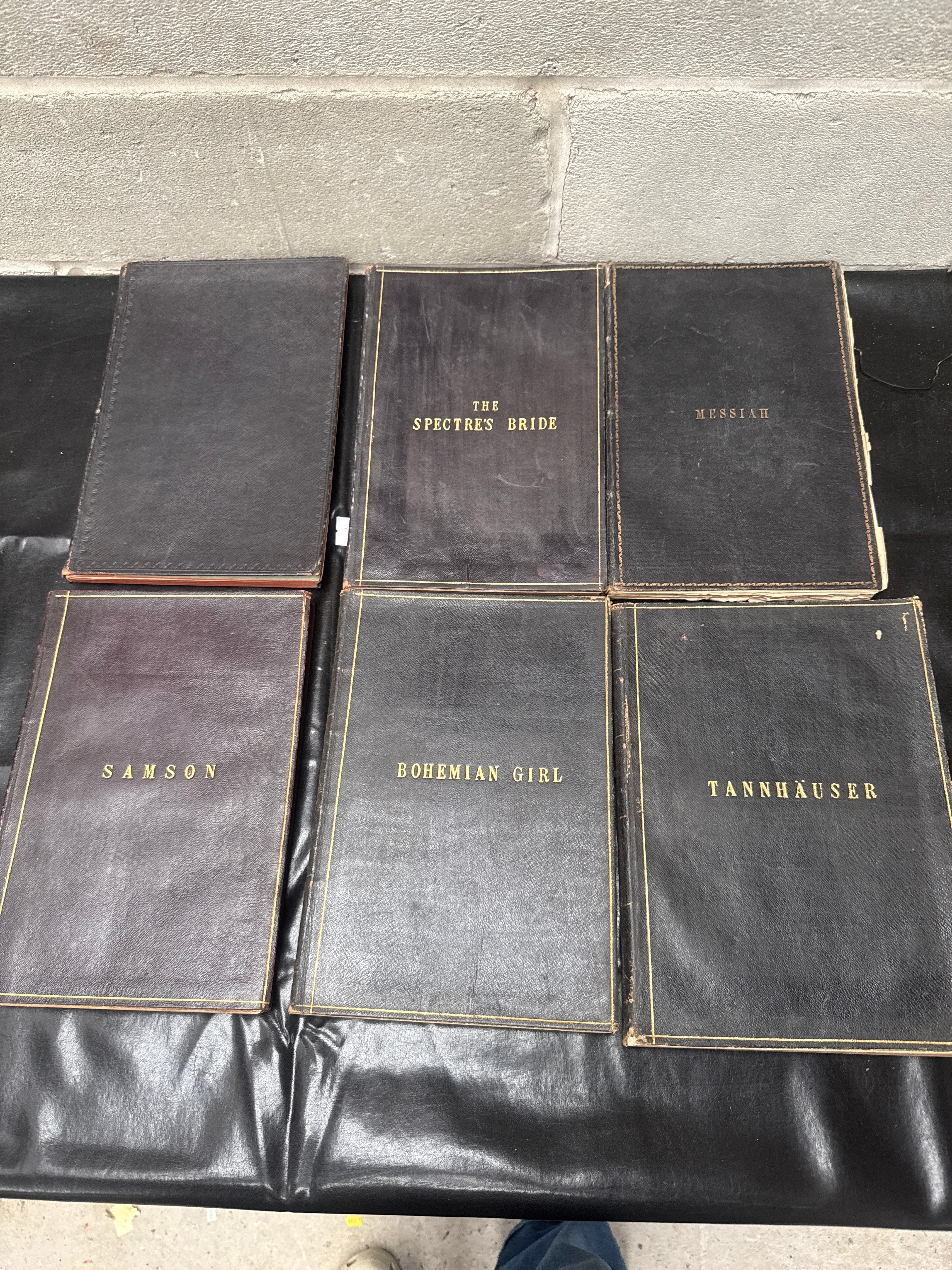 A set of six vintage musical score volumes, approximately octavo-sized, dating to the late 19th century. This dating is supported by an internal “LEEDS MUSICAL FESTIVAL, 1892” program. Five of the volumes feature dark covers, possibly leather or buckram, with gilt-stamped titles including “THE SPECTRE’S BRIDE,” “MESSIAH,” “TANNHÄUSER,” “BOHEMIAN GIRL,” and “SAMSON,” each bordered by a single gilt line. One volume remains unlabeled on its cover. Internal pages contain printed musical notation and text in both English and German. One work is identified as “Mendelssohn’s Lobgesang” (“Hymn of Praise”) from “Novello’s 8vo. Edition.” The festival program details performances of works by Handel and Mendelssohn.