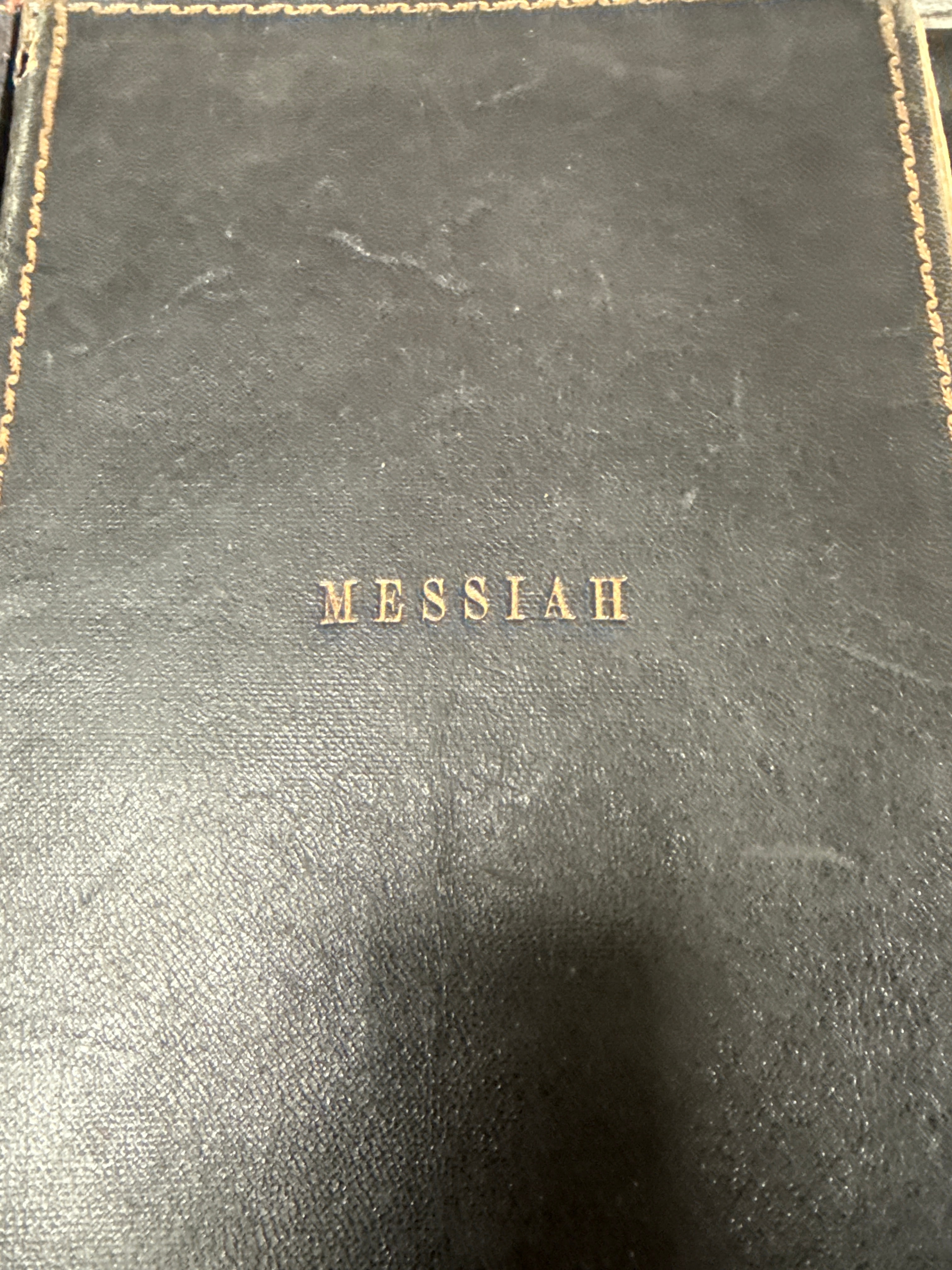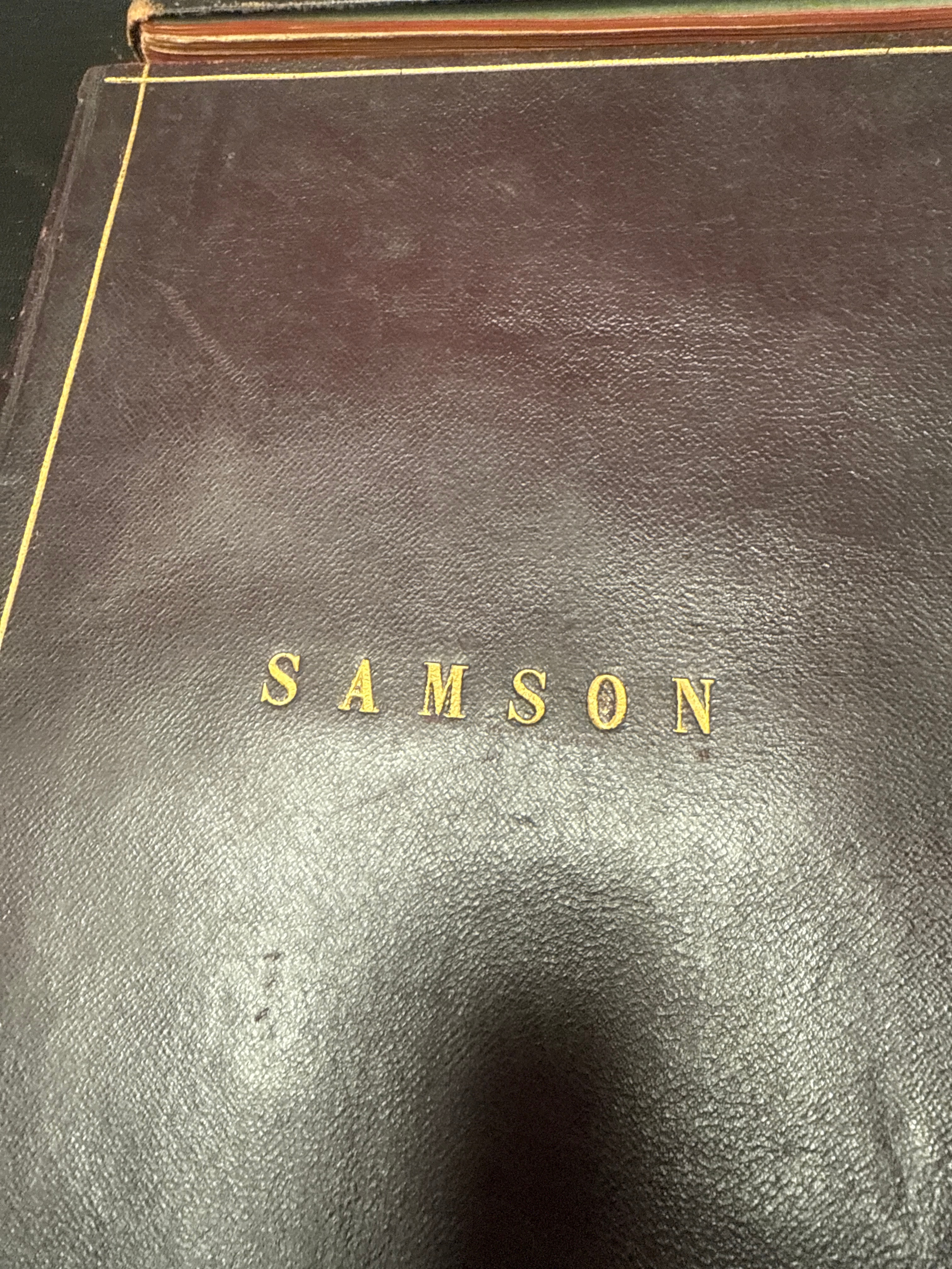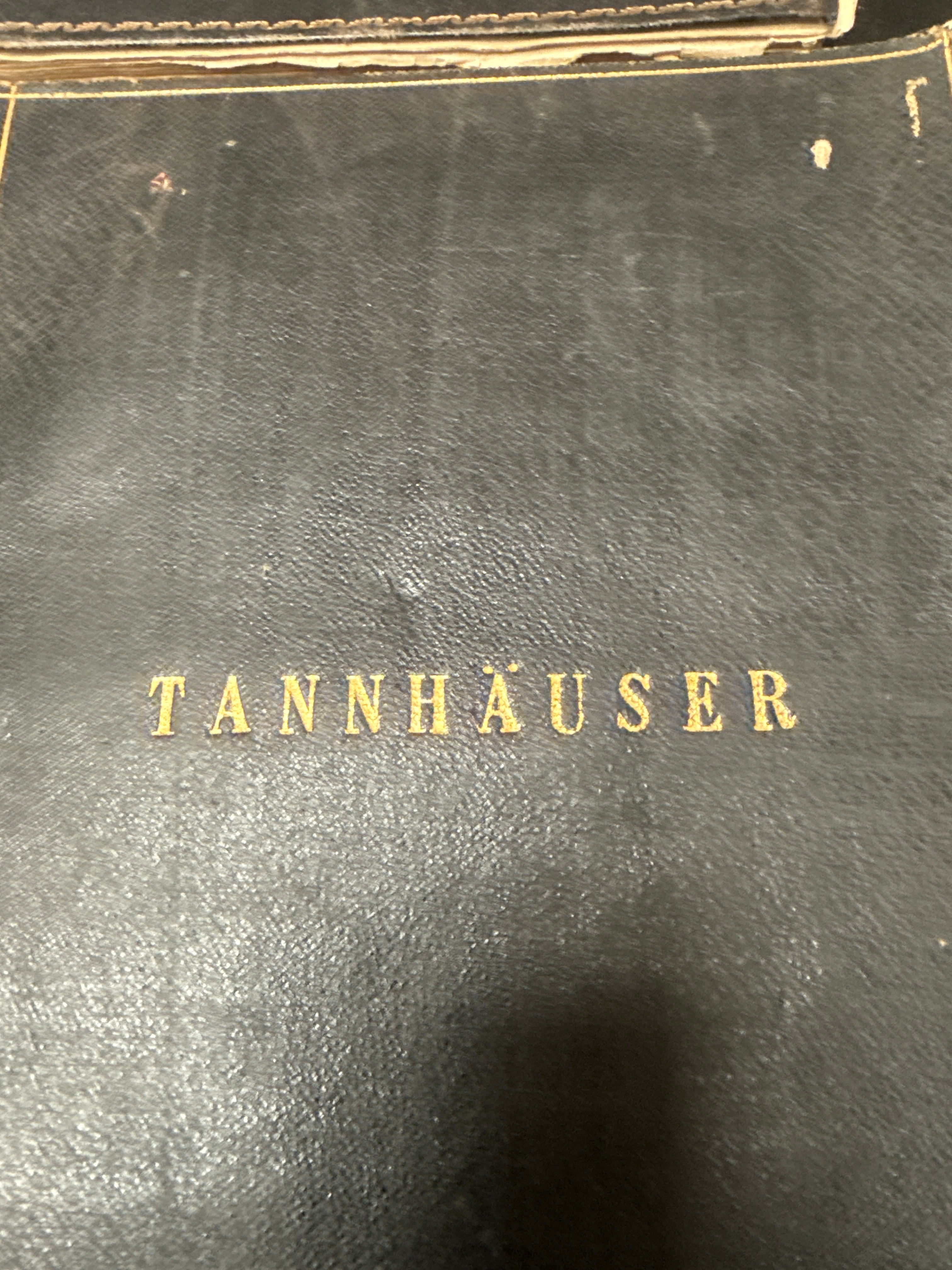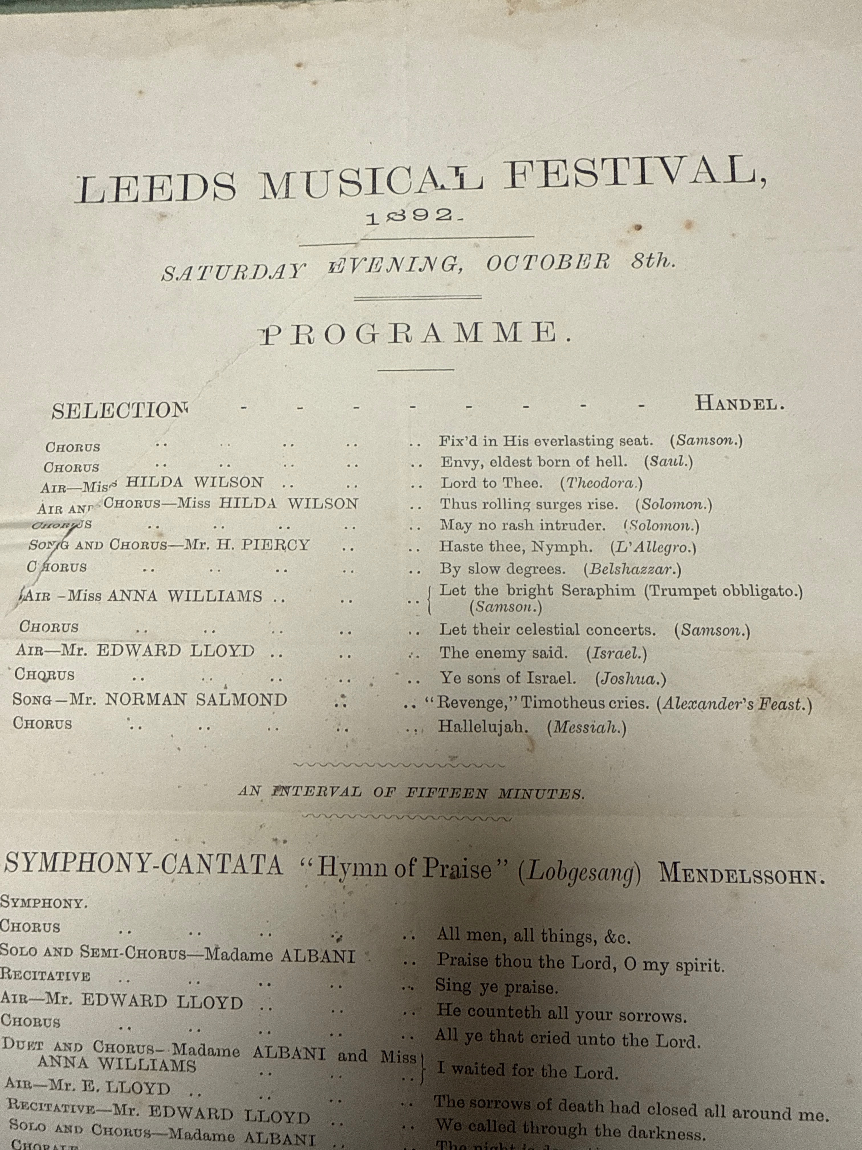 A set of six vintage musical score volumes, approximately octavo-sized, dating to the late 19th century. This dating is supported by an internal “LEEDS MUSICAL FESTIVAL, 1892” program. Five of the volumes feature dark covers, possibly leather or buckram, with gilt-stamped titles including “THE SPECTRE’S BRIDE,” “MESSIAH,” “TANNHÄUSER,” “BOHEMIAN GIRL,” and “SAMSON,” each bordered by a single gilt line. One volume remains unlabeled on its cover. Internal pages contain printed musical notation and text in both English and German. One work is identified as “Mendelssohn’s Lobgesang” (“Hymn of Praise”) from “Novello’s 8vo. Edition.” The festival program details performances of works by Handel and Mendelssohn.