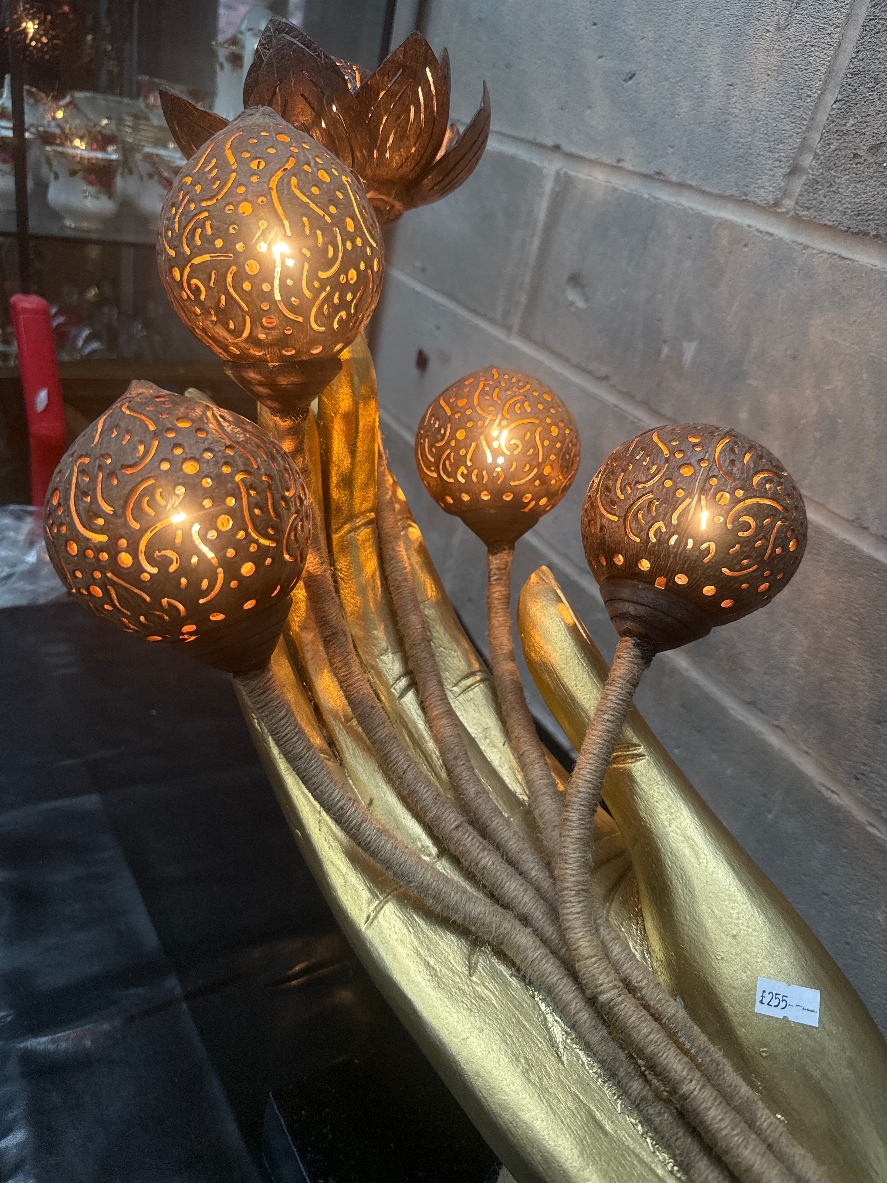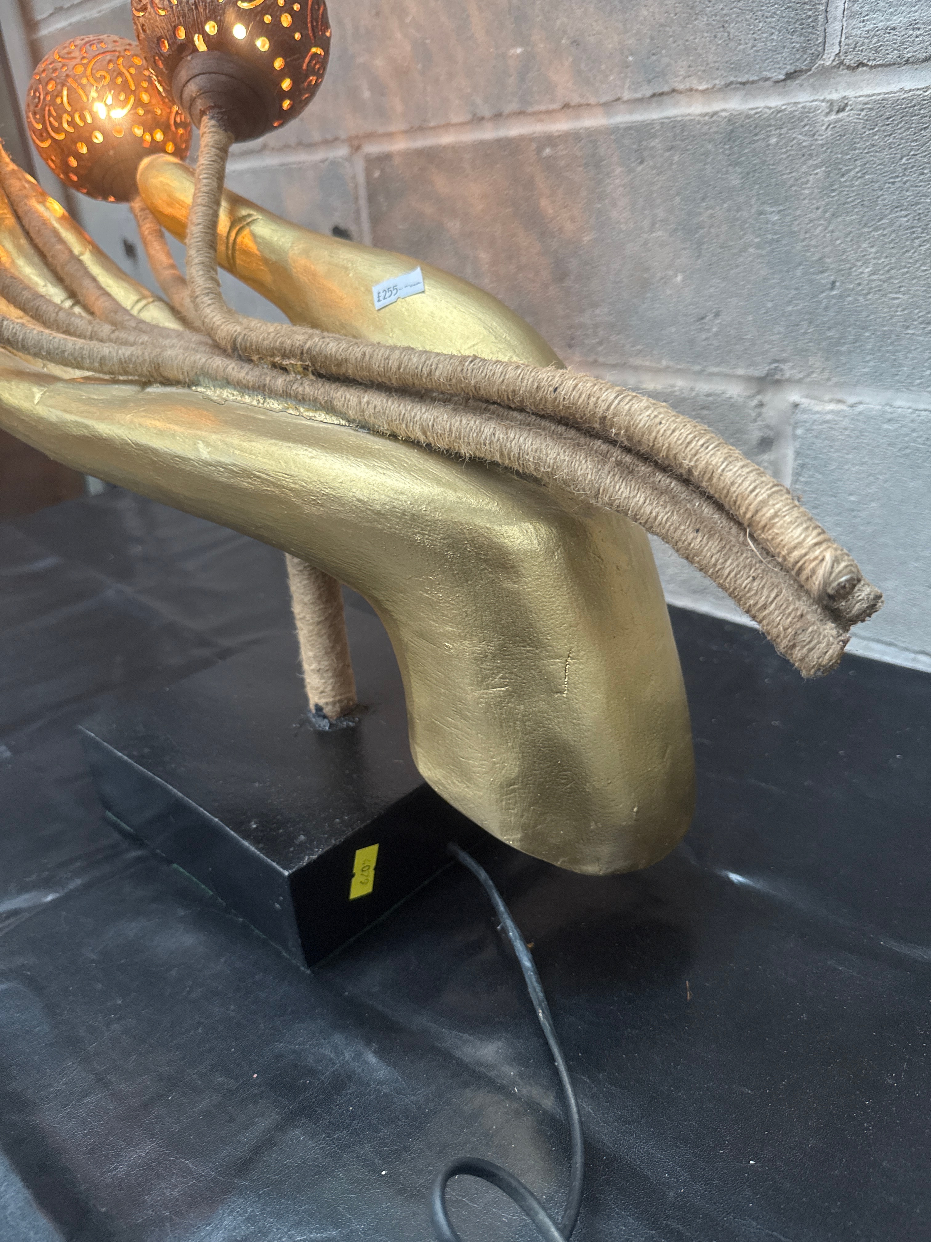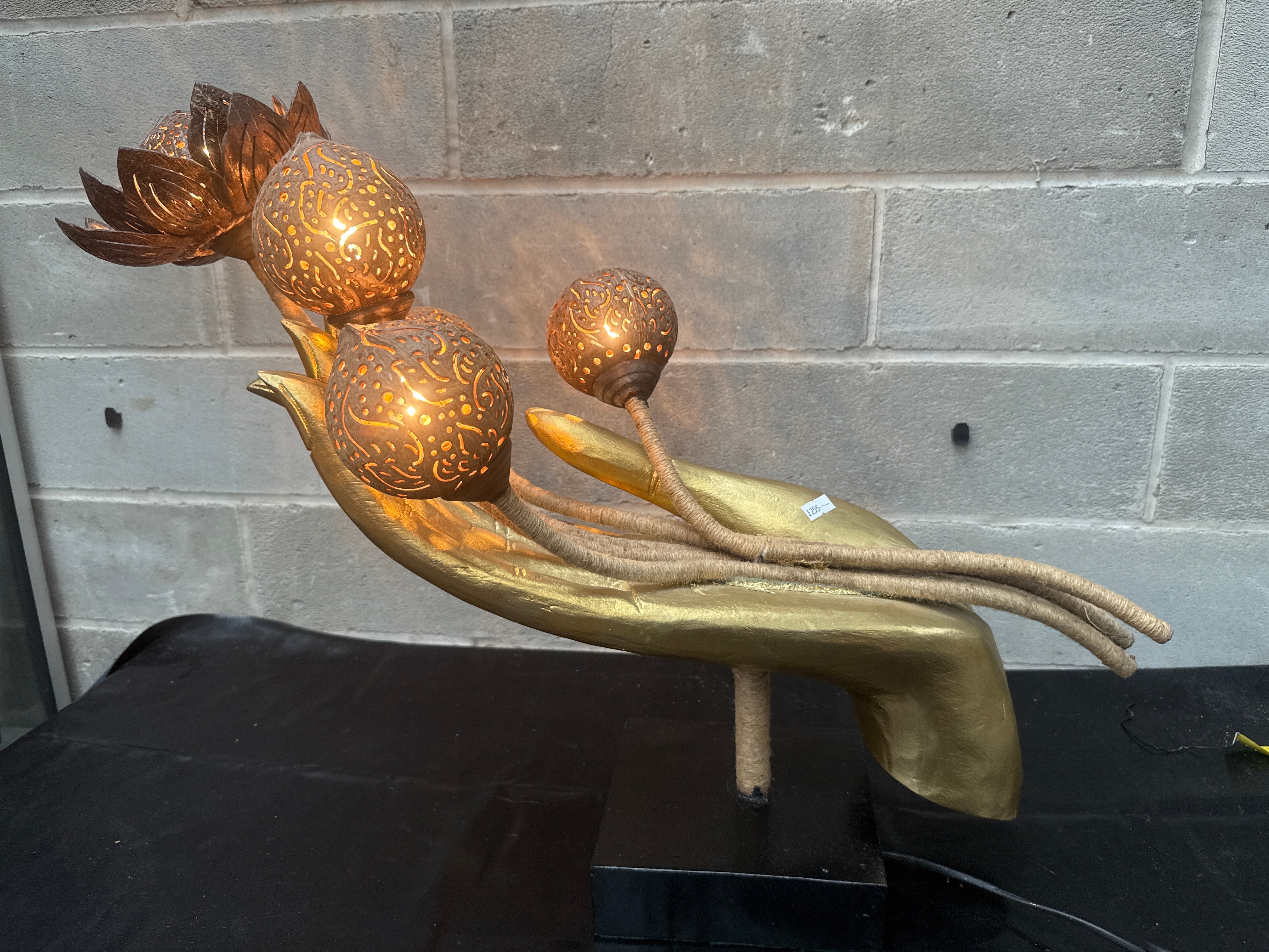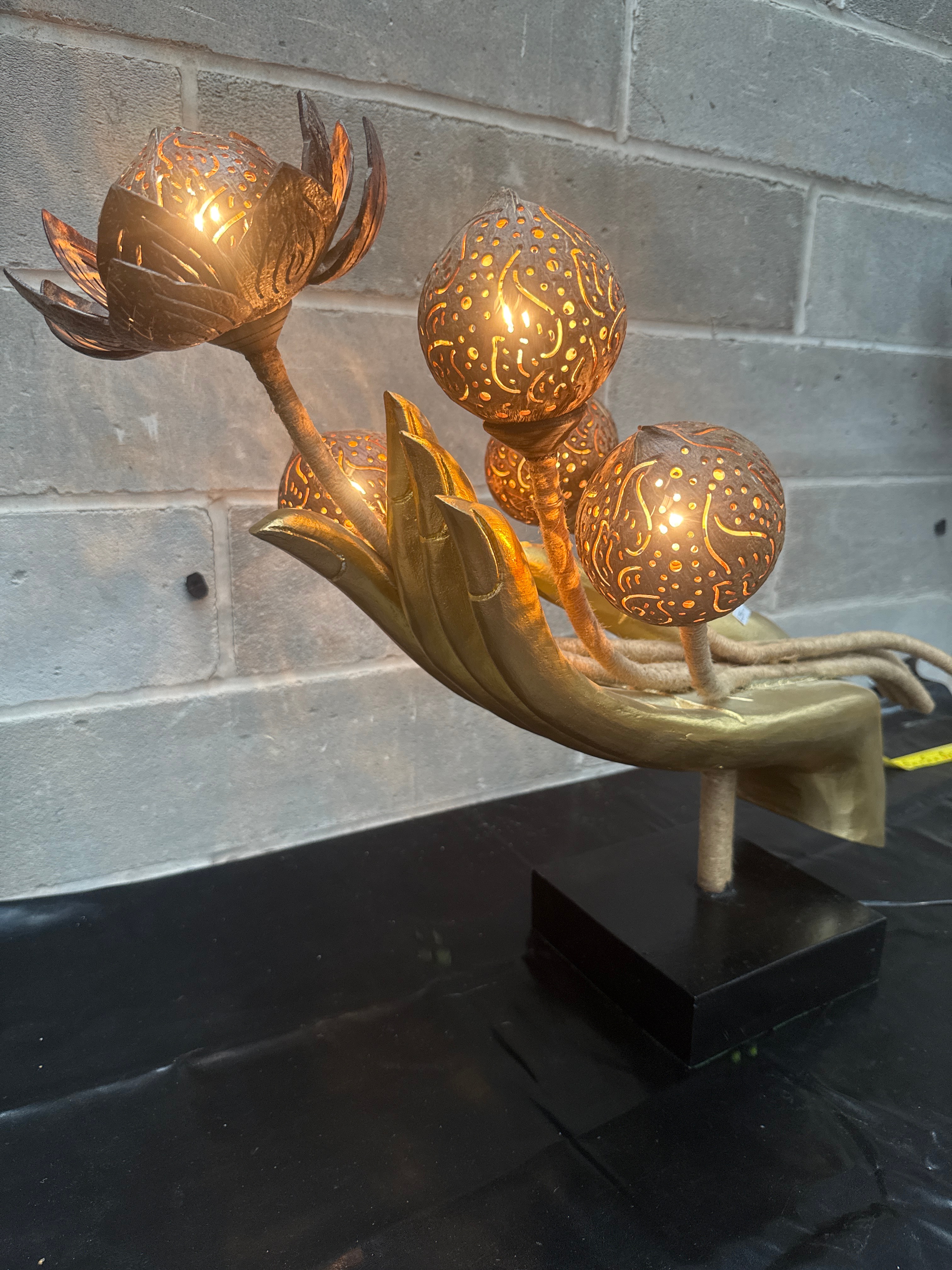 A contemporary illuminated sculpture, likely functioning as a table lamp, featuring a large, stylized hand with a metallic gold finish, possibly crafted from resin or a similar composite material. The hand supports four spherical, intricately carved elements and one open lotus-like flower, all appearing to be made from a dark, organic material such as coconut shell, through which warm light emanates. The “stems” connecting these illuminated components are wrapped in natural jute twine. The sculpture is mounted on a black rectangular base, from which an electrical cord extends.