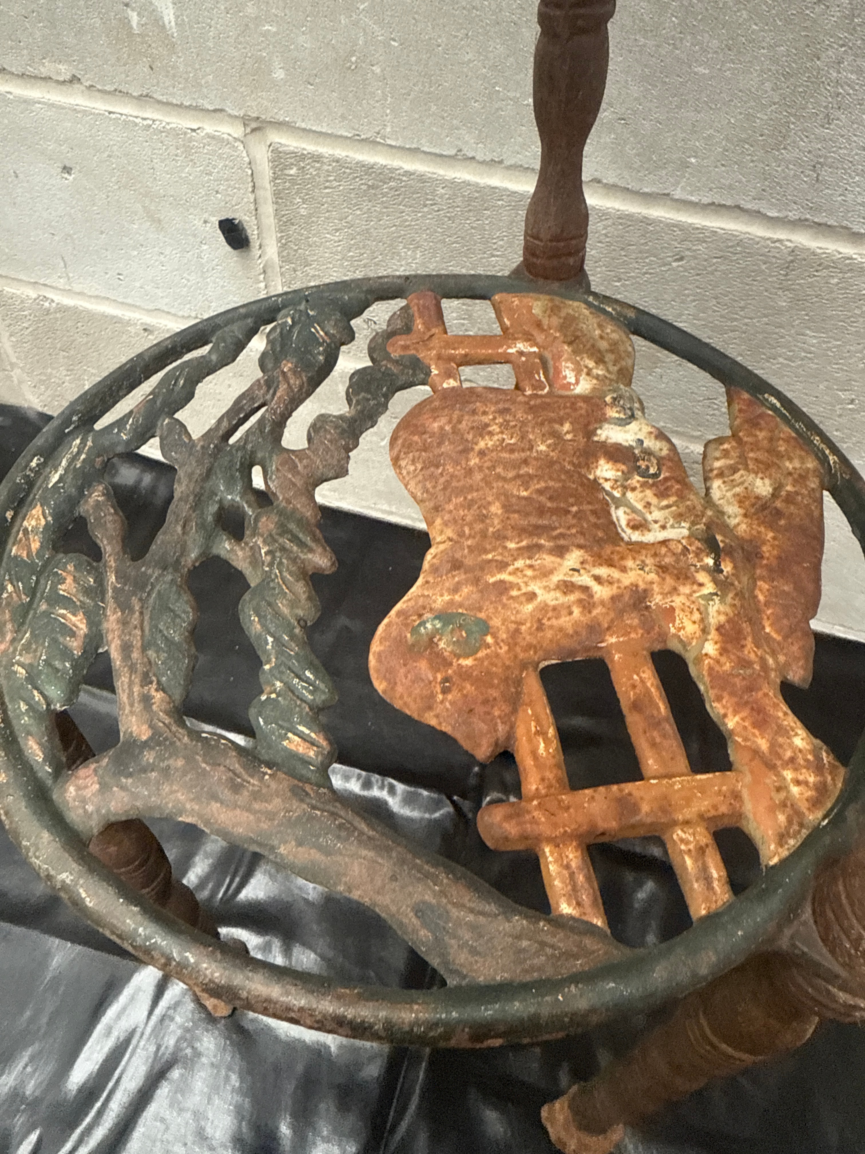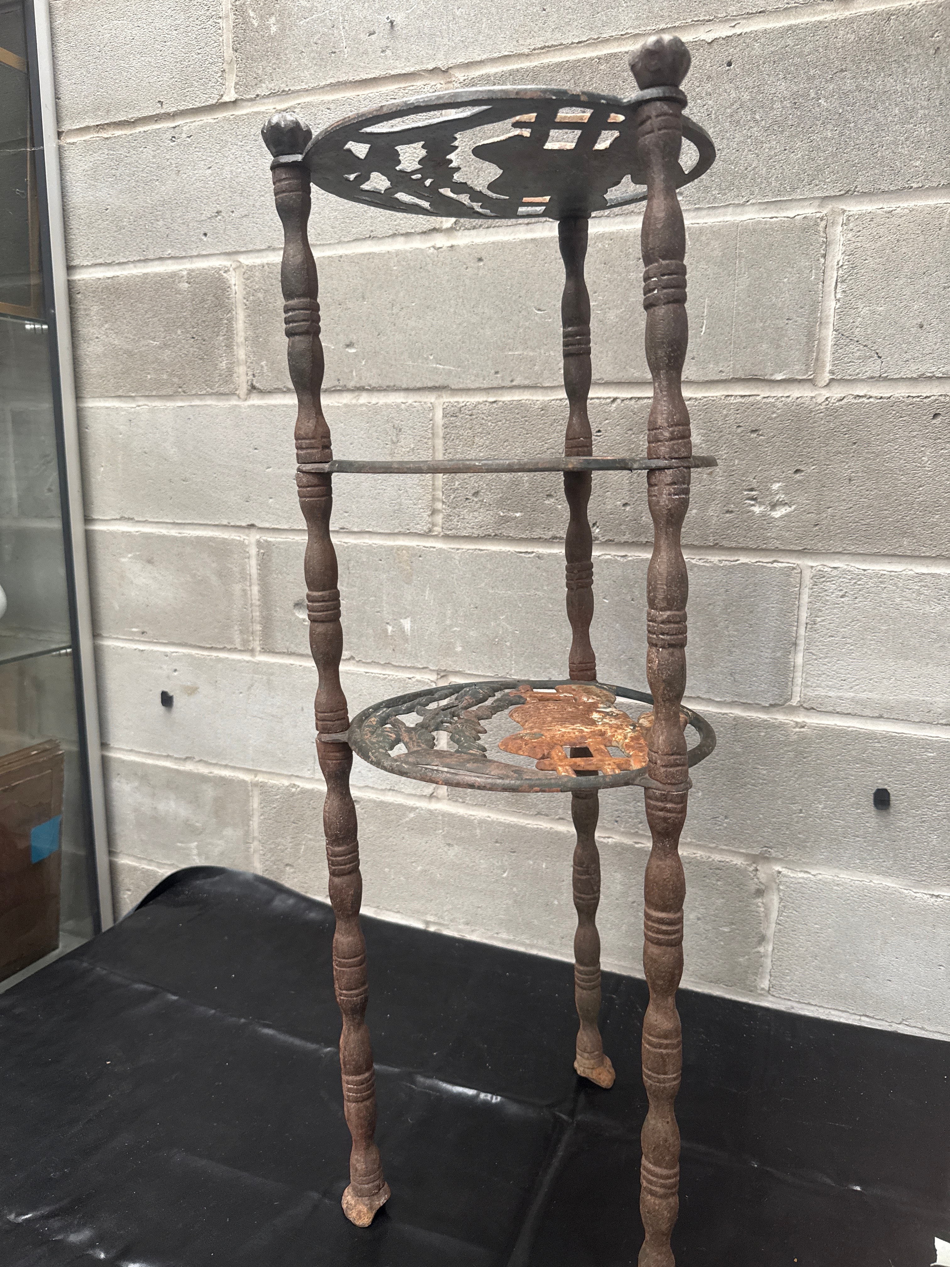 A Victorian style three-tier plant stand, constructed entirely of cast iron. The stand features three circular shelves supported by four turned-style legs. The upper and lower shelves exhibit an openwork design incorporating foliage and a bird motif, characteristic of late Victorian or early 20th-century garden or conservatory aesthetics. No visible manufacturer’s markings are present.