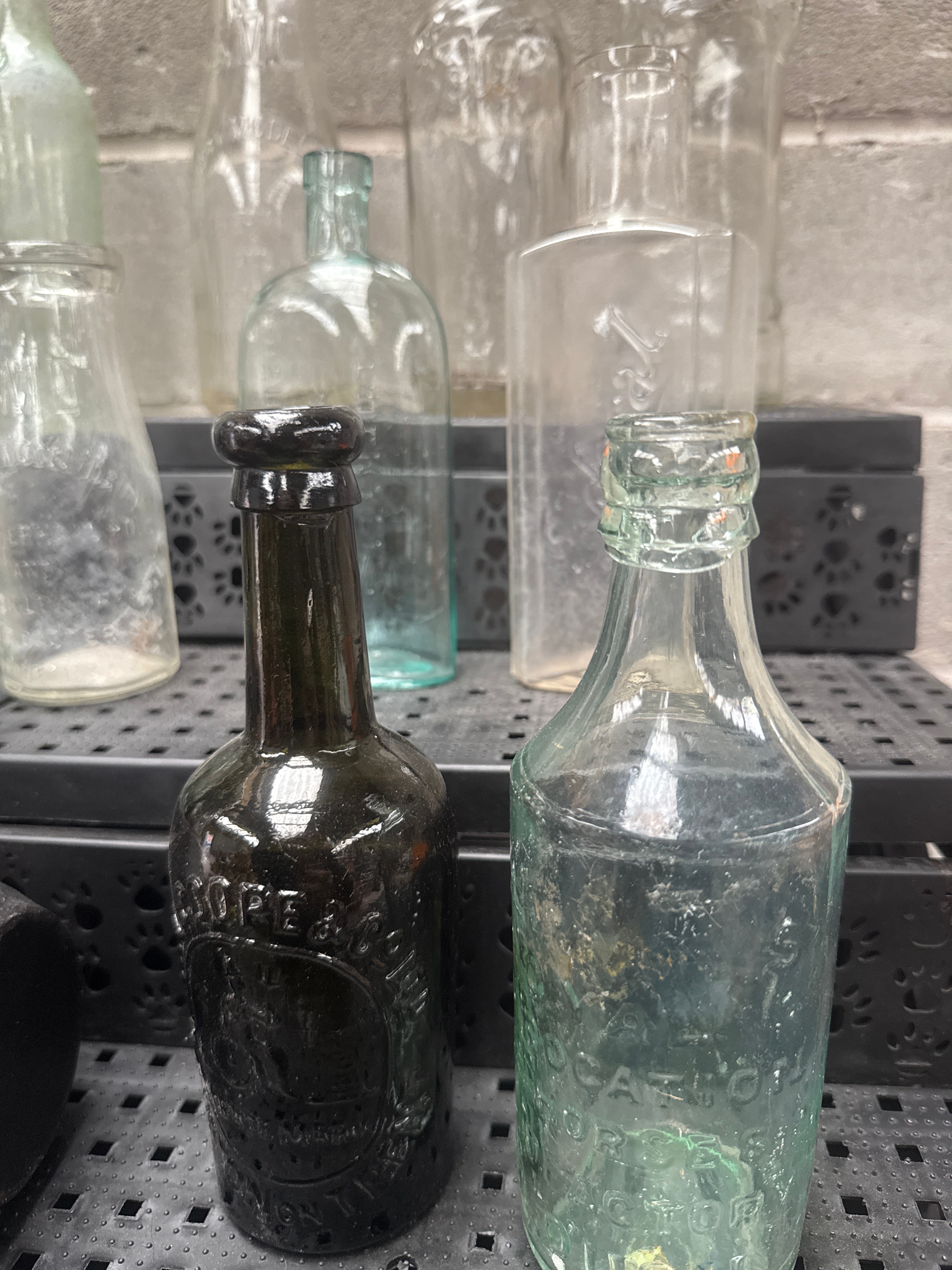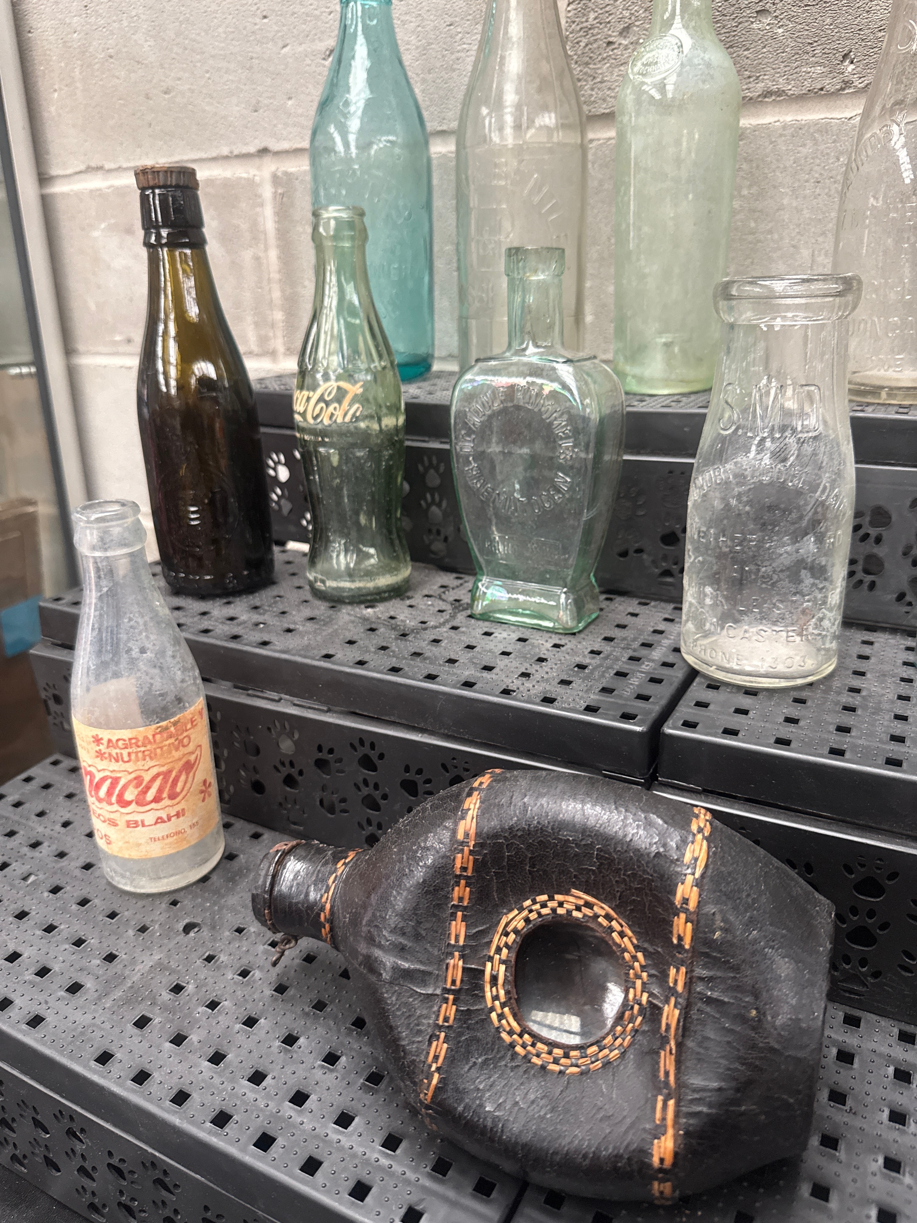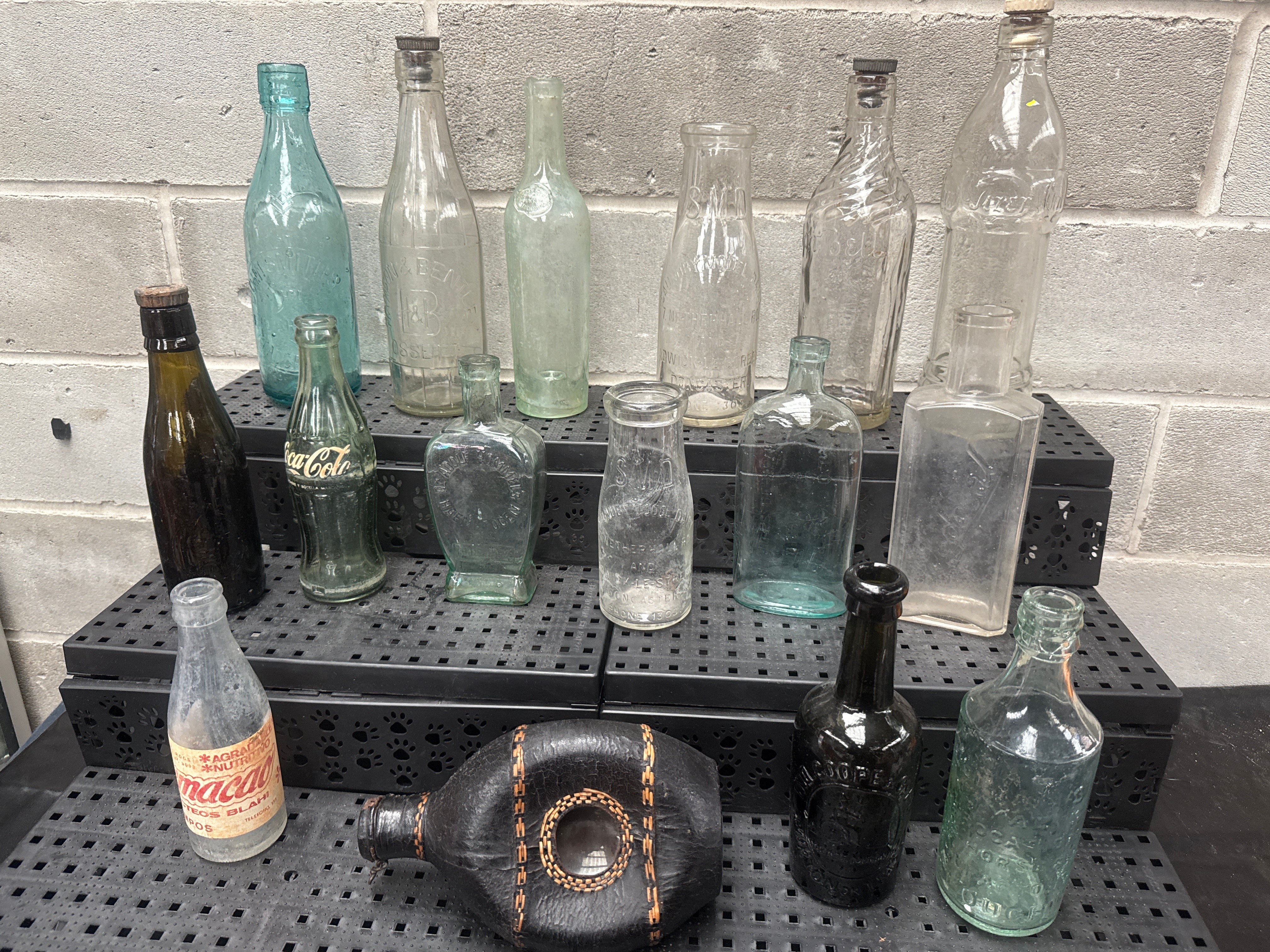 A collection of sixteen antique and vintage glass bottles and one leather-wrapped glass flask. The bottles are of varying shapes, sizes, and hues, including clear, aqua, light green, and dark brown. Types represented include soda, milk, and proprietary medicine containers. Notable examples include a distinctive “Coca-Cola” hobble-skirt bottle, a dark embossed “DR. JAYNE’S TONIC CARMINATIVE” bottle, and a small clear bottle with a label identifying it as a “PRODUCTO CUBANO” for “AGRICOLA Y NUTRITIVO CACAO BLANCO.” Other embossed markings observed include “PROPERTY OF” and “ONE PINT.” The flask features a dark, stitched leather exterior encasing clear glass.