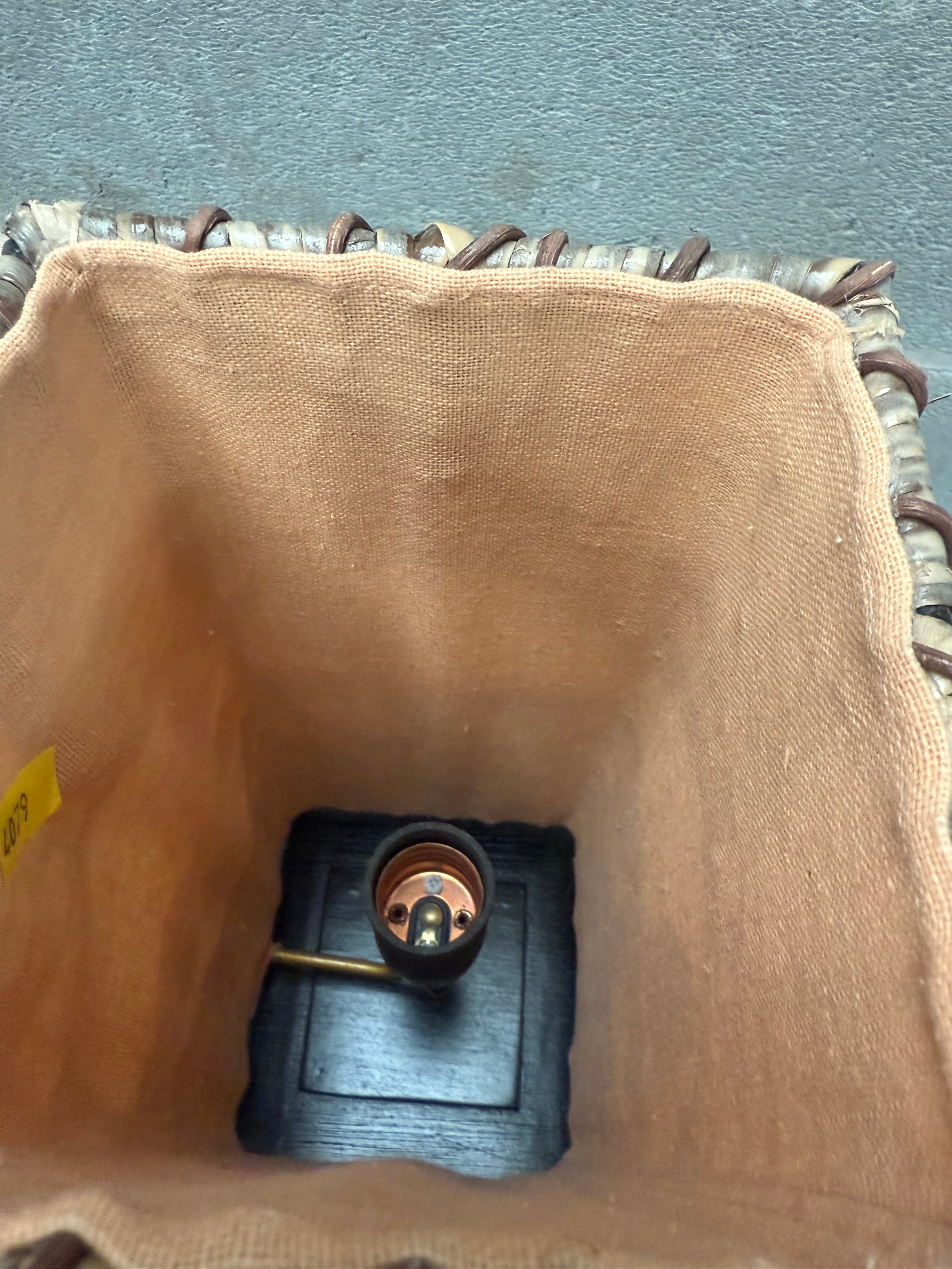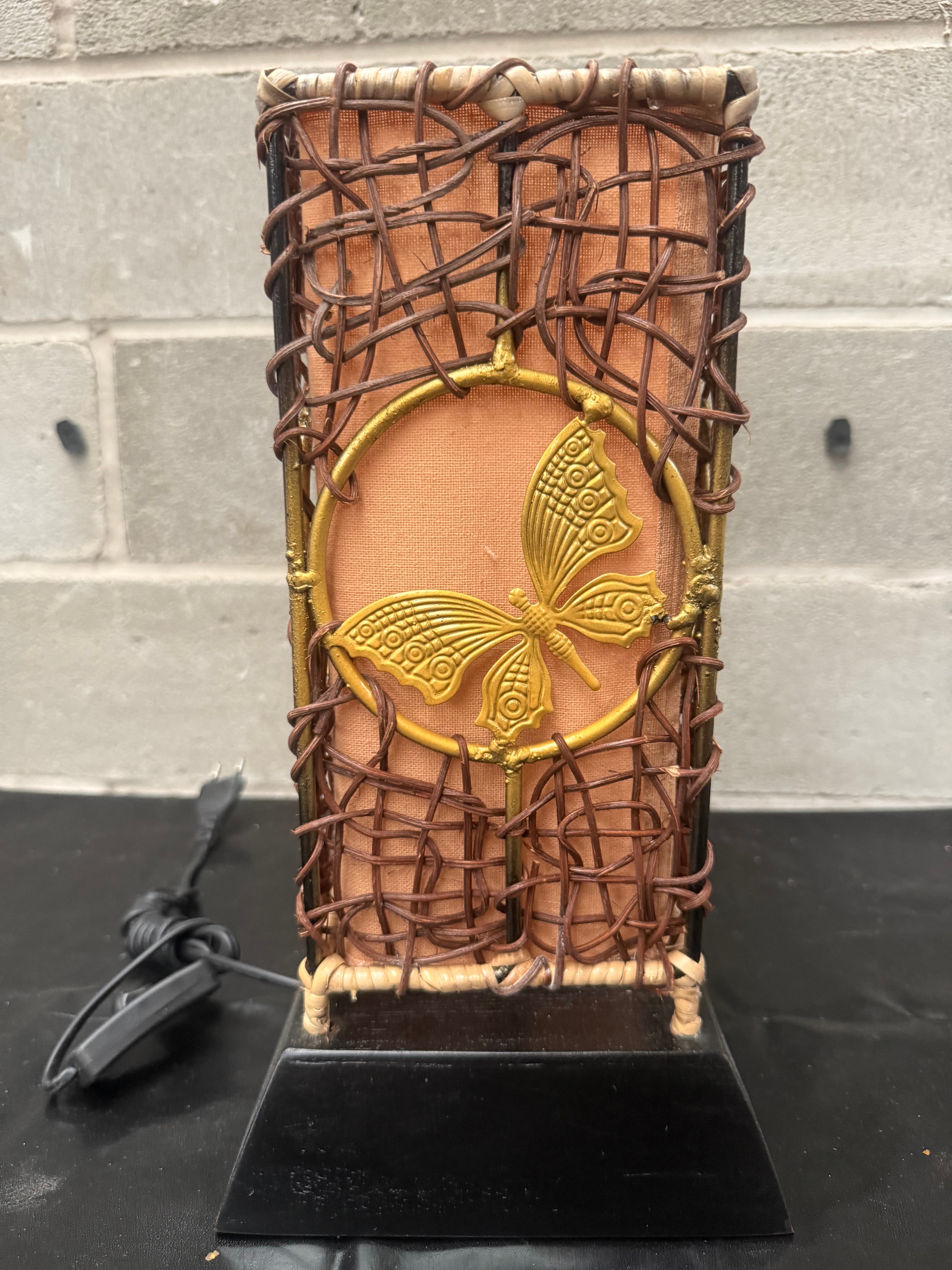 A single rectangular accent table lamp featuring an outer cage constructed from dark brown woven natural fibers, enclosing an inner peach-toned fabric shade. The front is decorated with a prominent gold-toned butterfly emblem centered within a circular metallic frame. It stands on a dark, rectangular base, likely wood or composite. A yellow sticker inside the shade bears the handwritten marking “6-07,” which may denote a date.
