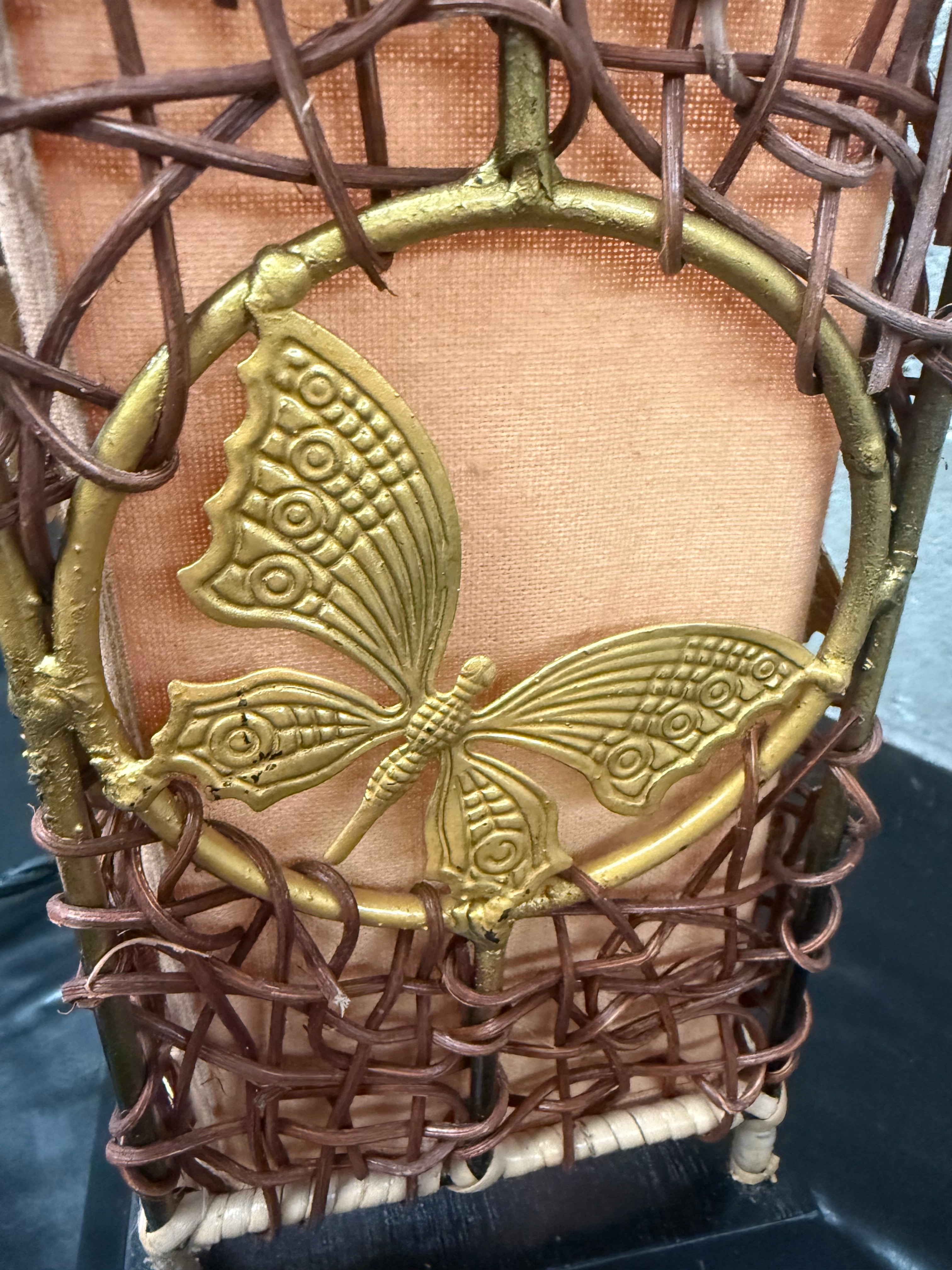 A contemporary rectangular table lamp featuring a modern rustic or bohemian-inspired design. The lamp comprises a dark wood or composite base supporting a shade with an outer layer of dark brown woven rattan fibers over an inner fabric shade of light peach/tan woven material. A gold-toned butterfly motif within a circular ring, likely metal or plastic, adorns the front. Internally, a brass-colored electrical socket is present. A yellow sticker with “6-07” is visible inside the shade.