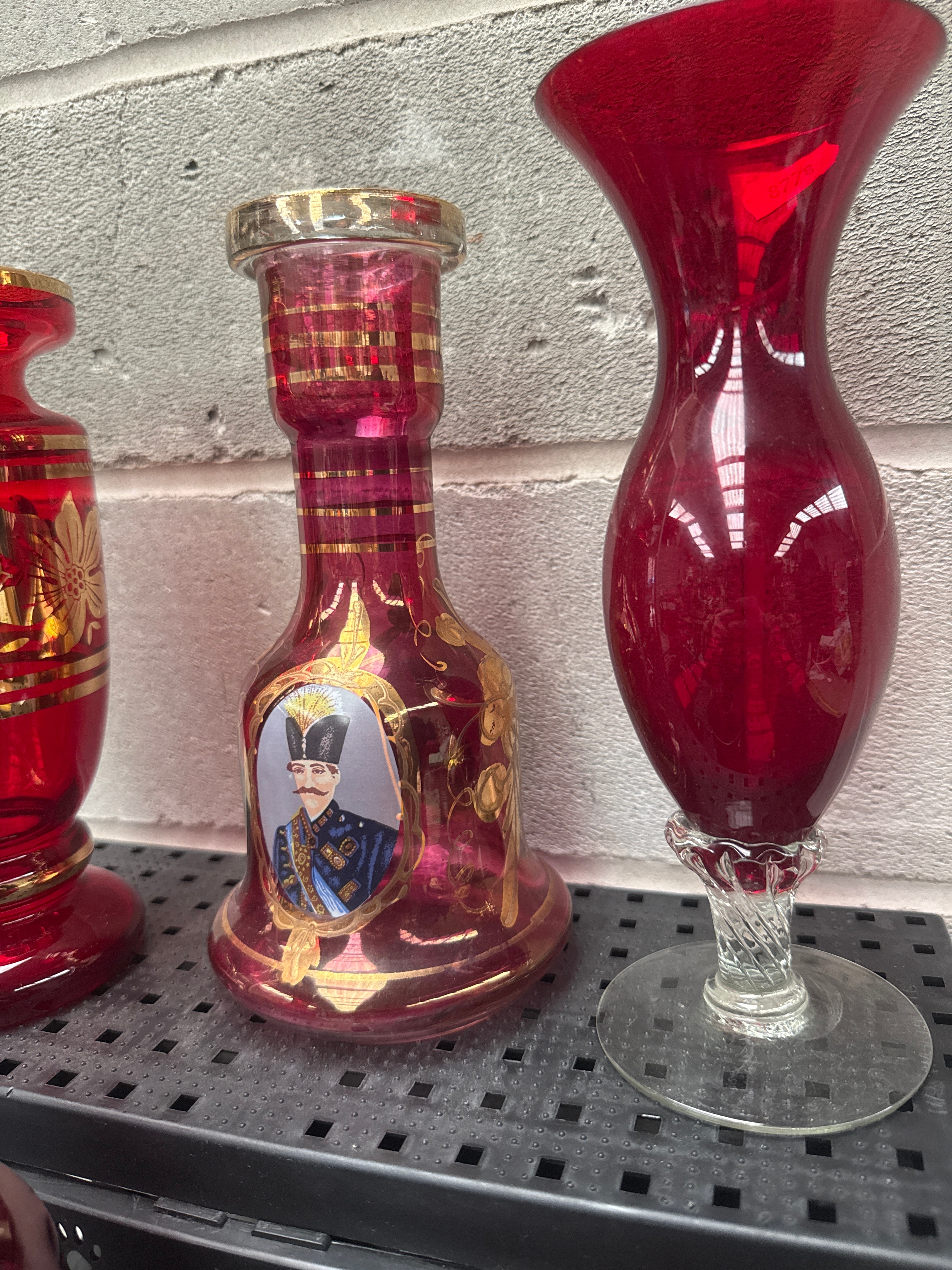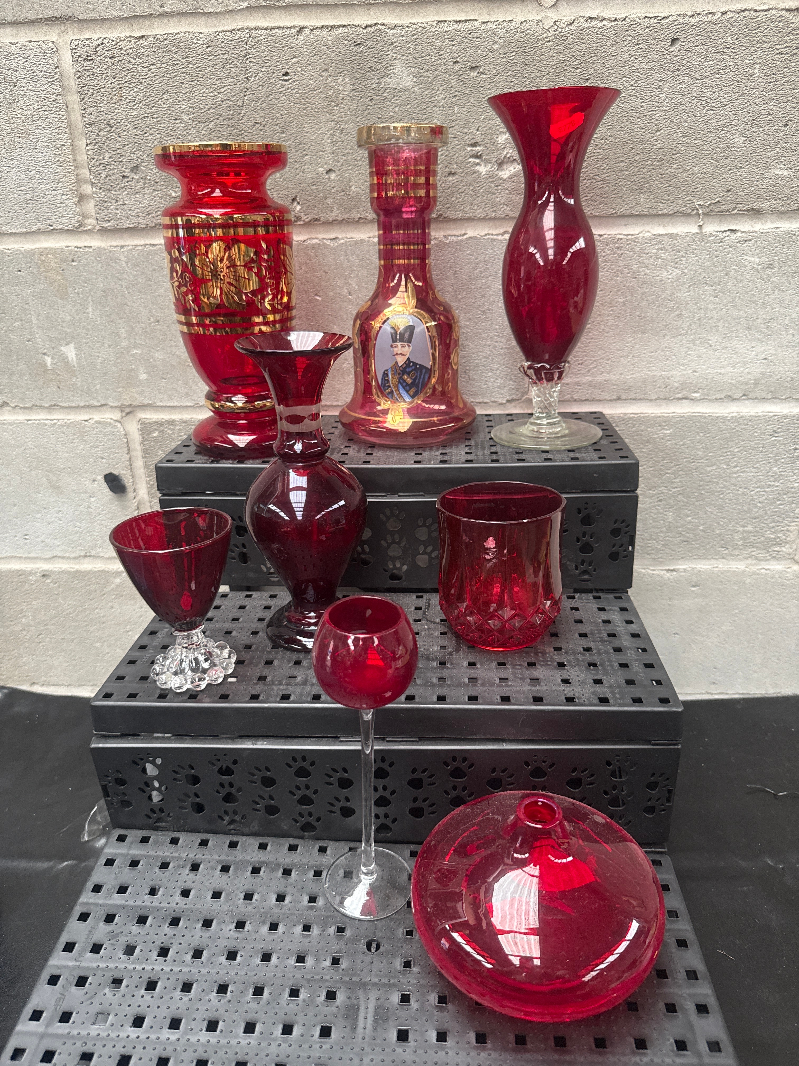 This group comprises eight ruby red glass vessels, including various vases, a goblet, a wine glass, and tumblers, some with clear glass stems and bases. Several pieces feature extensive gold enamel decoration, particularly two larger vessels. One vase-like item prominently displays an oval portrait of a man in military-style attire with a distinctive tall hat, surrounded by gold leaf.