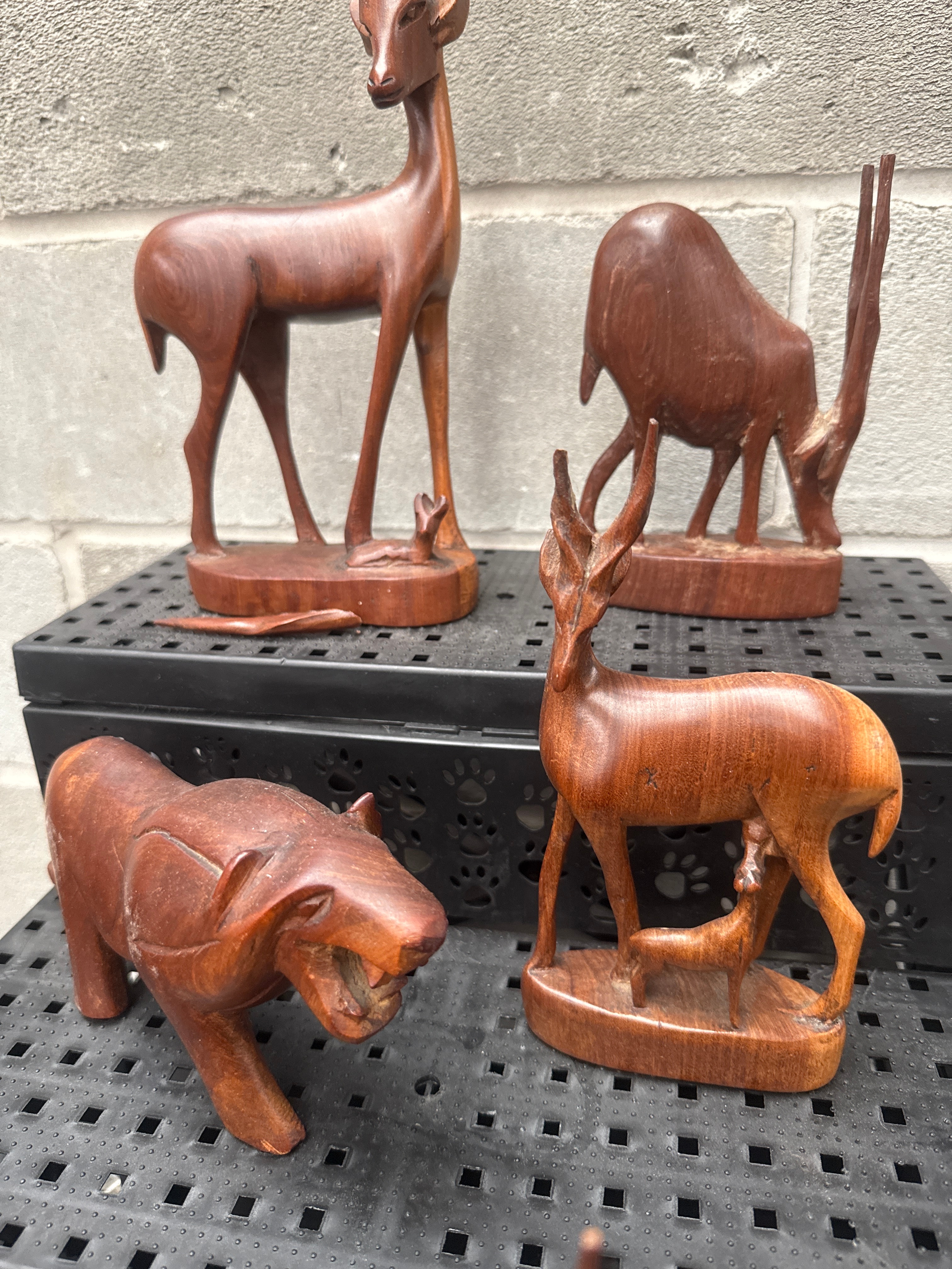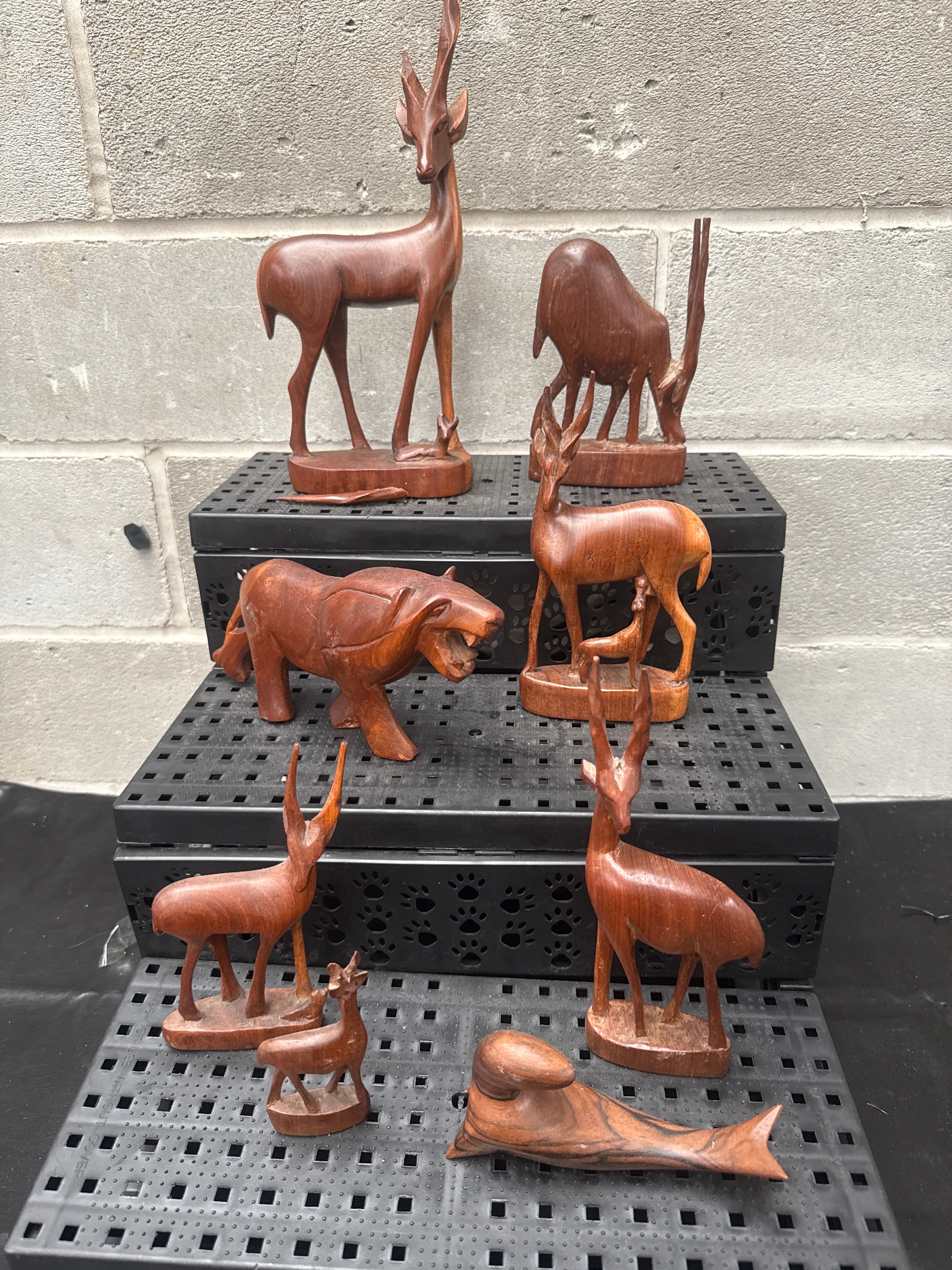 A group of seven African hand-carved wooden animal figures, rendered in a naturalistic yet stylized folk art manner. Each piece is crafted from a dark, polished hardwood, exhibiting clear wood grain. The collection includes several gazelle or antelope-like figures, two of which are accompanied by fawns, a snarling big cat resembling a leopard, a larger antelope with prominent horns, and a stylized aquatic creature or fish.