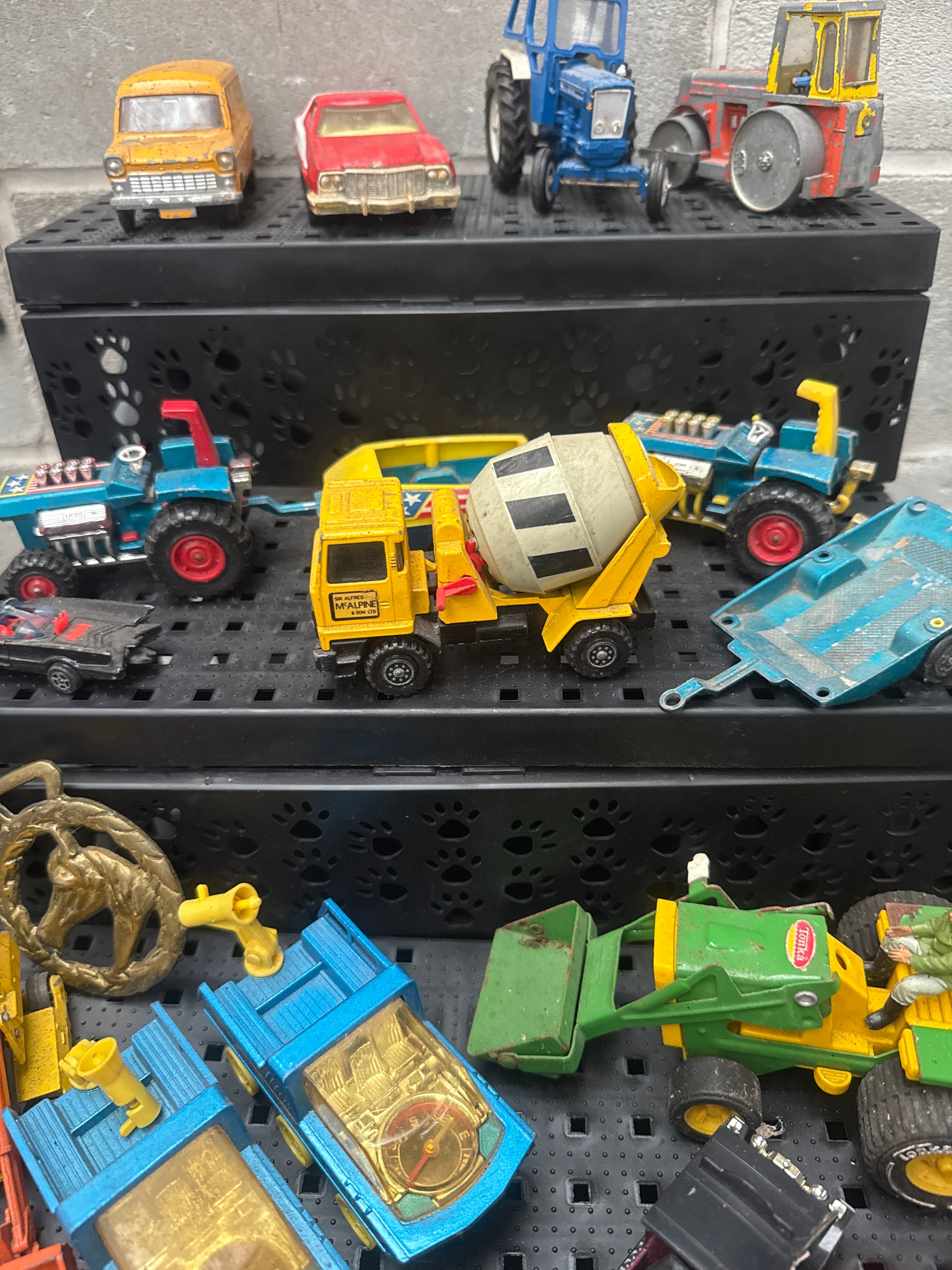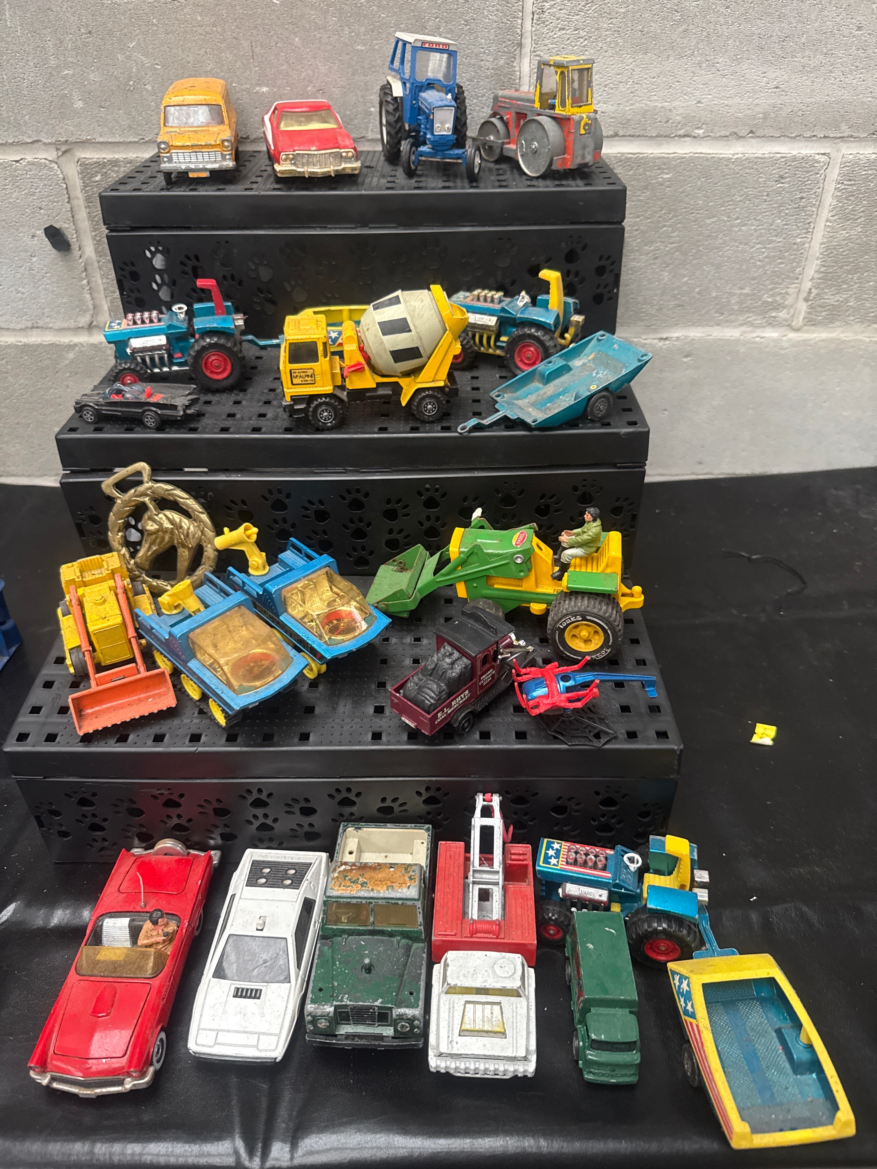 A collection of approximately 30-35 vintage die-cast toy vehicles, likely including examples by Dinky, Corgi, and Matchbox. Comprising primarily die-cast metal with plastic components, the assortment features various cars, trucks (including dump, cement mixer, and flatbed models), tractors, and construction equipment (such as a road roller). Visible markings include ‘FORD’ on a blue tractor, ‘MACH’ (or similar) on a yellow cement mixer, and ‘POLICE’ with an emblem on a white car, suggesting a mid-to-late 20th-century period of manufacture.