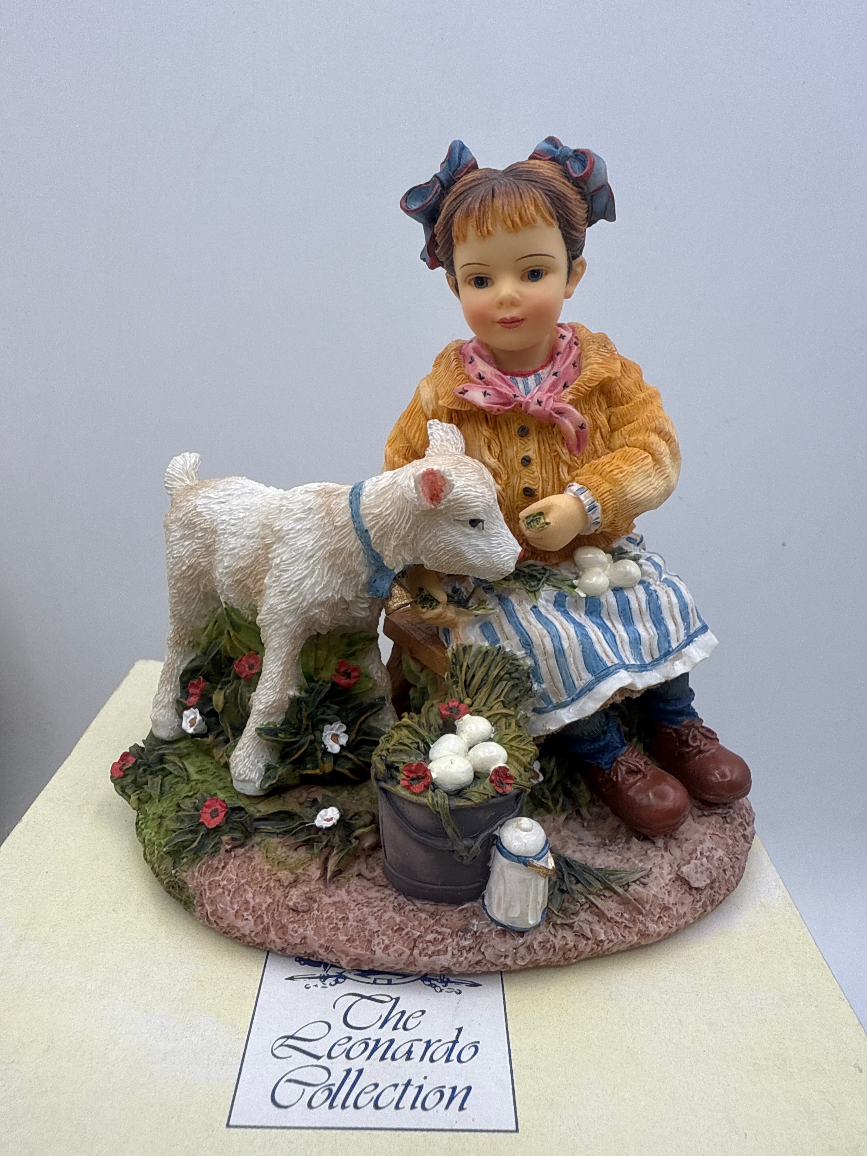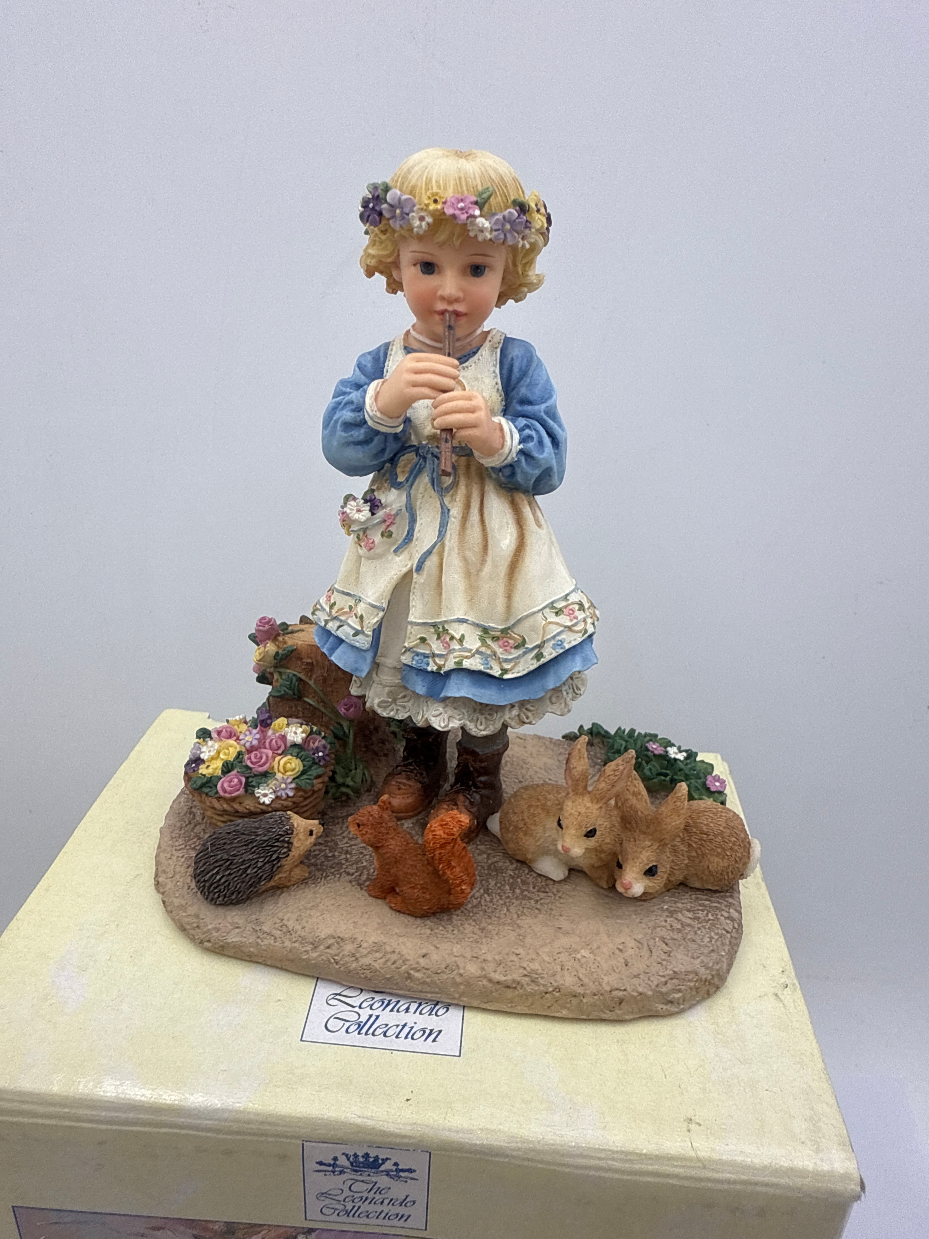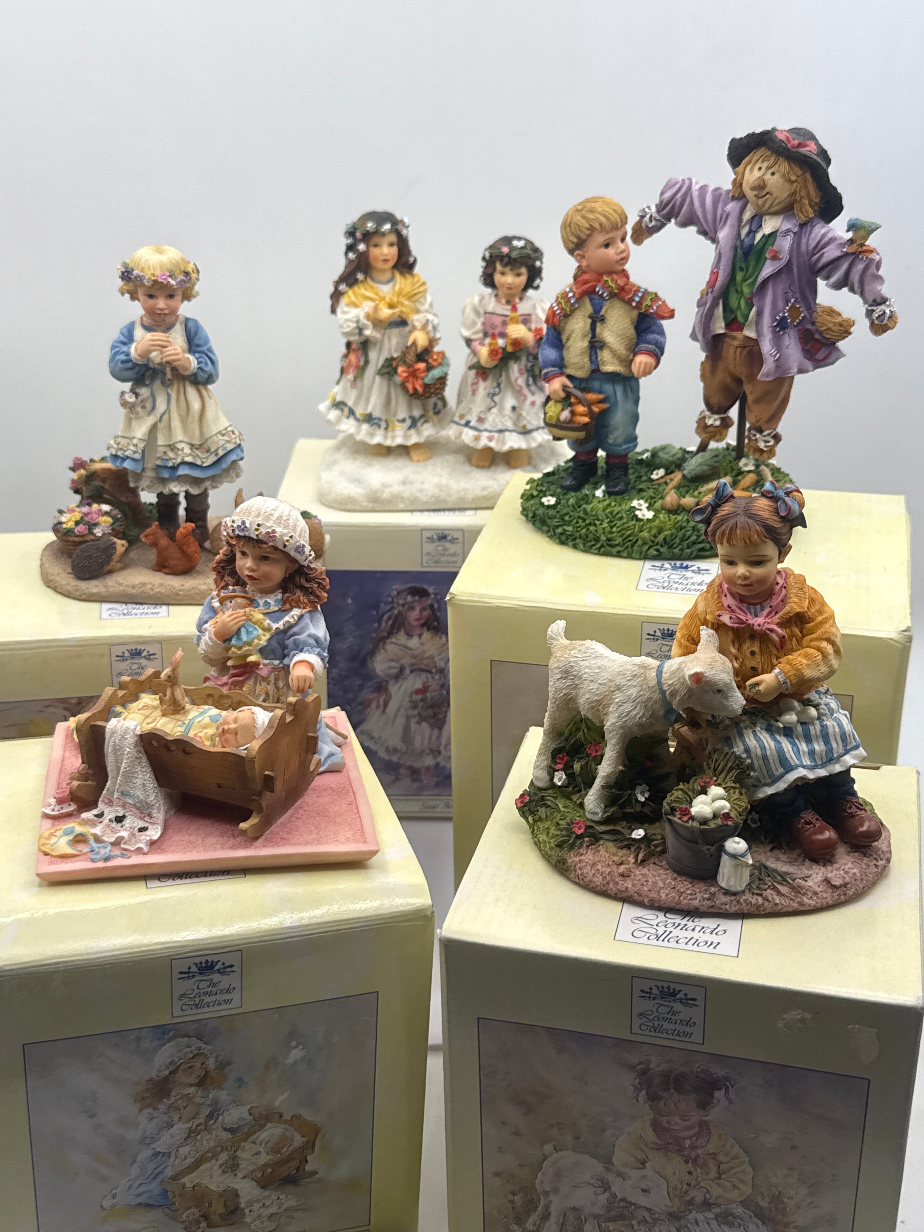 A group of five hand-painted resin figurines from The Leonardo Collection, designed by Christine Haworth. Each piece depicts children in detailed, whimsical, and pastoral scenes, often interacting with animals such as a goat, rabbits, squirrels, or engaged in activities like caring for a baby, carrying baskets of flowers, or playing a flute. One piece also features a scarecrow figure. The style is characteristic of modern collectible figurines, featuring vibrant colors and intricate detailing. Several pieces are presented in their original accompanying boxes.
