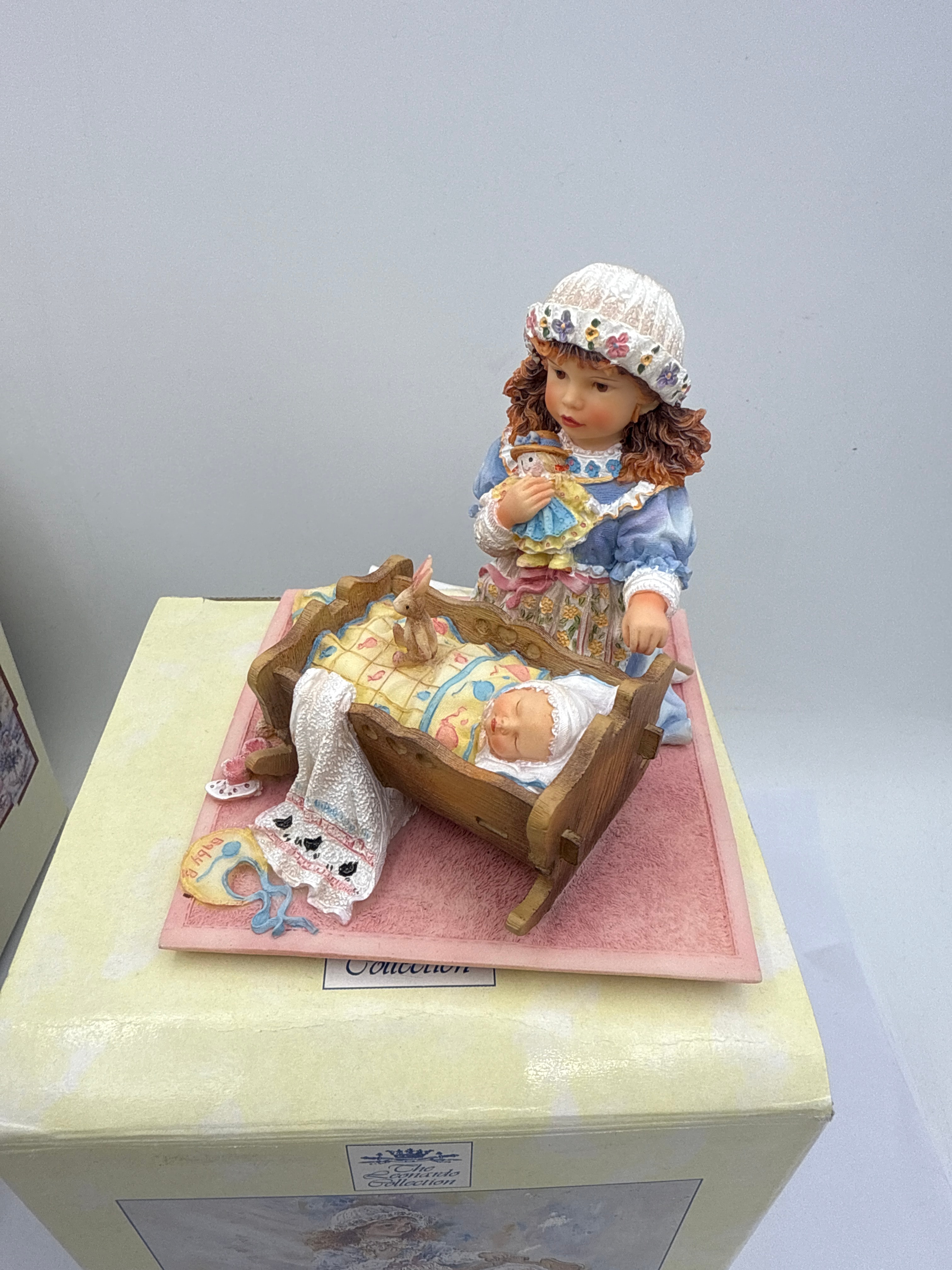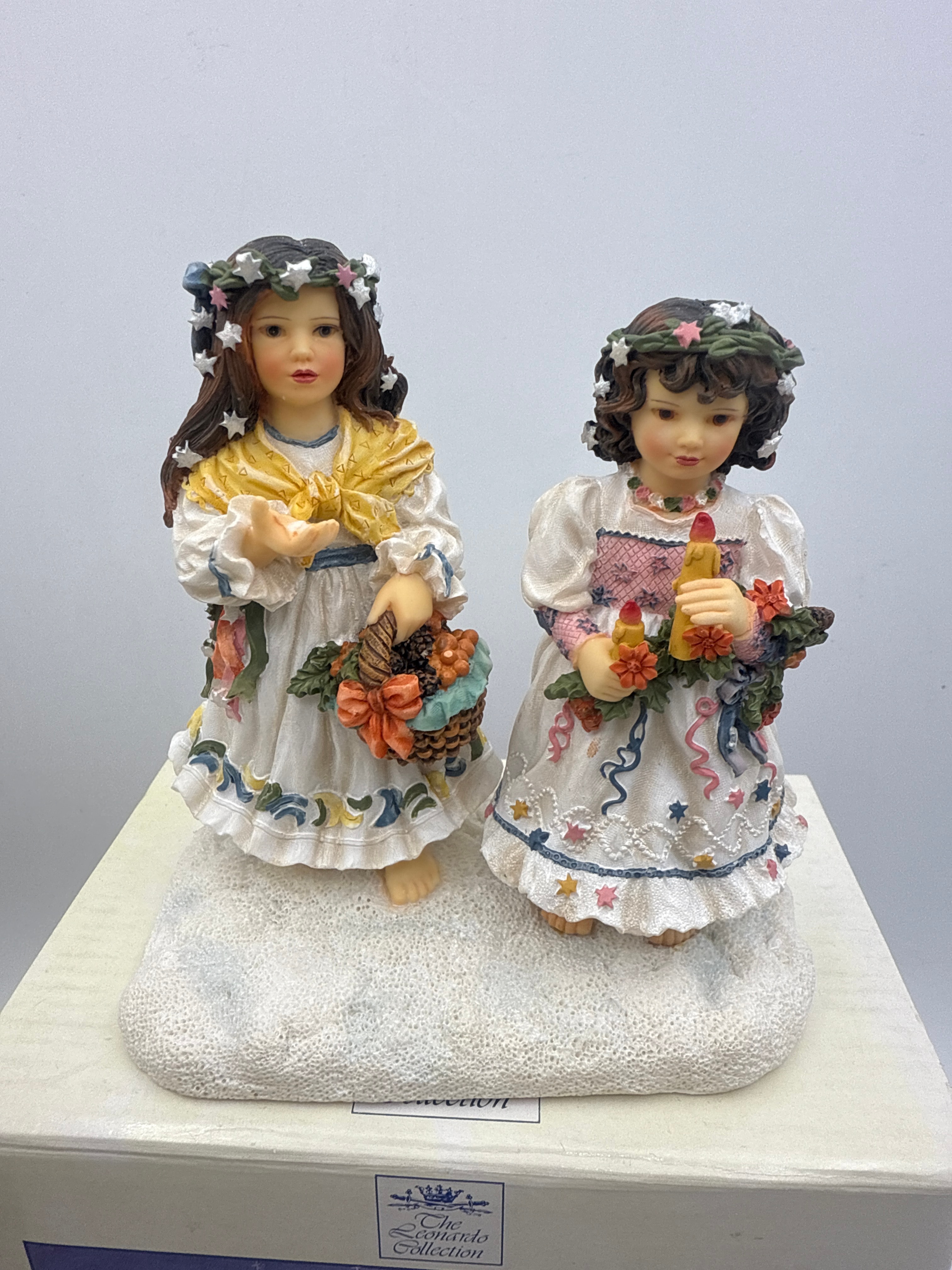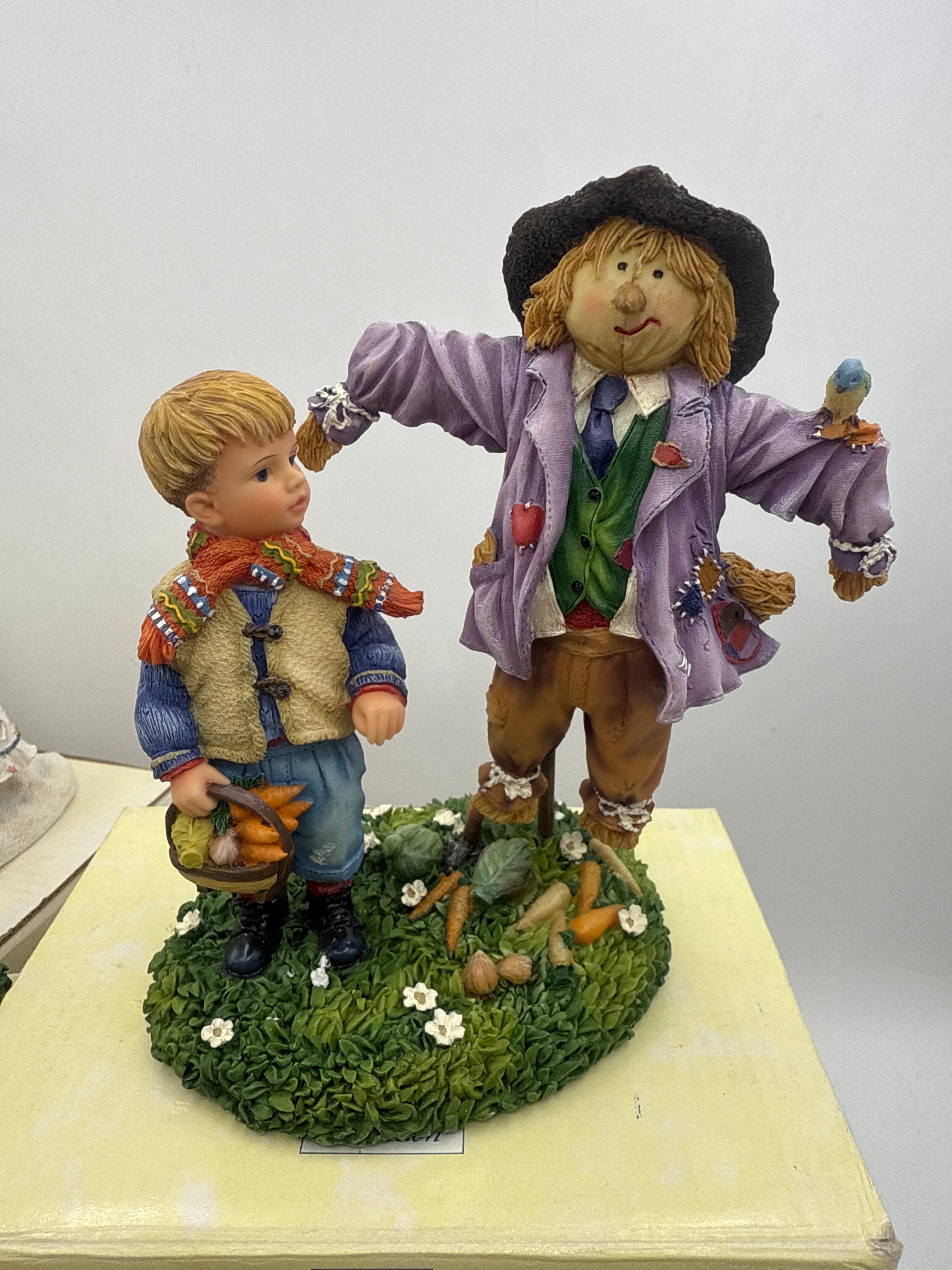 A group of five hand-painted resin figurines from The Leonardo Collection, designed by Christine Haworth. Each piece depicts children in detailed, whimsical, and pastoral scenes, often interacting with animals such as a goat, rabbits, squirrels, or engaged in activities like caring for a baby, carrying baskets of flowers, or playing a flute. One piece also features a scarecrow figure. The style is characteristic of modern collectible figurines, featuring vibrant colors and intricate detailing. Several pieces are presented in their original accompanying boxes.
