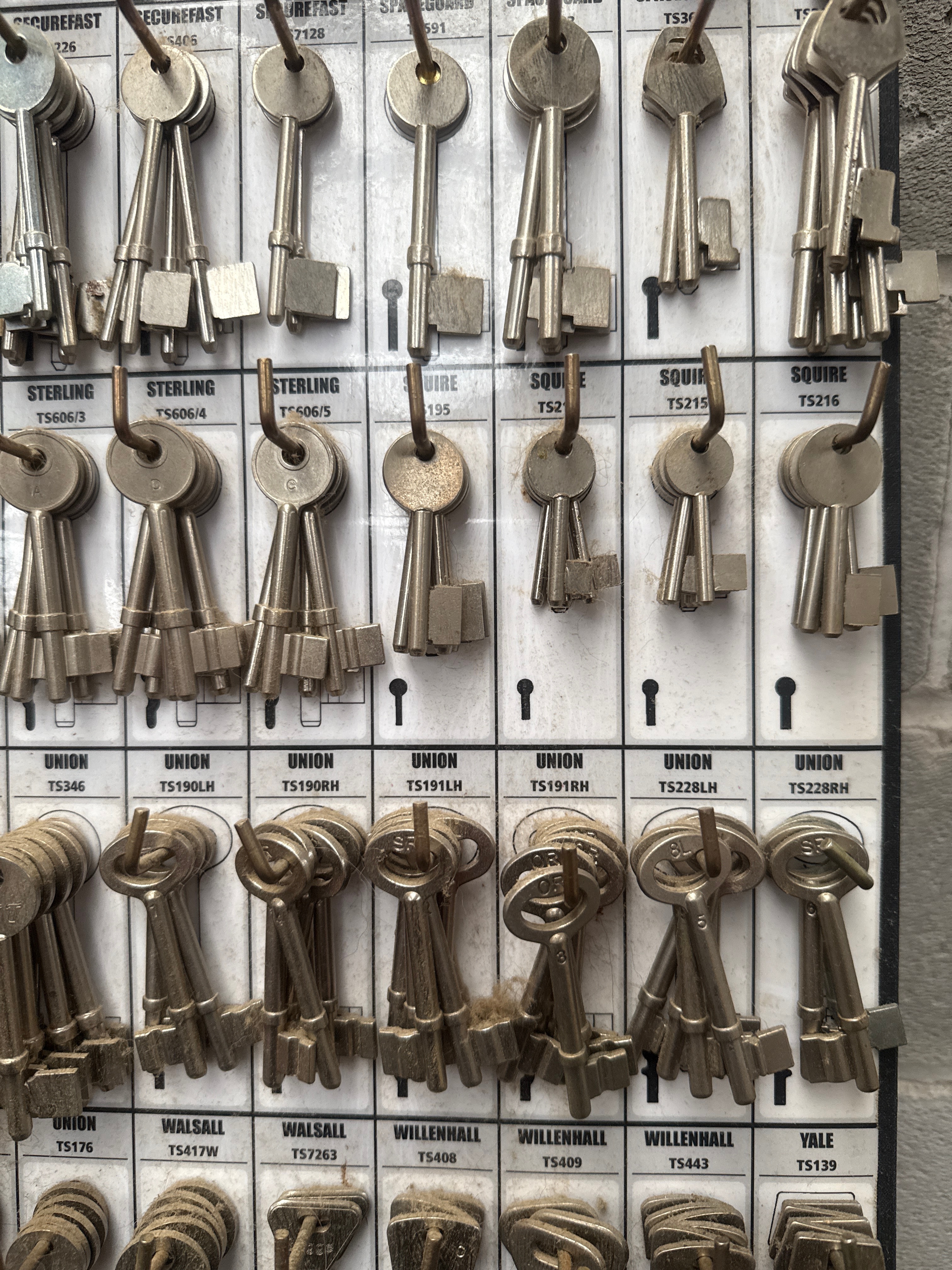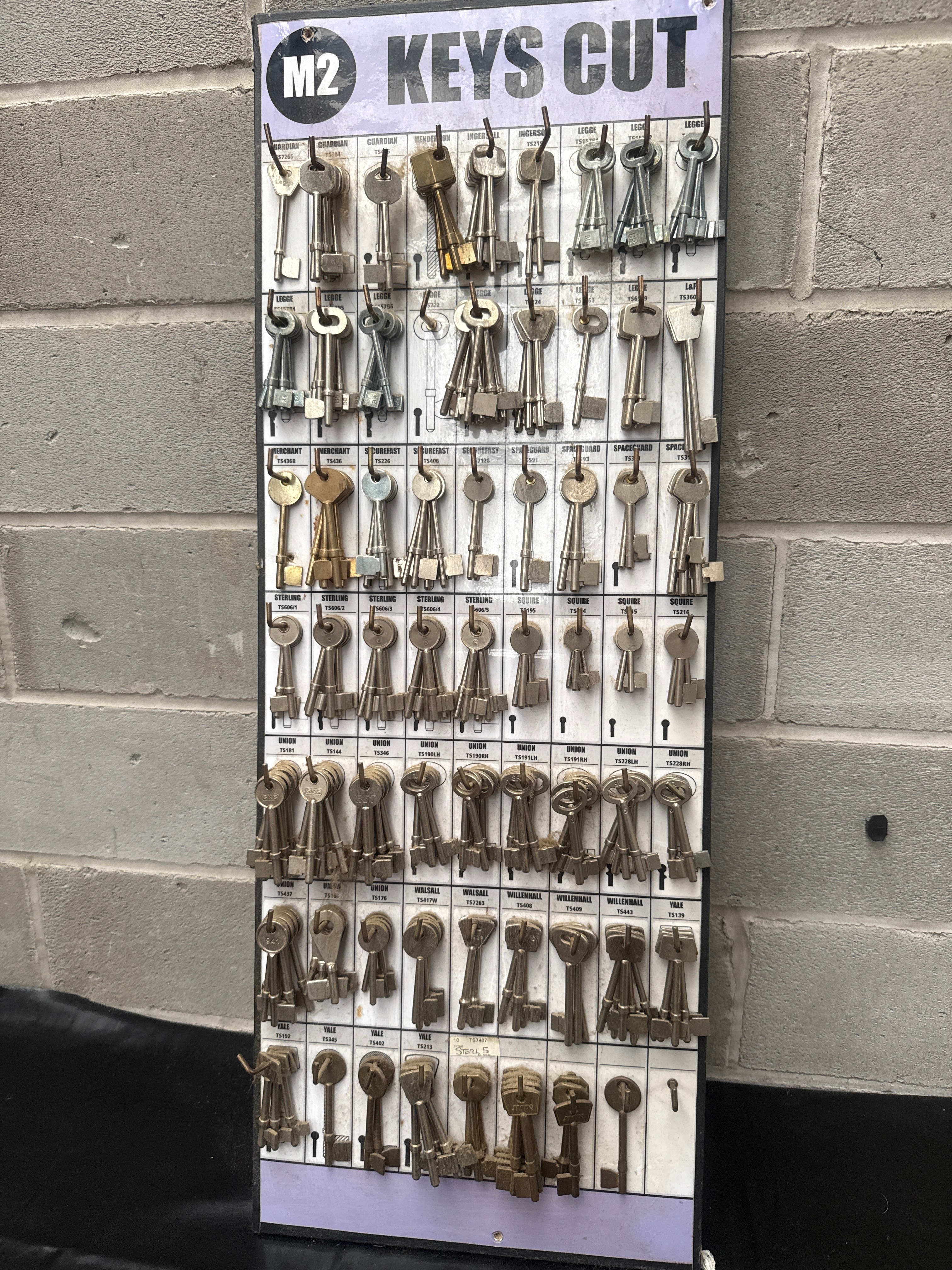 An M2 Keys Cut retail locksmith display board, likely dating from the late 20th or early 21st century. This large, vertical, utilitarian display board is designed for showcasing and organizing various key blanks for a key-cutting service. It is constructed from a composite board material with a white laminated or painted surface. The board features numerous metal hooks holding a wide assortment of metallic key blanks, predominantly brass and steel/nickel-plated. The English words “M2 KEYS CUT” are prominently displayed at the top, indicating its function. Below this, and throughout the board, are various key manufacturer brand names such as STERLING, UNION, SQUIRE, YALE, ERA, and LEGGE, each with corresponding model numbers. The key blanks themselves appear largely unused.