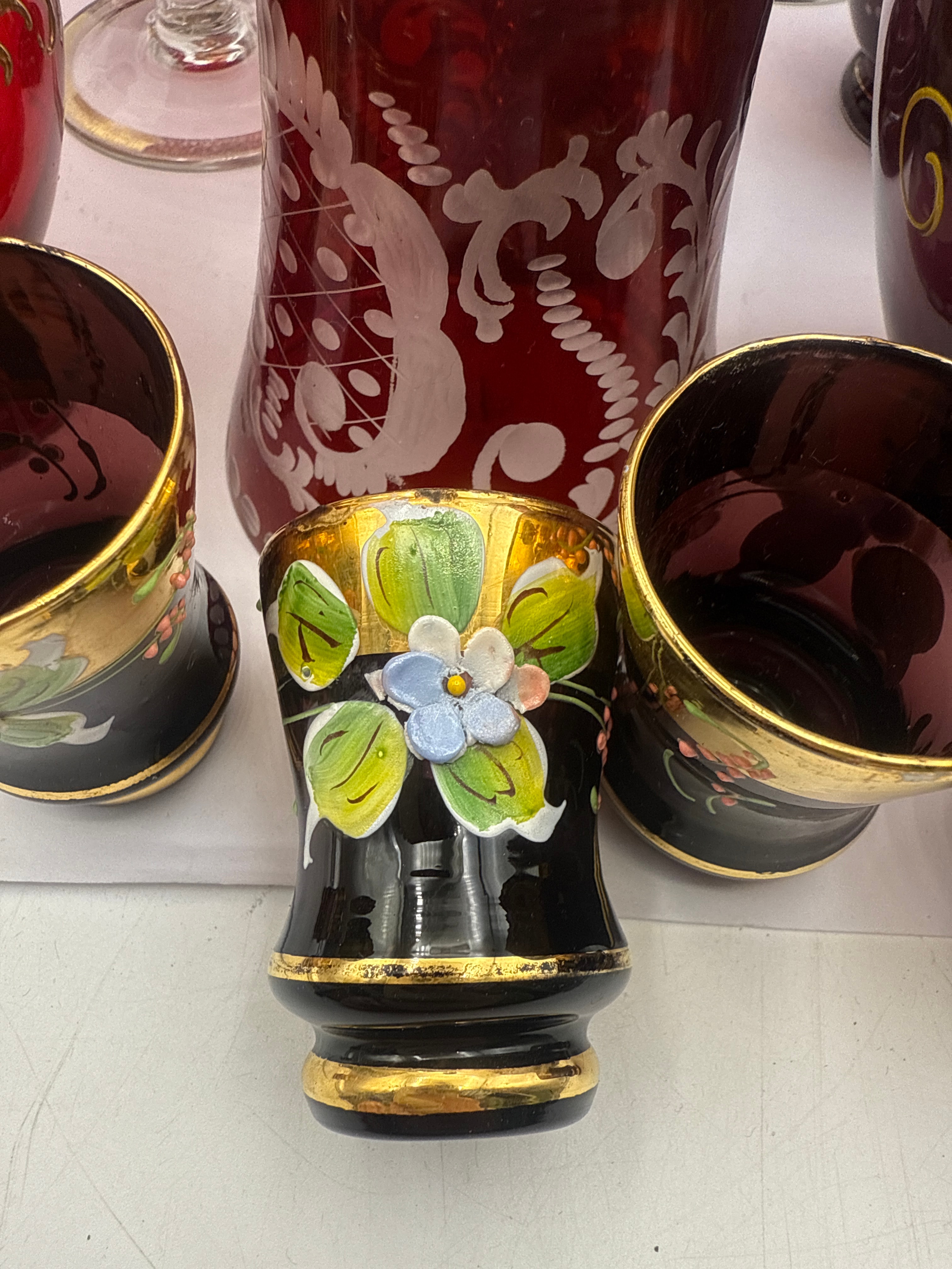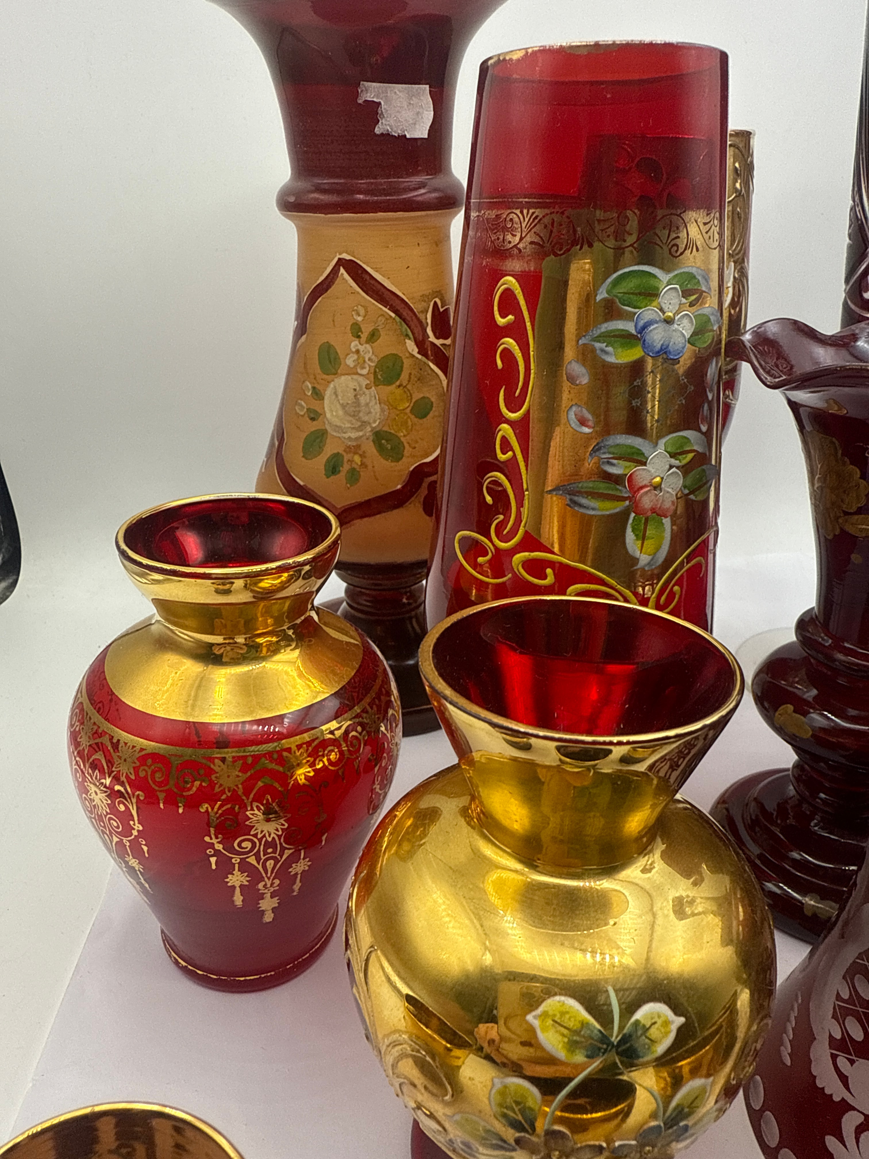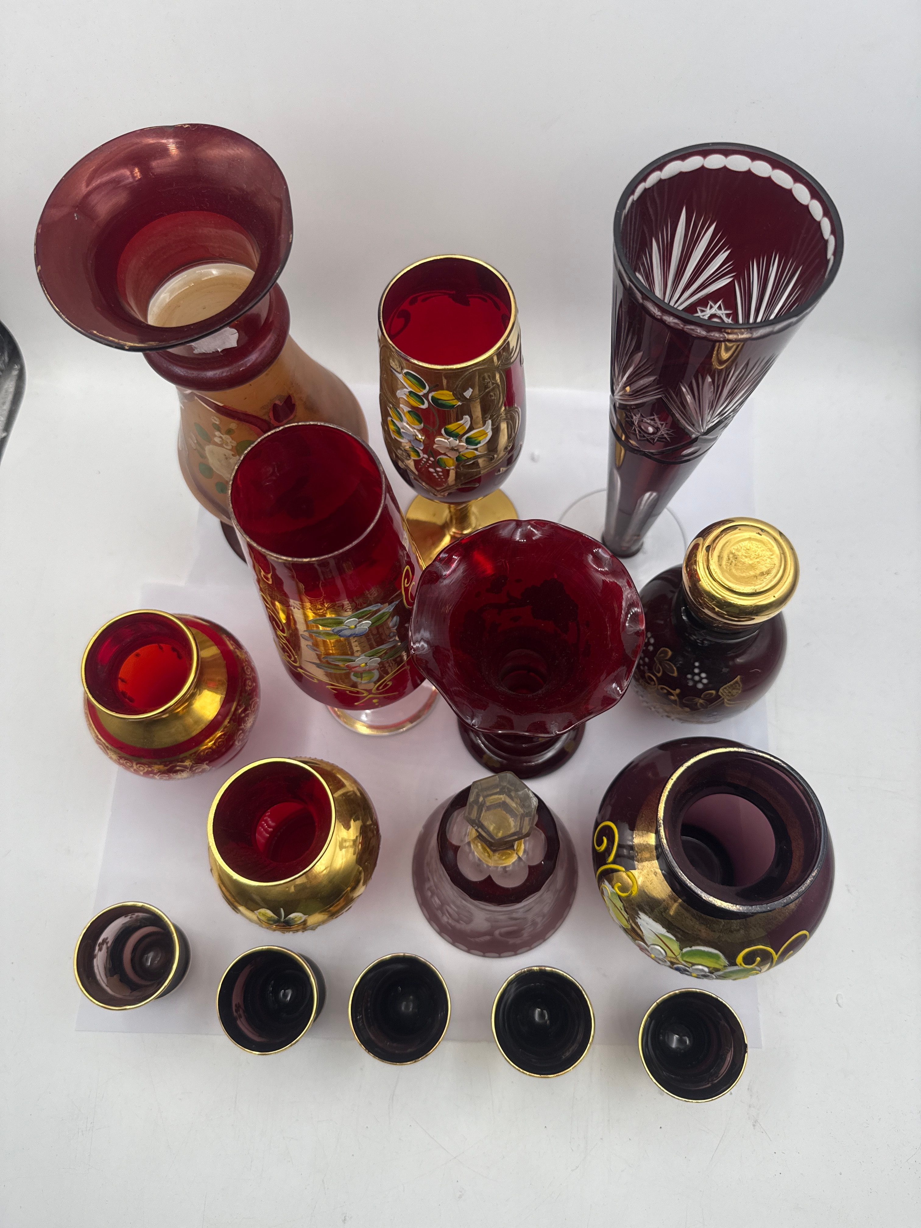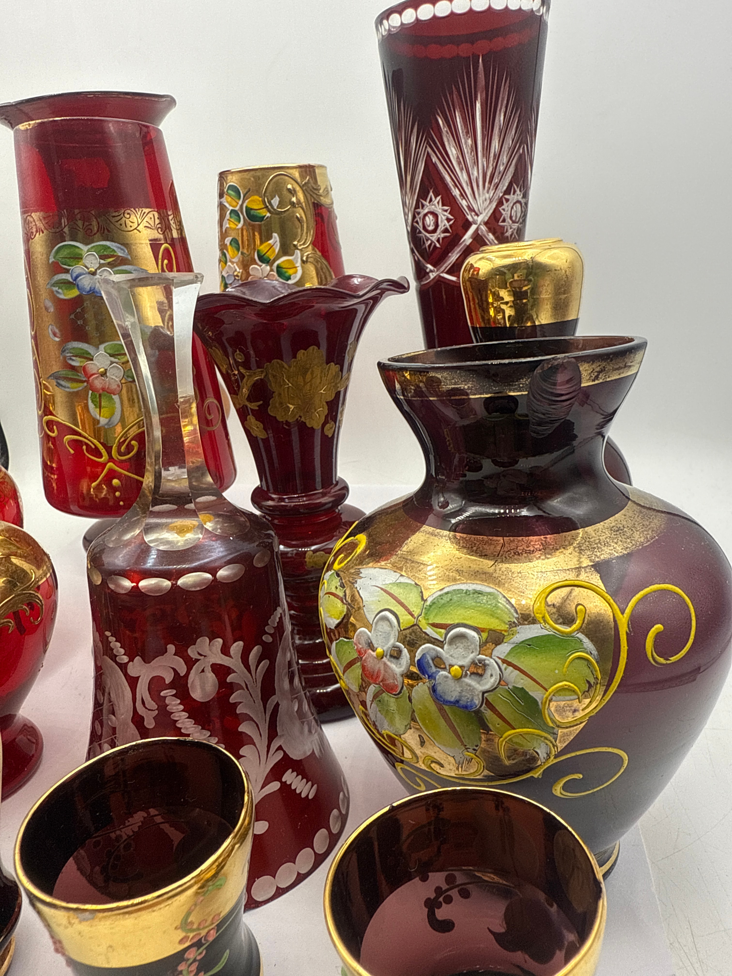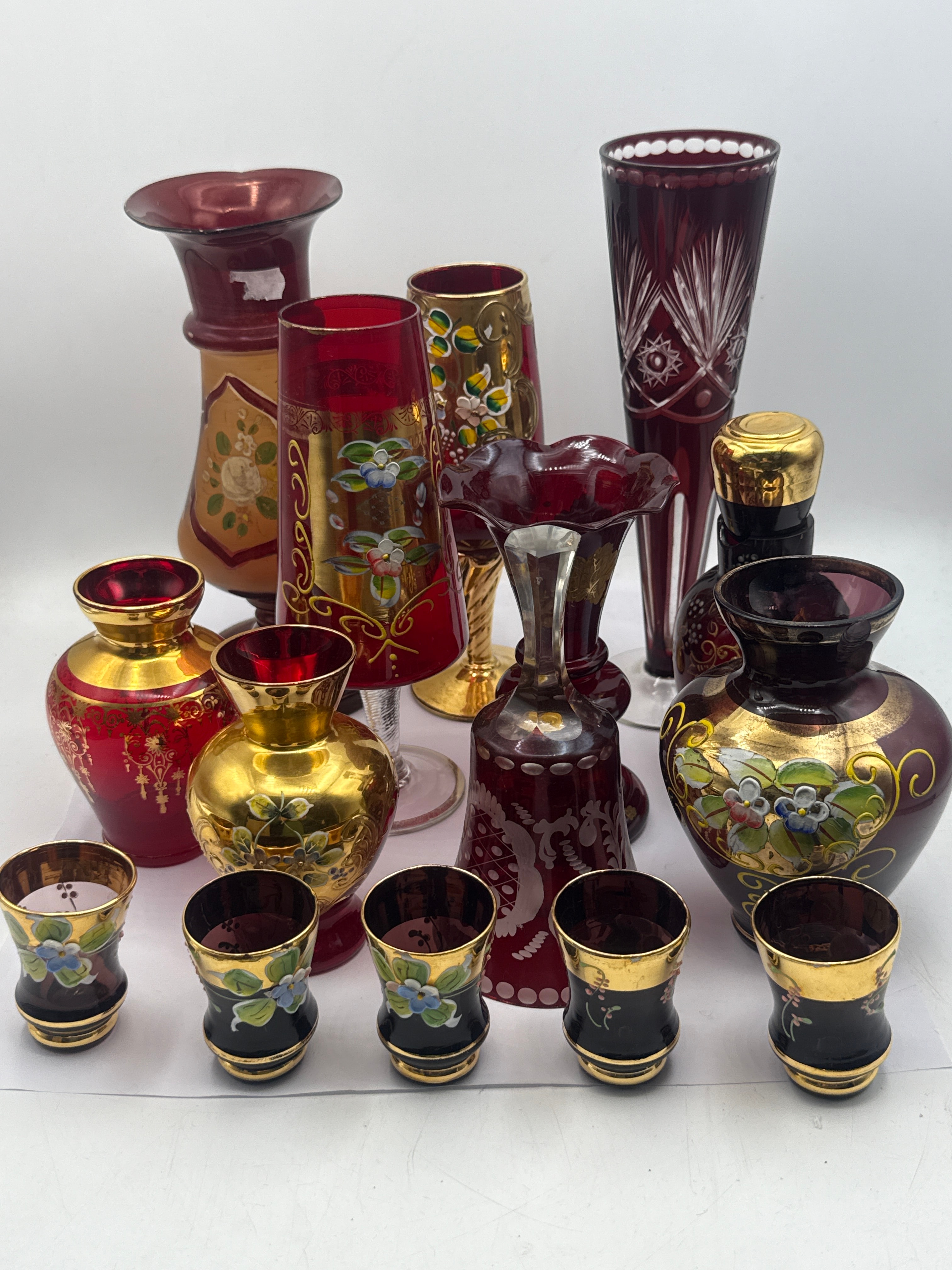 A collection of 16 Bohemian cranberry and polychrome enamel gilt glass vessels, comprising a variety of forms including vases, goblets, a bell, and tumblers/shot glasses. The predominant color is deep red (ruby/cranberry) glass, complemented by gold-colored, black, and a few beige-toned pieces. Decoration is elaborate, featuring extensive gilding in scrolling patterns and borders, frequently accented with polychrome enamel floral motifs, some appearing textured. Several pieces exhibit cut glass decoration, such as fluting and starbursts, particularly on the ruby-colored items. The overall aesthetic is consistent with 19th to early 20th-century Bohemian decorative styles.