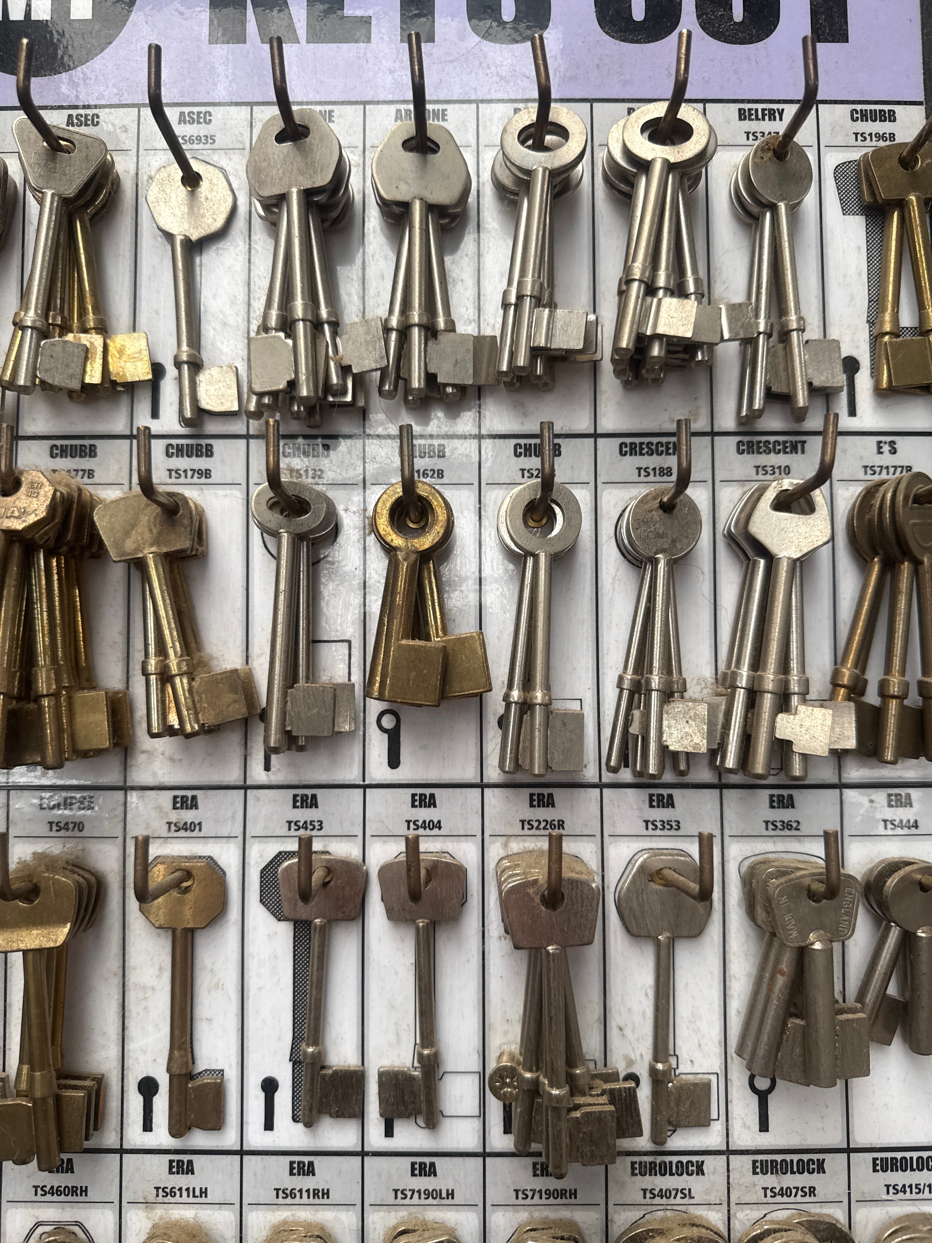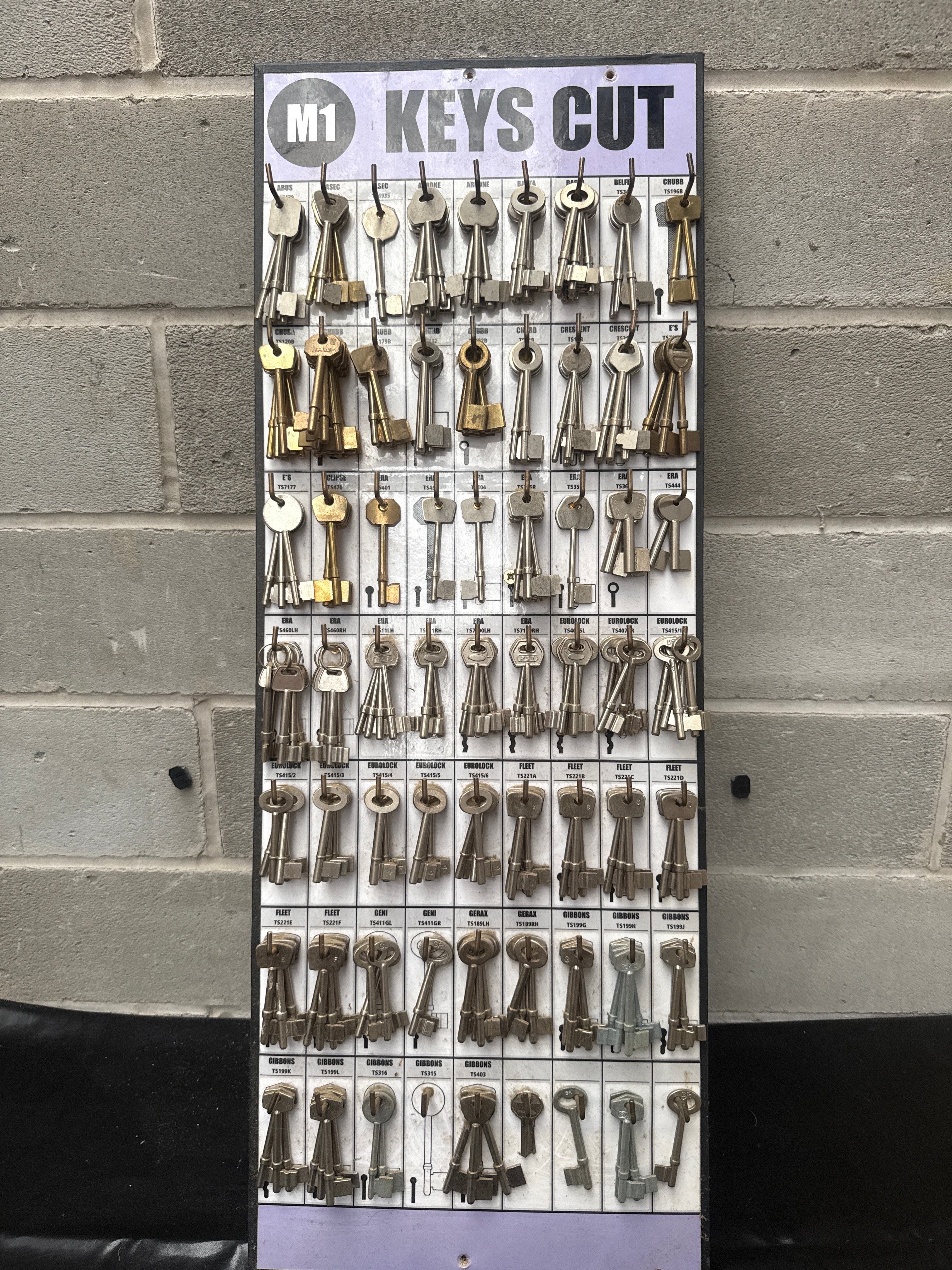 An M1 Mortice Key Blank Display Board, a rectangular commercial display board constructed from a rigid plastic or laminated material. It features multiple metal pegs from which a collection of numerous metal key blanks or samples are suspended, presented in a mix of brass-toned and silver-toned metals, often grouped. The board’s top section prominently displays ‘M1 KEYS CUT,’ clearly indicating its purpose. Below this, each key group is systematically labeled with manufacturer names such as ASEC, ARONE, BELFRY, CHUBB, CRESCENT, ERA, EUROLOCK, FLEET, and GIBBONS, alongside specific model or stock numbers (e.g., S6935, T5348, TS179B). Small keyhole diagrams and directional arrows are also printed on the surface, consistent with a retail environment.