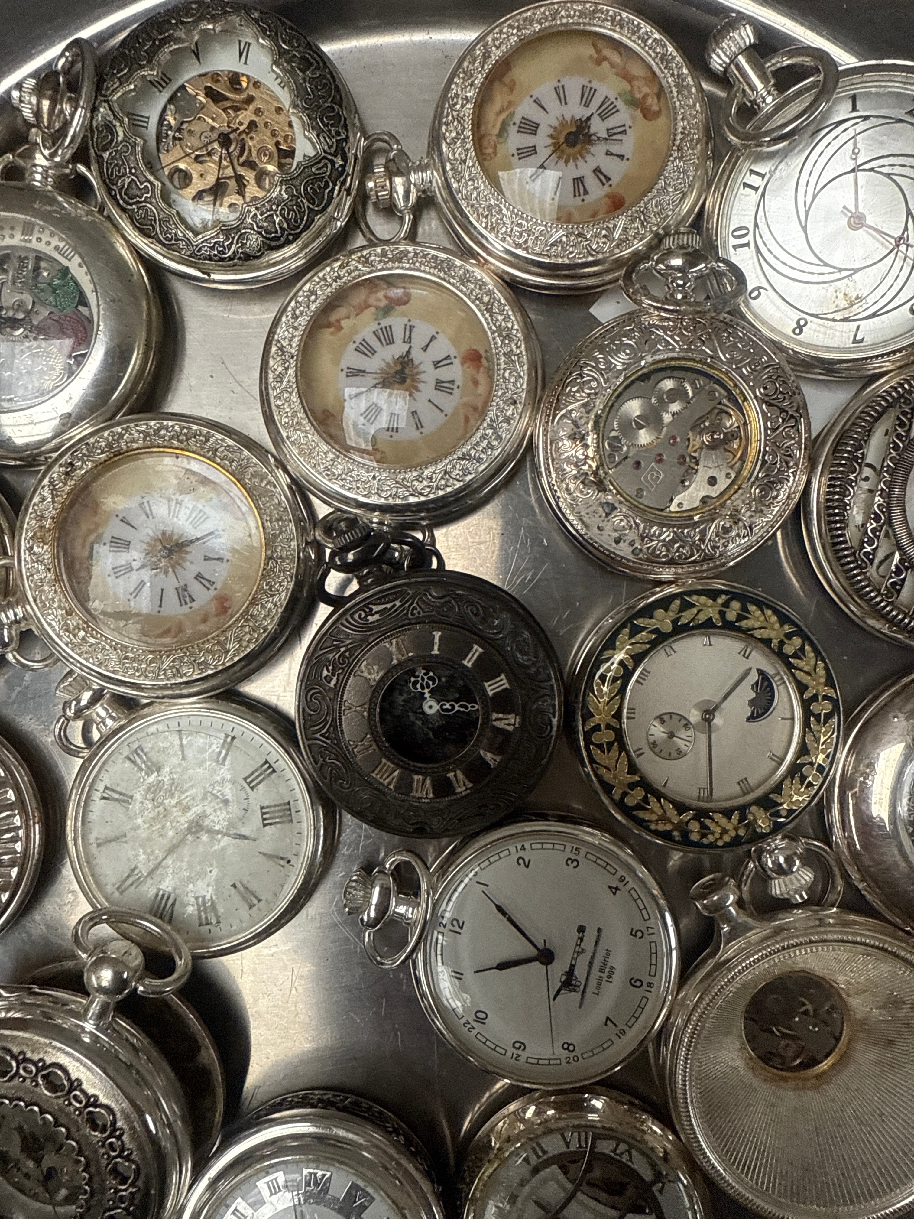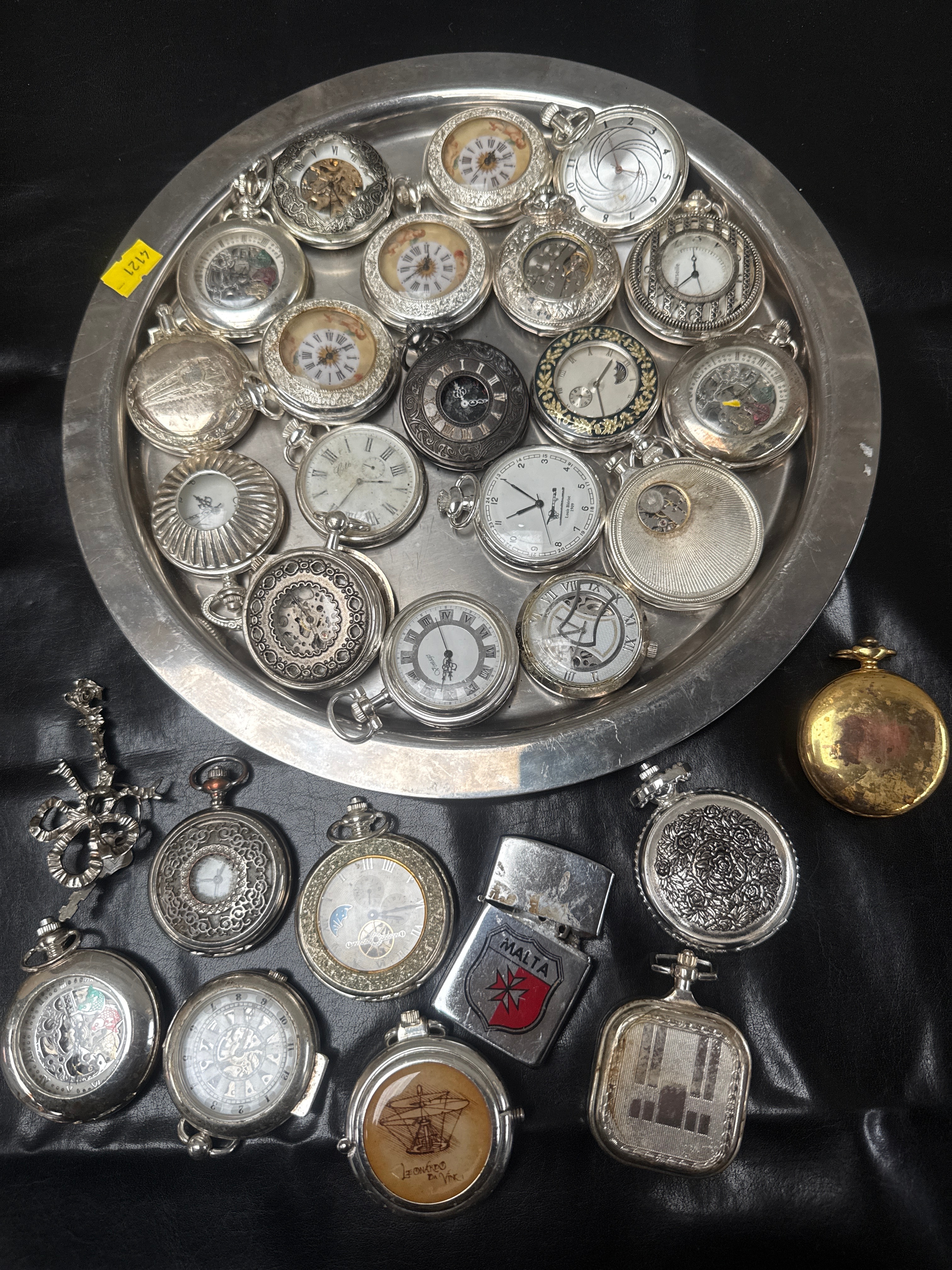 A collection of approximately thirty pocket watches, predominantly crafted from various silver-toned metals, with some exhibiting gold-toned accents. The watches display a range of decorative styles from intricate chasing and engraving to skeletonized movements and plainer designs, suggesting a period spanning from the late 19th to mid-20th century or later. Dials feature a mix of Roman and Arabic numerals, with some incorporating decorative elements such as moon phases. Specific examples include one watch commemorating “Louis Braille 1809 1852” and another featuring a sailing ship illustration and the word “MALTA” on its dial. Accompanying the watches are a pocket watch chain/fob and a Zippo-style lighter marked “MALTA” with a Maltese cross emblem. A yellow sticker displaying “247” or “1247” is visible on the tray.