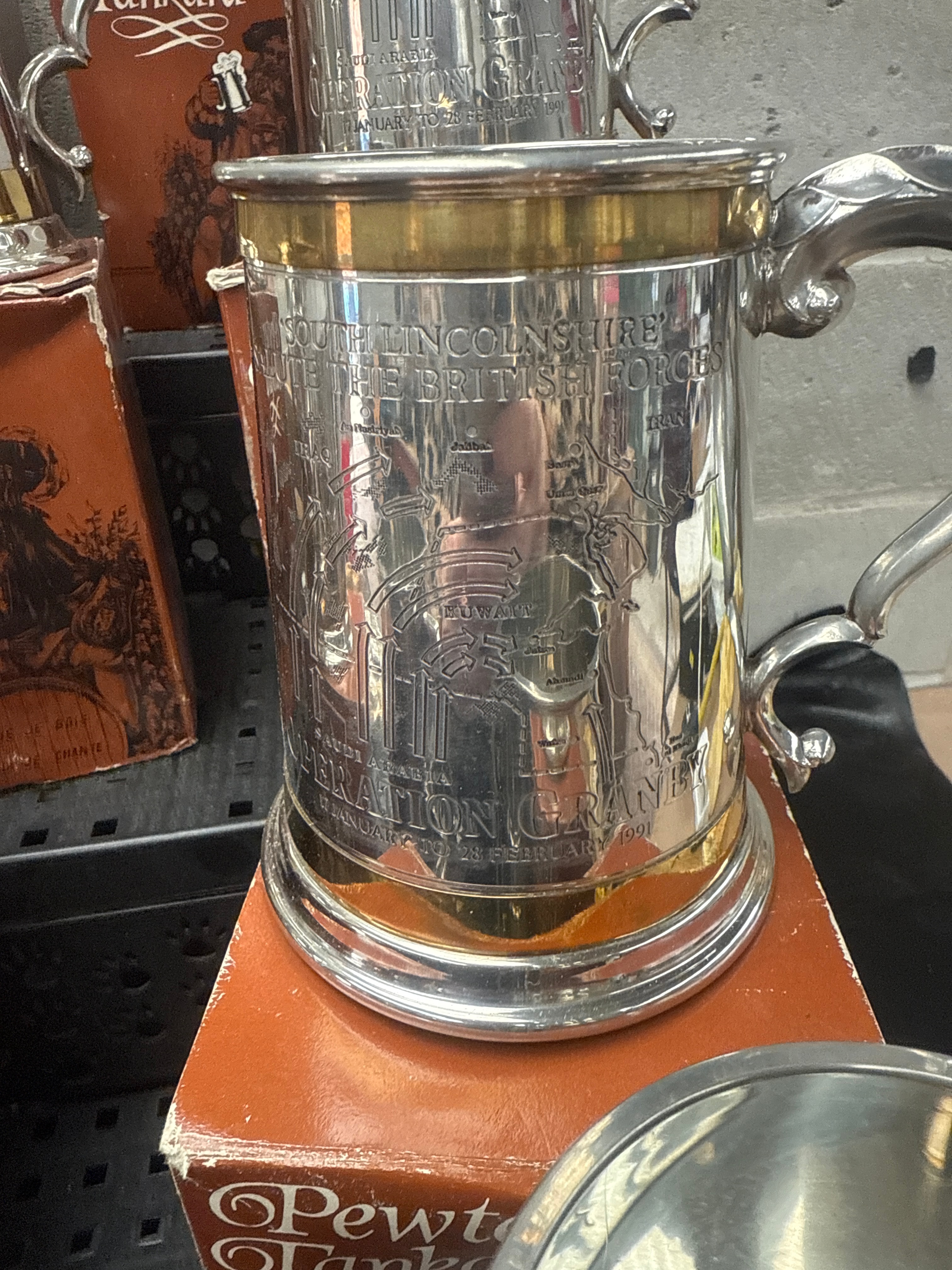 A collection of eight English pewter tankards. Each tankard features a classic pub mug shape with a C-scroll handle and a flared base. Several examples incorporate a gold-colored band around the rim. The tankards are elaborately engraved with commemorative text and a map, specifically referencing ‘SOUTH LINCOLNSHIRE SALUTES THE BRITISH FORCES,’ ‘IRAQ,’ ‘KUWAIT,’ ‘SAUDI ARABIA,’ and details of ‘OPERATION GRANBY, 15 JANUARY TO 28 FEBRUARY 1991.’ Many are presented within their original brown and black cardboard boxes, which clearly state ‘Finest Hand Made English Pewter’ and ‘Guaranteed free from Lead.’ The items are confirmed to be made of pewter.