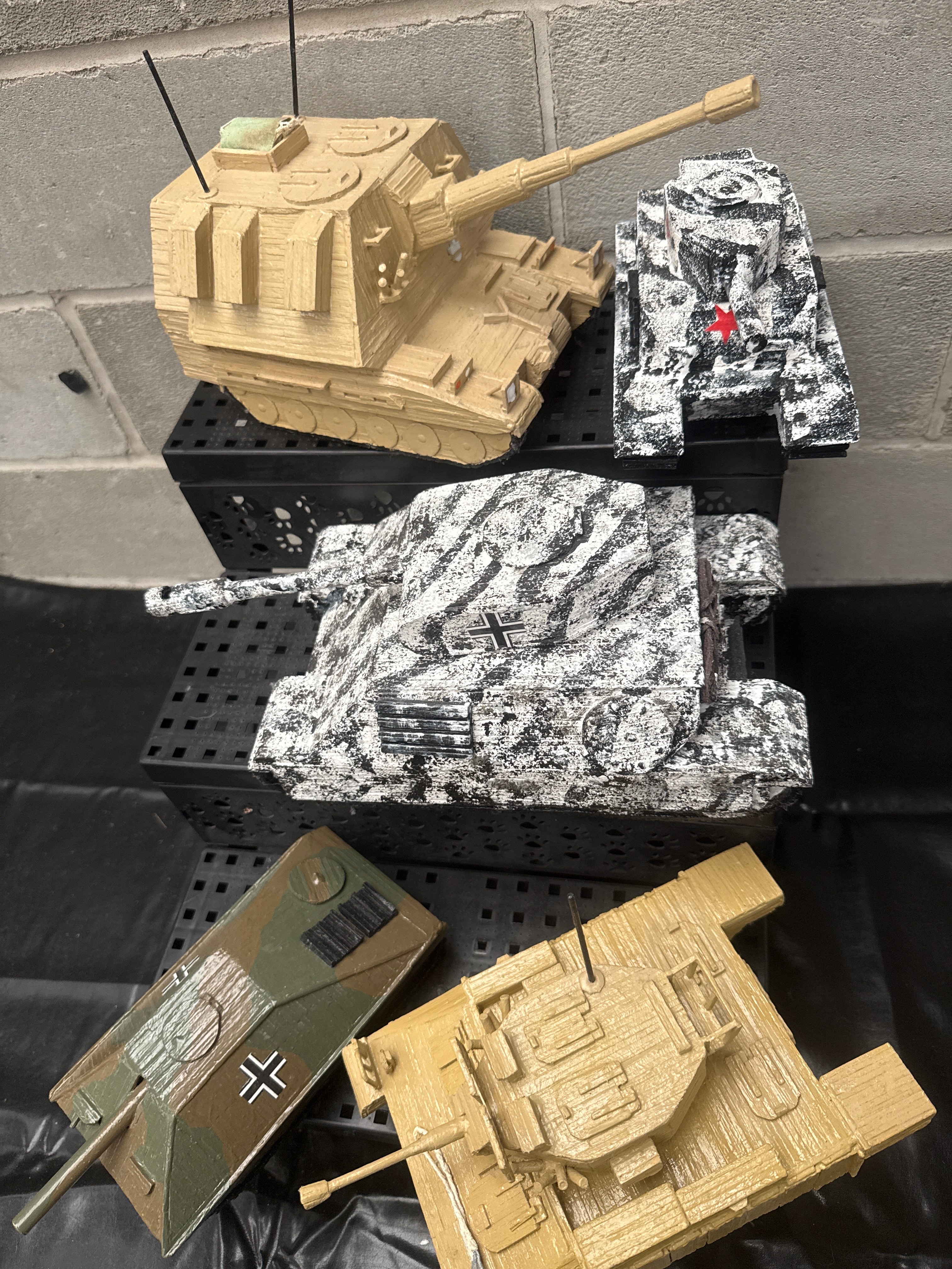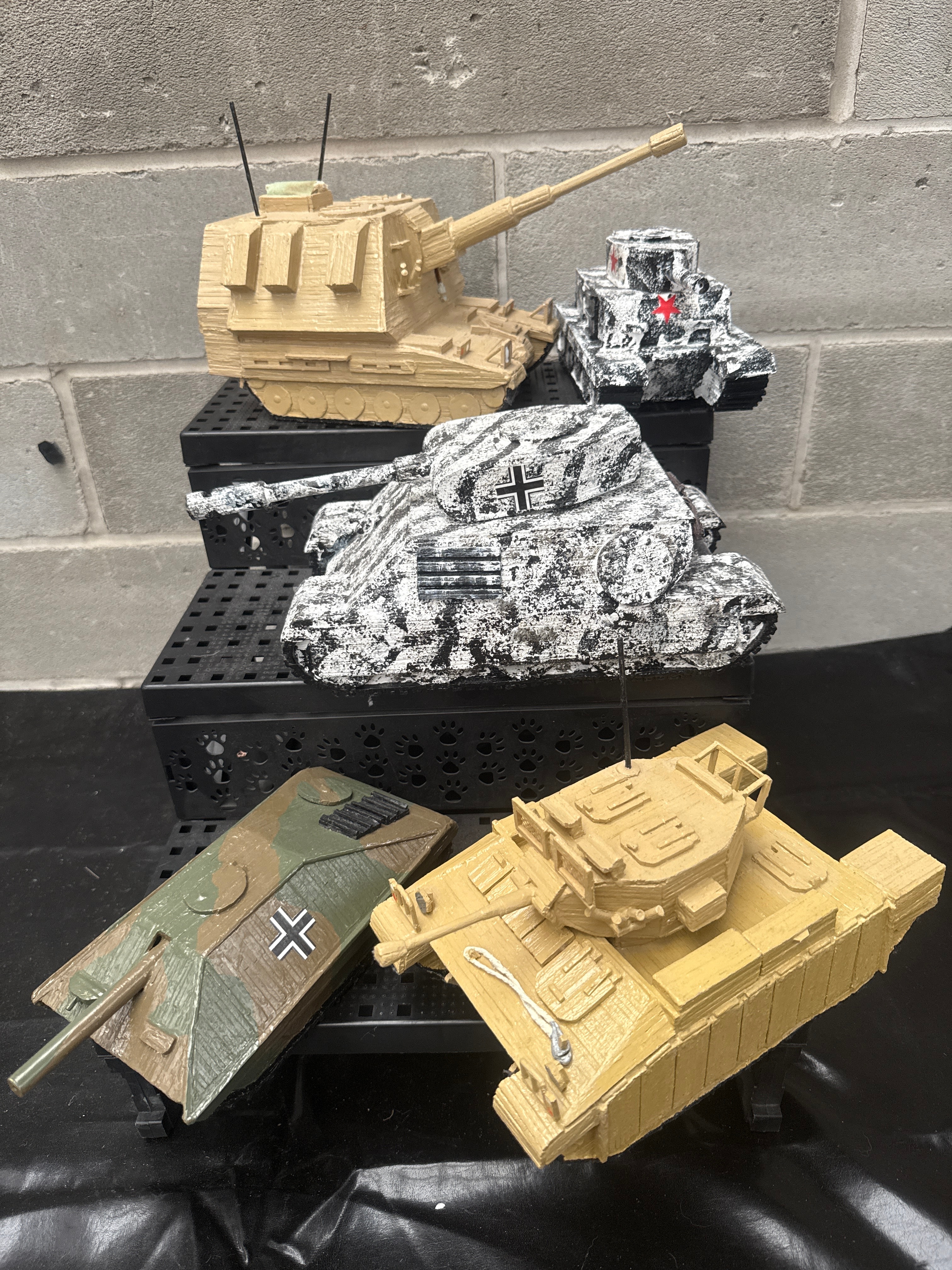 A group of five Risopen 1/72 scale military tank models, depicting various World War II armored vehicles. The models are likely 3D printed from plastic, exhibiting visible layer lines. They are finished in different camouflage patterns including solid tan, green/brown, and black-and-white mottled designs. Visible markings include a black ‘Iron Cross’ (Balkenkreuz) symbol on two models, associated with German forces, and a red ‘Red Star’ symbol on one smaller tank, associated with Soviet forces.
