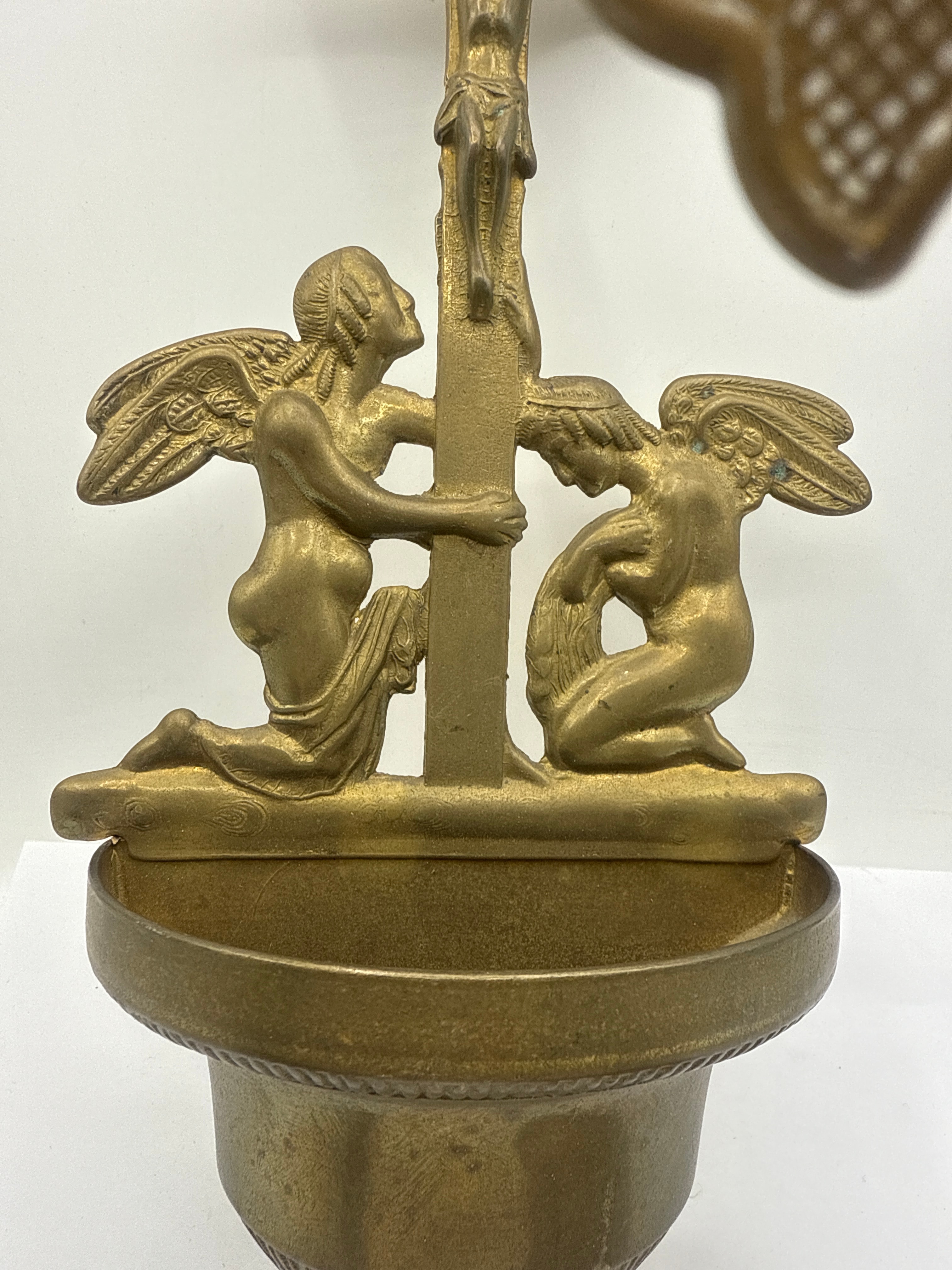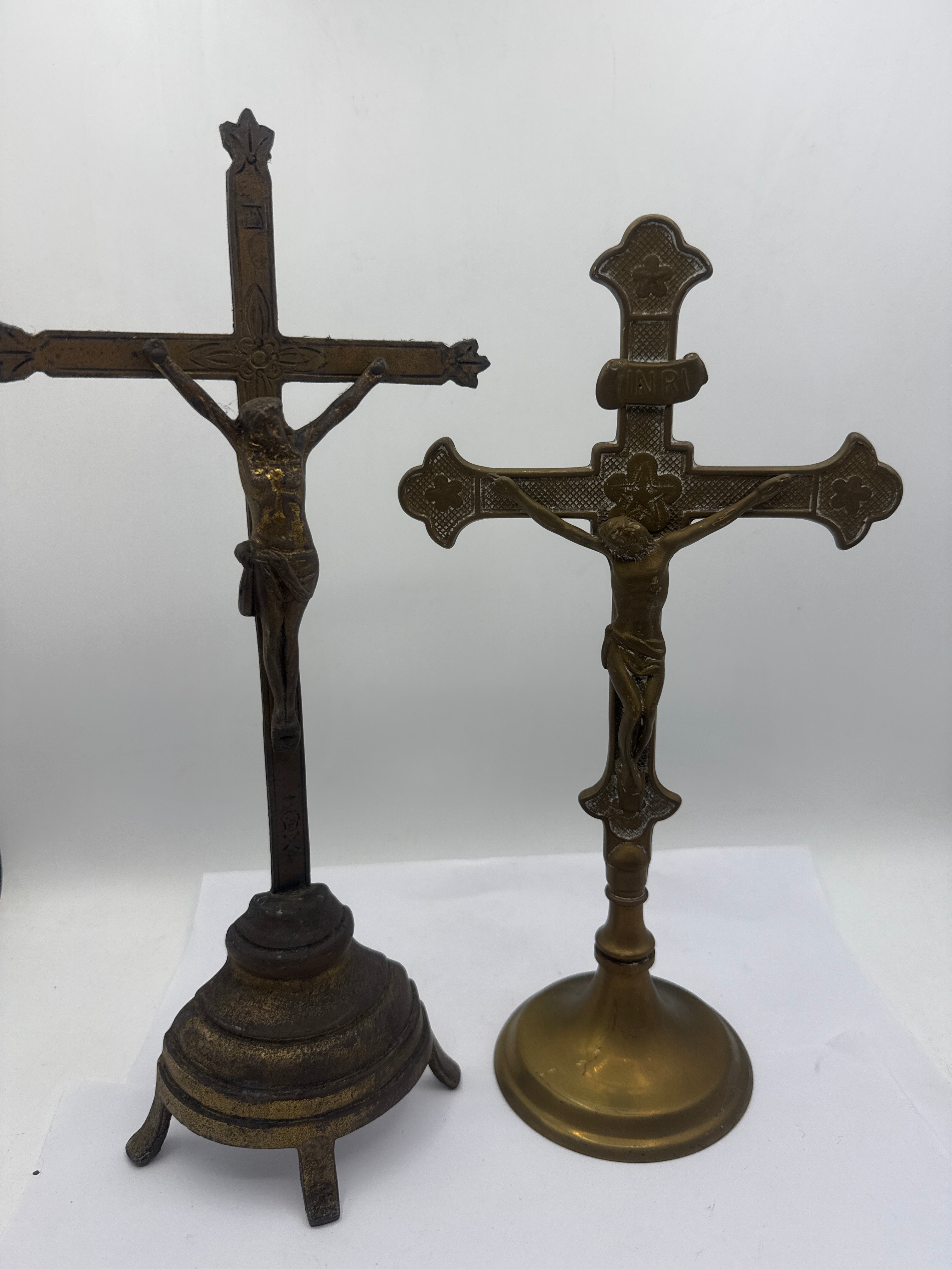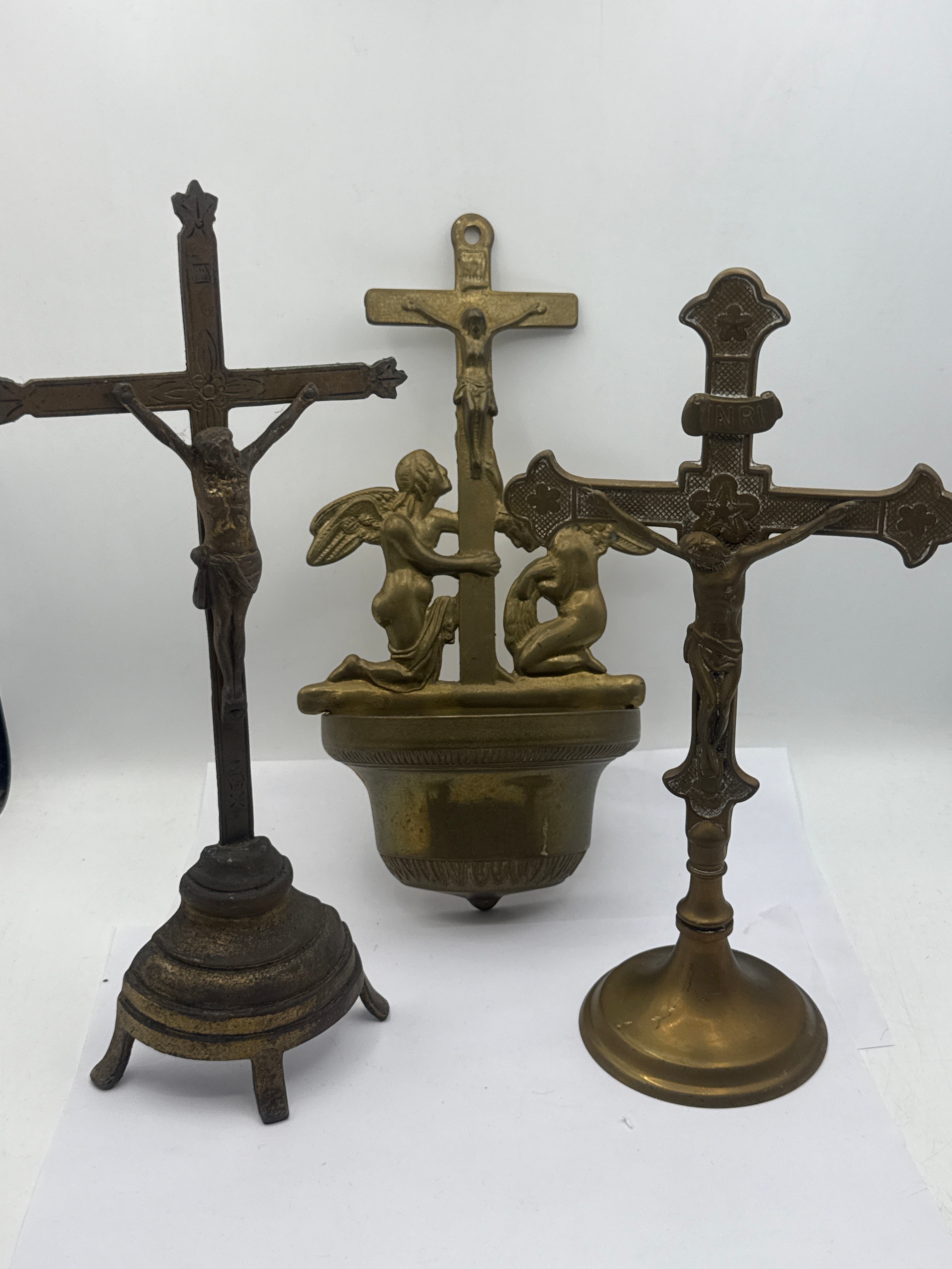 This lot comprises three religious devotional objects, all cast in brass or bronze with varying patinas indicative of age. The collection includes two standing crucifixes, each featuring a Corpus Christi figure; one displays a three-footed base with a dark, heavy patination, while the other stands on a round base with a lighter, more golden hue and bears the inscription “INRI” (Latin for “Jesus of Nazareth, King of the Jews”) above the corpus. The third item is a wall-mounted holy water font, distinguished by a central crucifix with Corpus Christi flanked by two kneeling winged angels positioned above a bowl-shaped reservoir.