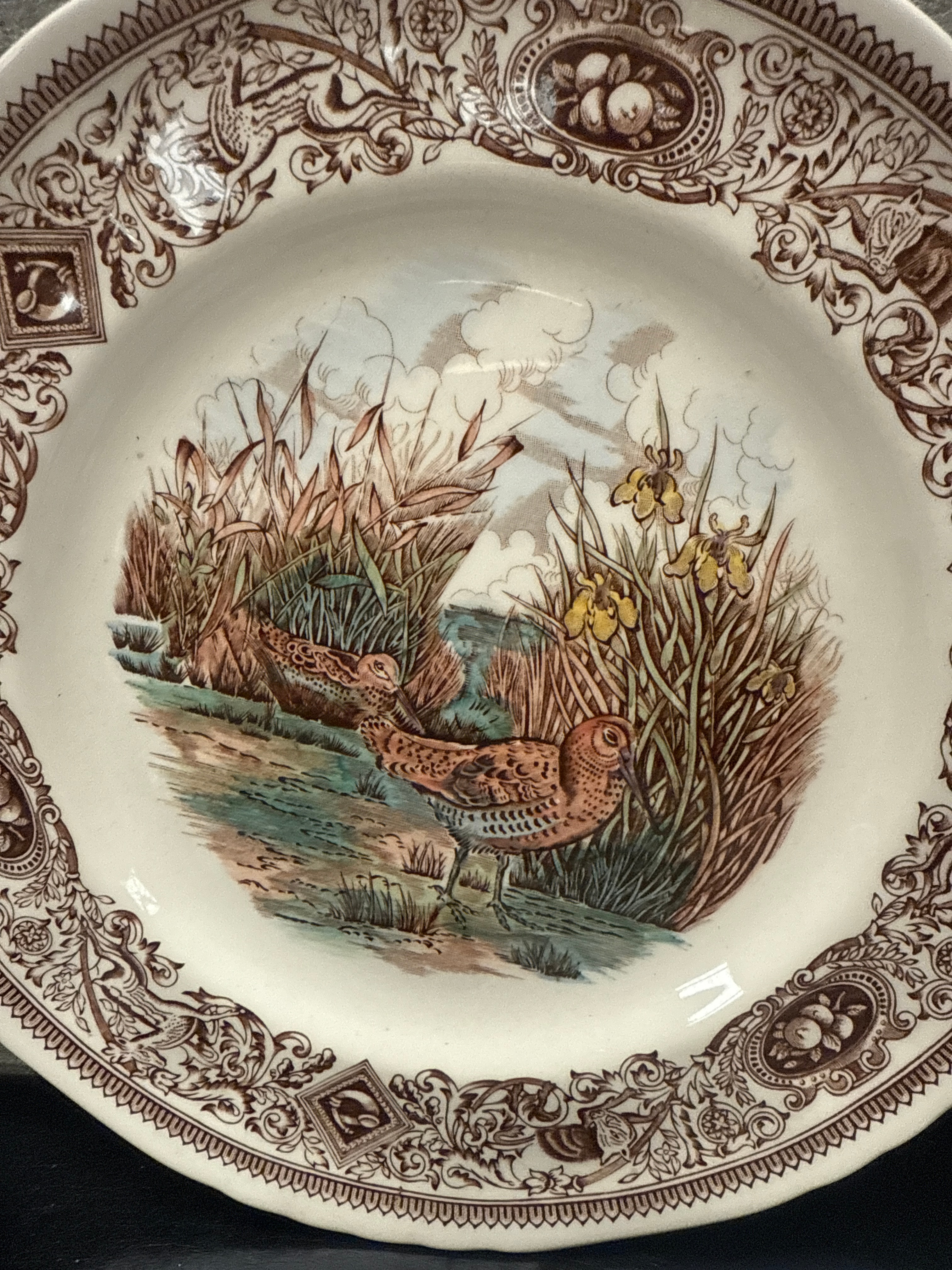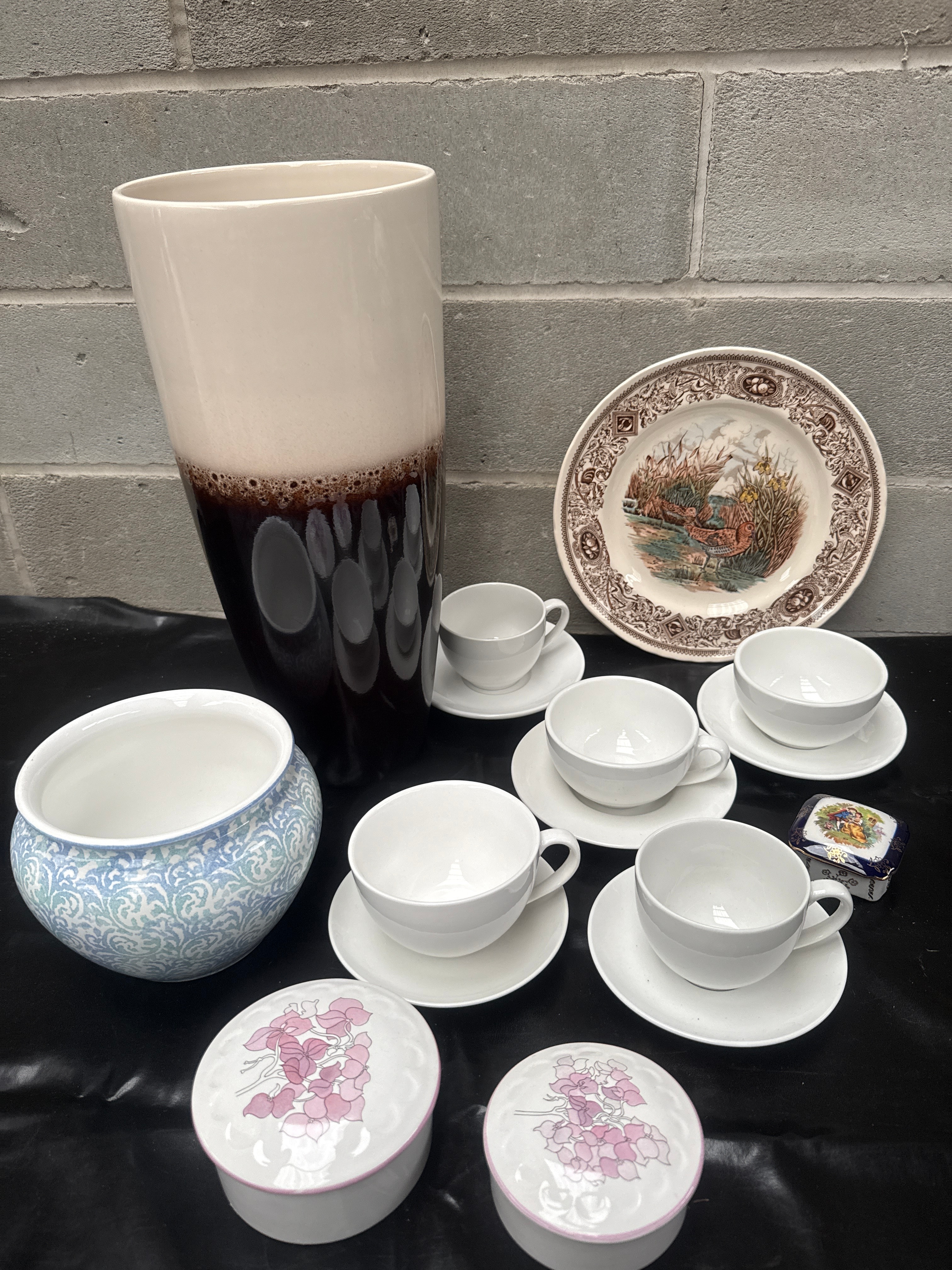This lot presents an assortment of ceramic and porcelain items. It features a tall, cylindrical vase with a two-tone cream and dark brown drip glaze; a footed bowl decorated with a continuous light blue foliate pattern on white; and multiple sets of plain white teacups and saucers, likely porcelain. A decorative earthenware plate displays a central transferware scene of two game birds in a marshy landscape with yellow irises, framed by an intricate brown scroll and cartouche border. The collection is completed by two round lidded boxes adorned with pink floral designs and one small rectangular dark blue lidded box featuring a miniature polychrome scene on its top.