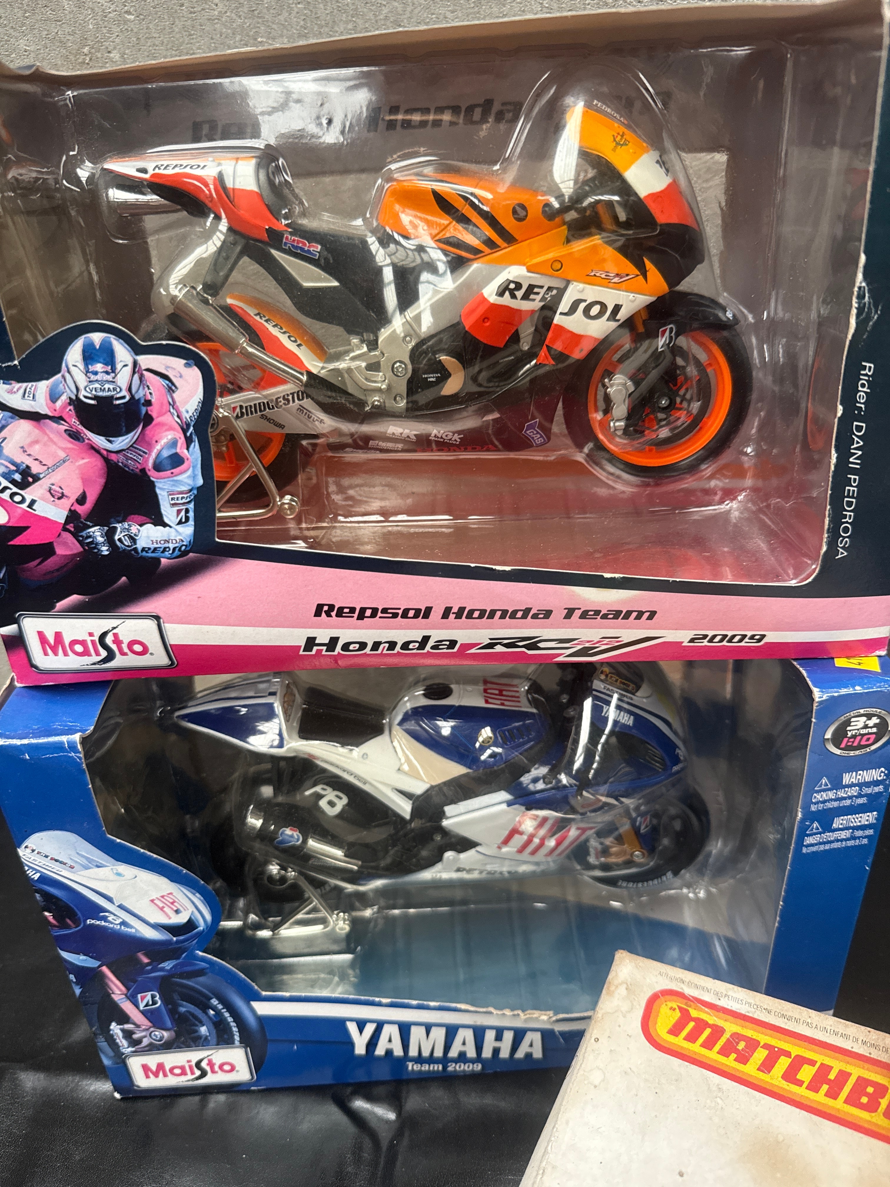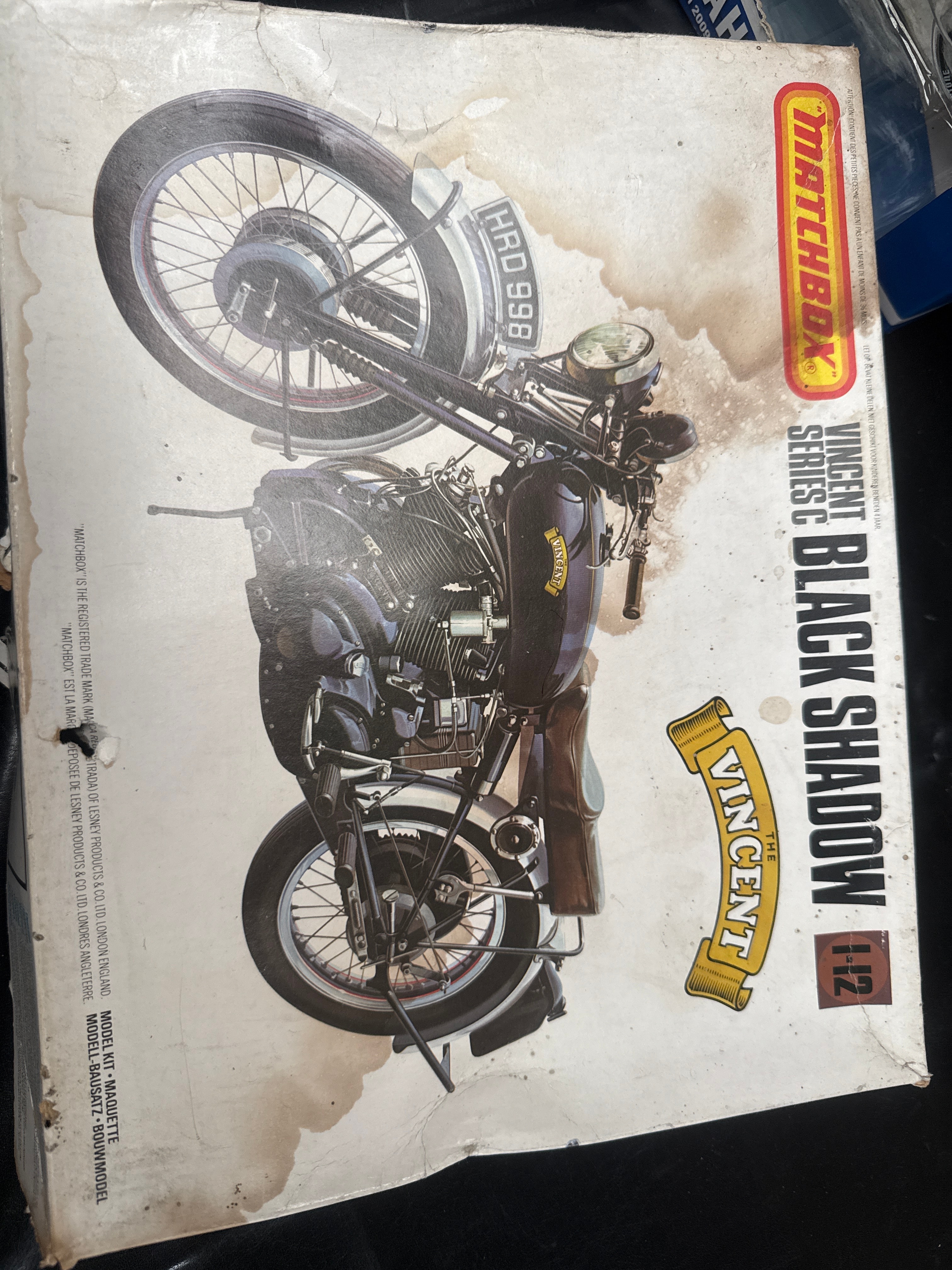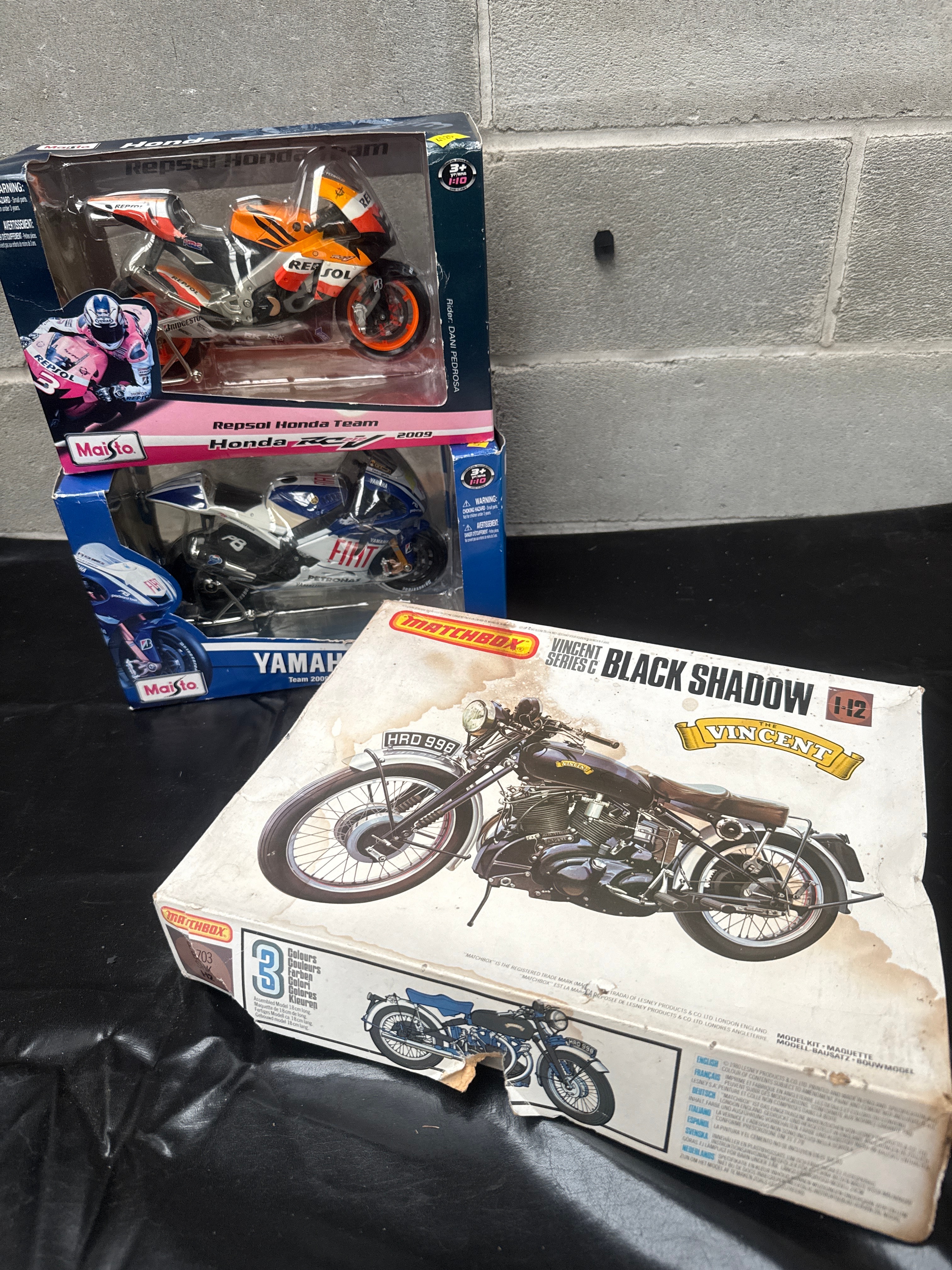 A Matchbox 1:12 scale model kit for a ‘VINCENT Series C BLACK SHADOW’ motorcycle, as depicted on the box art with license plate ‘HRO 998’. The box also displays ‘MODEL KIT – MAQUETTE MODEL – BAUSATZ – BOUWMODEL’. Also included are two factory-assembled Maisto die-cast model motorcycles from ‘Team 2009’: a Repsol Honda RC212V with rider Dani Pedrosa, and a Yamaha featuring ‘FIAT’ branding.