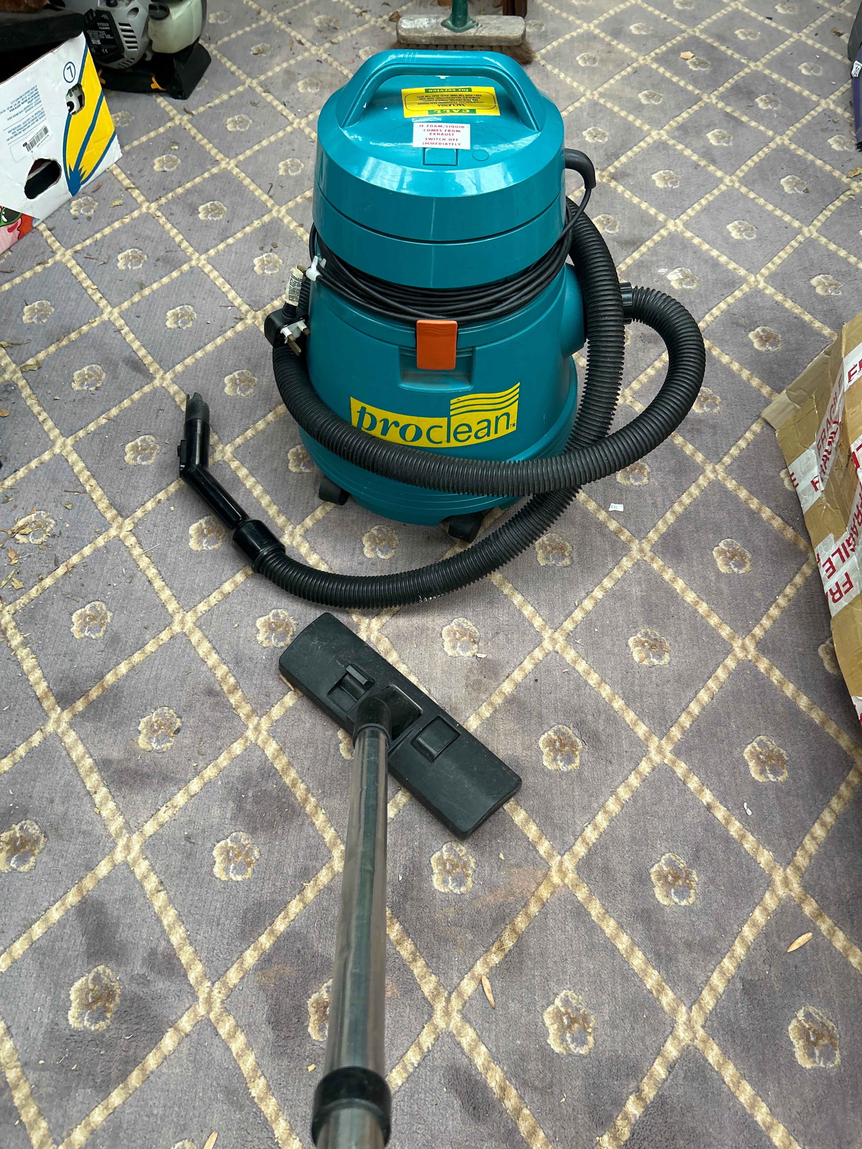 A ‘proclean’ industrial or commercial-style wet/dry vacuum cleaner, of modern period manufacture. The appliance is teal-colored, primarily constructed from plastic, featuring a cylindrical body with a top-mounted integrated handle. It includes a black corrugated hose, an articulated black plastic nozzle, and a metal extension wand. A yellow service label for ‘VACLENT’ with a Manchester, UK address and phone number is present on the top surface, alongside a red and white warning label stating, “IF FOAM/LIQUID COMES FROM EXHAUST SWITCH OFF IMMEDIATELY.” The item is offered in working order.