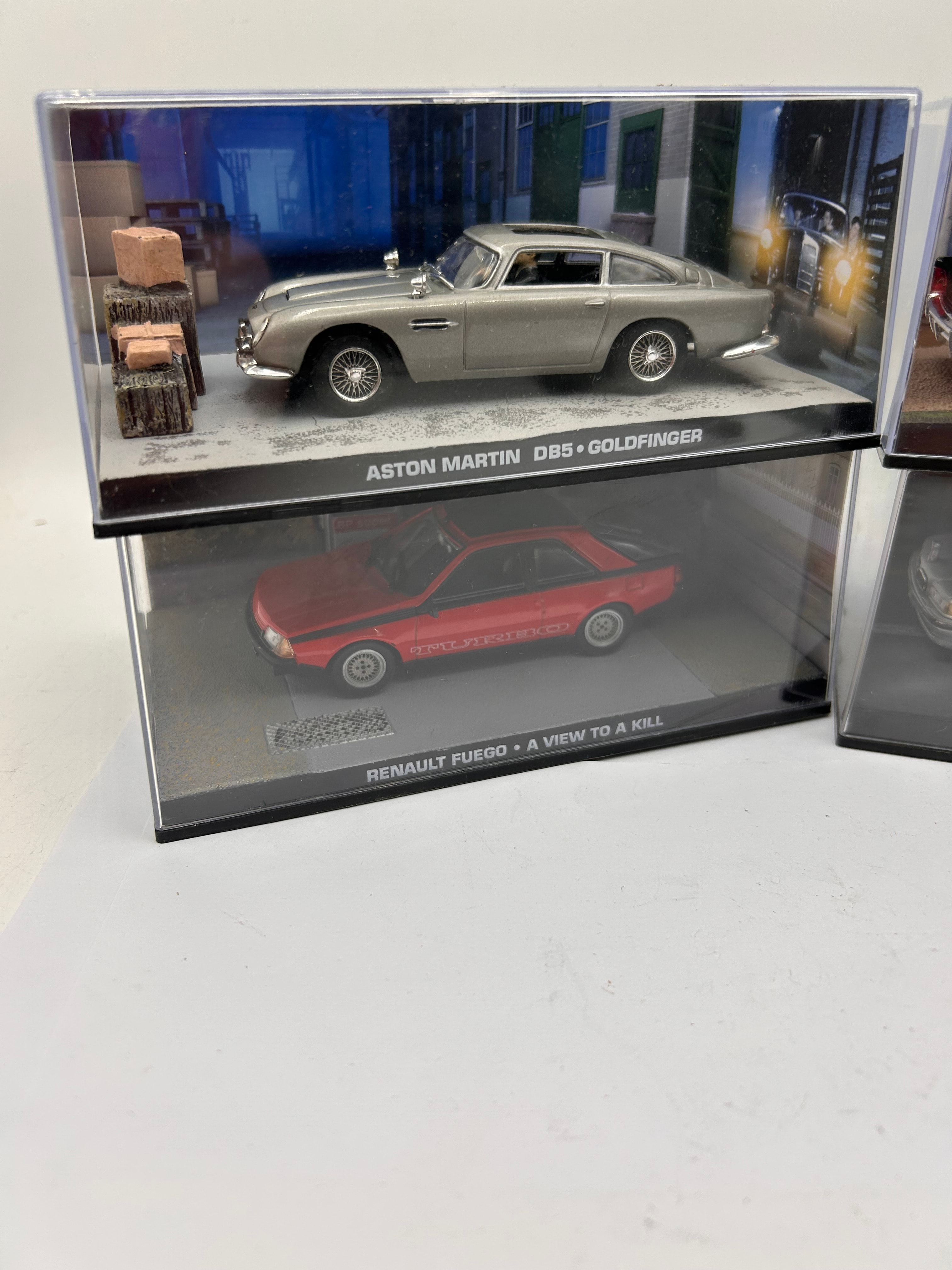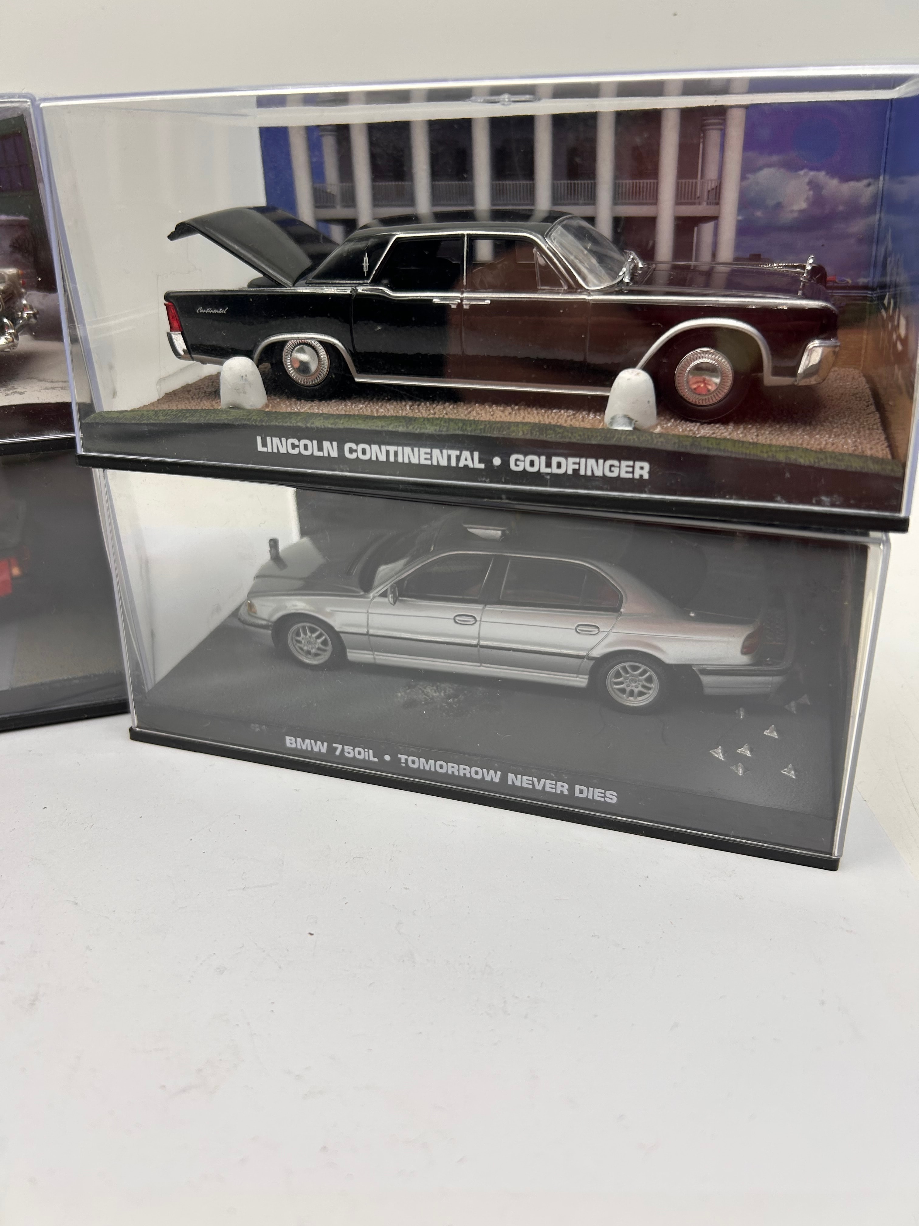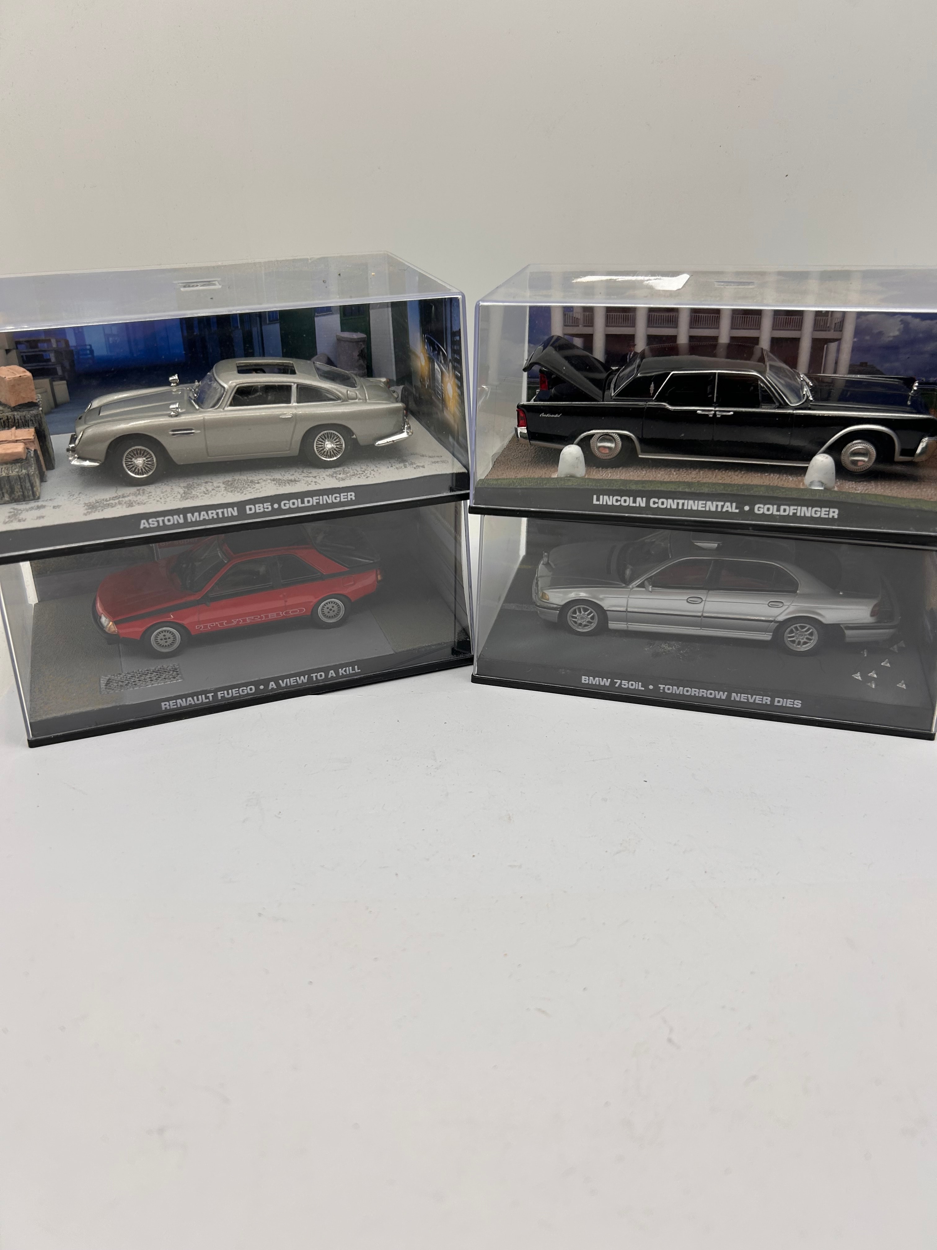 A collection of four Fabbri James Bond 007 1:43 scale die-cast model cars, each presented in a clear acrylic display case with a themed diorama base. The models include a silver Aston Martin DB5, a red Renault Fuego, a black Lincoln Continental, and a silver BMW 750iL. Each case base is marked with the car’s make and model, along with an associated James Bond film title and “007 FACT FILES”, specifically: “ASTON MARTIN DB5 • GOLDFINGER”, “RENAULT FUEGO • A VIEW TO A KILL”, “LINCOLN CONTINENTAL • GOLDFINGER”, and “BMW 750iL • TOMORROW NEVER DIES”. The models are constructed from die-cast metal and plastic components, while the display cases are acrylic with plastic bases.