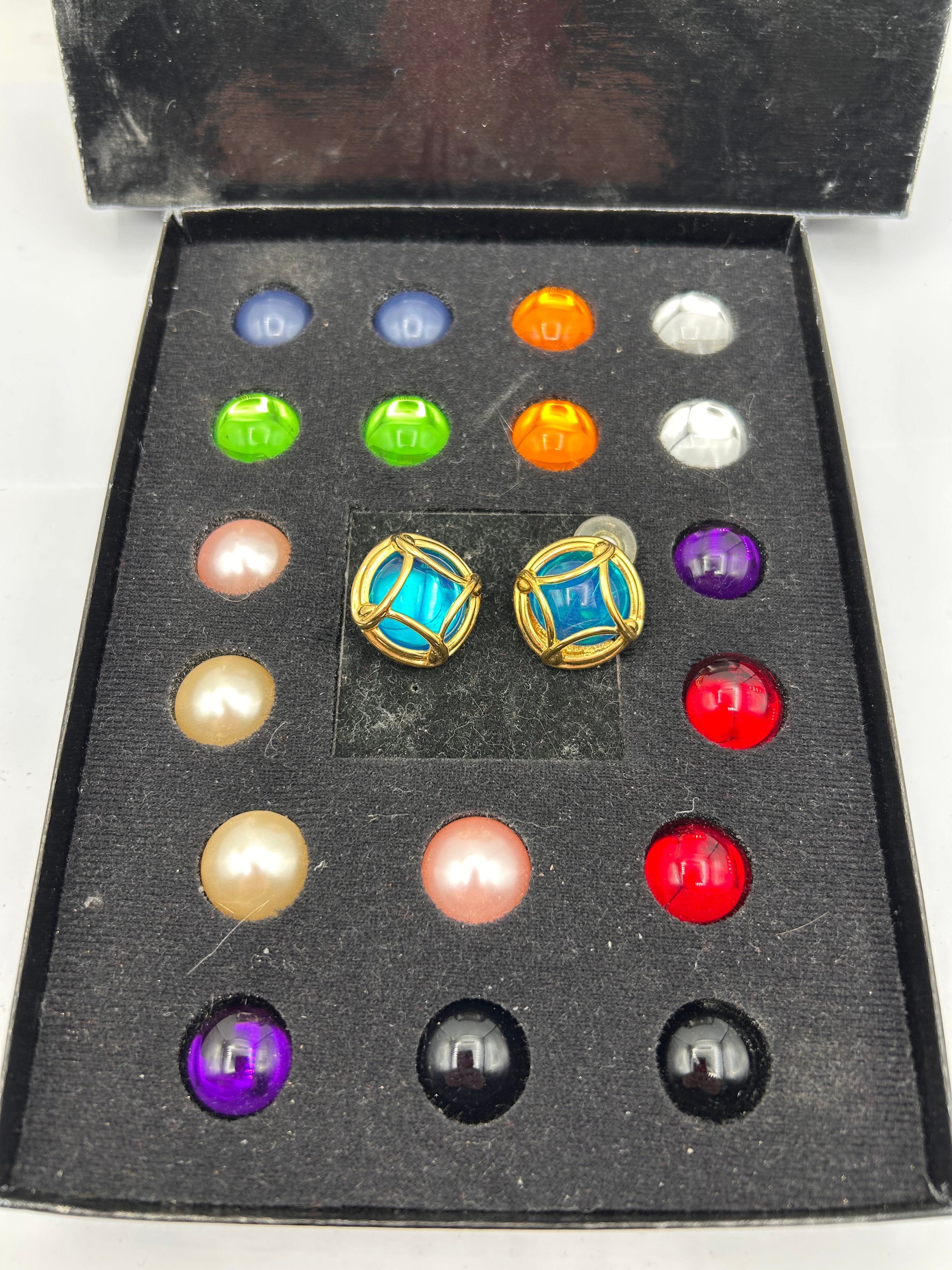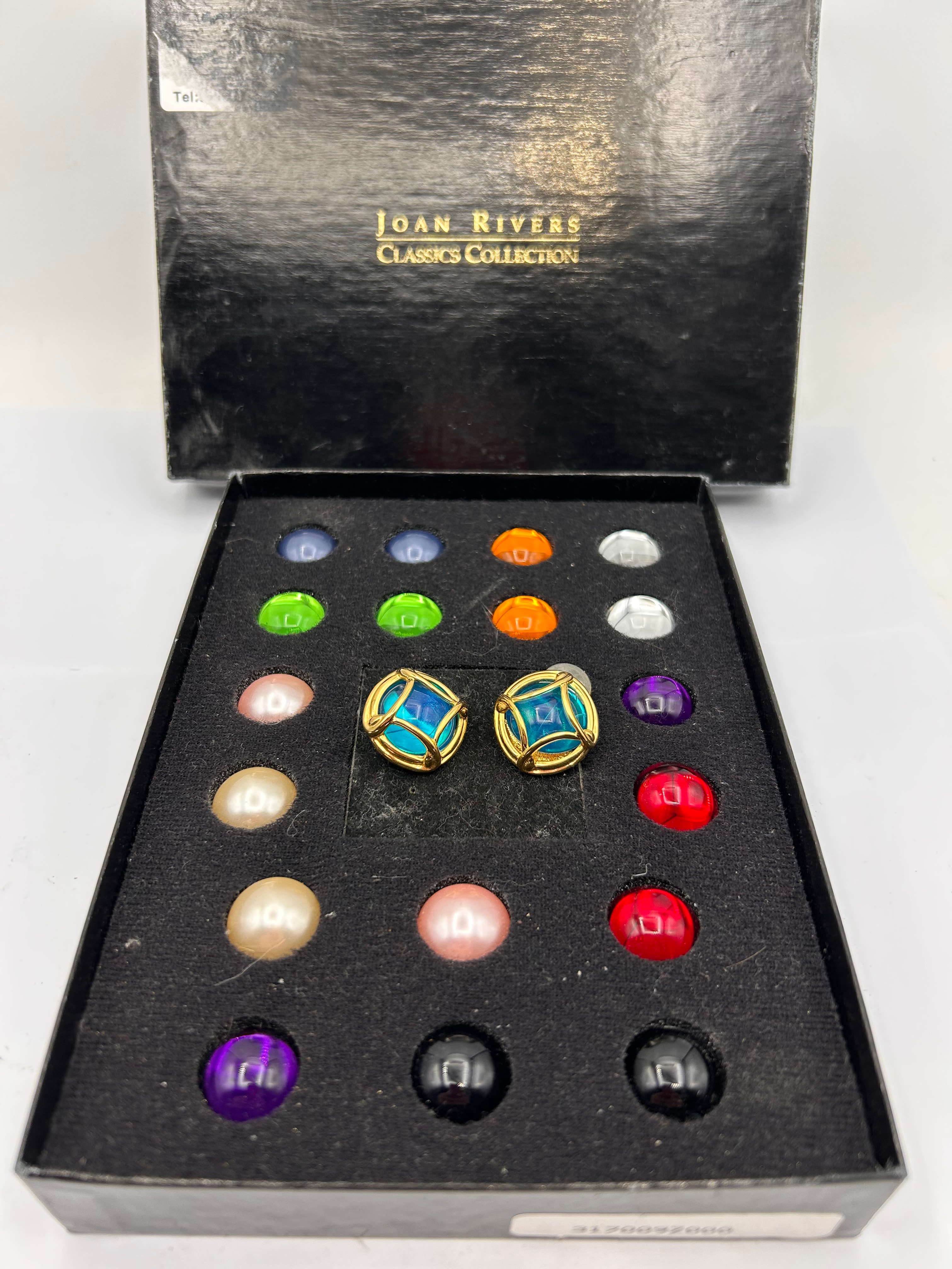 A Joan Rivers Classics Collection Interchangeable Earring Set, comprising a pair of gold-tone metal clip-on or post-back earrings, featuring a decorative cage design, currently fitted with blue cabochon stones. The set is presented in its original black hinged box, bearing the ‘JOAN RIVERS CLASSICS COLLECTION’ brand name in gold text. Inside, a black velvet-lined insert securely holds the two earrings and twenty additional interchangeable cabochon stones. The collection of stones includes a variety of colors: various shades of blue, green, orange, white/clear, pink, cream, red, purple, and black.