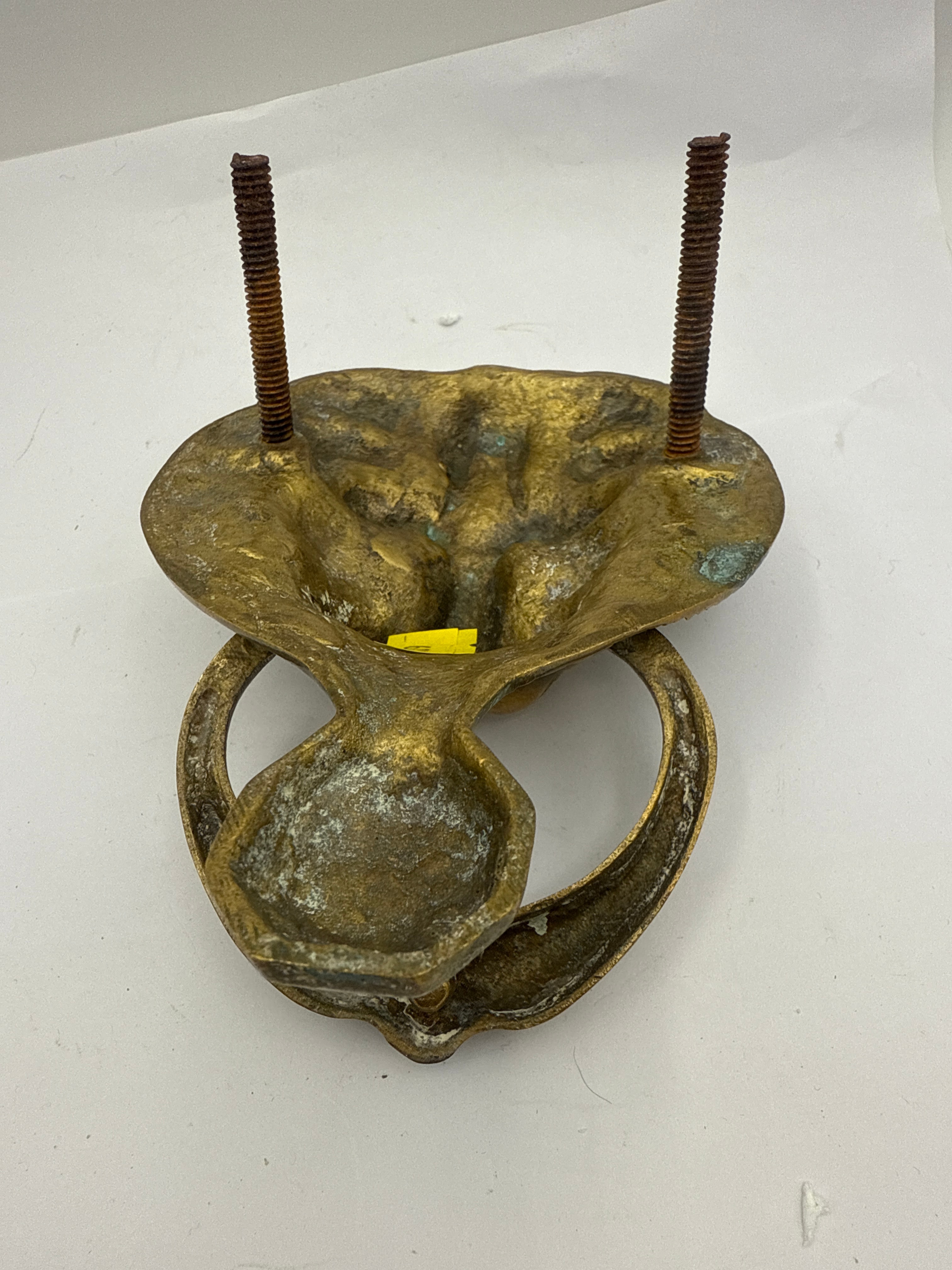 A cast metal door knocker, featuring a stylized lion’s head with a flowing mane, and a heavy hinged ring that strikes a lower plate. The item appears to be made of brass or bronze.