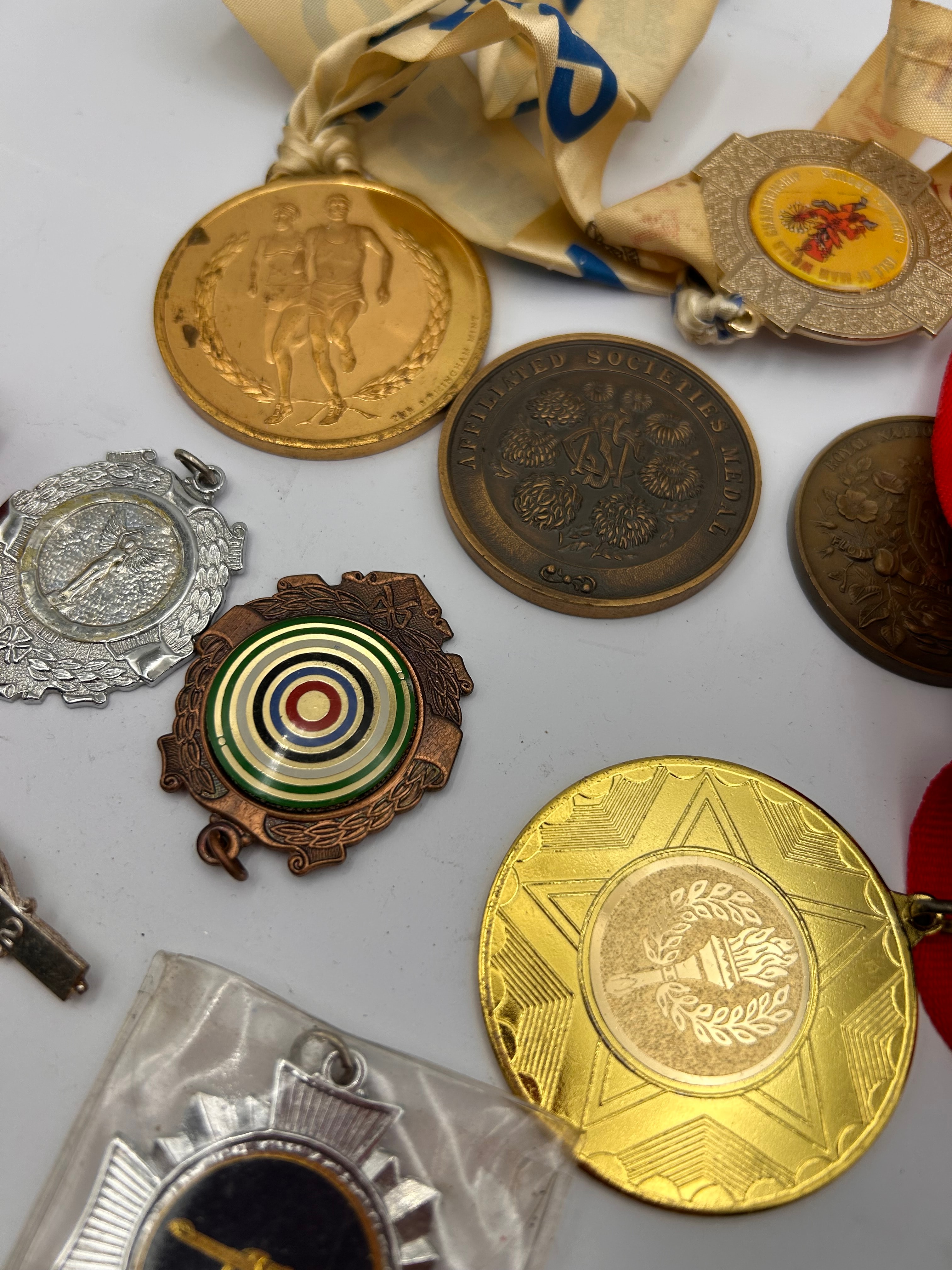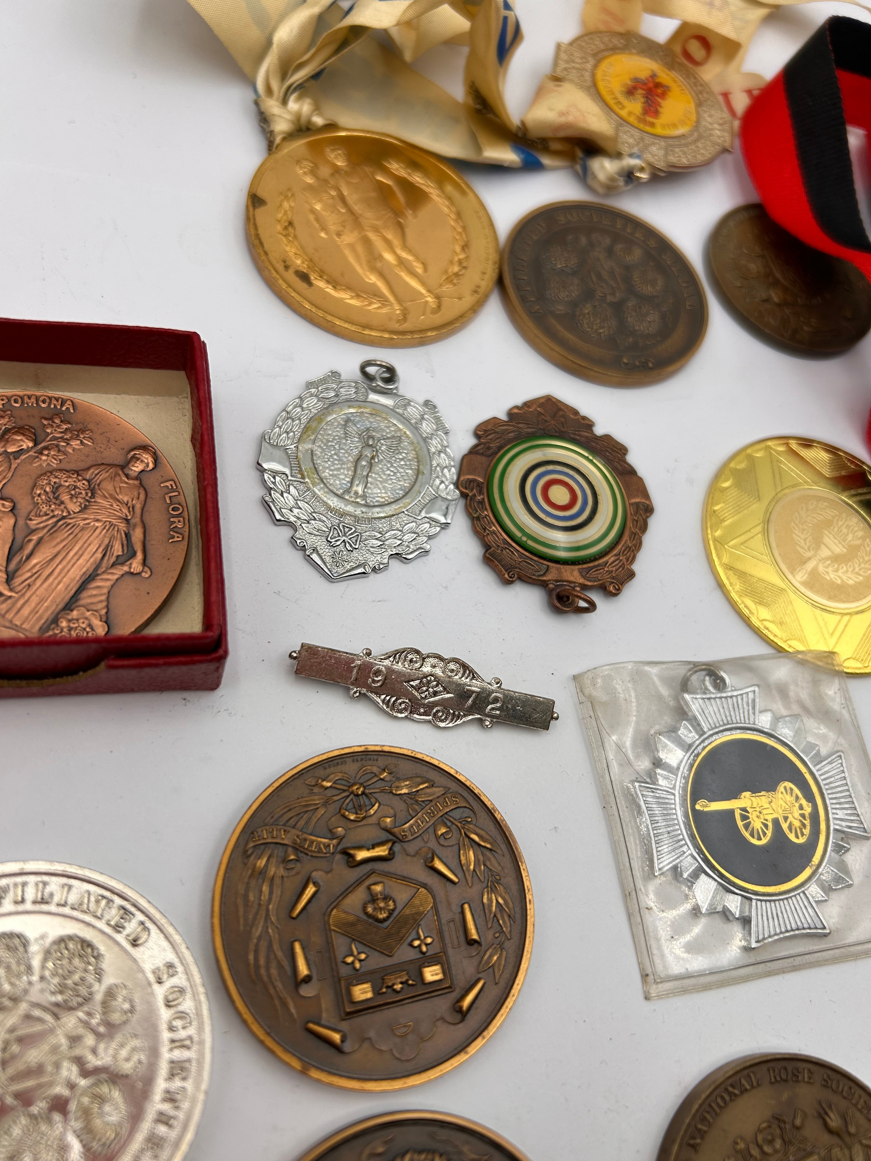 A mixed lot comprising approximately fifteen medals/medallions and one small brooch. The items are primarily constructed from various metals including bronze, brass, and silver- or gold-toned alloys, with one medal featuring multi-colored enamel or paint. Several are accompanied by fabric ribbons, some bearing visible text such as “SPORT CLUB” and “ASSN.” Styles and themes are diverse, ranging from athletic figures and floral motifs (with visible text including “POMONA,” “FLORA,” and “ASSN. NATIONAL ROSE SOCIETY” and dates “1902,” “1903”) to organizational insignia, a target design, and a military-themed piece depicting a cannon with visible dates “1879” and “1936.” One medal is presented in a red box, and another in a clear plastic sleeve.
