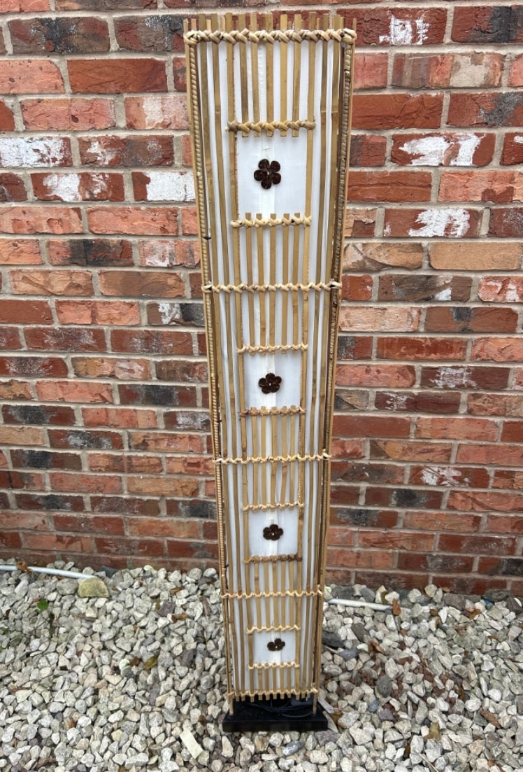 This tall, rectangular columnar floor lamp exhibits an East Asian or organic-modern style. It is primarily constructed from numerous thin, Thai bamboo or reed sticks, meticulously woven and lashed together to form its frame, enclosing an internal translucent diffusing material, likely fabric or paper. The front face features five vertically aligned, dark, floral-shaped decorative elements, likely carved wood or a natural material. A darker, twisted natural material is integrated along one vertical edge of the lamp. The base is dark and appears to be made of wood or a similar solid material. No visible text or markings are apparent.