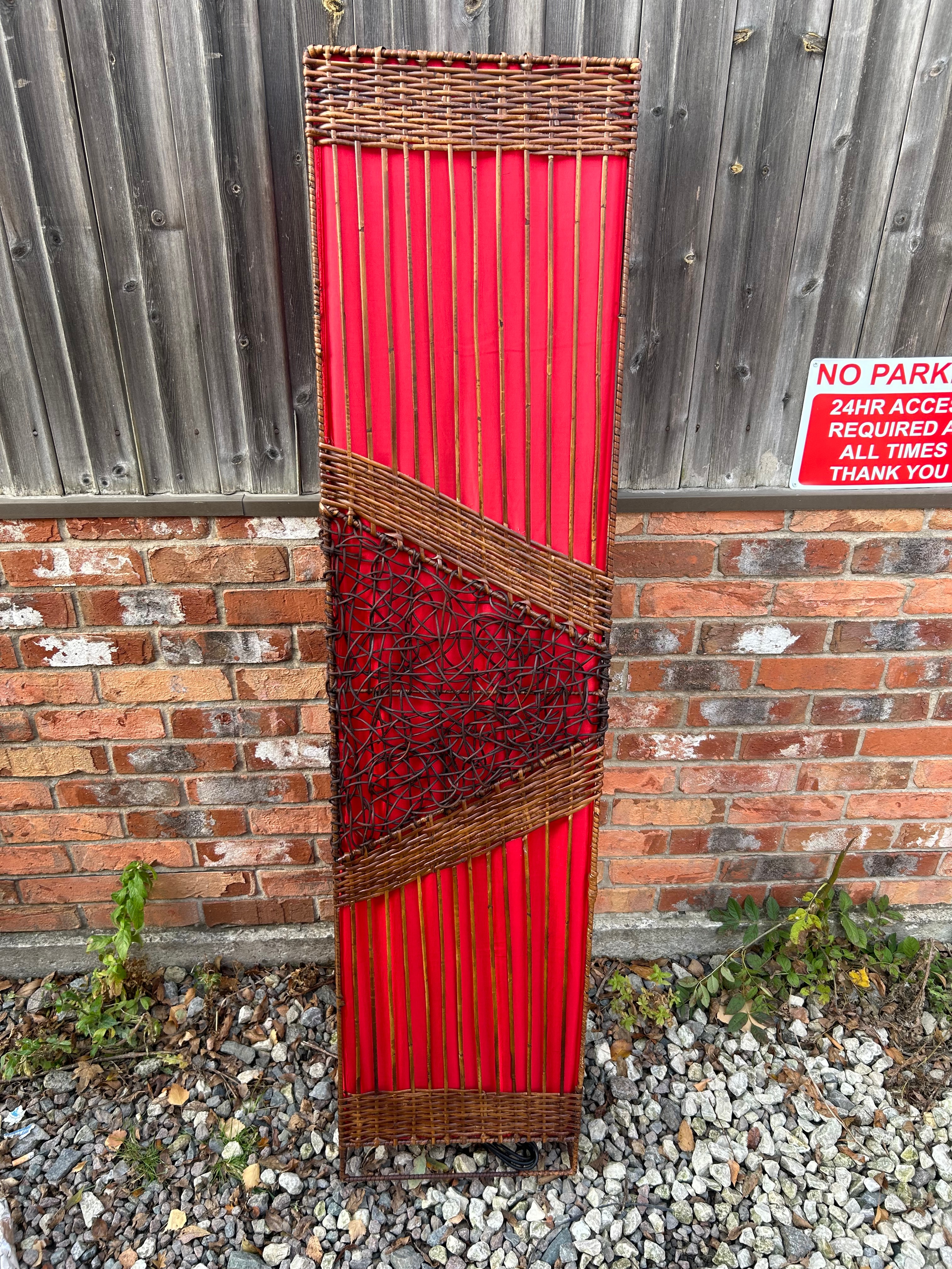 A new Thai woven decorative panel, suitable for use as a room divider. Constructed from woven dark brown Thai material with a vibrant red fabric backing. The design features vertical rods, a woven frame, and a distinct diagonal band of tighter weave across the mid-section, framing an open, web-like dark woven pattern. The aesthetic suggests a contemporary or naturalistic style. No visible manufacturer’s marks or identifying text are present.
