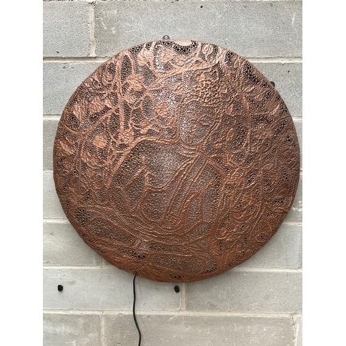 A round, wall-mounted light fixture, Made in Thailand, crafted from patinated copper or a copper alloy. The surface displays intricate, hand-punched or etched patterns featuring dense foliate and floral motifs, which are perforated throughout, evoking a Middle Eastern or Moroccan aesthetic, often associated with designs similar to those by Björn Wiinblad. No discernible text or maker’s marks are visible. An electrical cord is attached at the bottom.