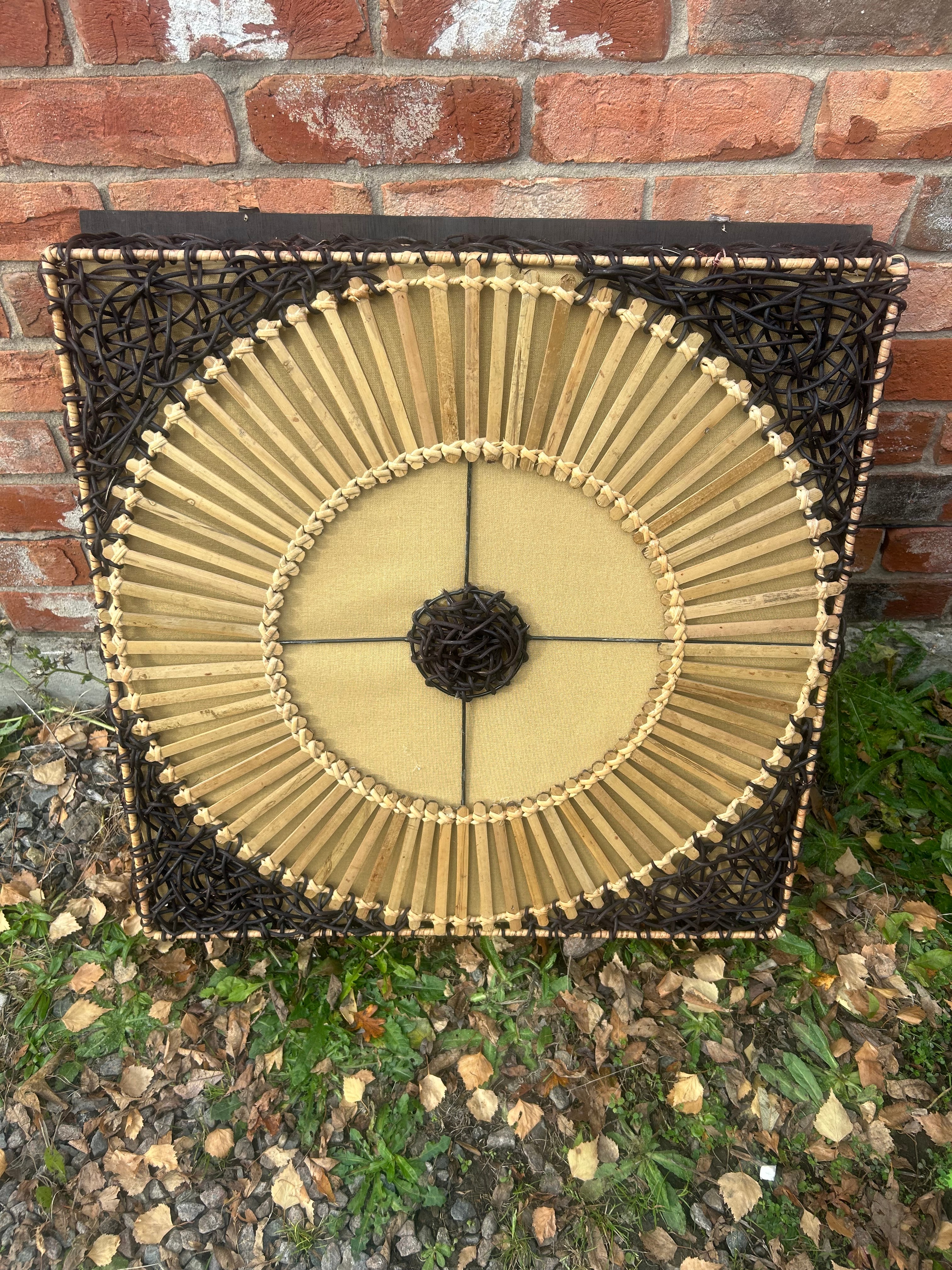 An Edgeform URC 26 Wall Light, Made in Thailand, Mid-Century Modern in style. This square decorative piece features a woven light brown or tan textile background, adorned with a radial, sunburst-like design composed of numerous light-toned wooden or bamboo slats, secured by lighter woven natural fibers. The central circular motif is bordered by a tightly woven dark natural fiber, which also forms intricate, overlapping patterns in the four corners and a small, dense bundle at the very center. The piece is framed along the top edge with a dark, possibly stained wood or composite material, and along its other edges with a lighter, woven natural fiber frame, intertwined with the dark fiberwork.